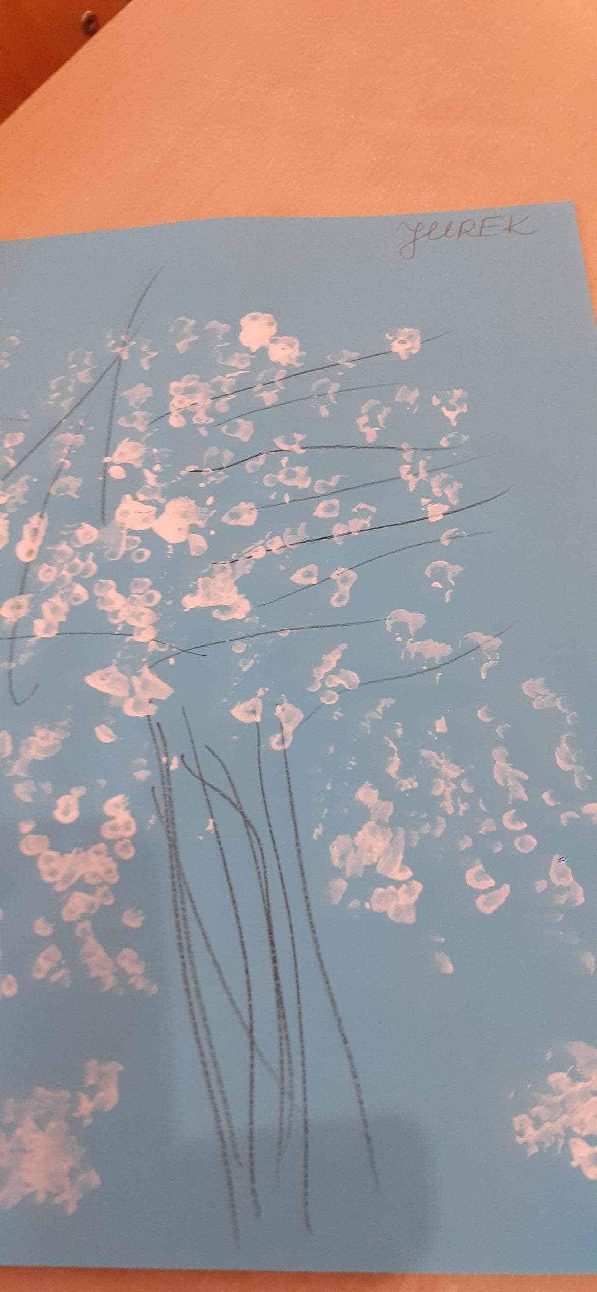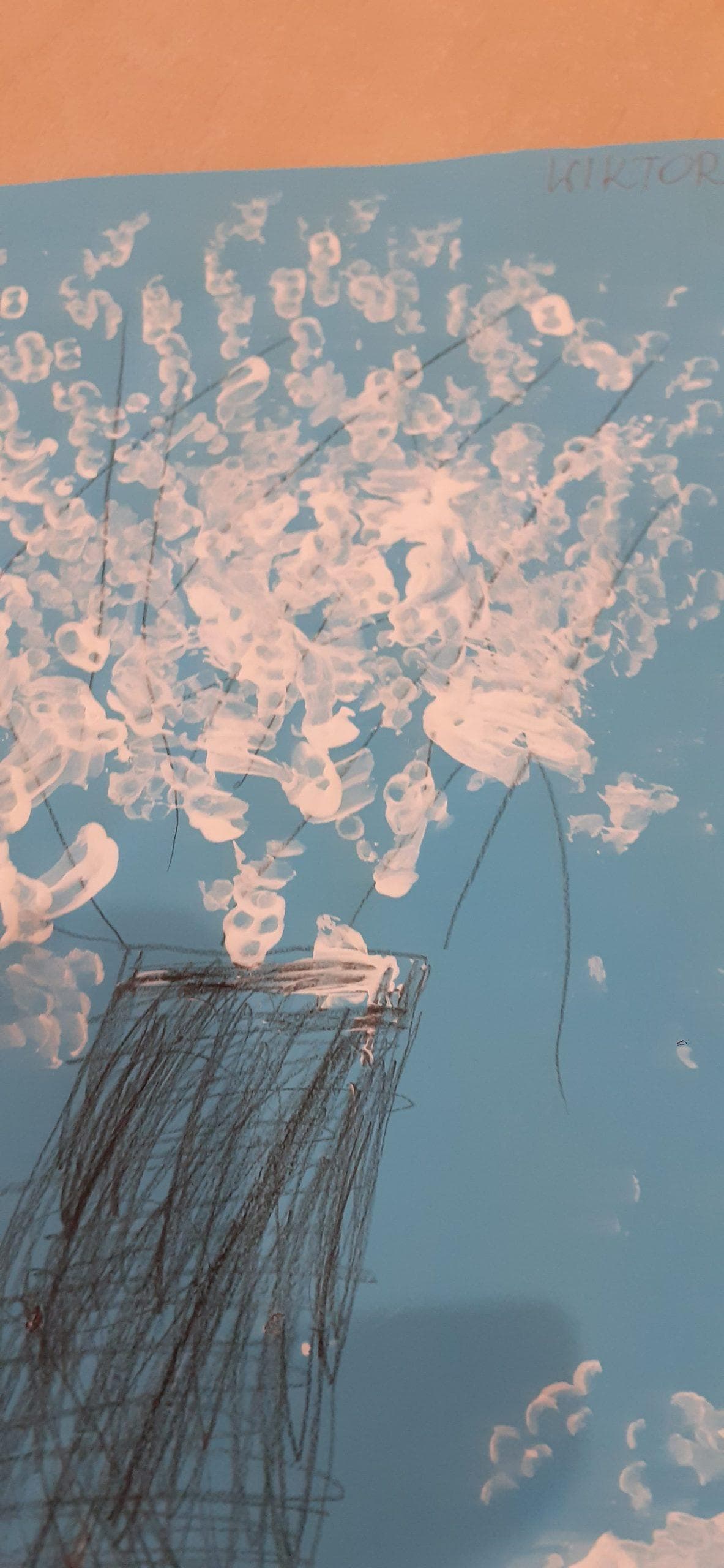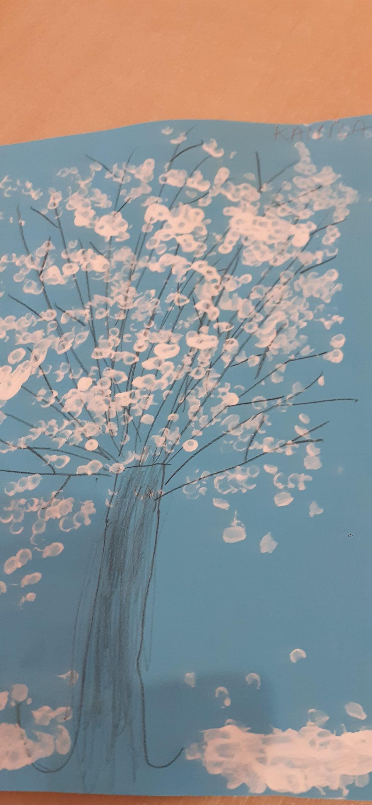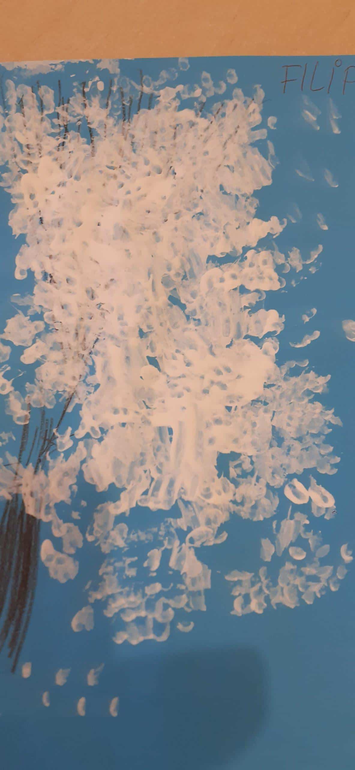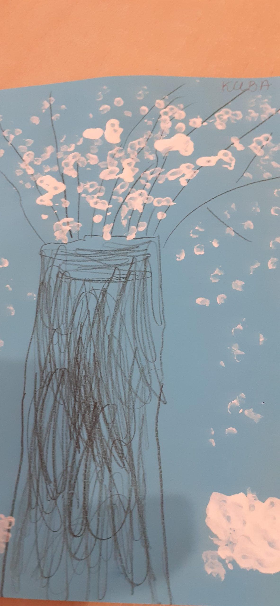 Zima jednak nie odpuszcza, za oknem jest pięknie. Do tej pory udało się nam dwa razy wyjść do ogrodu przedszkolnego . Jednym z elementów pobytu w ogrodzie przedszkolnym była obserwacja roślin i drzew w zimowym uśpieniu. Przy okazji utrwaliliśmy budowę drzewa, wymieniając jego poszczególne elementy budowy. To z kolei zainspirowało dzieci do wykonania pracy plastycznej pt. „Drzewo w zimowej odsłonie”. Dzieci z ochotą przystąpiły do malowania zimowego drzewa patyczkami kosmetycznymi maczanymi w białej farbie. To kolejna nowa technika plastyczna, zresztą bardzo lubiana przez dzieci. Powstały przepiękne zimowe drzewa. BRAWO!.