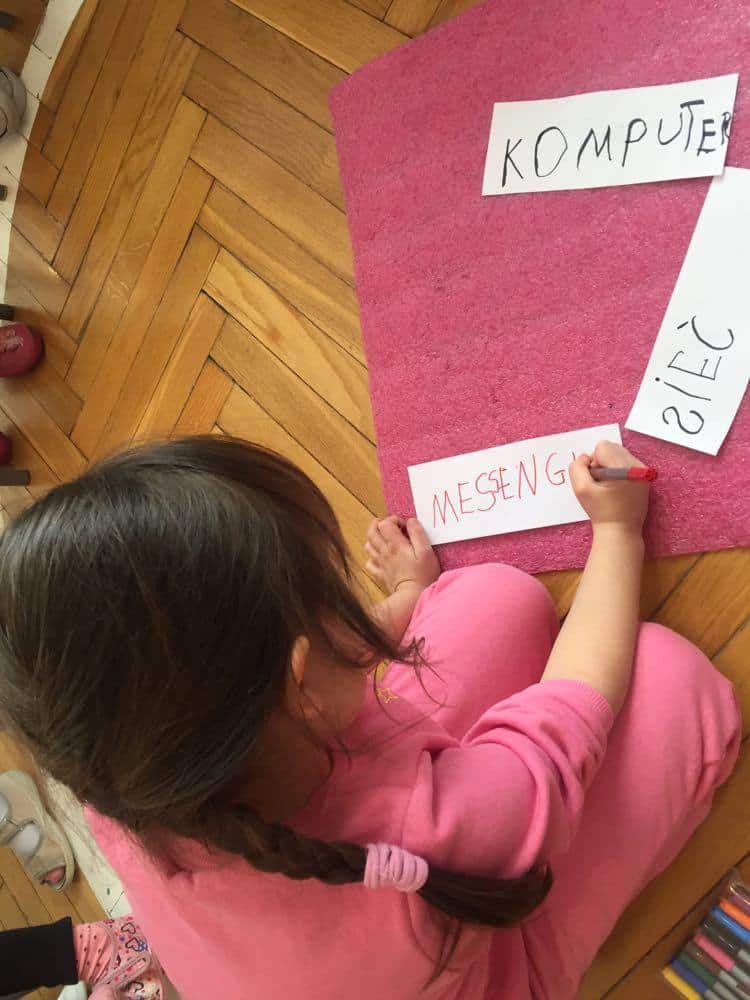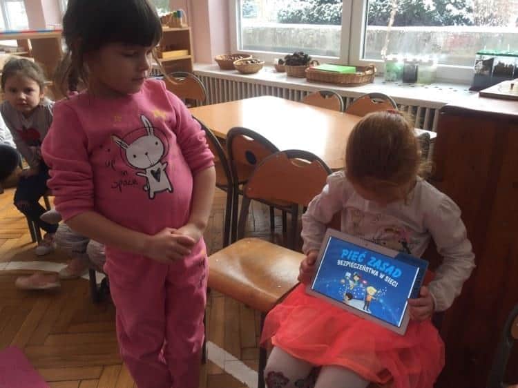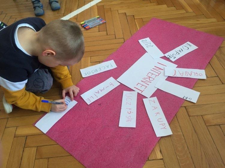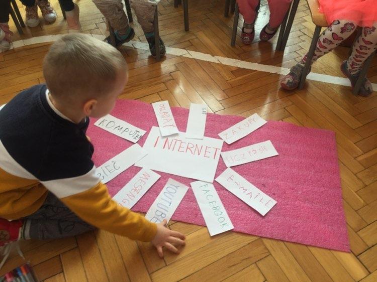 W ramach ogólnopolskiej akcji edukacyjnej „Dzieci uczą rodziców” organizowanej przez Centrum Rozwoju Lokalnego, której celem jest wsparcie procesu edukacji w obszarze bezpieczeństwa w naszej grupie odbyły się zajęcia na temat bezpiecznego Internetu. Na początku naszych zajęć dzieci metodą burzy mózgów mówiły co to jest Internet, z czym się kojarzy i co można robić dzięki Internetowi, następnie wszystkie pomysły zostały przez nie zapisane. Podczas tej lekcji dowiedzieliśmy się jak bezpiecznie korzystać z Internetu oraz poznaliśmy niebezpieczeństwa, które czyhają na dzieci w Internecie. Wymieniliśmy również najważniejsze zasady bezpieczeństwa w sieci, dzieci dowiedziały się, że nie można podawać swoich danych osobowych, trzeba porozmawiać z osobą zaufaną jeśli coś nas w Internecie zaniepokoi, nie wolno ufać osobom poznanym w sieci, trzeba traktować innych w sieci z szacunkiem oraz powinno się korzystać z umiarem z Internetu. Na koniec stworzyliśmy sieć komputerową za pomocą włóczki, która miała zobrazować nam jak zbiór komputerów czy innych urządzeń połączone ze sobą kanałami komunikacyjnymi umożliwiają nam wzajemne przekazywanie danych i informacji.