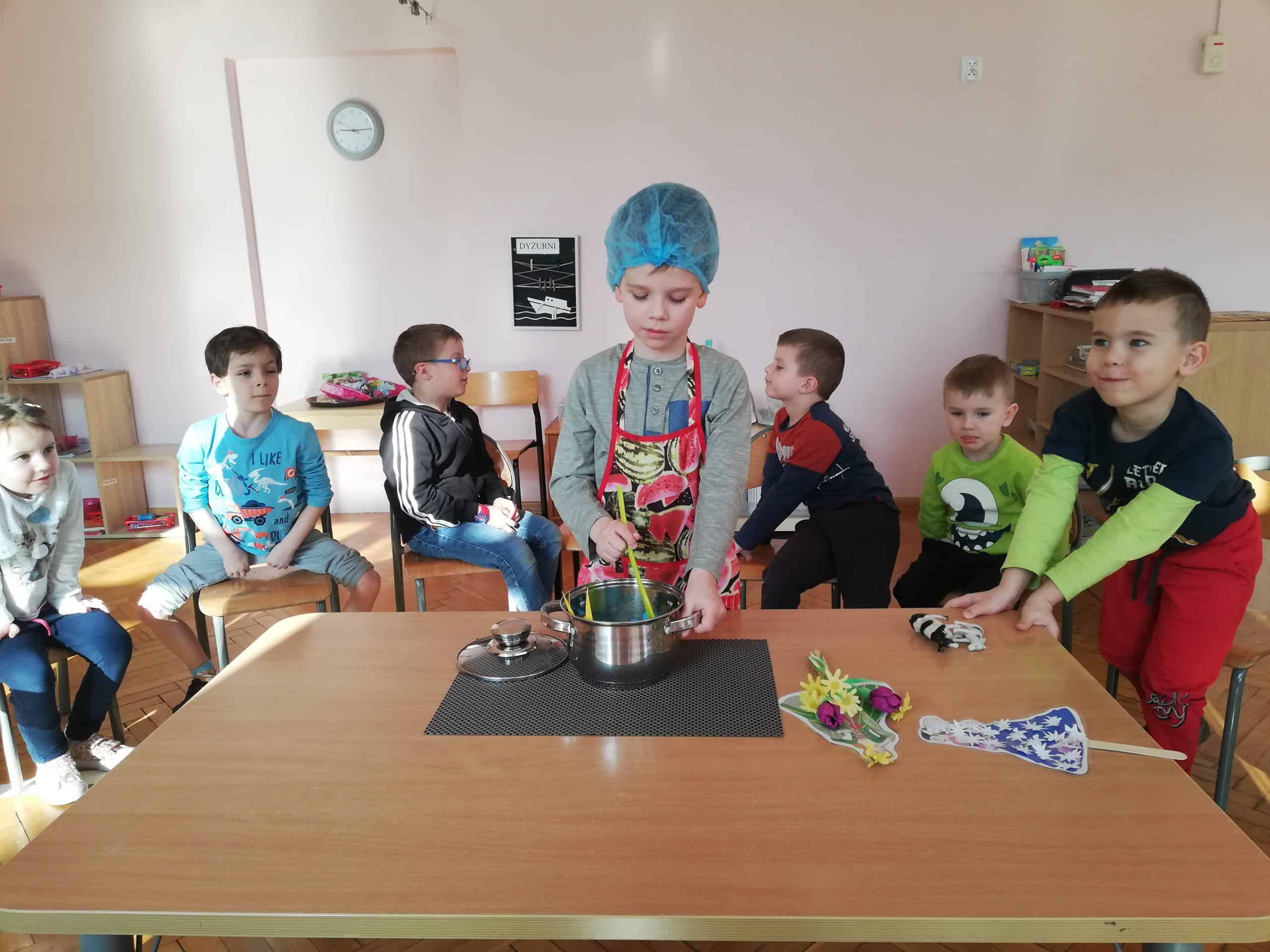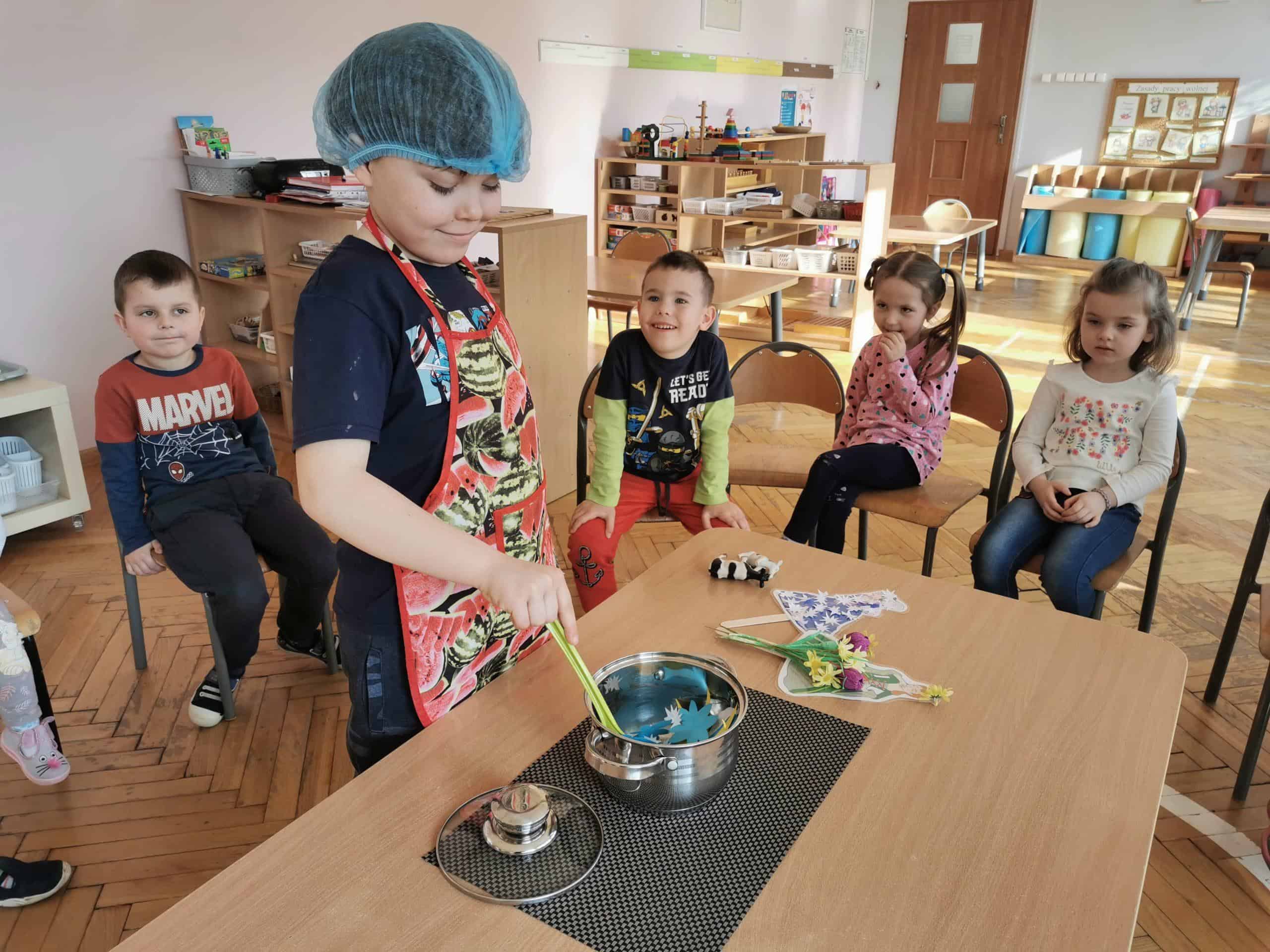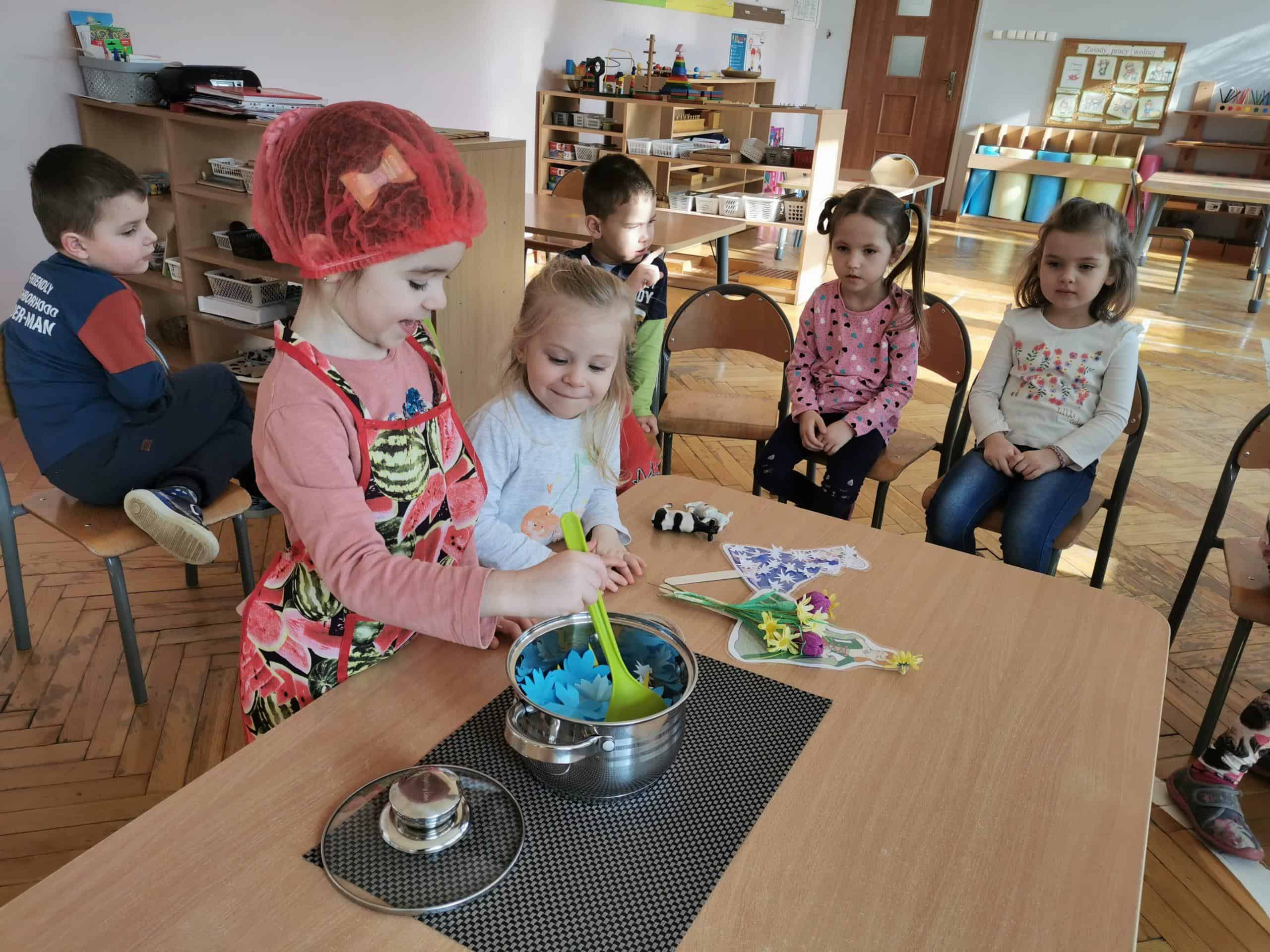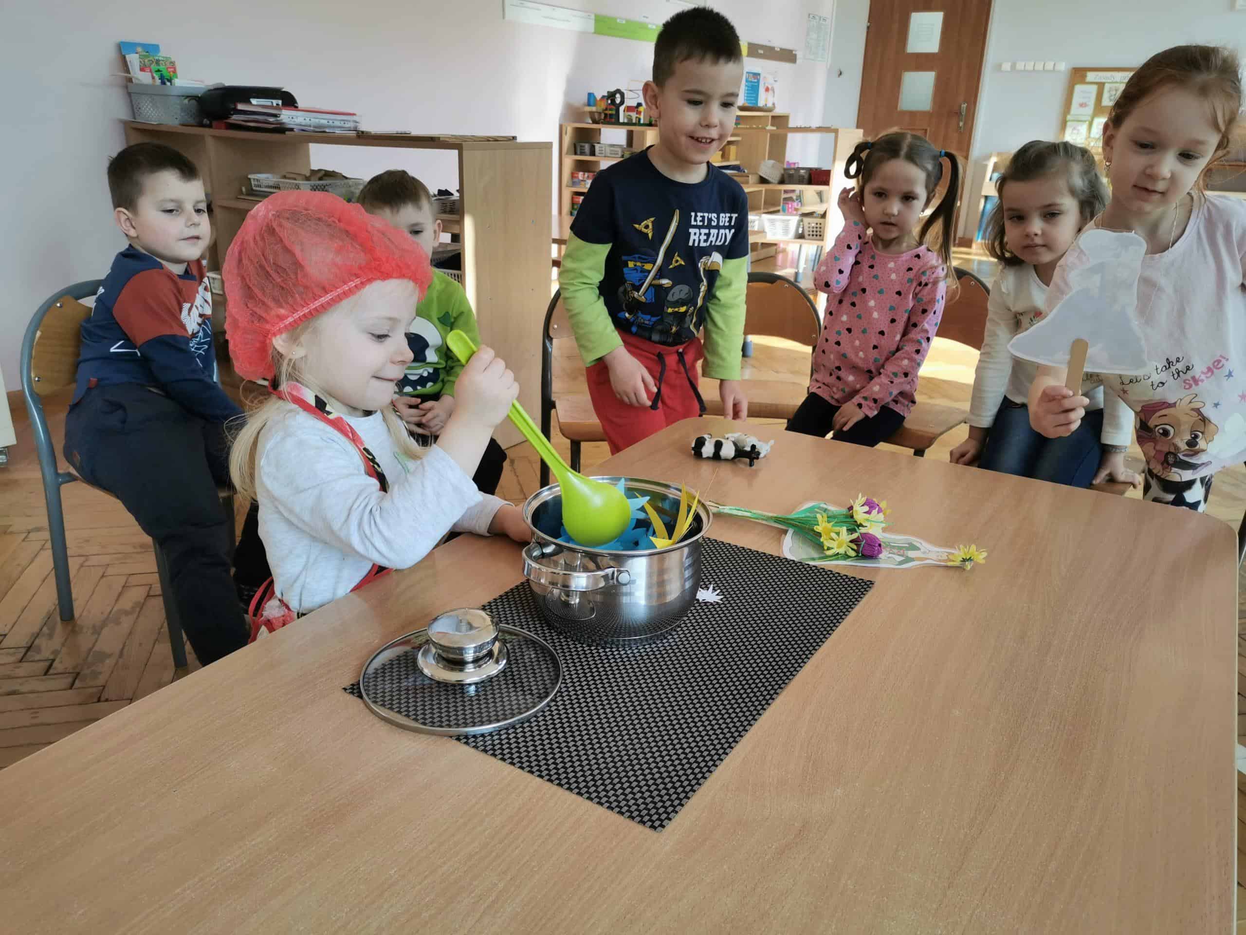 Staropolskie przysłowie „W marcu jak w garncu” doskonale odzwierciedla marcową pogodę. Dlatego postanowiliśmy ugotować własną „marcową zupę”. Przedszkolaki dodawały poszczególne składniki, mieszały – oczywiście wszystko na miarę MasterChefa 🙂 Po kulinarnych przygodach przedszkolaki w ramach grupowej aktywności twórczej zilustrowały przysłowie, które było głównym tematem lekcji.