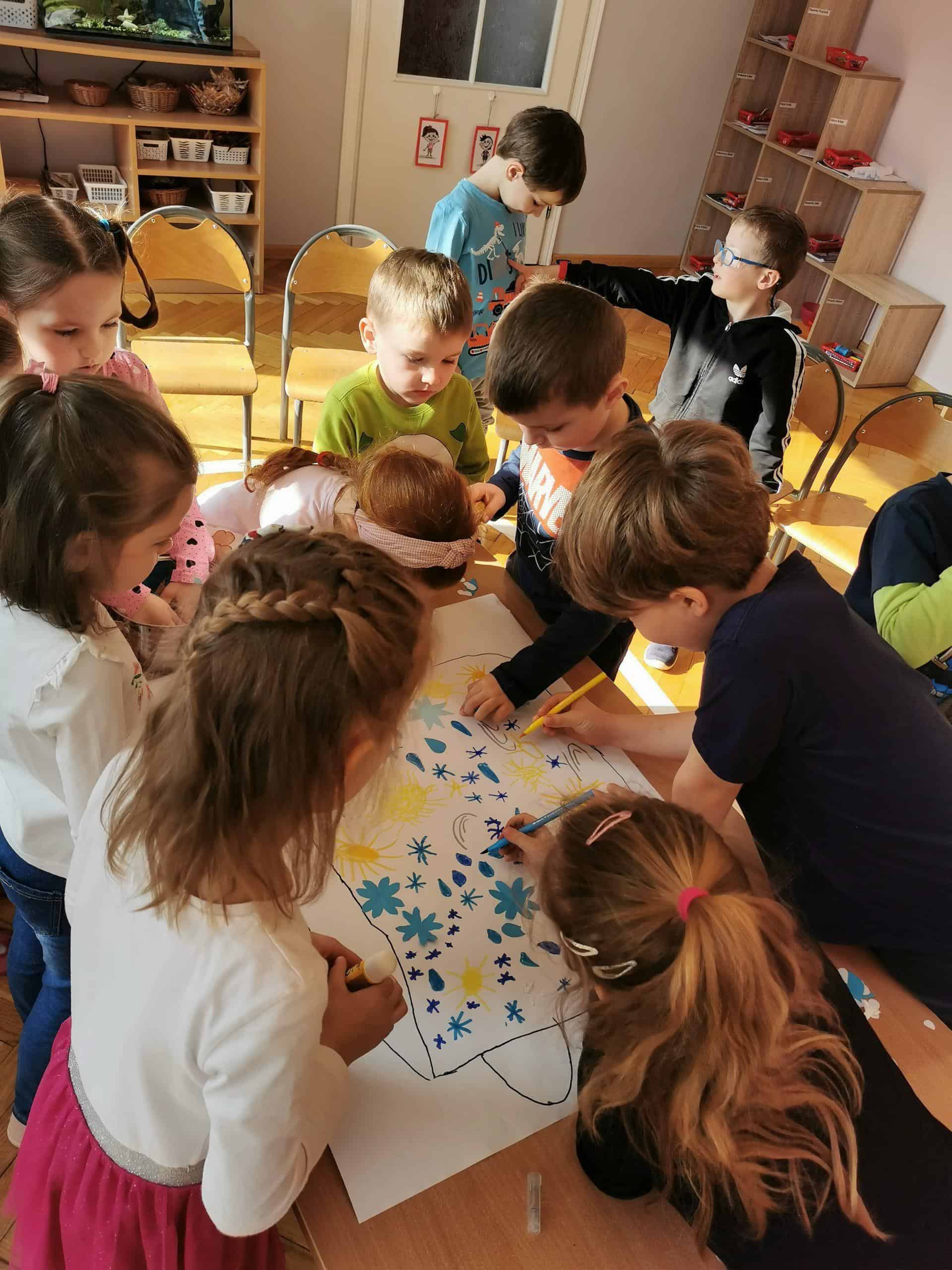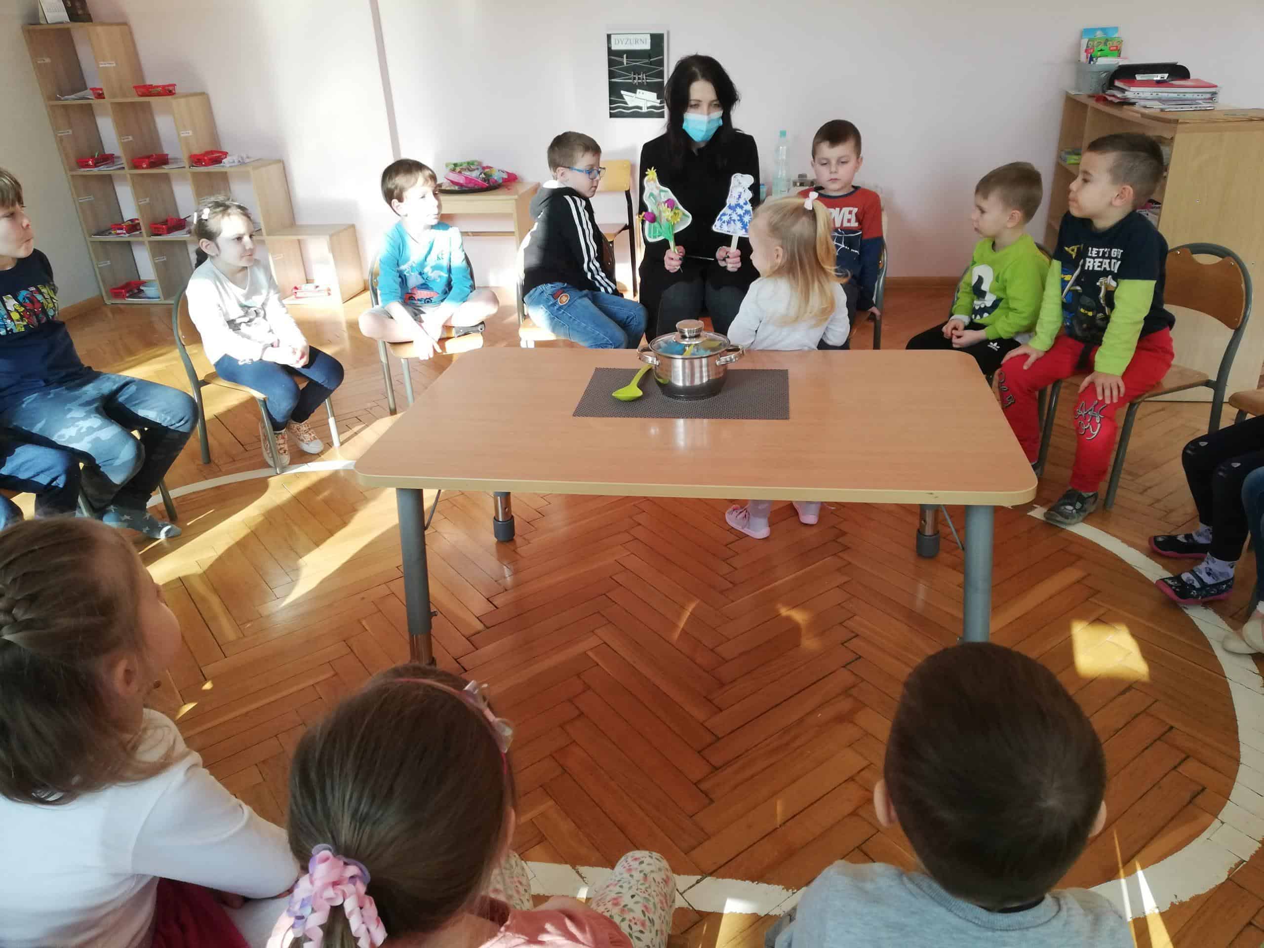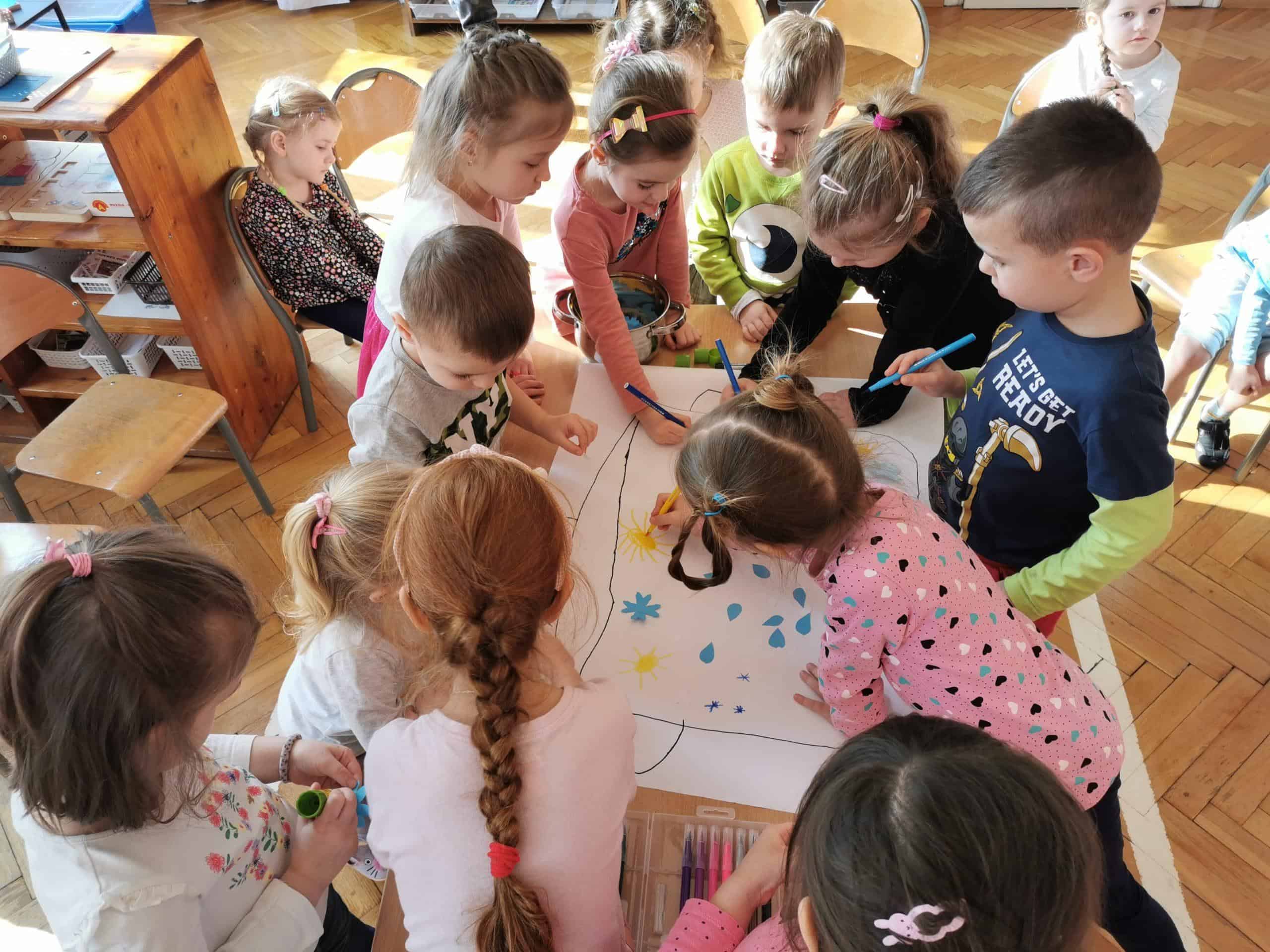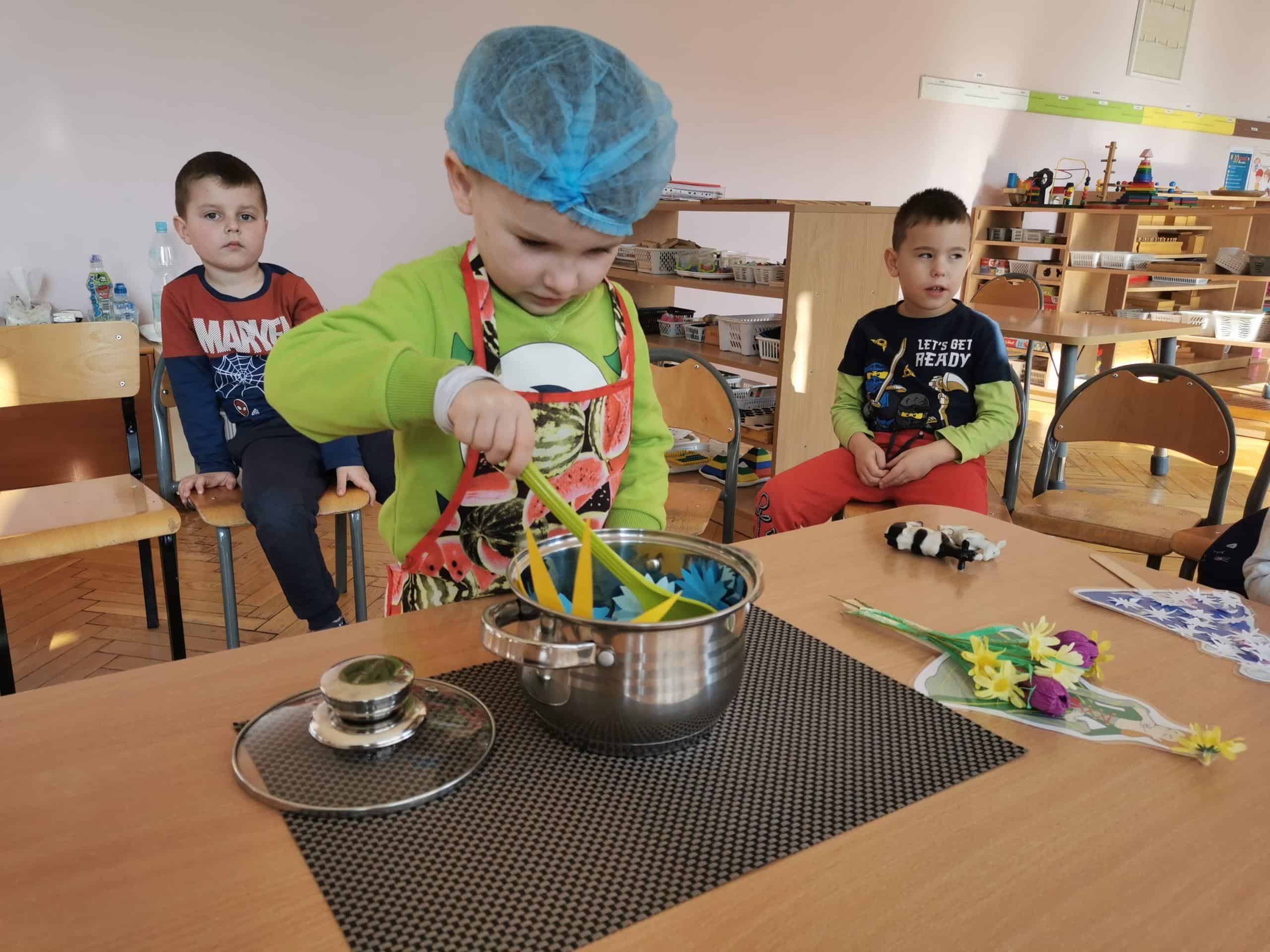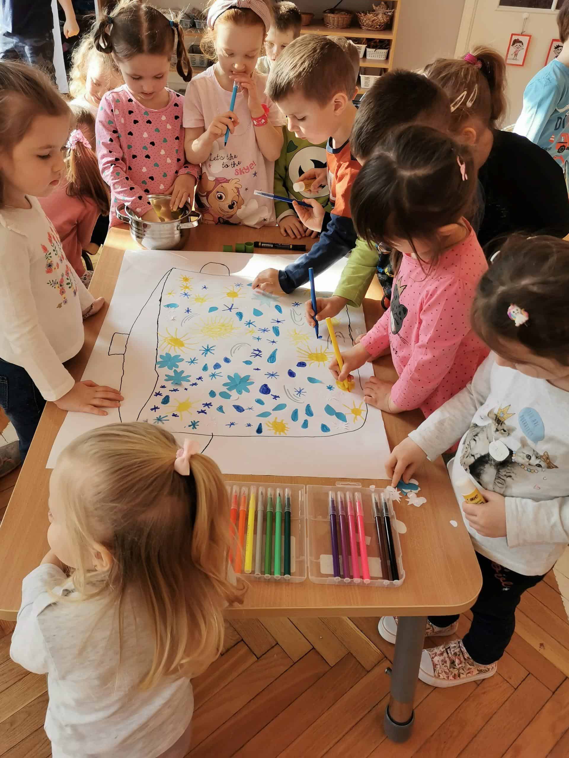 Staropolskie przysłowie „W marcu jak w garncu” doskonale odzwierciedla marcową pogodę. Dlatego postanowiliśmy ugotować własną „marcową zupę”. Przedszkolaki dodawały poszczególne składniki, mieszały – oczywiście wszystko na miarę MasterChefa 🙂 Po kulinarnych przygodach przedszkolaki w ramach grupowej aktywności twórczej zilustrowały przysłowie, które było głównym tematem lekcji.