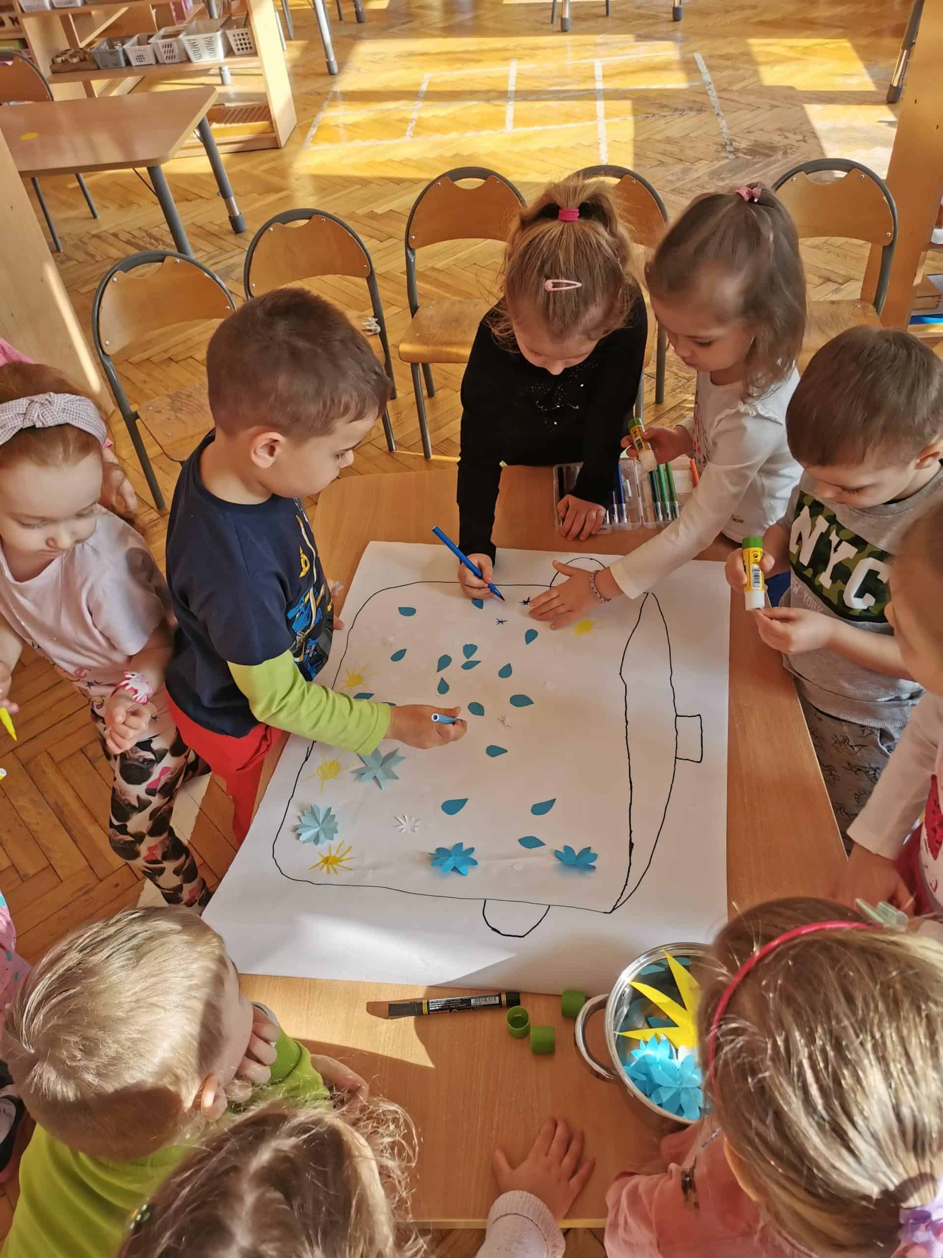 Staropolskie przysłowie „W marcu jak w garncu” doskonale odzwierciedla marcową pogodę. Dlatego postanowiliśmy ugotować własną „marcową zupę”. Przedszkolaki dodawały poszczególne składniki, mieszały – oczywiście wszystko na miarę MasterChefa 🙂 Po kulinarnych przygodach przedszkolaki w ramach grupowej aktywności twórczej zilustrowały przysłowie, które było głównym tematem lekcji.