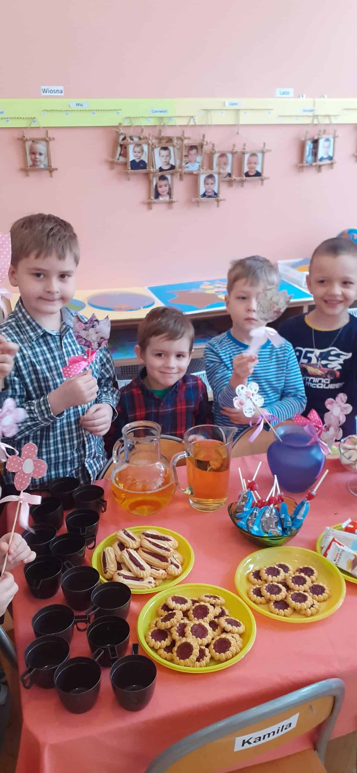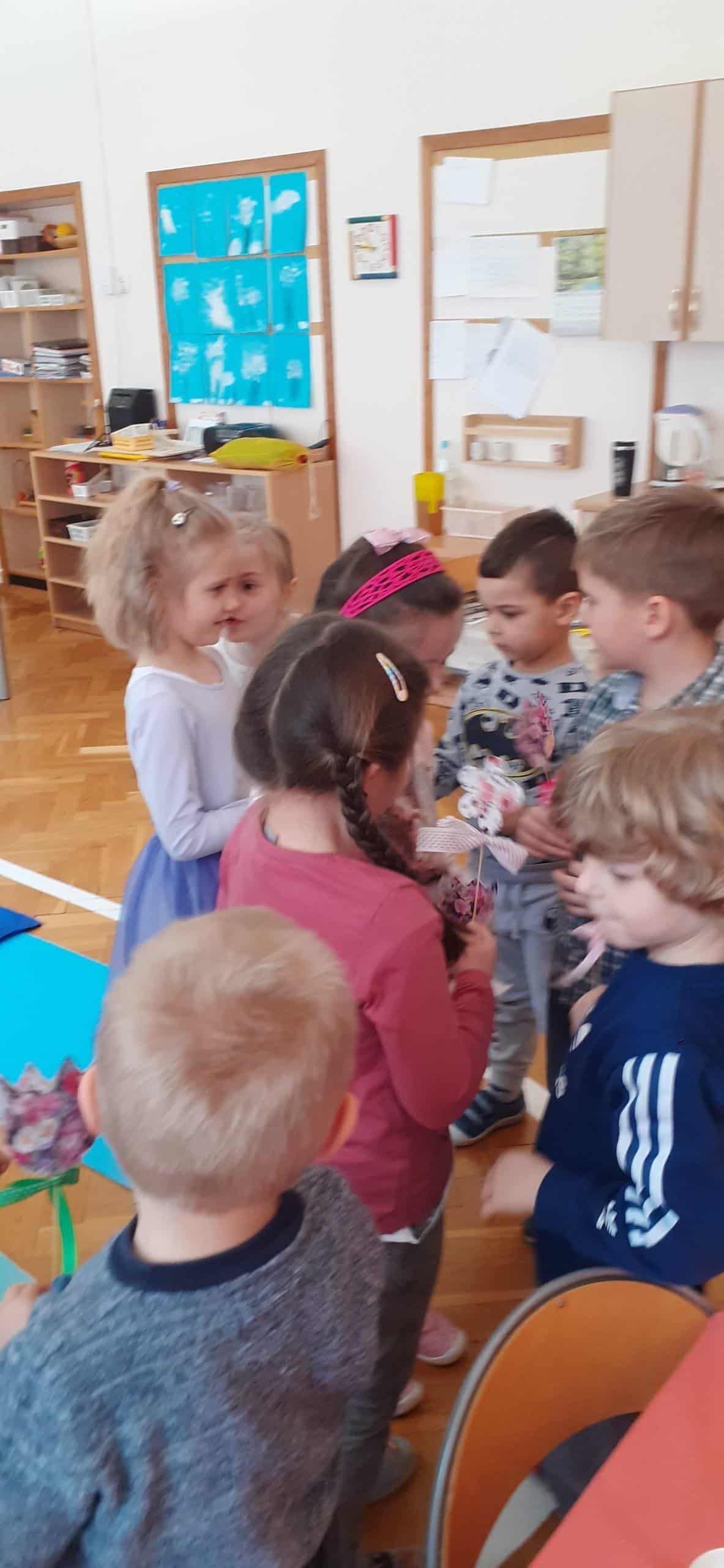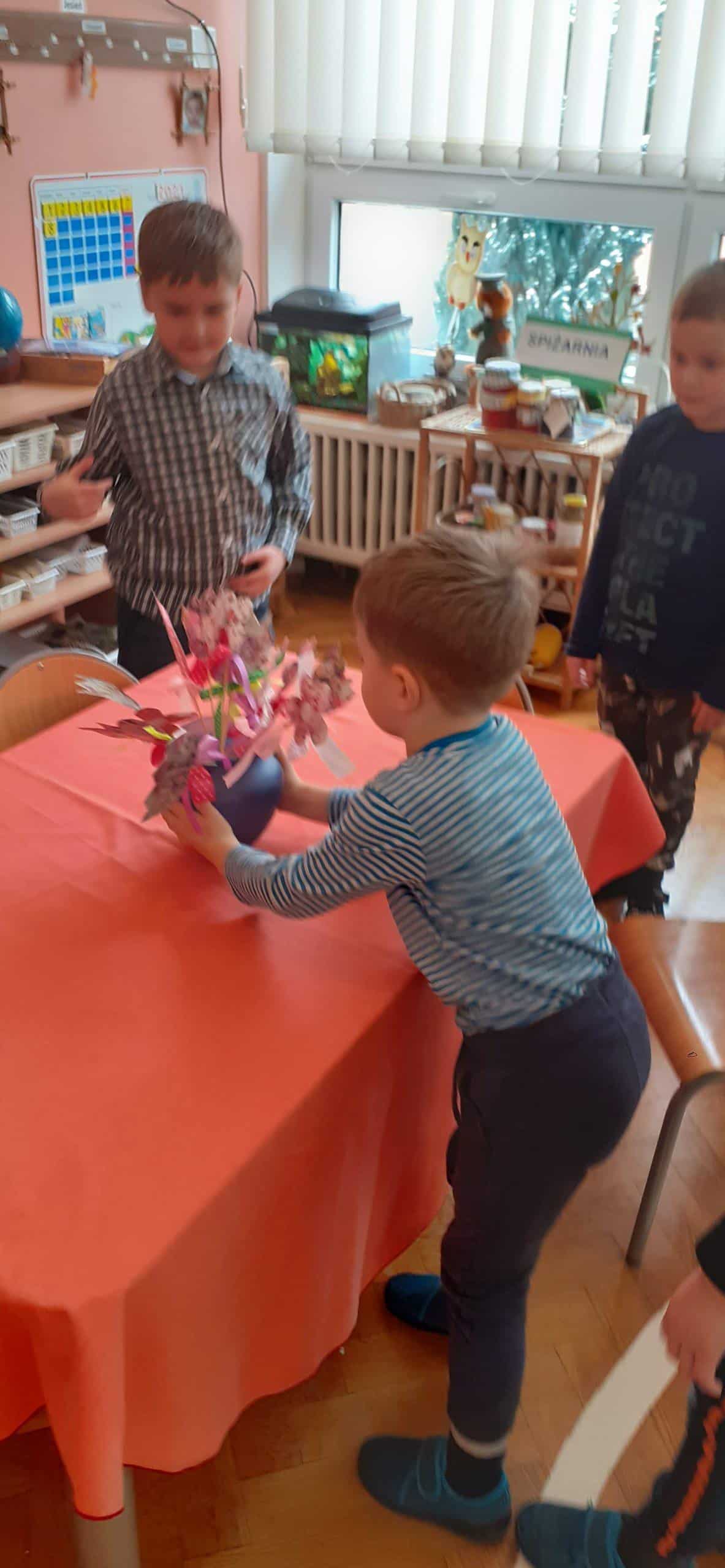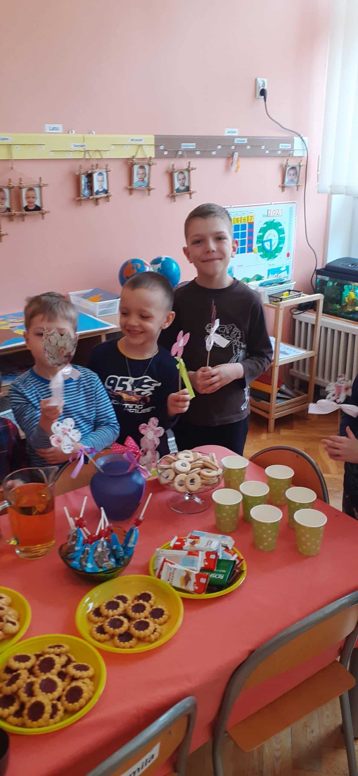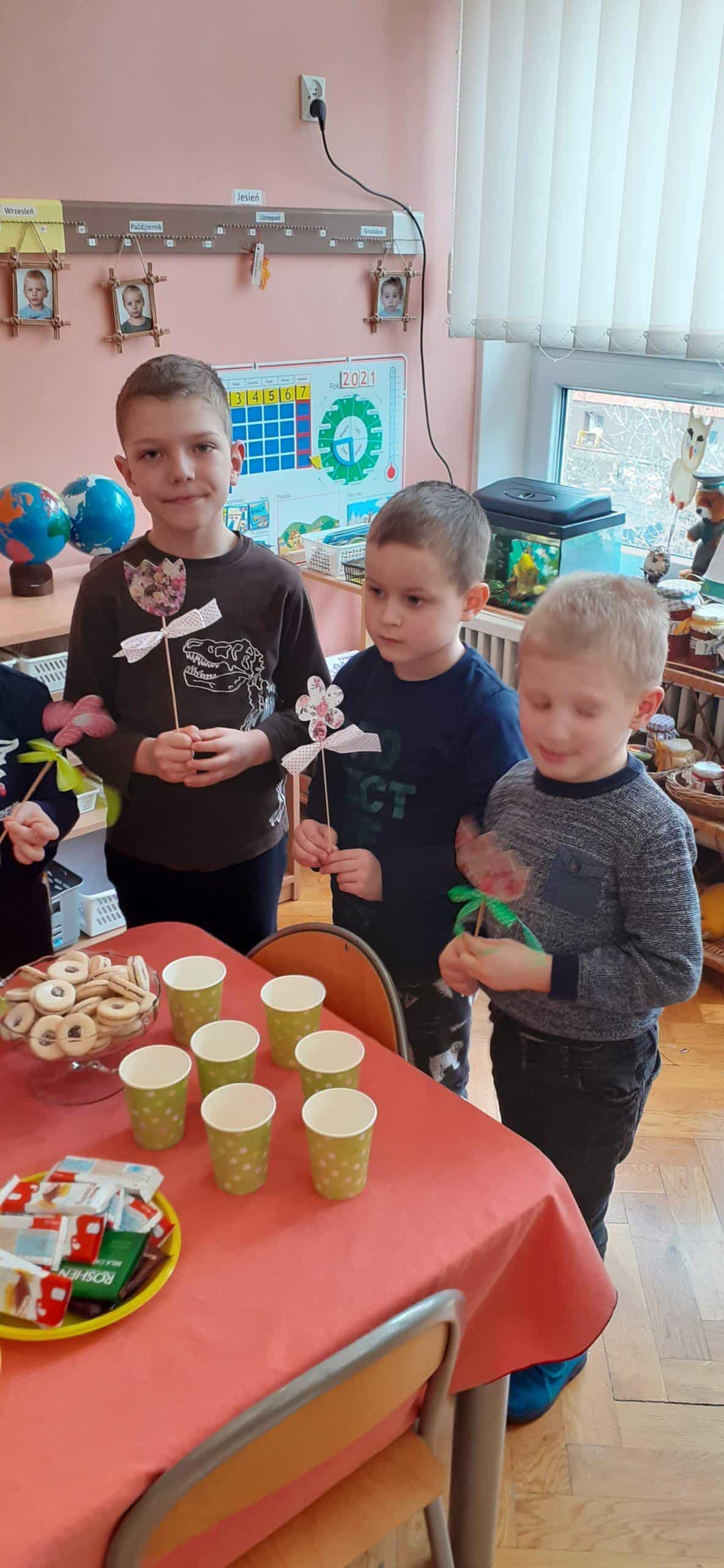 Nasze wspólne świętowanie poprzedziła lekcja z zakresu rozwijania mowy i myślenia. Zajęcia Dzień Kobiet – jakie zawody wykonują kobiety? miały na celu przybliżyć dzieciom zawody wykonywane przez współczesne kobiety, oraz nauczyć okazywania szacunku wszystkim kobietom z najbliższego otoczenia. Dzieci rozwiązywały zagadki, rozpoznawały i nazywały zawody. Musiały również skojarzyć przedmioty-rekwizyty z wykonywaną pracą. Samodzielnie czytały i przyporządkowały podpisy do atrybutów danego zawodu. Na koniec chłopcy złożyli dziewczynkom życzenia, Hubercik częstował słodyczami a inni nasi dżentelmeni wręczali naszym drogim dziewczynkom piękne upominki przygotowane przez Rodziców, za które jeszcze raz bardzo serdecznie DZIĘKUJEMY.