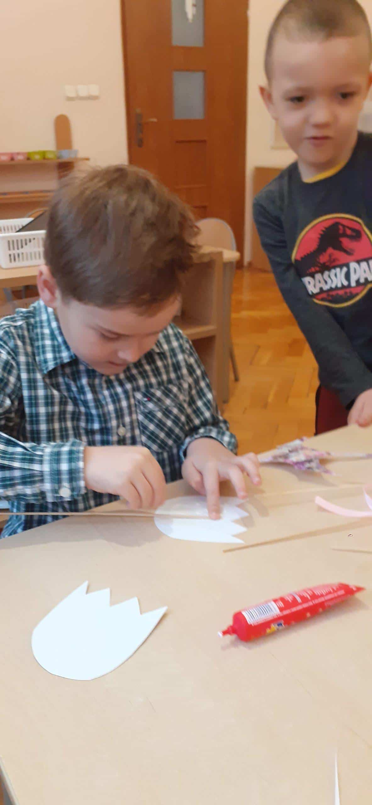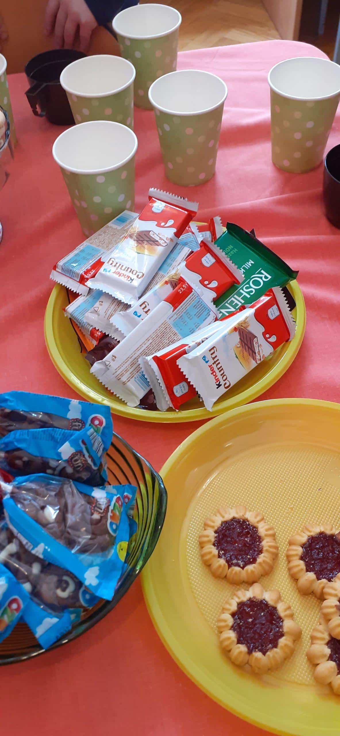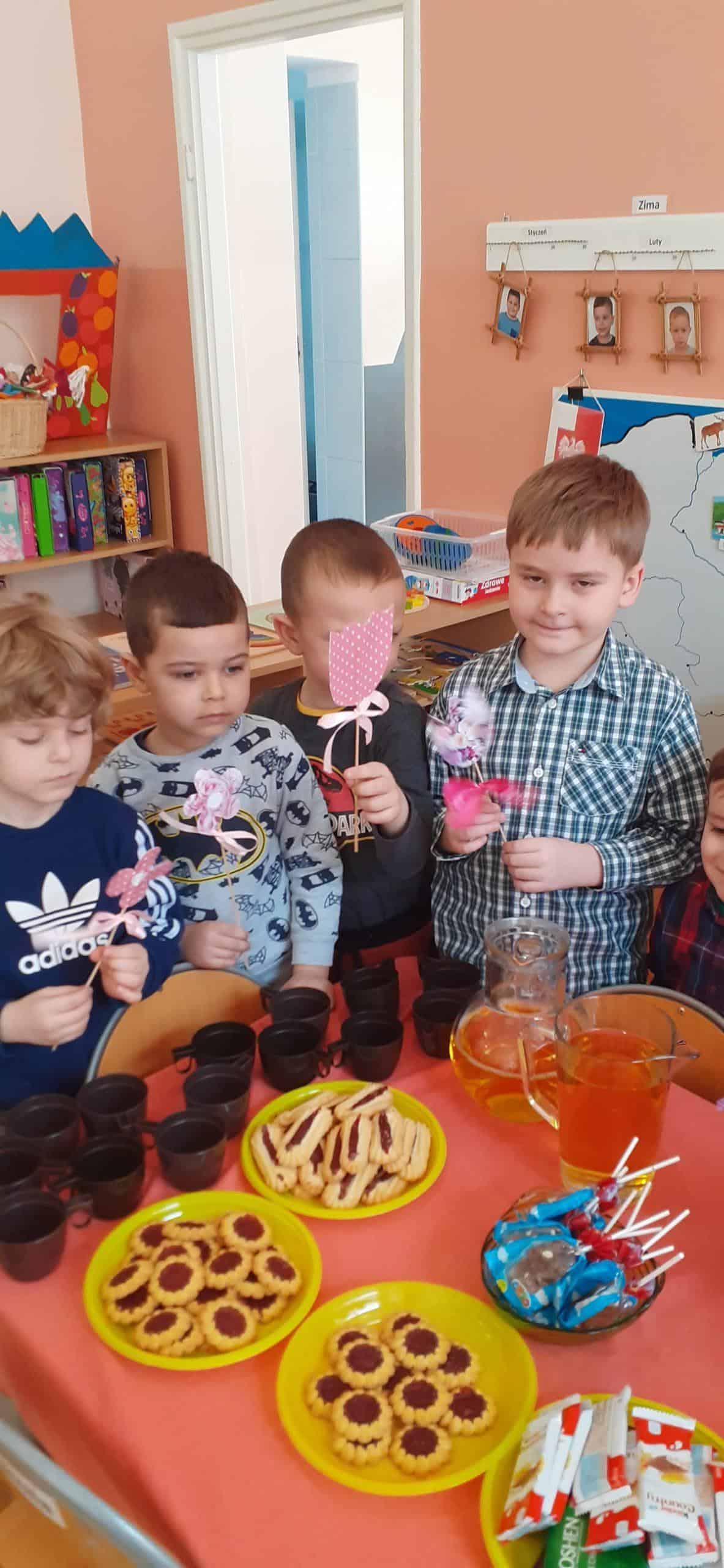 Przygotowania do tego święta za sprawą chłopców trwały już od samego rana. Jako pierwsi pojawili się Paweł , Filip i Franek i od razu przystąpili do działania. Wykonanie kwiatków pochłonęło ich bez reszty, chcieli bowiem zdążyć przed przyjściem dziewczynek i zrobić im niespodziankę. Ale kwiaty to nie wszystko, redagowanie życzeń dla dziewczynek też było ważną umiejętnością. A potem mnóstwo ekscytacji podczas przygotowania poczęstunku, nakrywania stołu, układania ciasteczek, przygotowania kubeczków na sok. Wszystkim było bardzo miło – dziewczynkom, Paniom, a także chłopcom, którzy stanęli na wysokości zadania. Dziękujemy rodzicom za pamięć w tym dniu, za przygotowanie słodkości i za miłe dla nas niespodzianki i upominki. DZIĘKUJEMY!!!.