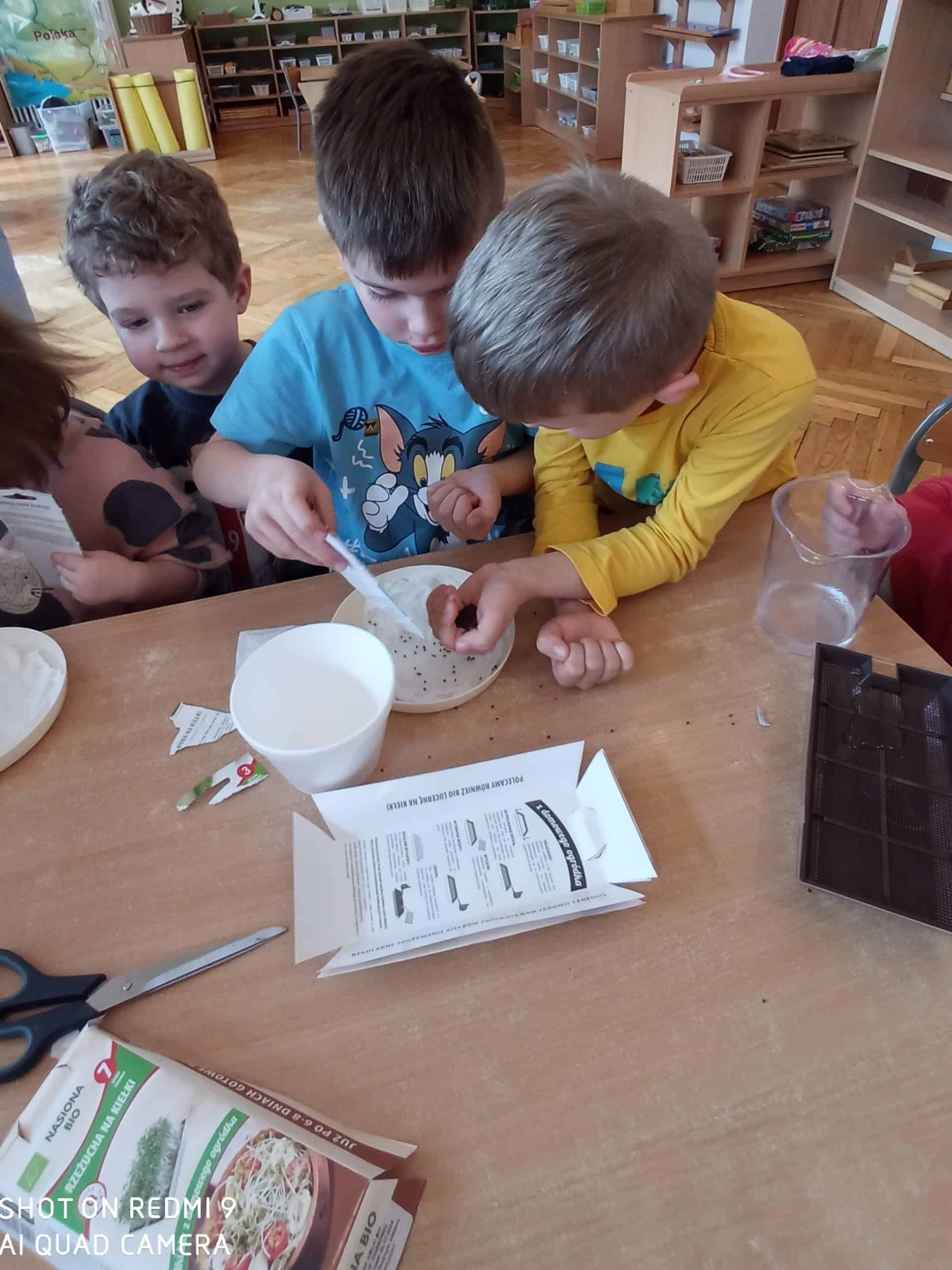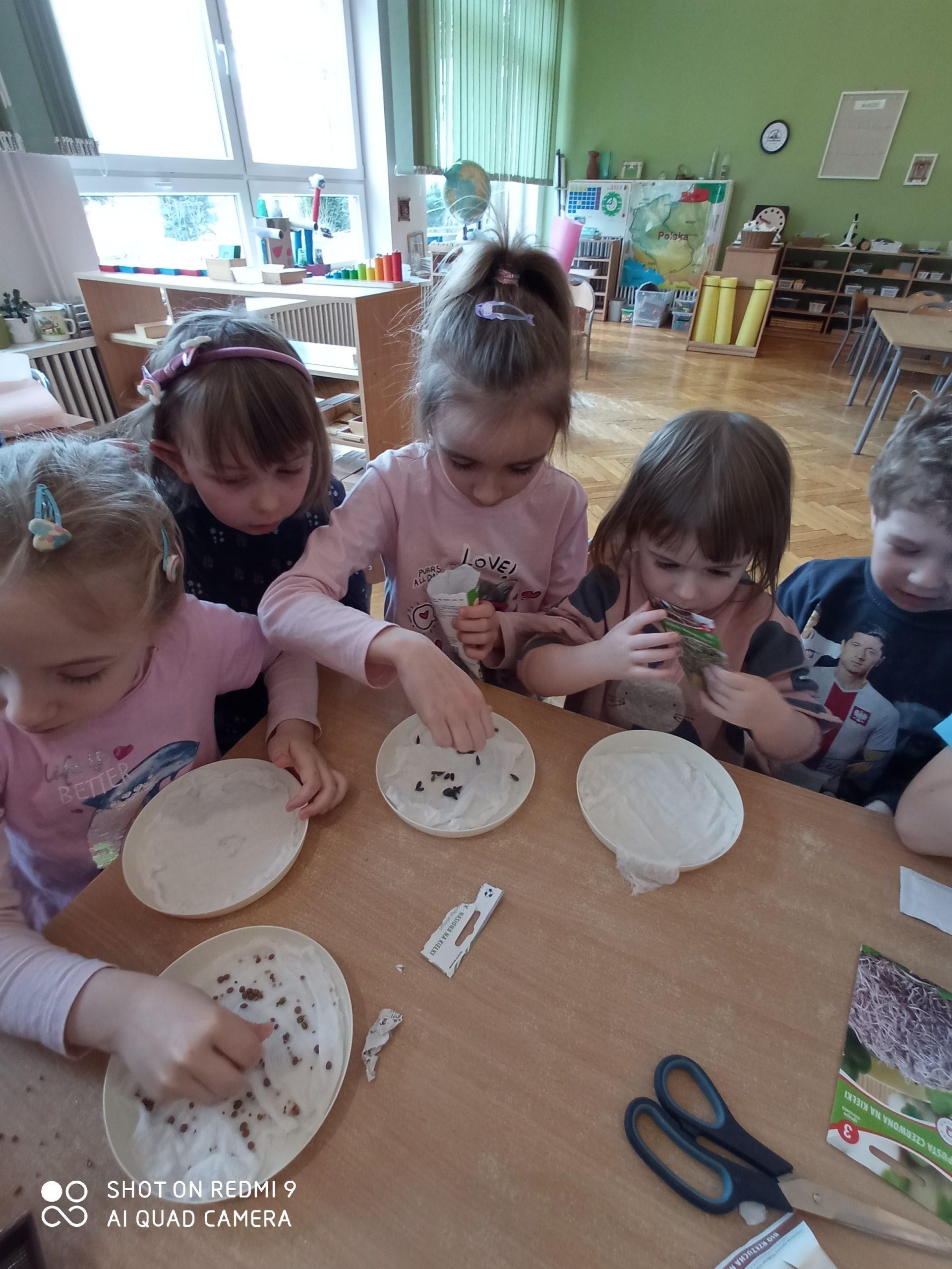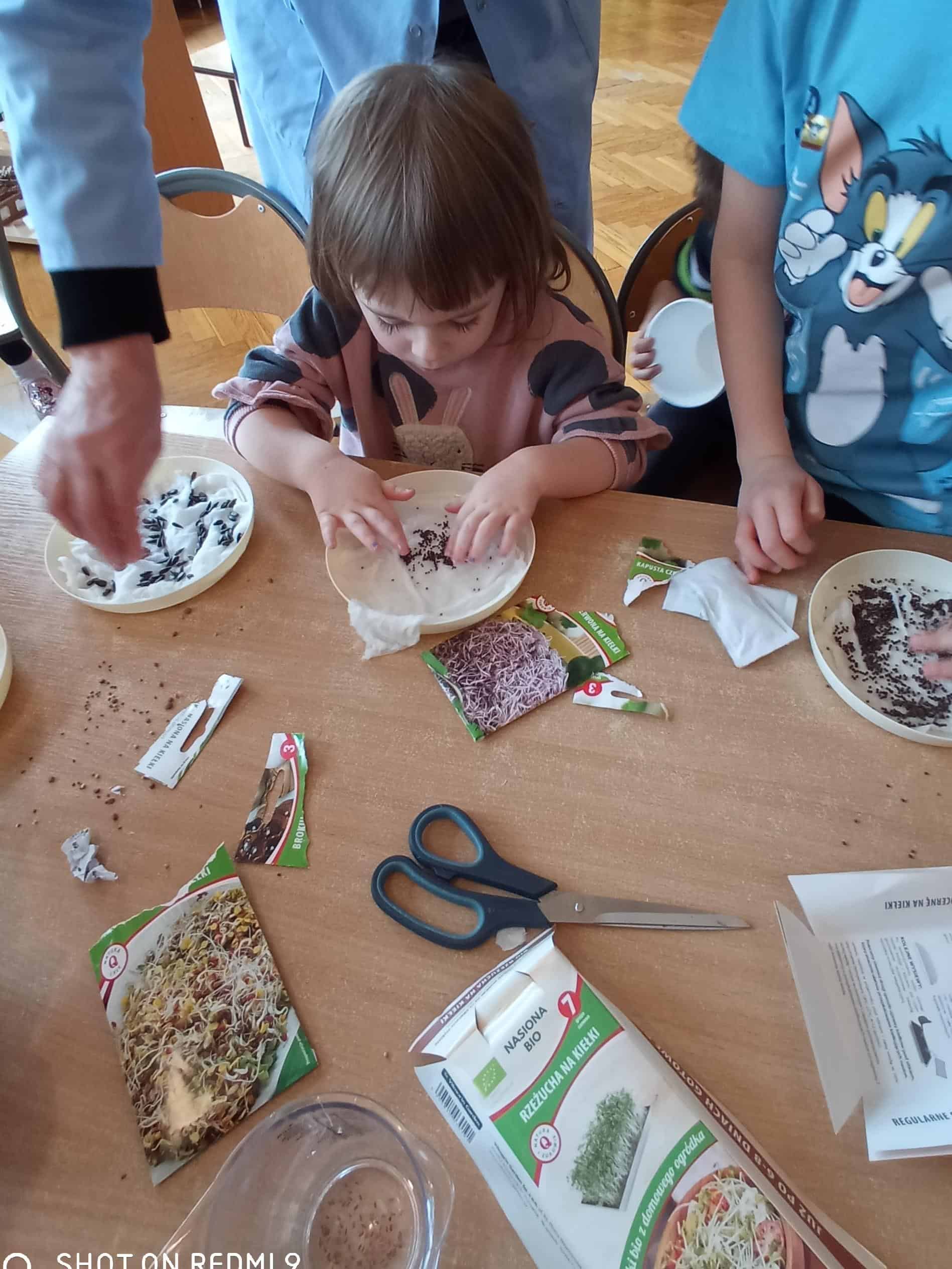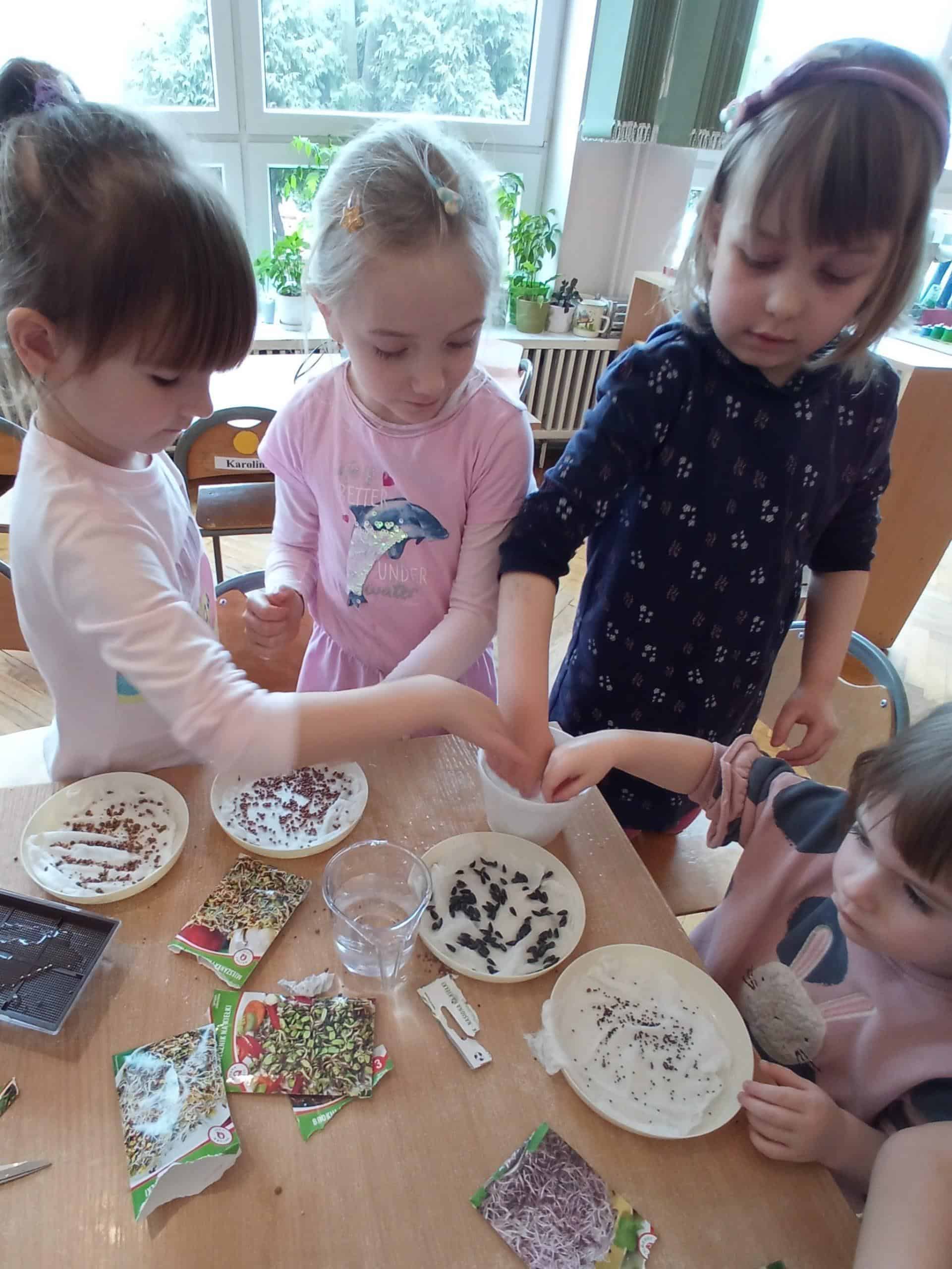 Zima nie chce dać o sobie zapomnieć, pogoda nadal nie rozpieszcza, ale my, chcąc „zakląć” naszą rzeczywistość podejmujemy działania, które mają przyspieszyć przyjście do nas tak bardzo wyczekiwanej przez wszystkich wiosny. Na zakładanie ogródka warzywnego jeszcze troszkę za wcześnie, dlatego my postanowiliśmy się zająć wysiewem budzących się do życia nasion, czyli kiełków, zwanych mini warzywami. Większość dzieci nie wiedziała czym są i jak wyglądają kiełki. Dużym zdziwieniem stała się też dla nich informacja, iż kiełki są wysiewane bez użycia ziemi. Z filmu pt. „Kiełki – jak hodować i dlaczego warto jeść” dowiedzieliśmy jak można w domowych warunkach wyhodować kiełki oraz jak wiele drogocennych minerałów, witamin i antyoksydantów, które „wymiatają” z organizmu wolne rodniki, odpowiedzialne m.in. za choroby i starzenie się, zawierają w swych nasionkach. Wysłuchaliśmy rad dotyczących zakładania hodowli kiełków, a później zabraliśmy się za pracę. Na kiełkownicach, oraz plastikowych podstawkach wypełnianych wilgotnymi gazami zaczęliśmy nasze wysiewy.