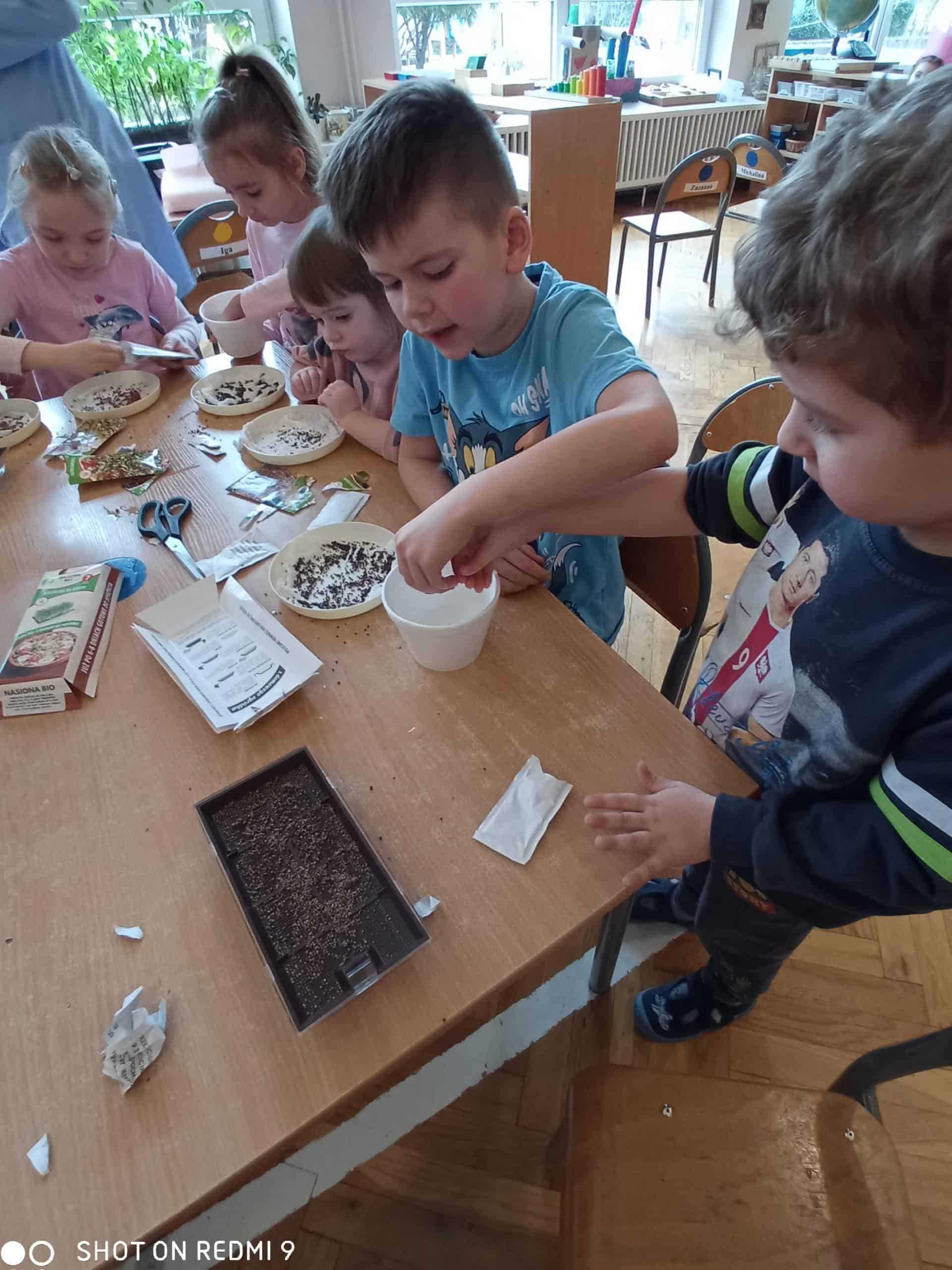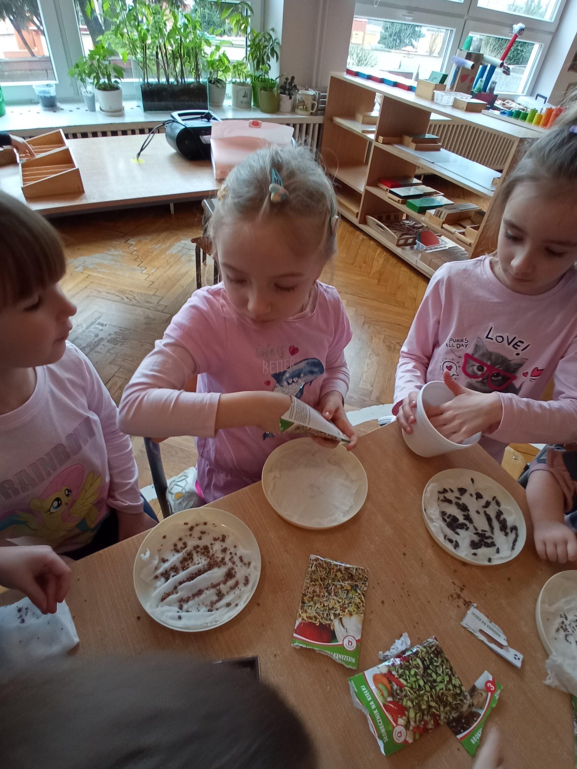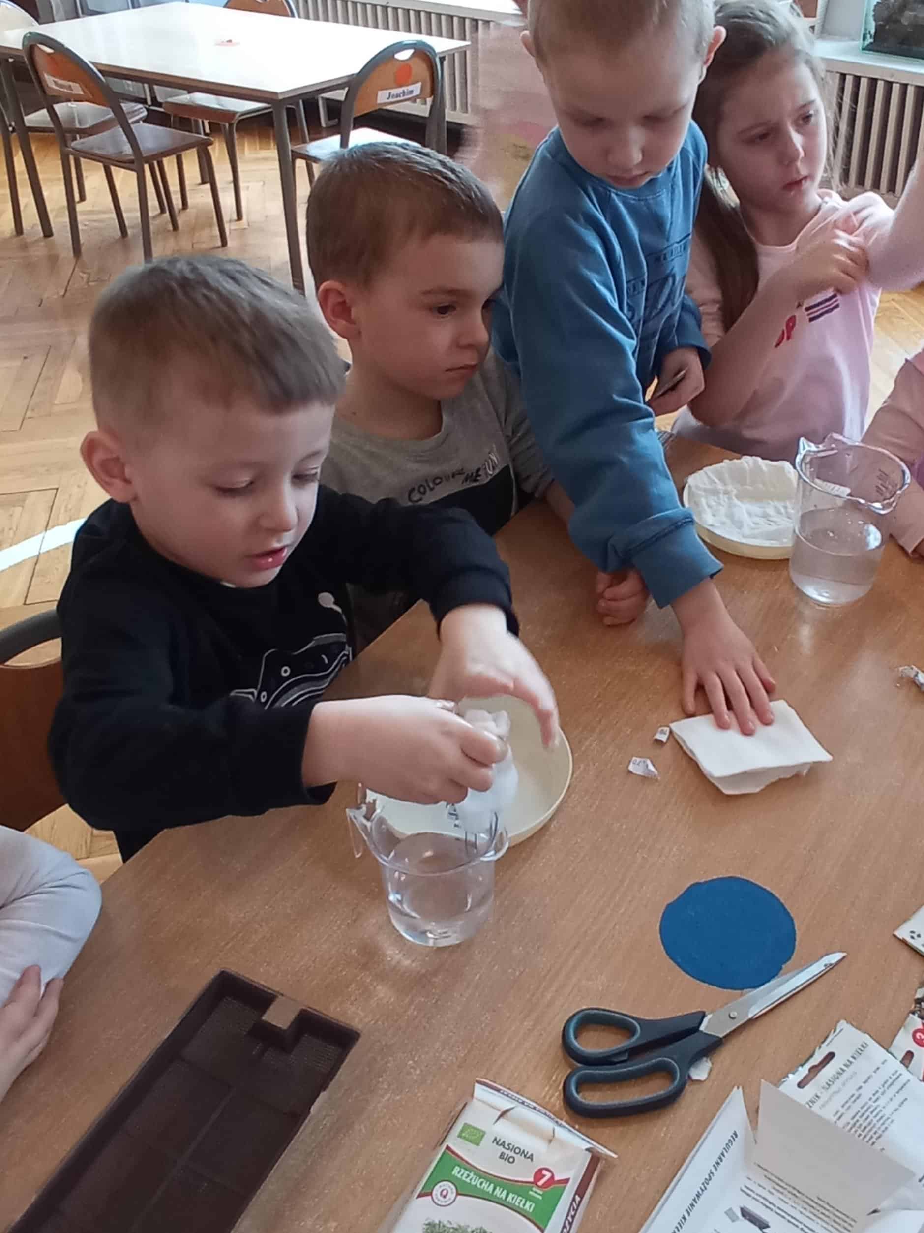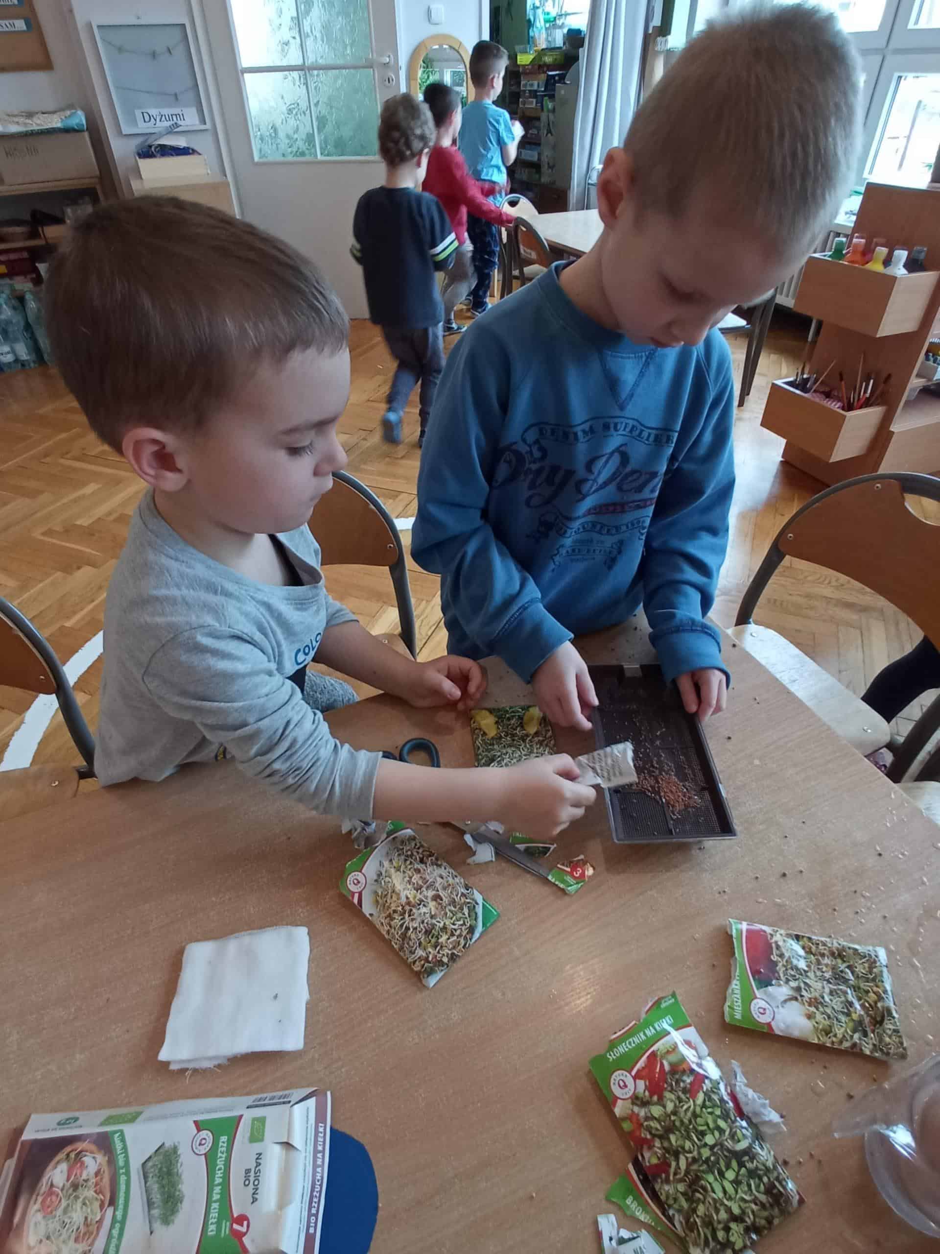 Zima nie chce dać o sobie zapomnieć, pogoda nadal nie rozpieszcza, ale my, chcąc „zakląć” naszą rzeczywistość podejmujemy działania, które mają przyspieszyć przyjście do nas tak bardzo wyczekiwanej przez wszystkich wiosny. Na zakładanie ogródka warzywnego jeszcze troszkę za wcześnie, dlatego my postanowiliśmy się zająć wysiewem budzących się do życia nasion, czyli kiełków, zwanych mini warzywami. Większość dzieci nie wiedziała czym są i jak wyglądają kiełki. Dużym zdziwieniem stała się też dla nich informacja, iż kiełki są wysiewane bez użycia ziemi. Z filmu pt. „Kiełki – jak hodować i dlaczego warto jeść” dowiedzieliśmy jak można w domowych warunkach wyhodować kiełki oraz jak wiele drogocennych minerałów, witamin i antyoksydantów, które „wymiatają” z organizmu wolne rodniki, odpowiedzialne m.in. za choroby i starzenie się, zawierają w swych nasionkach. Wysłuchaliśmy rad dotyczących zakładania hodowli kiełków, a później zabraliśmy się za pracę. Na kiełkownicach, oraz plastikowych podstawkach wypełnianych wilgotnymi gazami zaczęliśmy nasze wysiewy.
