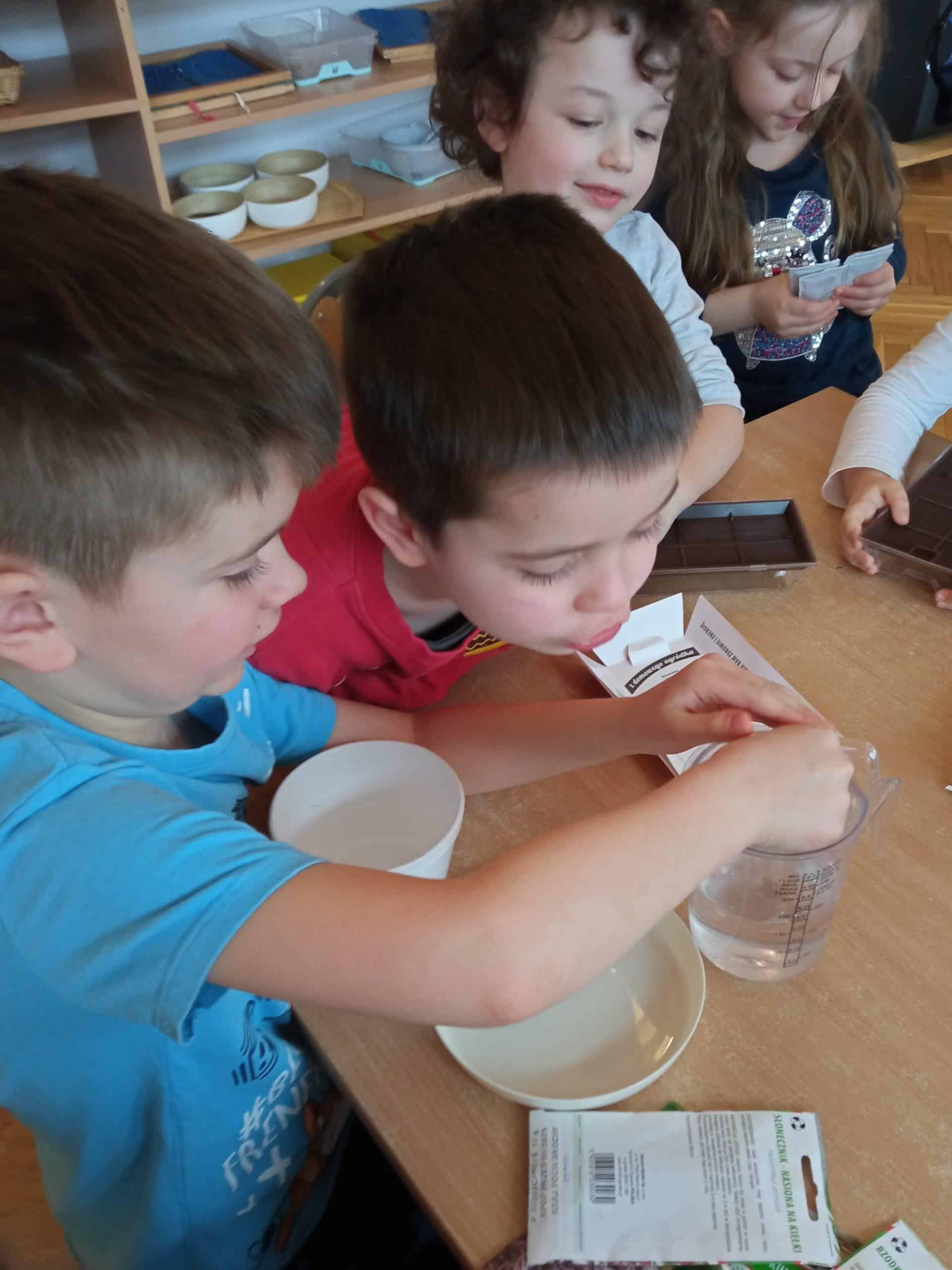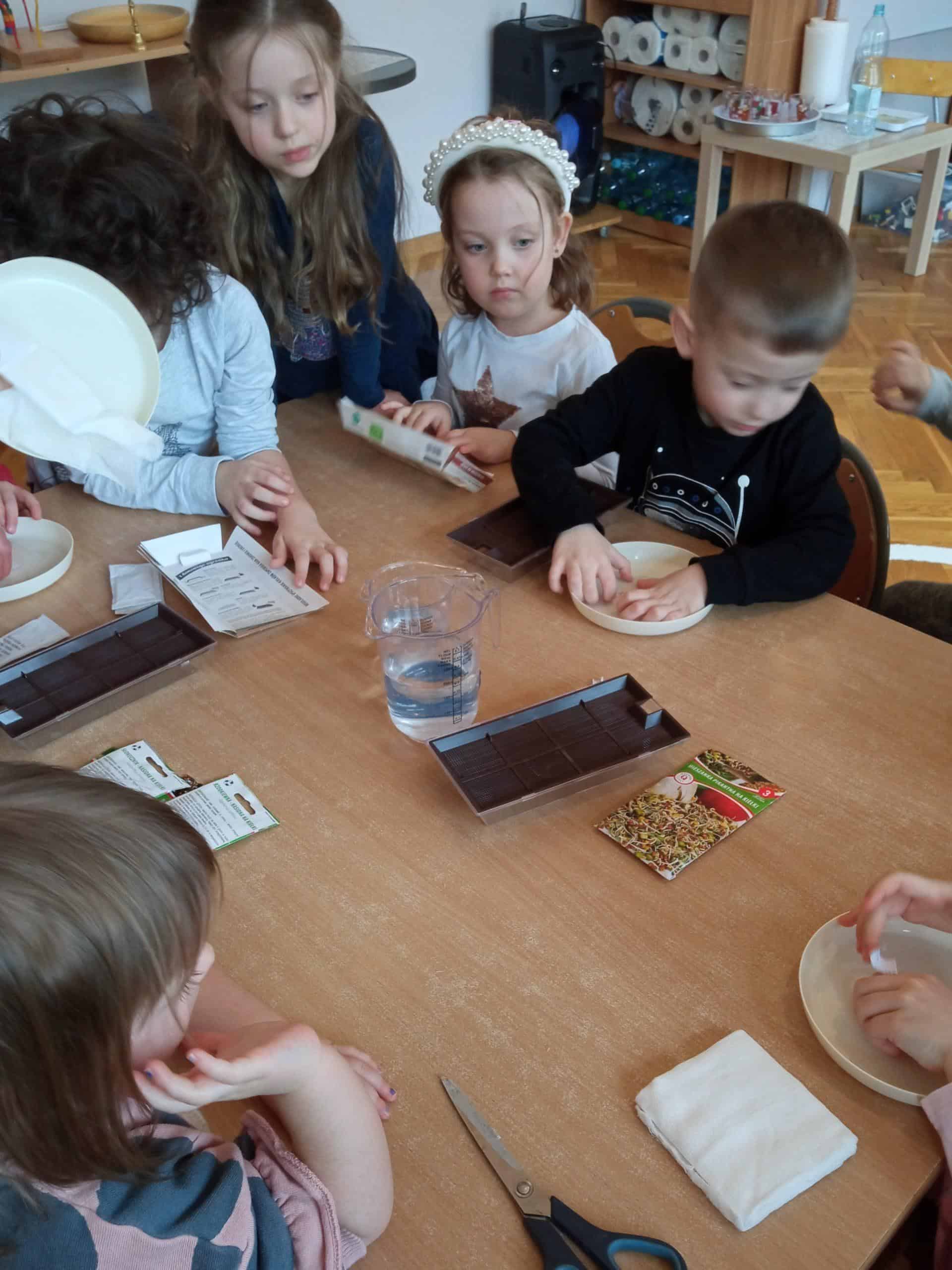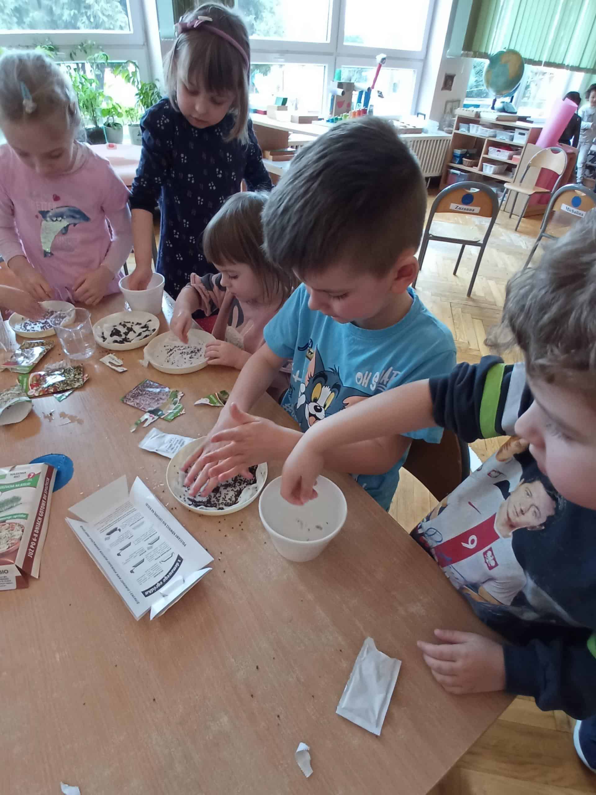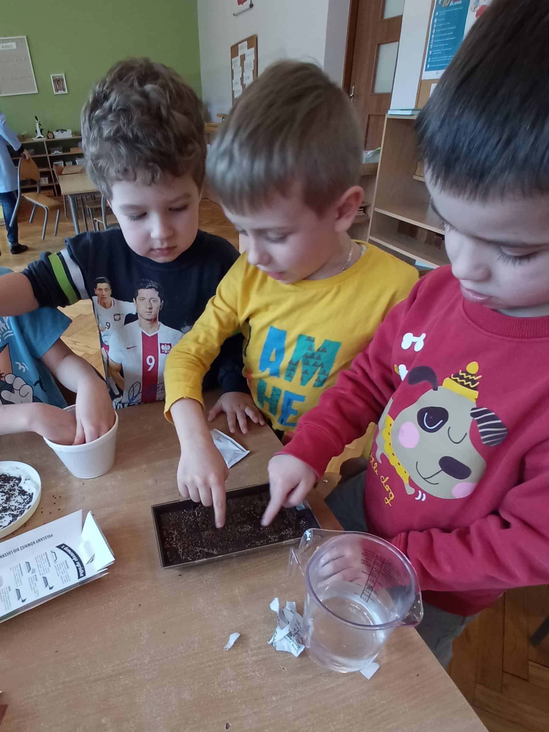 Zima nie chce dać o sobie zapomnieć, pogoda nadal nie rozpieszcza, ale my, chcąc „zakląć” naszą rzeczywistość podejmujemy działania, które mają przyspieszyć przyjście do nas tak bardzo wyczekiwanej przez wszystkich wiosny. Na zakładanie ogródka warzywnego jeszcze troszkę za wcześnie, dlatego my postanowiliśmy się zająć wysiewem budzących się do życia nasion, czyli kiełków, zwanych mini warzywami. Większość dzieci nie wiedziała czym są i jak wyglądają kiełki. Dużym zdziwieniem stała się też dla nich informacja, iż kiełki są wysiewane bez użycia ziemi. Z filmu pt. „Kiełki – jak hodować i dlaczego warto jeść” dowiedzieliśmy jak można w domowych warunkach wyhodować kiełki oraz jak wiele drogocennych minerałów, witamin i antyoksydantów, które „wymiatają” z organizmu wolne rodniki, odpowiedzialne m.in. za choroby i starzenie się, zawierają w swych nasionkach. Wysłuchaliśmy rad dotyczących zakładania hodowli kiełków, a później zabraliśmy się za pracę. Na kiełkownicach, oraz plastikowych podstawkach wypełnianych wilgotnymi gazami zaczęliśmy nasze wysiewy.