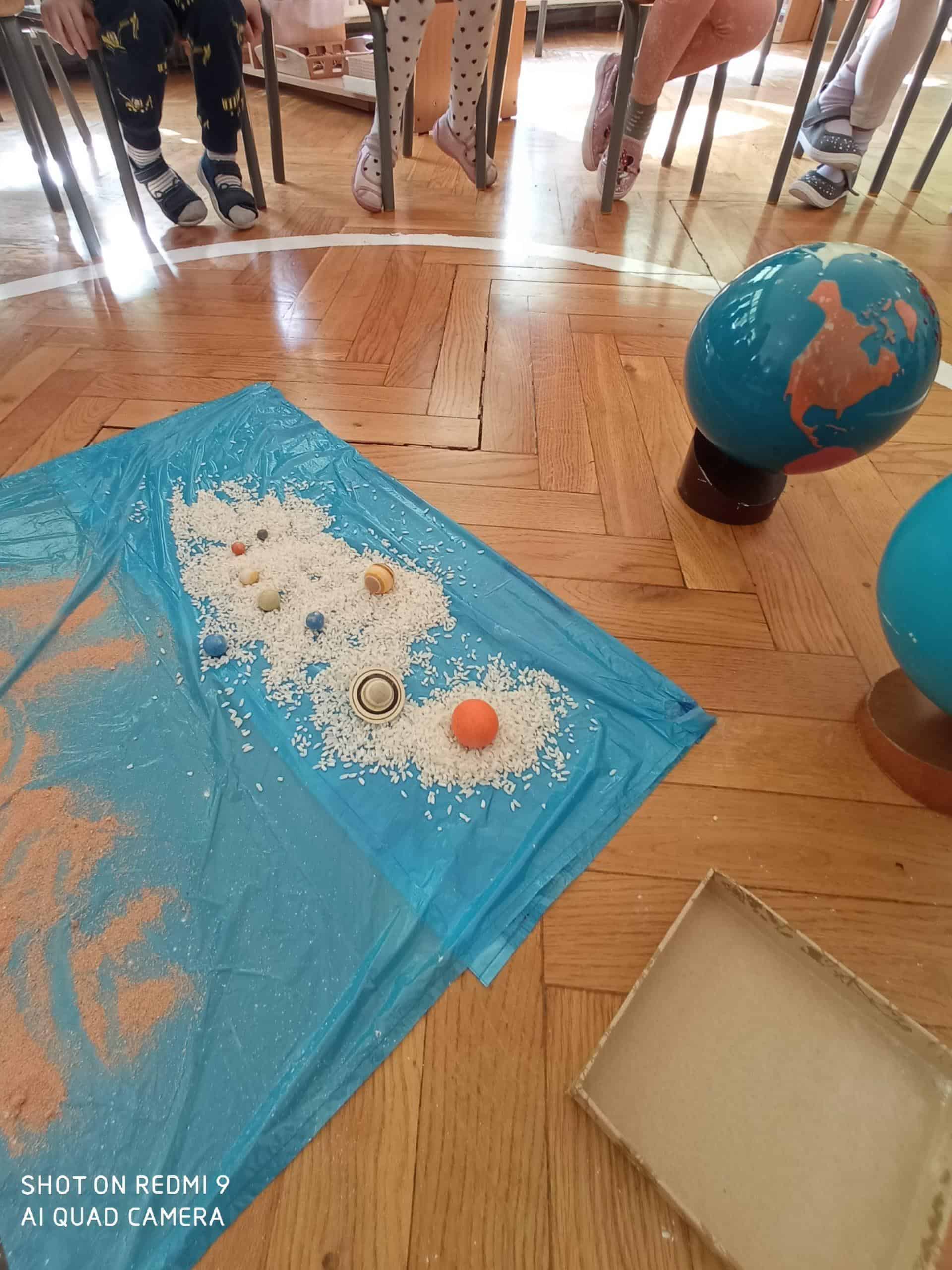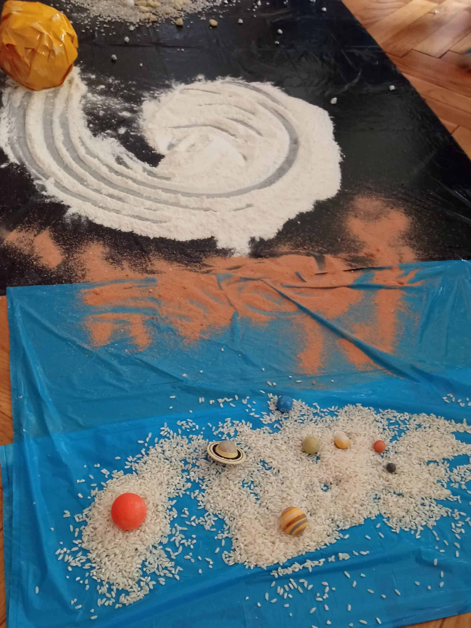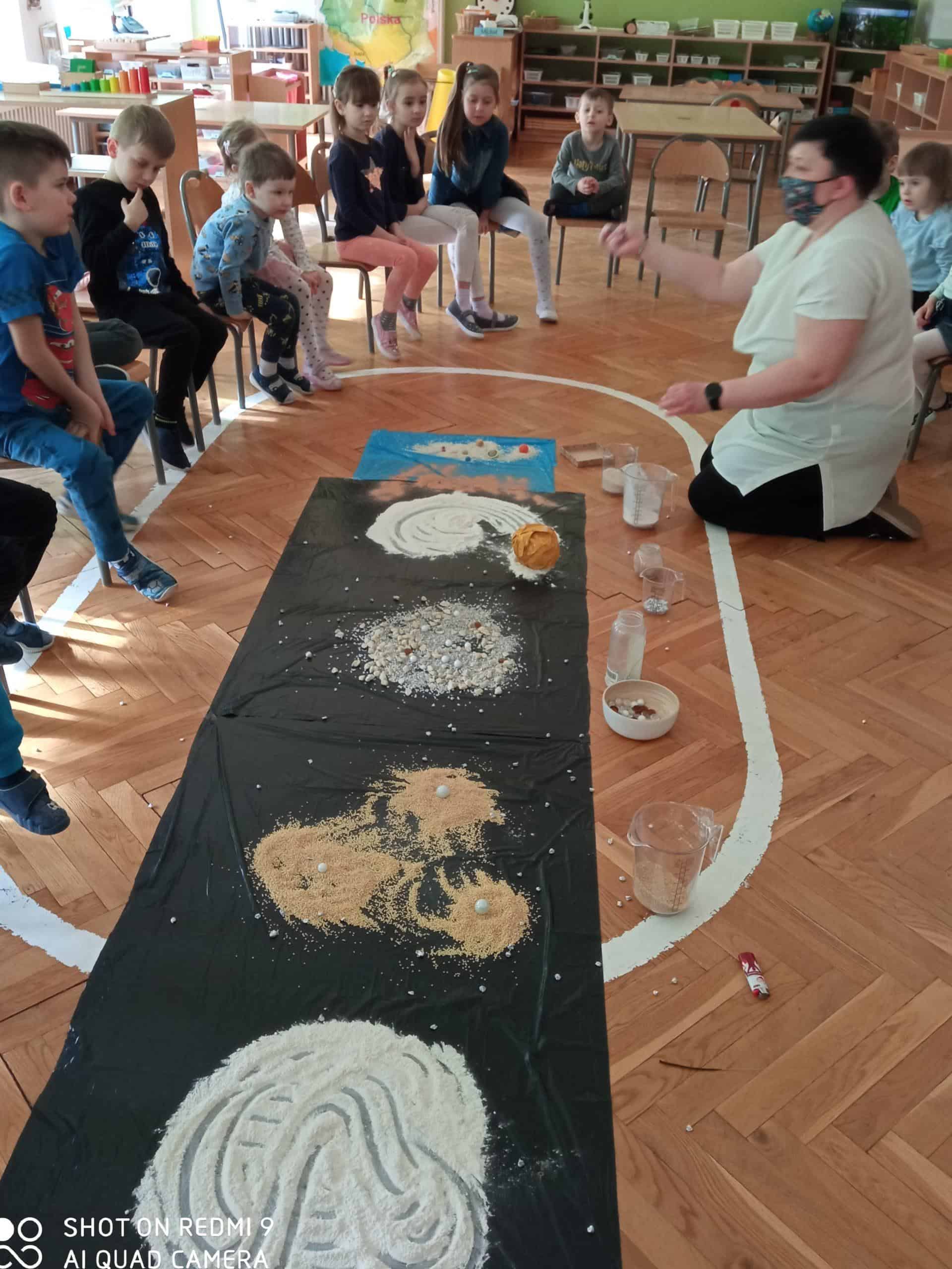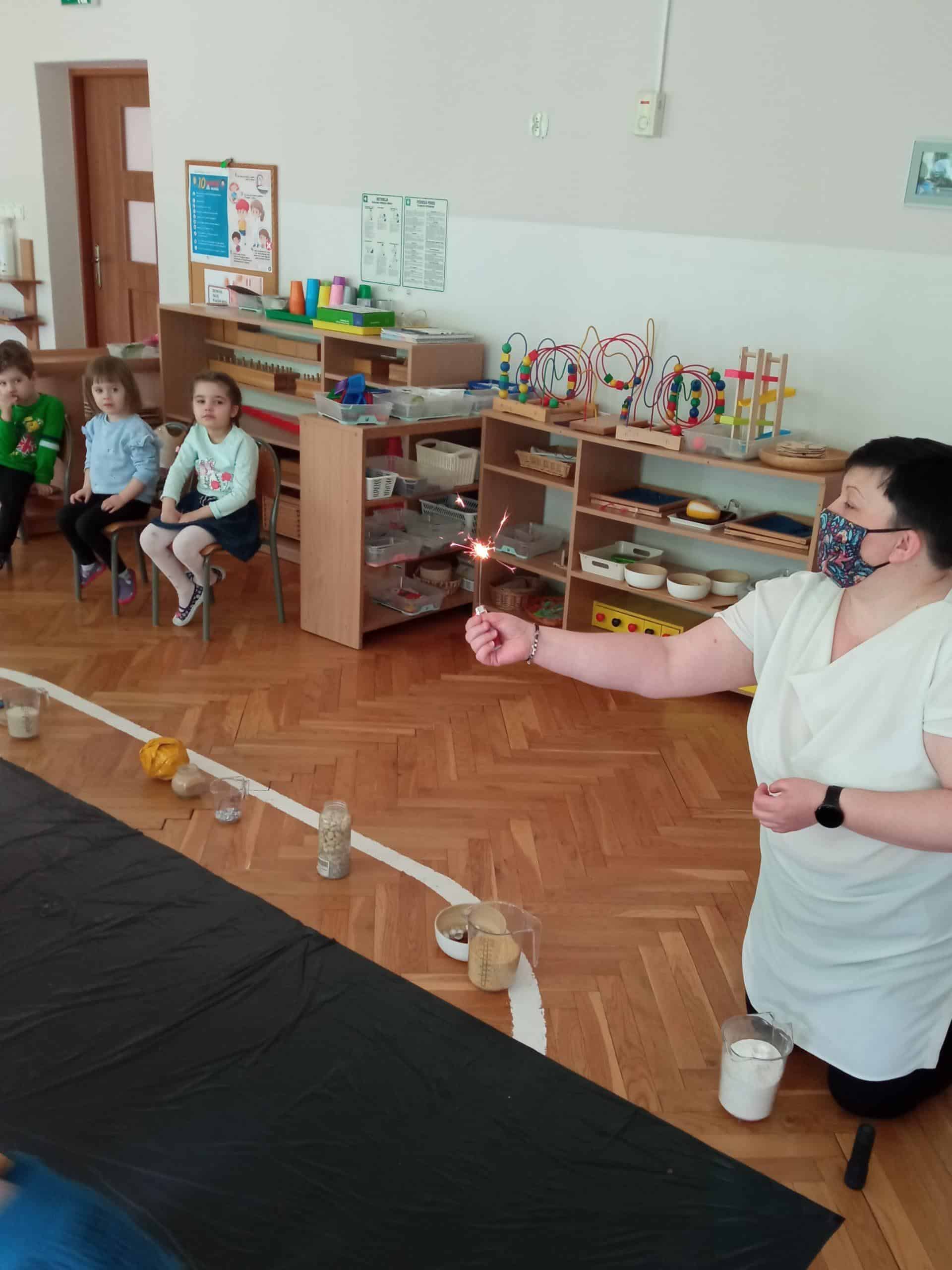 Pedagogika Marii Montessori zachęcała do tego, żeby patrzeć szeroko i pokazywać dzieciom całość świata w przeróżnych odsłonach. Z pewnością bardzo pomocne są w tym nasze montessoriańskie Wielkie Lekcje. Pierwsza z nich – Powstanie Wszechświata – odbyła się w naszej grupie w tym tygodniu. Od wielkiego wybuchu, powstania atomu, tworzeniu się galaktyk, gwiazd i planet, po powstanie kontynentów na naszej planecie. Pierwsza Wielka Lekcja jest chyba najbardziej widowiskowa – brokat, wybuchy i zimne ognie, świecące kamyczki i szklane kulki, to wszystko sprawia, że dzieci przeżywają ją w dużym skupieniu i ciszy. Wielkie Lekcje Montessori są lekcjami jedynie z nazwy. Tak naprawdę z klasyczną lekcją nie mają nic wspólnego. To swego rodzaju pokaz, zaproszenie do magicznego świata wiedzy. Wydarzenie to ma więcej ze spektaklu teatralnego albo pasjonującej opowieści, bowiem Wielkie Lekcje mają dzieci inspirować, zachęcić do poszukiwań, pytań, samodzielnej pracy i pomysłów na własne działania. Nauczyciel nie wyjaśnia nic szczegółowo, nie operuje zbyt trudnymi pojęciami. Jego zadaniem jest dać ogólny obraz. Dla dzieci jest to trochę jak opowieść ze świata magii, ale wszystko to, co mówi nauczyciel, jest prawdziwe. Wielka Lekcja nie służy temu, żeby dzieci zrozumiały wszystkie procesy fizyczne i chemiczne, ma ona przede wszystkim zachwycić i zachęcić do zadawania pytań.
