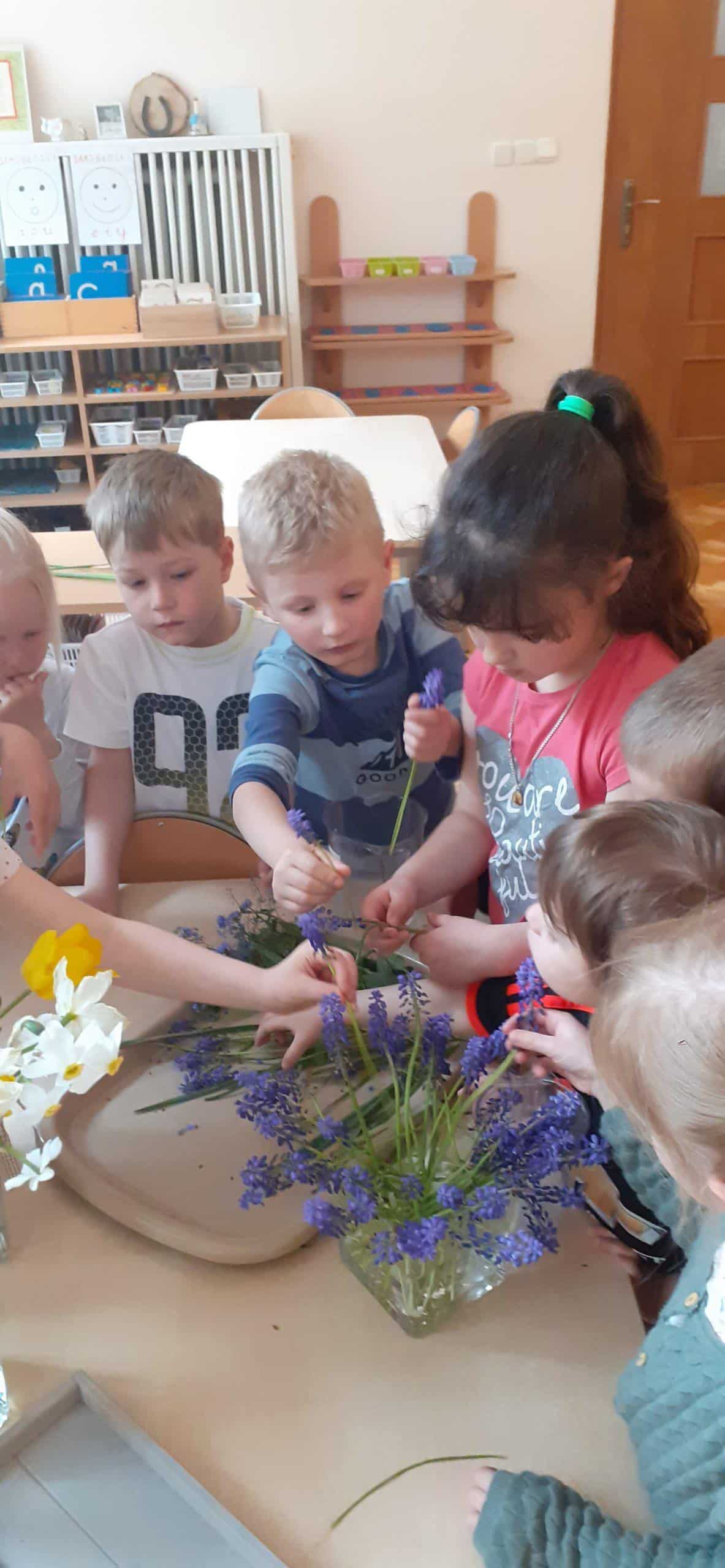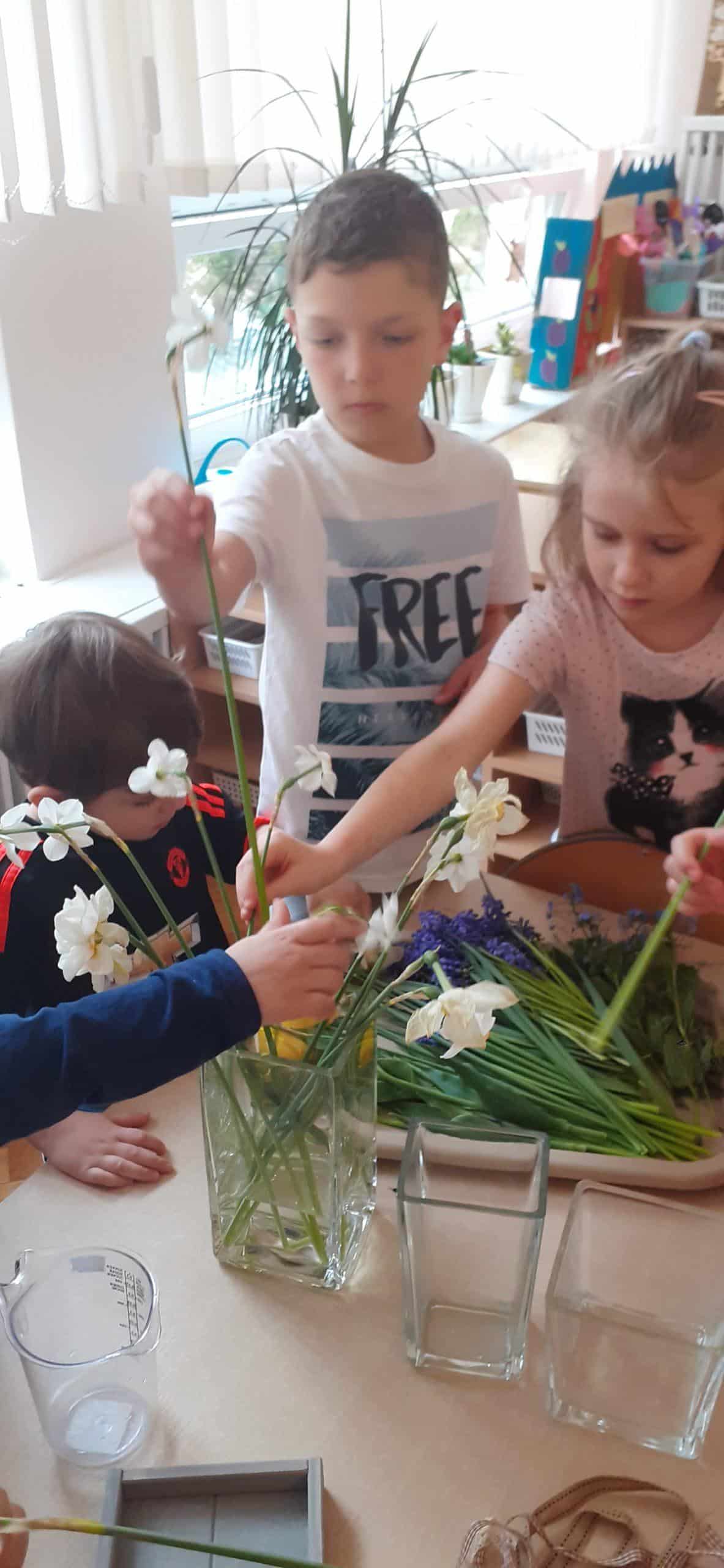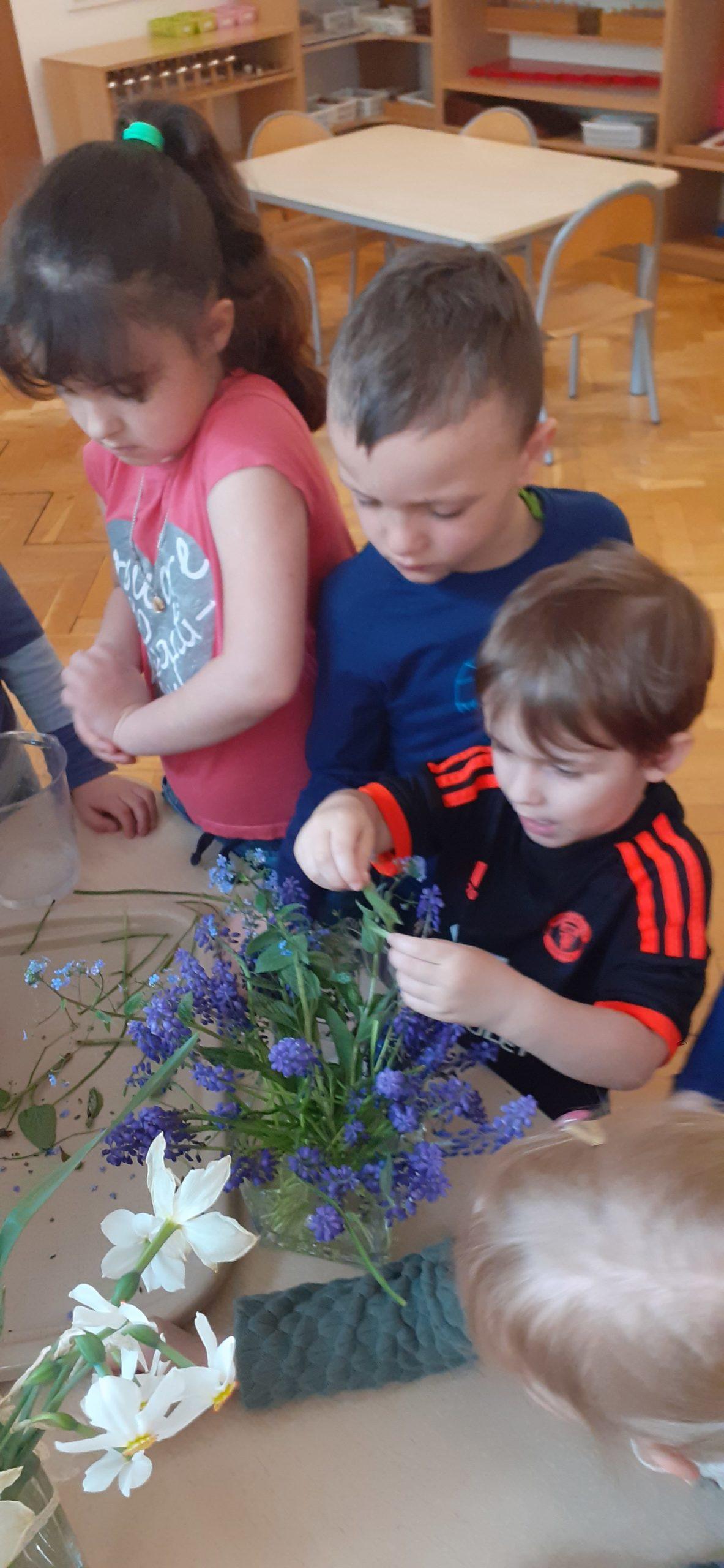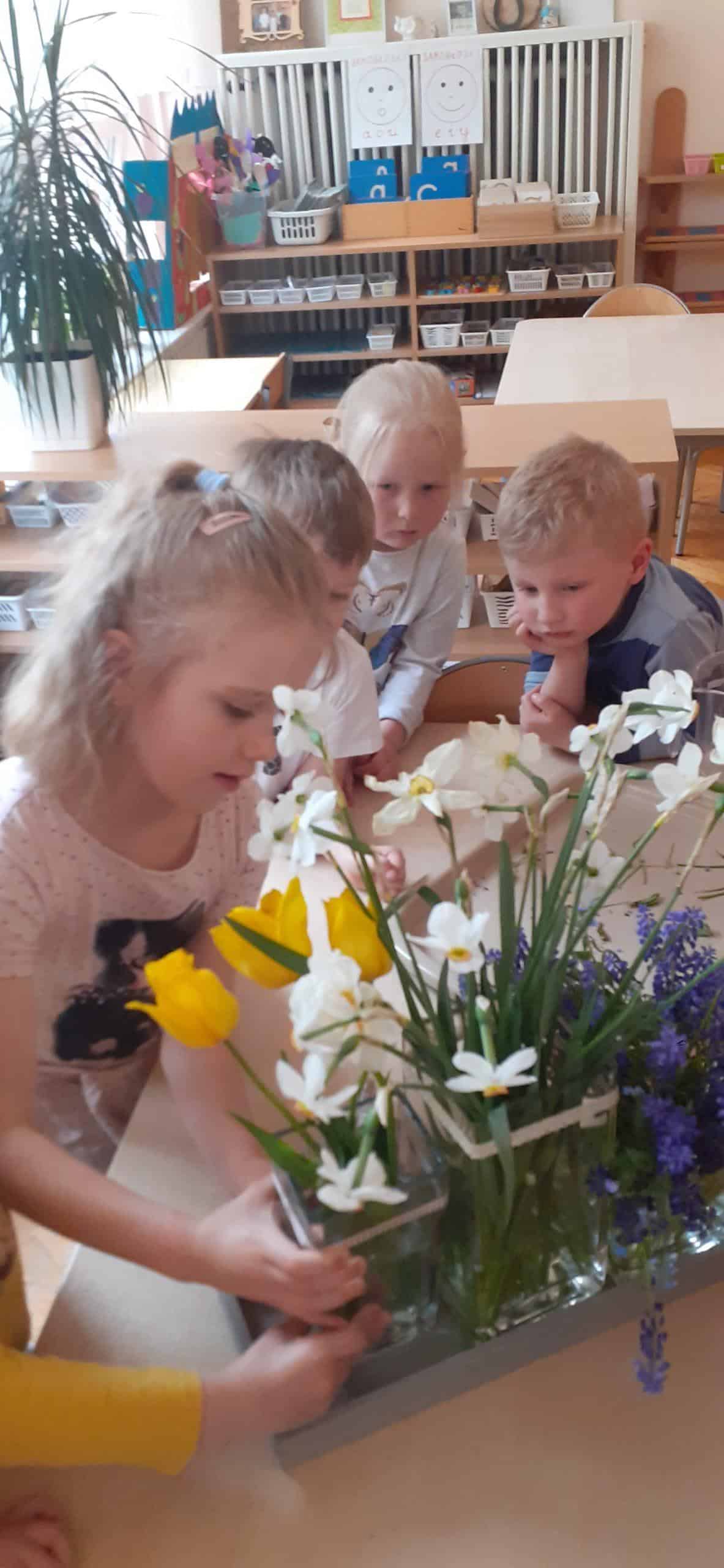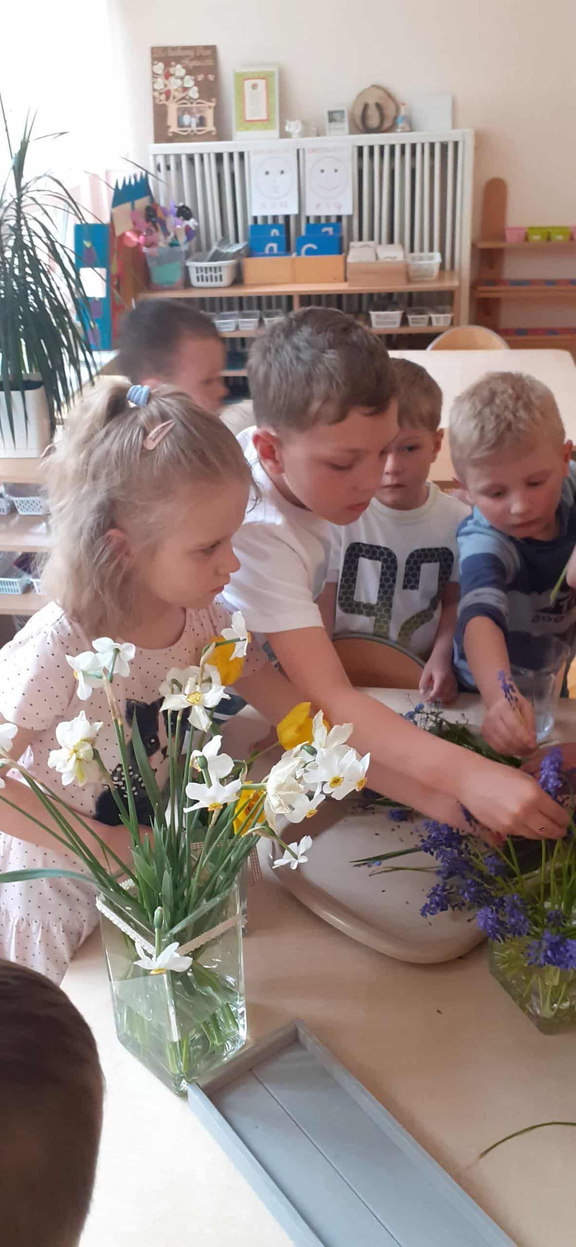 Wiosna to w naszym otoczeniu mnóstwo kolorowych i cudownych kwiatów. Postanowiliśmy wykorzystać ten fakt w praktycznym działaniu. W pedagogice Montessori ogromną wagę przywiązuje się do obcowania dzieci z naturą, z jej walorami, a przede wszystkim pięknem. Rozbudza się wśród dzieci poczucie estetyki. Pojawiły się w sali zajęć szafirki, tulipany i narcyzy. I tu wykorzystaliśmy montessoriańskie ćwiczenia dnia codziennego w zakresie dbałości o otoczenie. Pielęgnacja kwiatów ciętych jest doskonałym tego przykładem. Dzieci po poznaniu walorów estetycznych tych kwiatów przystąpiły do nauki układania bukietów. Wypełnienie wazonów odpowiednią ilością wody, to też ćwiczenie dnia codziennego i przy okazji nauka płynnych , delikatnych ruchów rąk przy nalewaniu wody. Dzieci z pietyzmem układały kwiaty w bukiety, przycinały zbyt długie gałązki, usuwały uschnięte części, po to aby estetycznie prezentowały się w wazonach. To ważna, praktyczna umiejętność dnia codziennego, bo przecież okazji do wręczania kwiatów nie brakuje. Przy okazji utrwaliliśmy budowę kwiatu, dzieci mogły wyróżnić słupek, pręciki, płatki korony , przylistki i łodygę. Powstały przepiękne bukiety, które potem stały się inspiracją do aktywności plastycznej dzieci . Brawo.