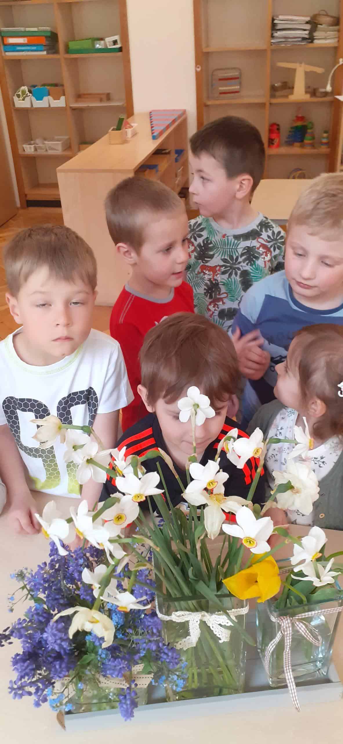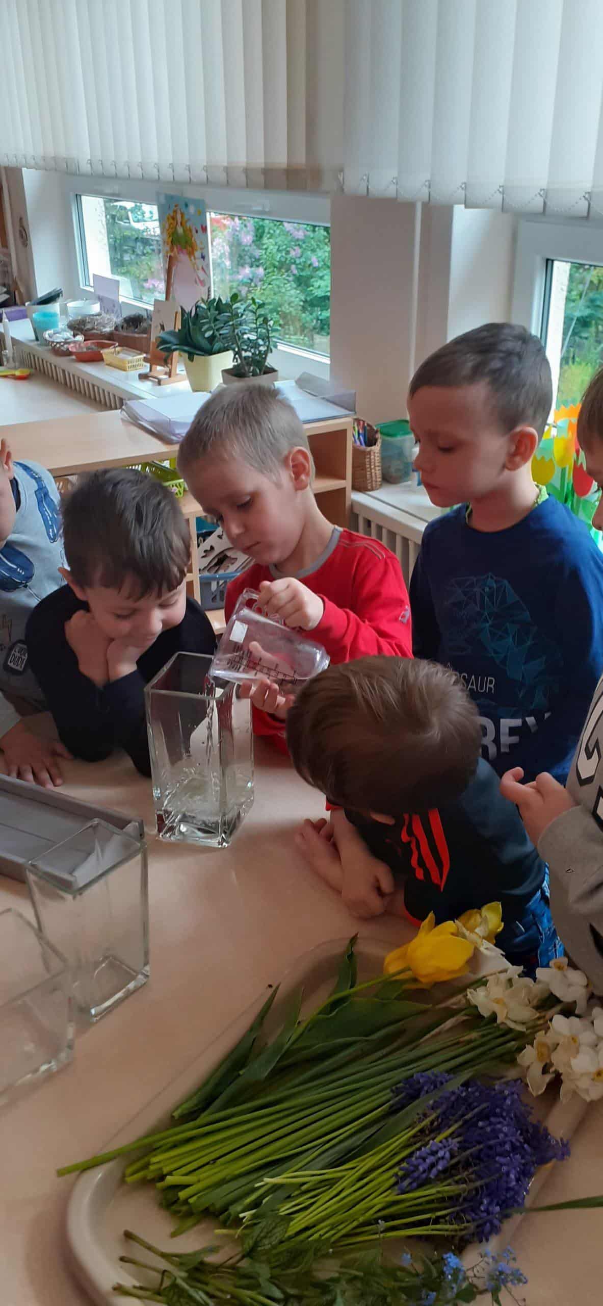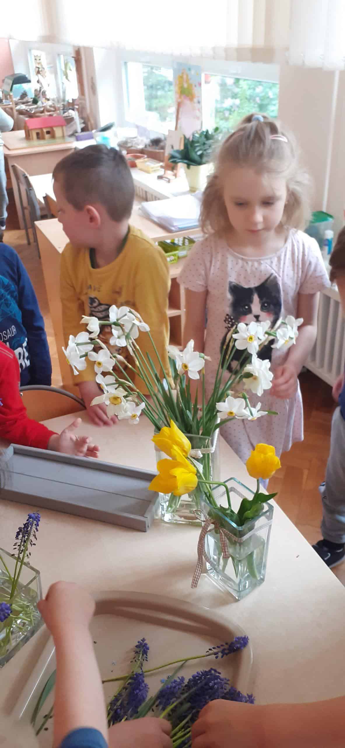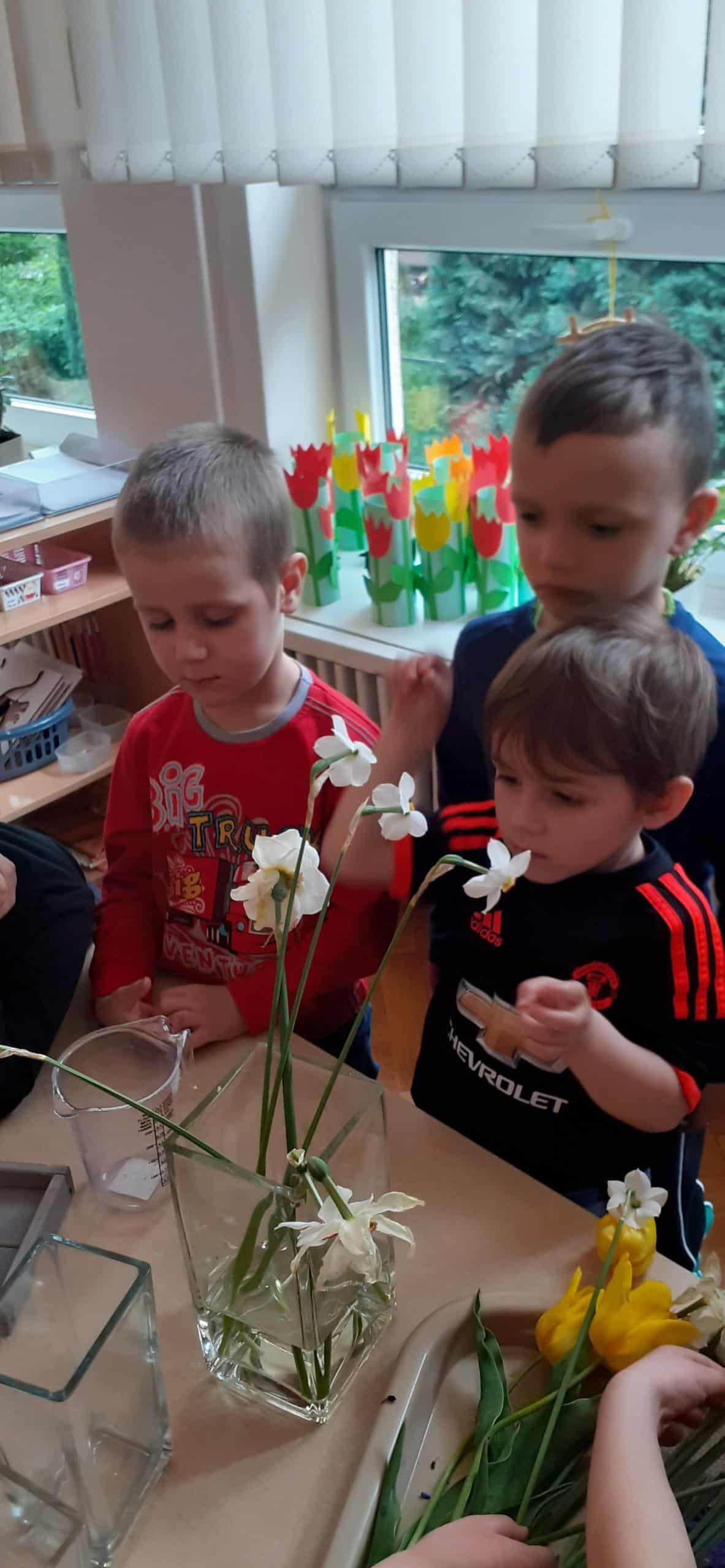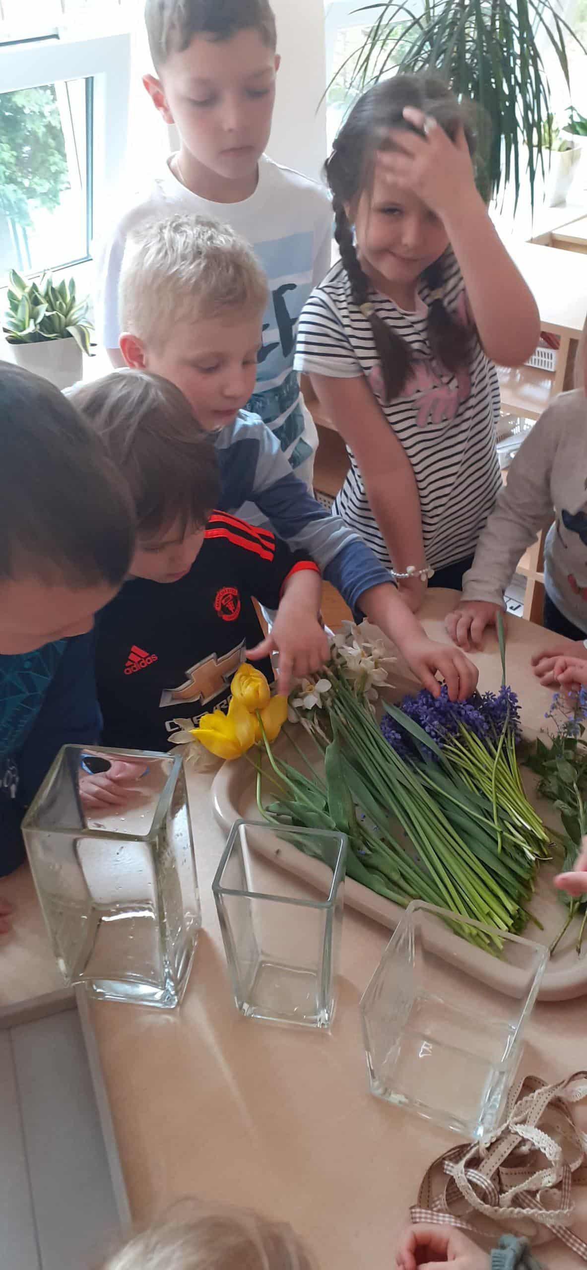 Wiosna to w naszym otoczeniu mnóstwo kolorowych i cudownych kwiatów. Postanowiliśmy wykorzystać ten fakt w praktycznym działaniu. W pedagogice Montessori ogromną wagę przywiązuje się do obcowania dzieci z naturą, z jej walorami, a przede wszystkim pięknem. Rozbudza się wśród dzieci poczucie estetyki. Pojawiły się w sali zajęć szafirki, tulipany i narcyzy. I tu wykorzystaliśmy montessoriańskie ćwiczenia dnia codziennego w zakresie dbałości o otoczenie. Pielęgnacja kwiatów ciętych jest doskonałym tego przykładem. Dzieci po poznaniu walorów estetycznych tych kwiatów przystąpiły do nauki układania bukietów. Wypełnienie wazonów odpowiednią ilością wody, to też ćwiczenie dnia codziennego i przy okazji nauka płynnych , delikatnych ruchów rąk przy nalewaniu wody. Dzieci z pietyzmem układały kwiaty w bukiety, przycinały zbyt długie gałązki, usuwały uschnięte części, po to aby estetycznie prezentowały się w wazonach. To ważna, praktyczna umiejętność dnia codziennego, bo przecież okazji do wręczania kwiatów nie brakuje. Przy okazji utrwaliliśmy budowę kwiatu, dzieci mogły wyróżnić słupek, pręciki, płatki korony , przylistki i łodygę. Powstały przepiękne bukiety, które potem stały się inspiracją do aktywności plastycznej dzieci . Brawo.