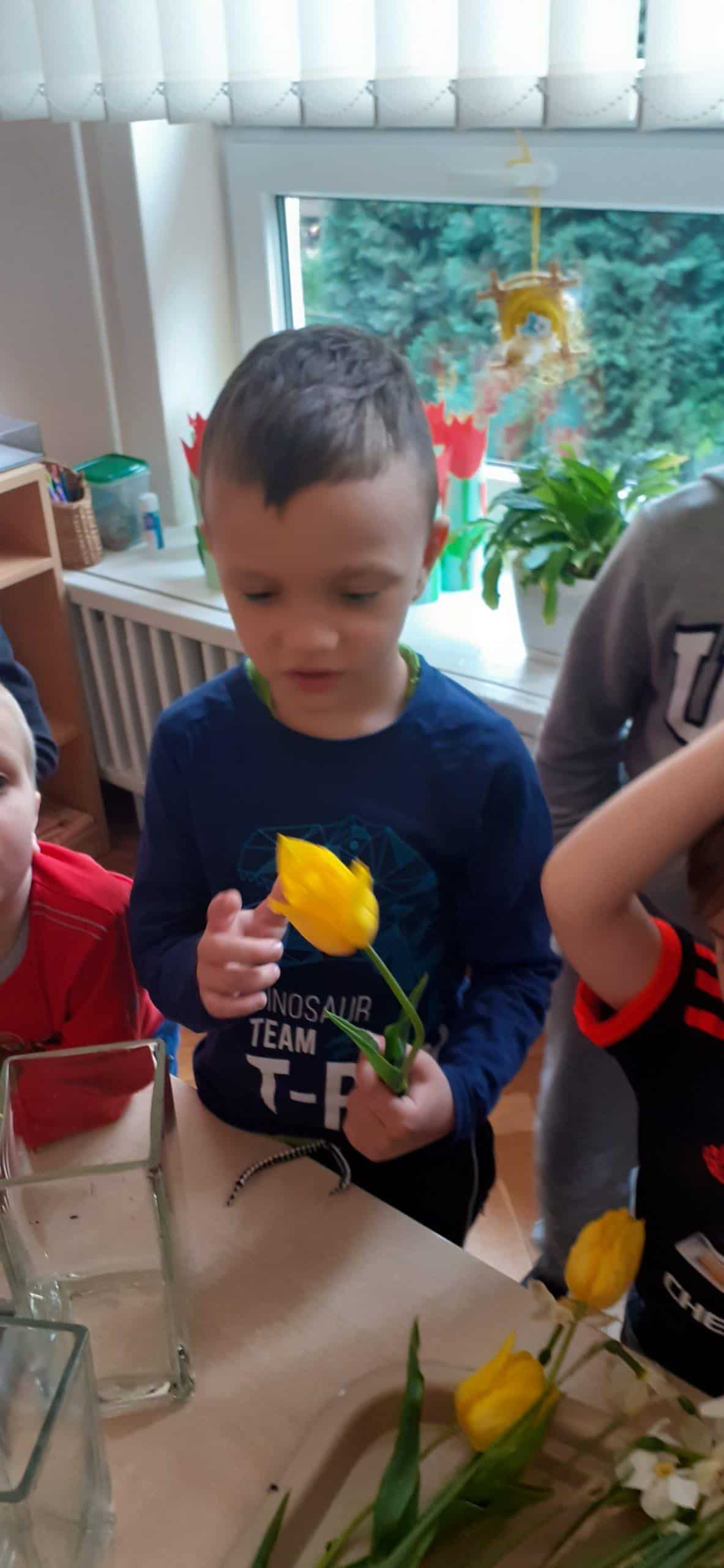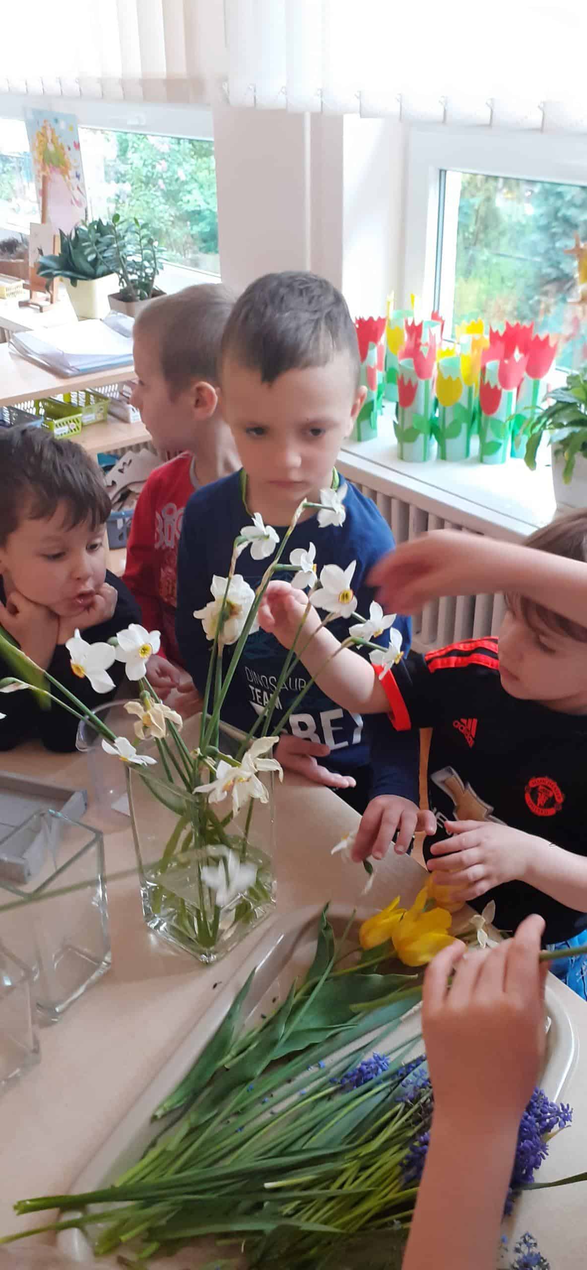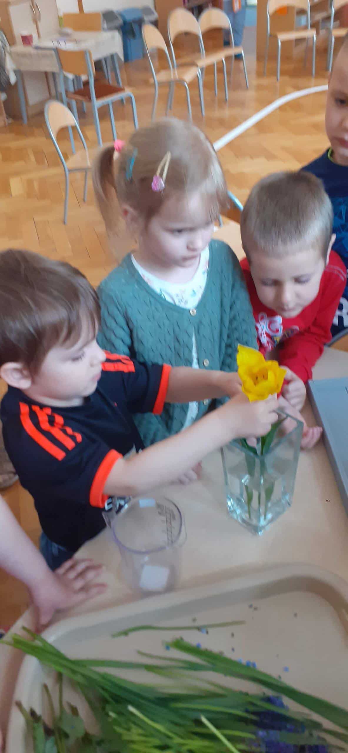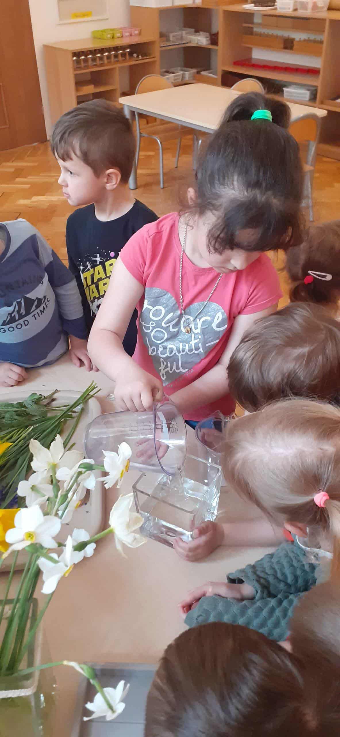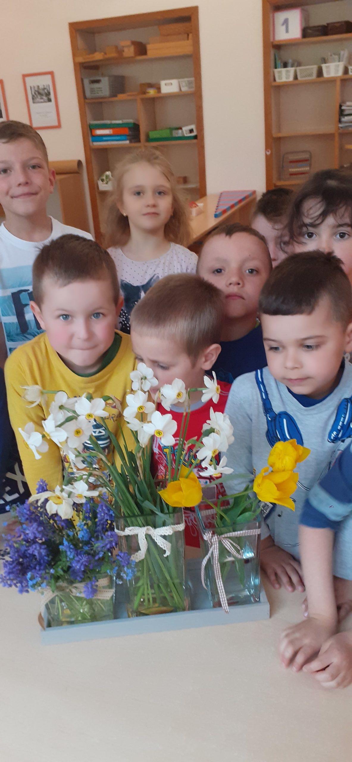 Wiosna to w naszym otoczeniu mnóstwo kolorowych i cudownych kwiatów. Postanowiliśmy wykorzystać ten fakt w praktycznym działaniu. W pedagogice Montessori ogromną wagę przywiązuje się do obcowania dzieci z naturą, z jej walorami, a przede wszystkim pięknem. Rozbudza się wśród dzieci poczucie estetyki. Pojawiły się w sali zajęć szafirki, tulipany i narcyzy. I tu wykorzystaliśmy montessoriańskie ćwiczenia dnia codziennego w zakresie dbałości o otoczenie. Pielęgnacja kwiatów ciętych jest doskonałym tego przykładem. Dzieci po poznaniu walorów estetycznych tych kwiatów przystąpiły do nauki układania bukietów. Wypełnienie wazonów odpowiednią ilością wody, to też ćwiczenie dnia codziennego i przy okazji nauka płynnych , delikatnych ruchów rąk przy nalewaniu wody. Dzieci z pietyzmem układały kwiaty w bukiety, przycinały zbyt długie gałązki, usuwały uschnięte części, po to aby estetycznie prezentowały się w wazonach. To ważna, praktyczna umiejętność dnia codziennego, bo przecież okazji do wręczania kwiatów nie brakuje. Przy okazji utrwaliliśmy budowę kwiatu, dzieci mogły wyróżnić słupek, pręciki, płatki korony , przylistki i łodygę. Powstały przepiękne bukiety, które potem stały się inspiracją do aktywności plastycznej dzieci . Brawo.