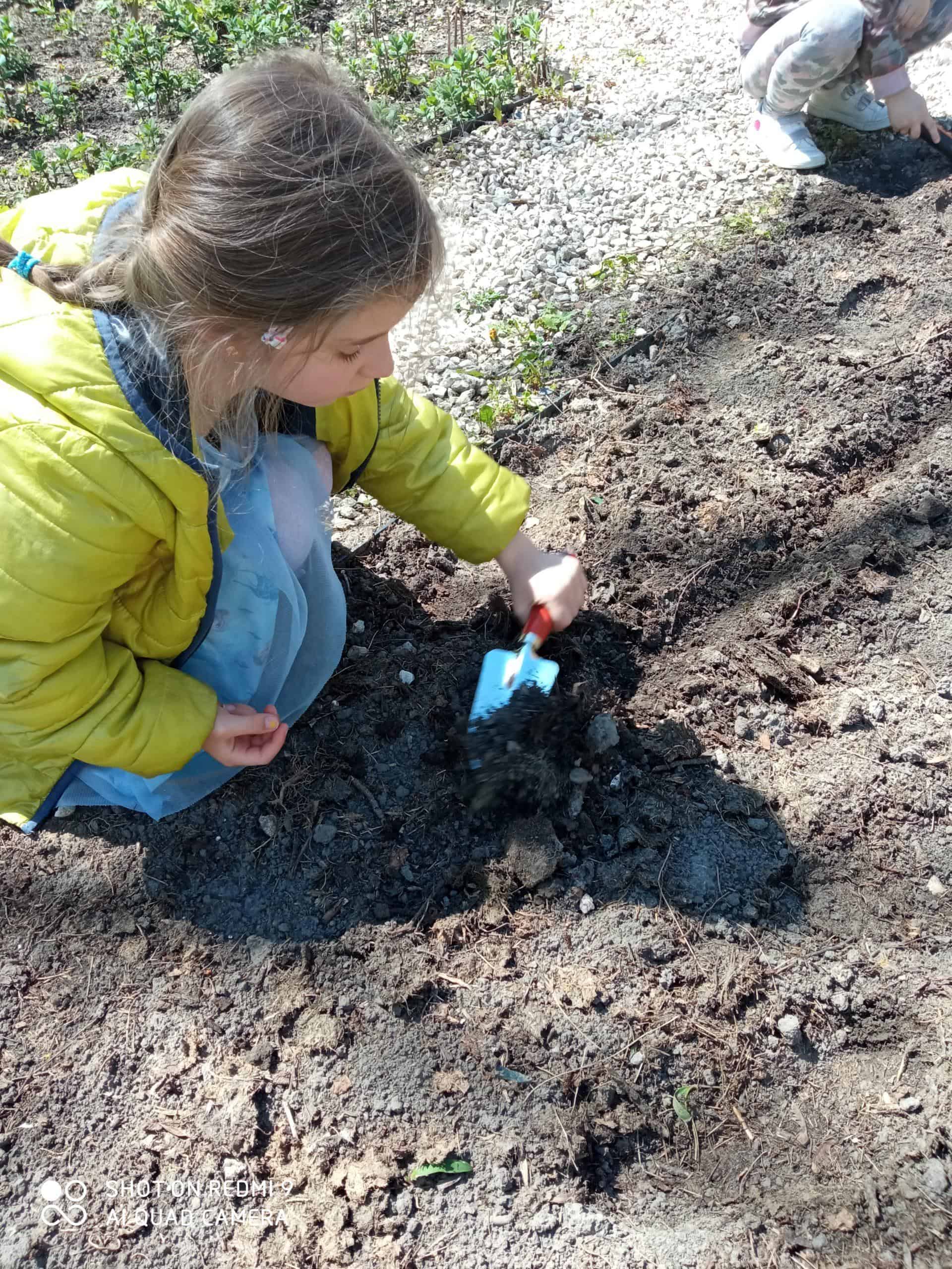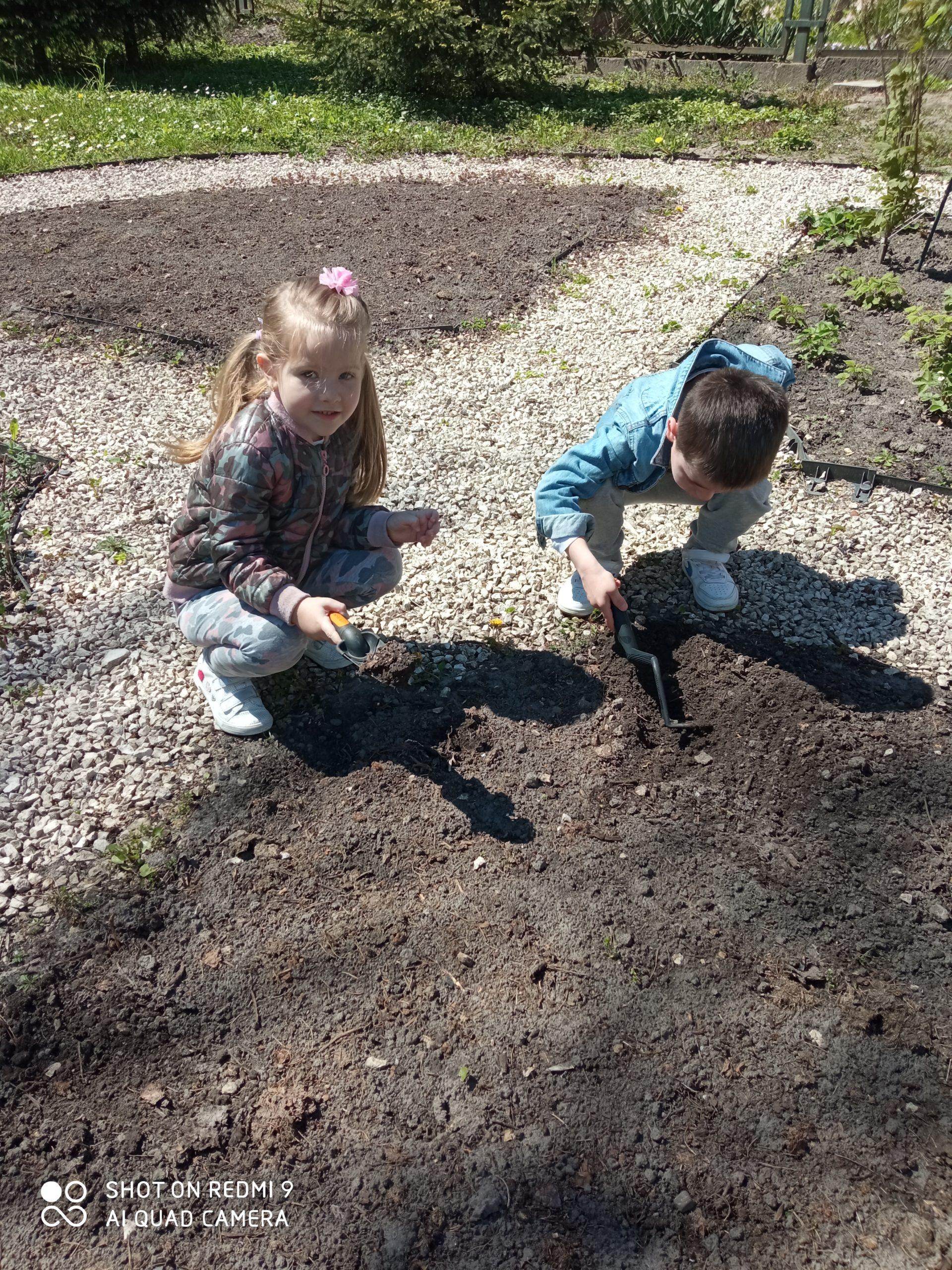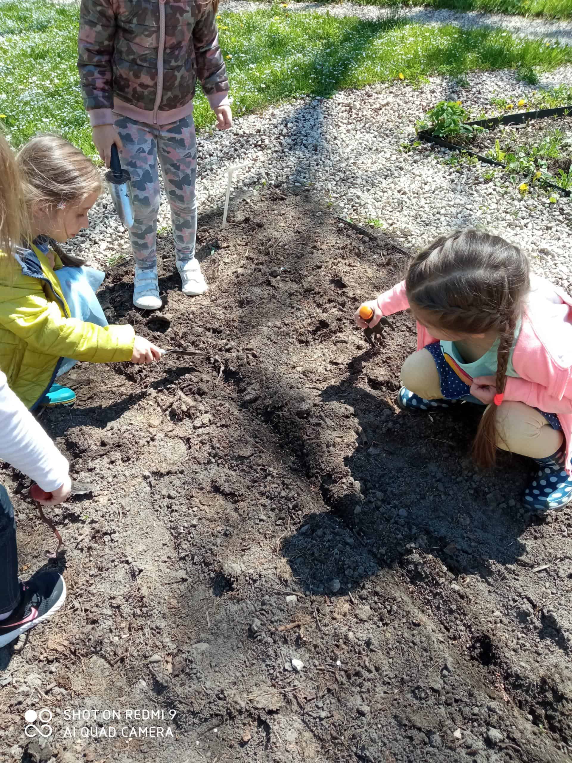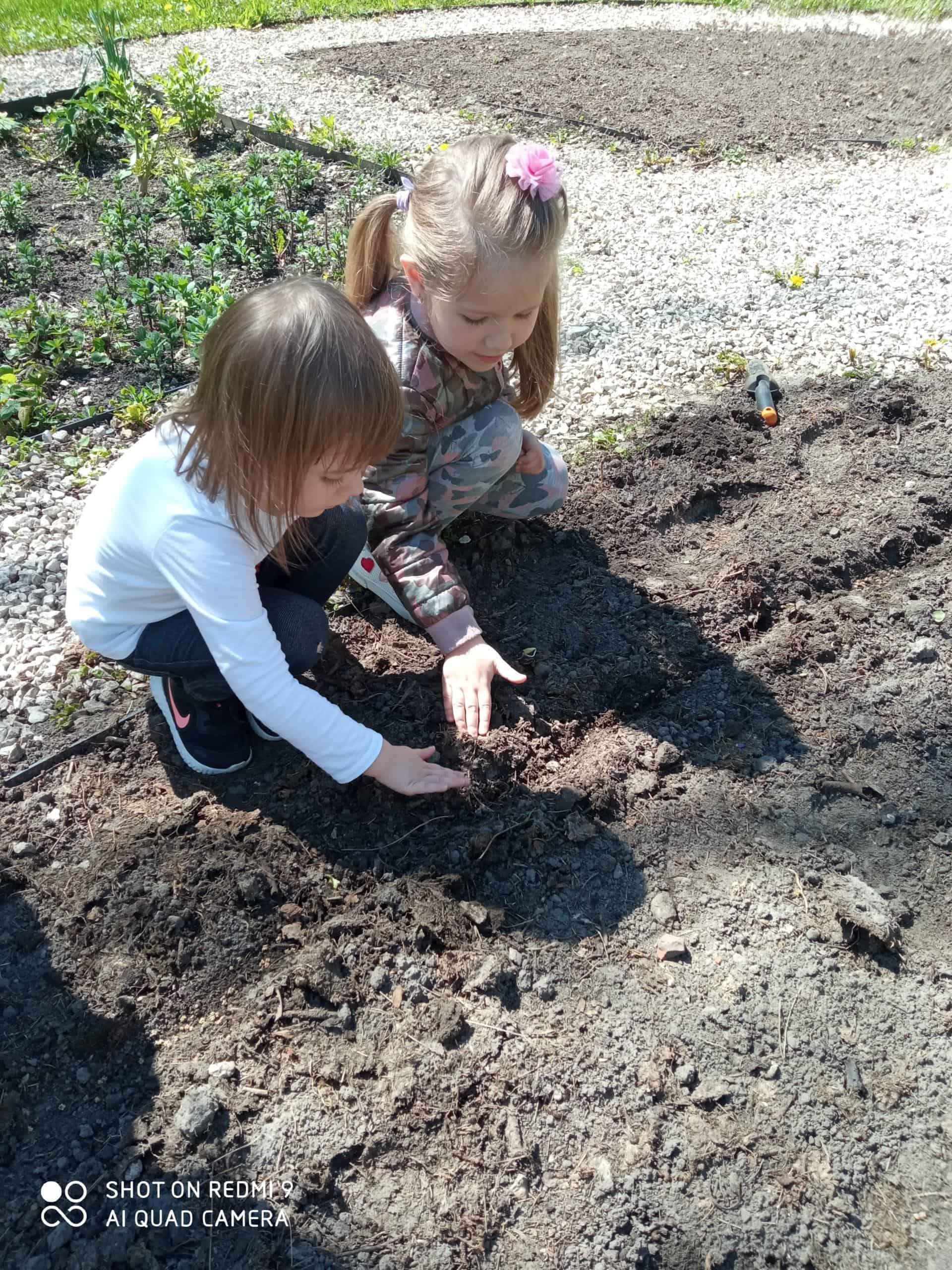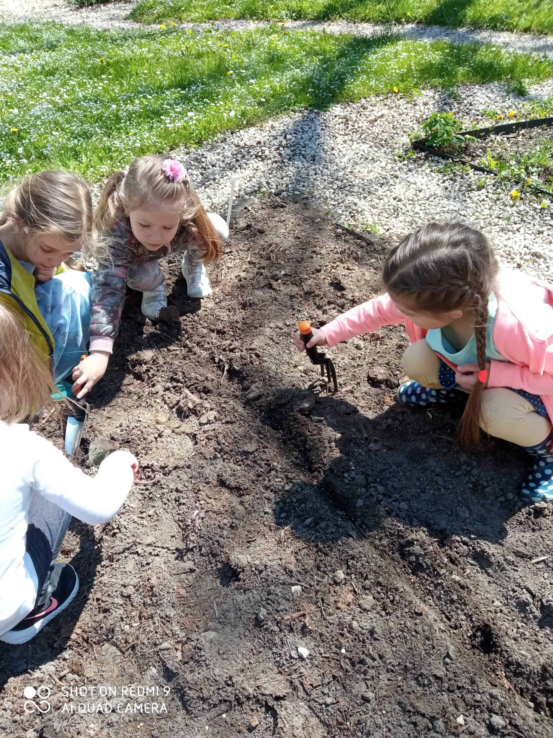 Edukacyjna Ścieżka Przyrodnicza to nasze przedszkolne dobro, z którego jesteśmy bardzo dumni. Oprócz walorów estetycznych daje ona dzieciom ogrom możliwości edukacyjnych. Przedszkolaki mają nieograniczony dostęp do jej zasobów przez wszystkie pory roku, dokonują działań praktycznych takich jak obserwacje przyrodnicze (wygląd, etapy wzrostu, zapachy, kolory itp.), a także sianie, pielenie, podlewanie, zbieranie, czyli autentyczne obcowanie z przyrodą, co dla rozwoju przedszkolaka ma ogromne znaczenie. W tym roku otrzymaliśmy zadanie zagospodarowania jednej części rabatki w naszym, tak zwanym, ogródku przydomowym. Wraz z Grupą Czerwoną mieliśmy na niej zasadzić/ dokonać wysiewu warzyw. Zadnie przyjęte, prace rozpoczęte 🙂 Po burzliwych dyskusjach w grupie dotyczących warzyw, które najbardziej lubimy i chcemy mieć na naszej rabatce, z częścią chętnych przedszkolaków, zabraliśmy się za pracę. Po spulchnieniu ziemi i zrobieniu rowek, zaczęliśmy wysiewy – na naszej części znalazła się sałata, marchewka, buraczki i rzodkiewka. Z naszego grupowego, parapetowego ogródka 🙂 zabraliśmy paprykę i lubczyk. Wszyscy chętni włączali się do pracy – wysiewali, robili dołki, zasypywali, podlewali i wbijali tabliczki informacyjne. Dziewczynki nawet nie chciały rękawiczek, bo stwierdziły, że fajna w dotyku jest ta ziemia…