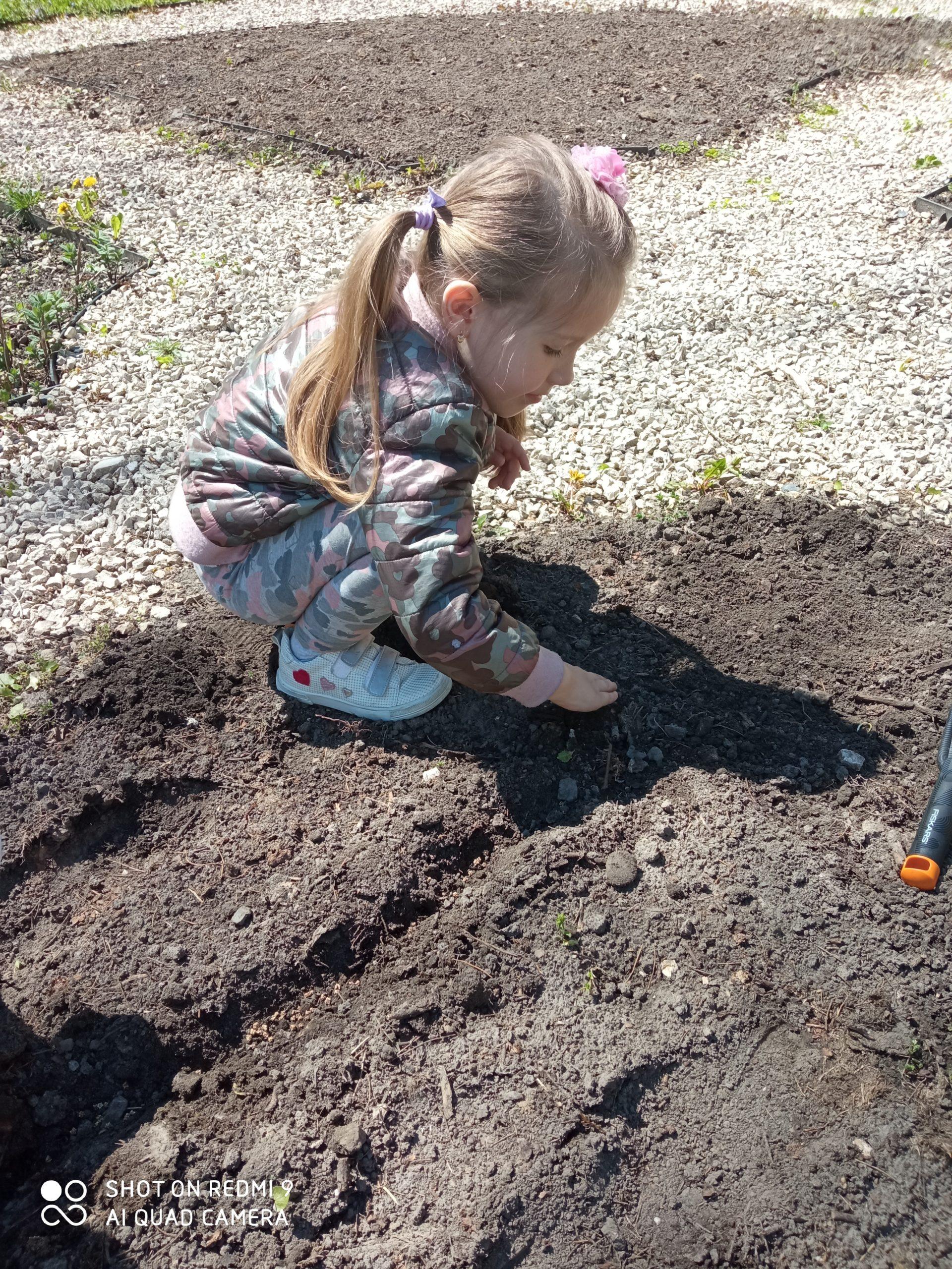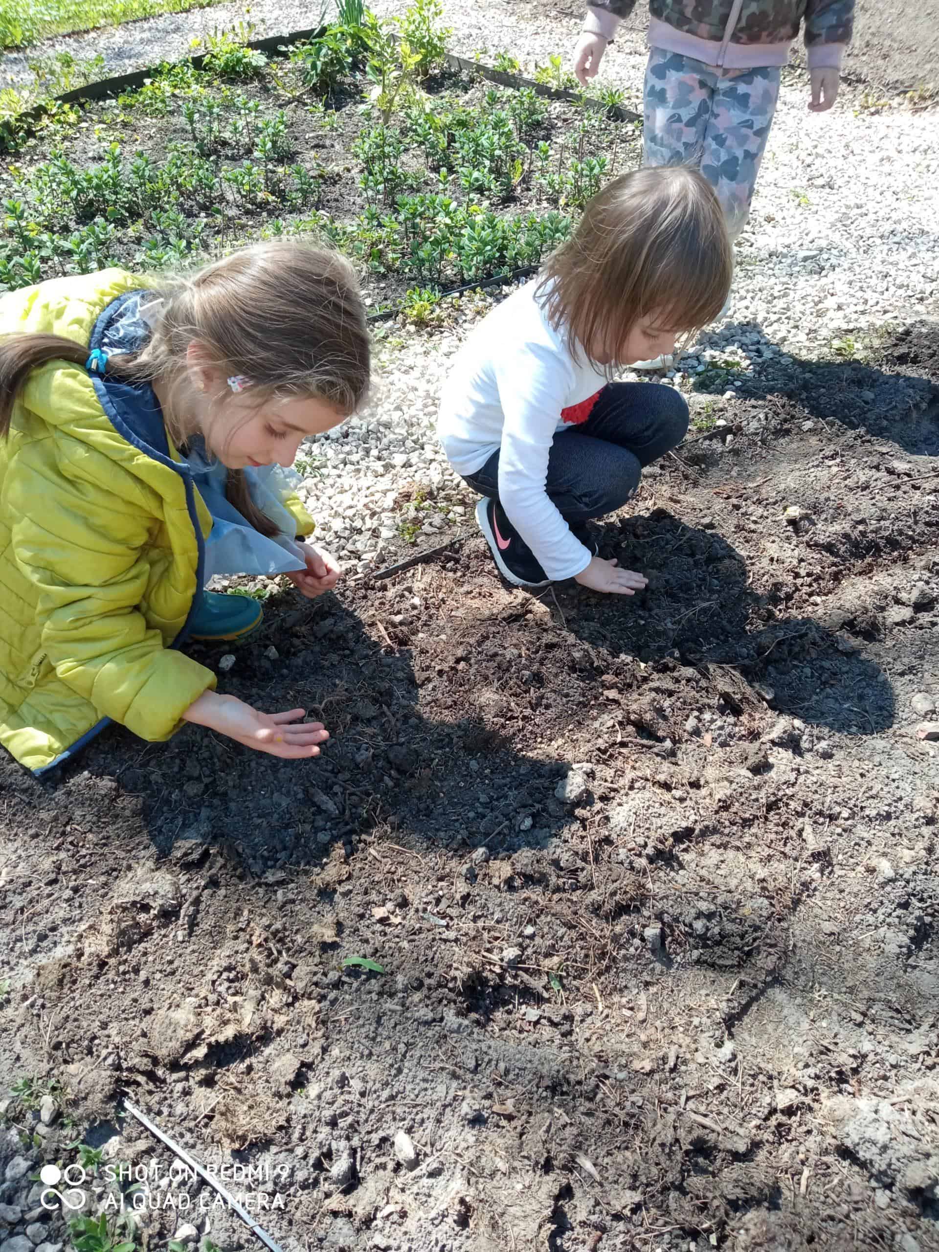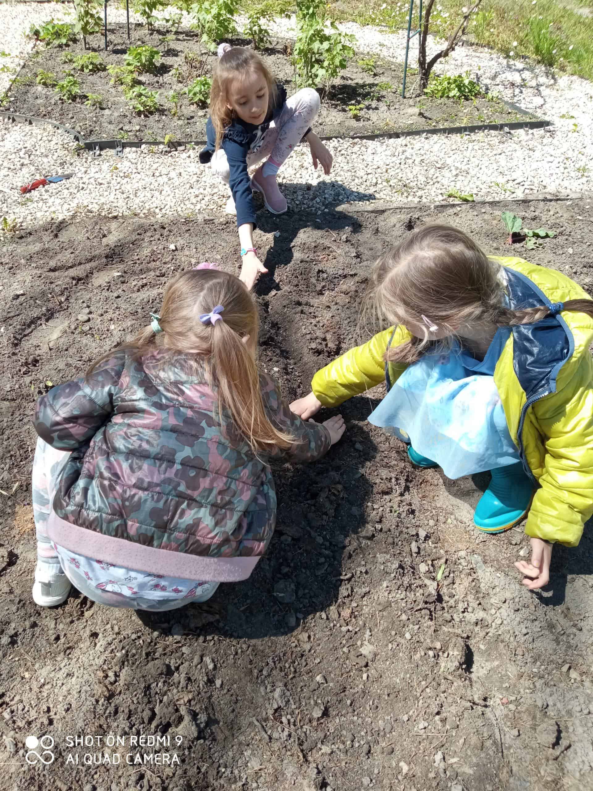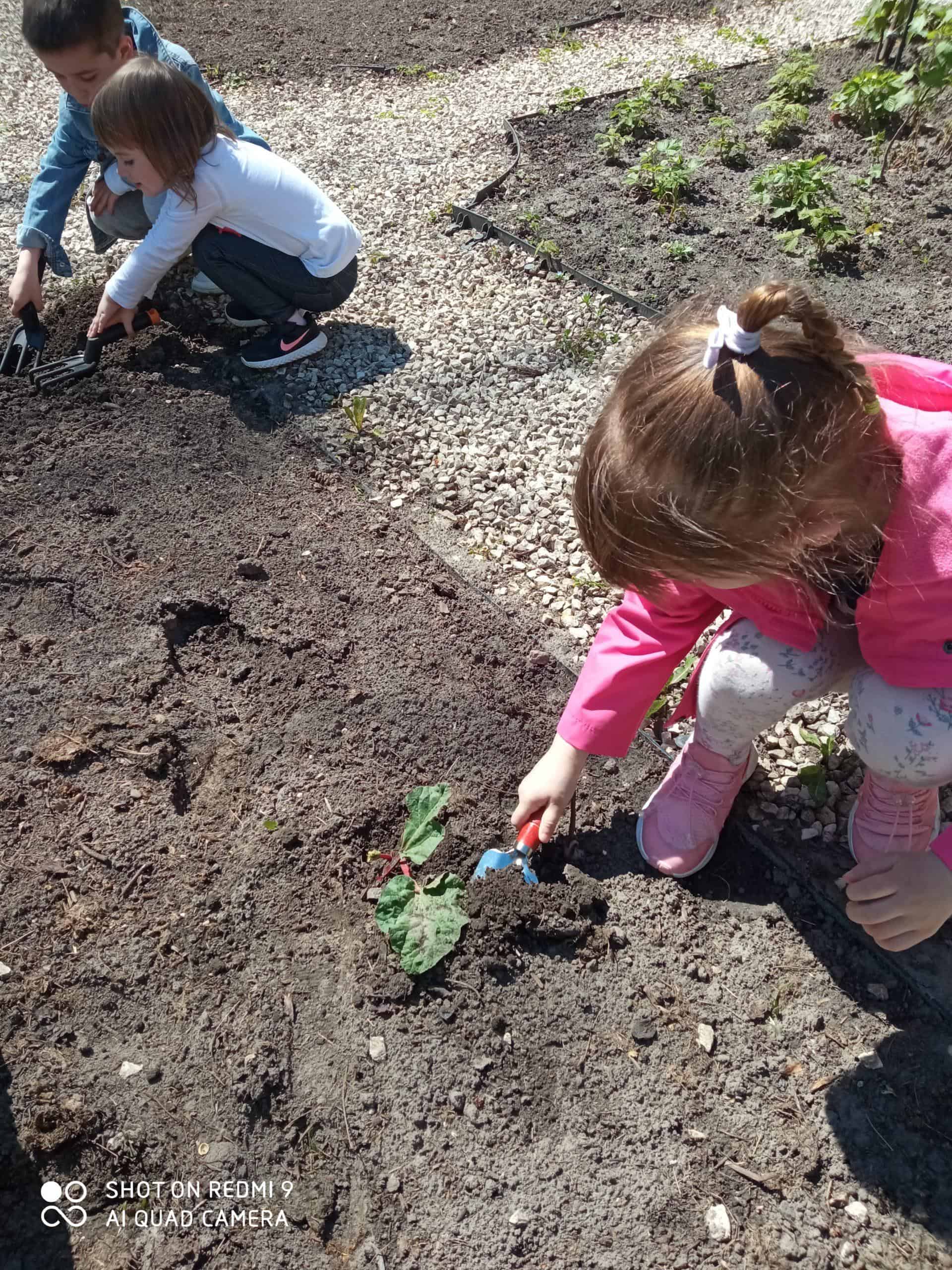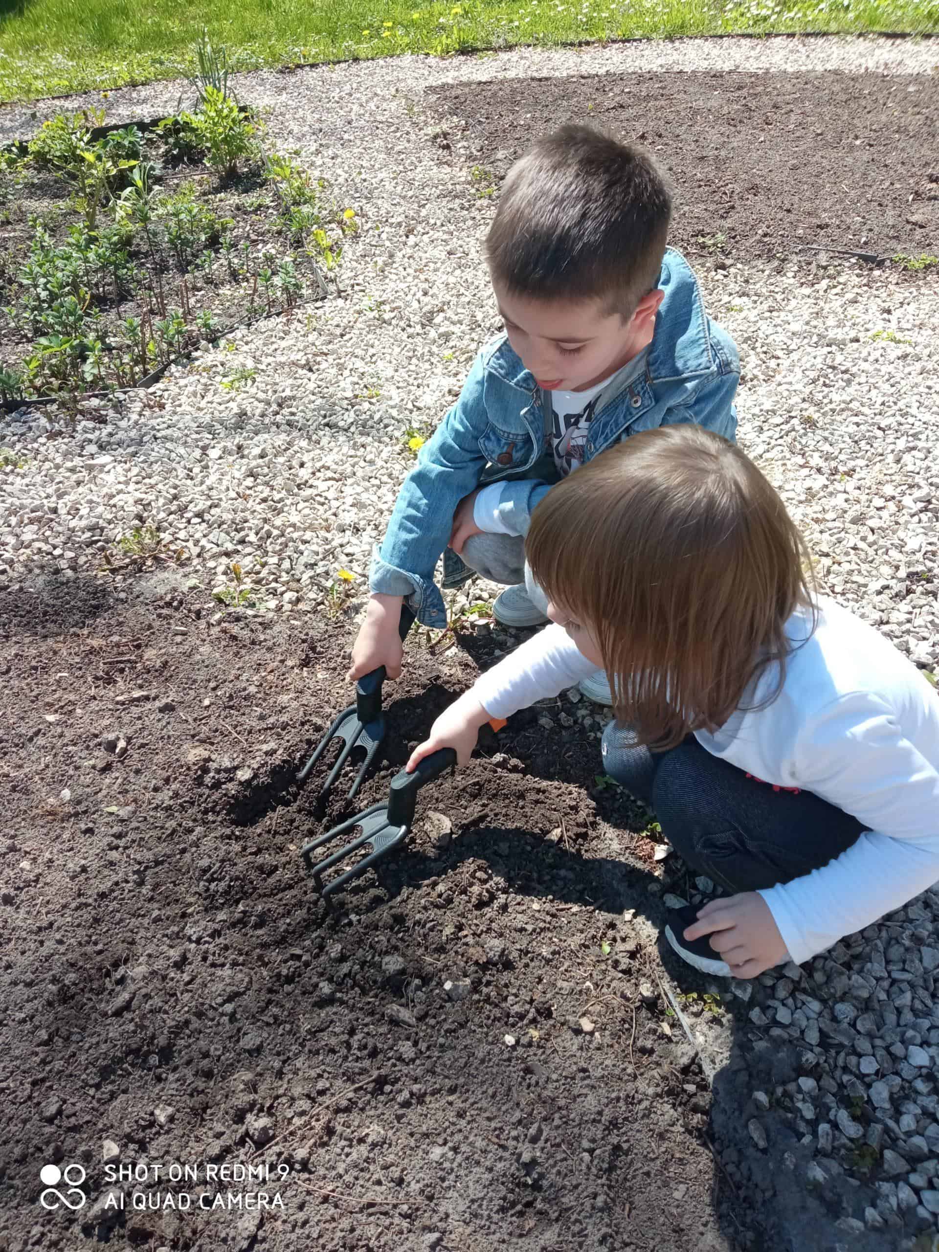 Edukacyjna Ścieżka Przyrodnicza to nasze przedszkolne dobro, z którego jesteśmy bardzo dumni. Oprócz walorów estetycznych daje ona dzieciom ogrom możliwości edukacyjnych. Przedszkolaki mają nieograniczony dostęp do jej zasobów przez wszystkie pory roku, dokonują działań praktycznych takich jak obserwacje przyrodnicze (wygląd, etapy wzrostu, zapachy, kolory itp.), a także sianie, pielenie, podlewanie, zbieranie, czyli autentyczne obcowanie z przyrodą, co dla rozwoju przedszkolaka ma ogromne znaczenie. W tym roku otrzymaliśmy zadanie zagospodarowania jednej części rabatki w naszym, tak zwanym, ogródku przydomowym. Wraz z Grupą Czerwoną mieliśmy na niej zasadzić/ dokonać wysiewu warzyw. Zadnie przyjęte, prace rozpoczęte 🙂 Po burzliwych dyskusjach w grupie dotyczących warzyw, które najbardziej lubimy i chcemy mieć na naszej rabatce, z częścią chętnych przedszkolaków, zabraliśmy się za pracę. Po spulchnieniu ziemi i zrobieniu rowek, zaczęliśmy wysiewy – na naszej części znalazła się sałata, marchewka, buraczki i rzodkiewka. Z naszego grupowego, parapetowego ogródka 🙂 zabraliśmy paprykę i lubczyk. Wszyscy chętni włączali się do pracy – wysiewali, robili dołki, zasypywali, podlewali i wbijali tabliczki informacyjne. Dziewczynki nawet nie chciały rękawiczek, bo stwierdziły, że fajna w dotyku jest ta ziemia…
