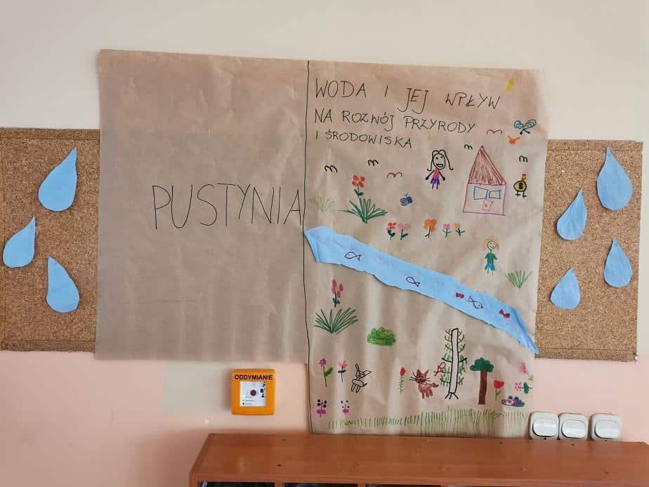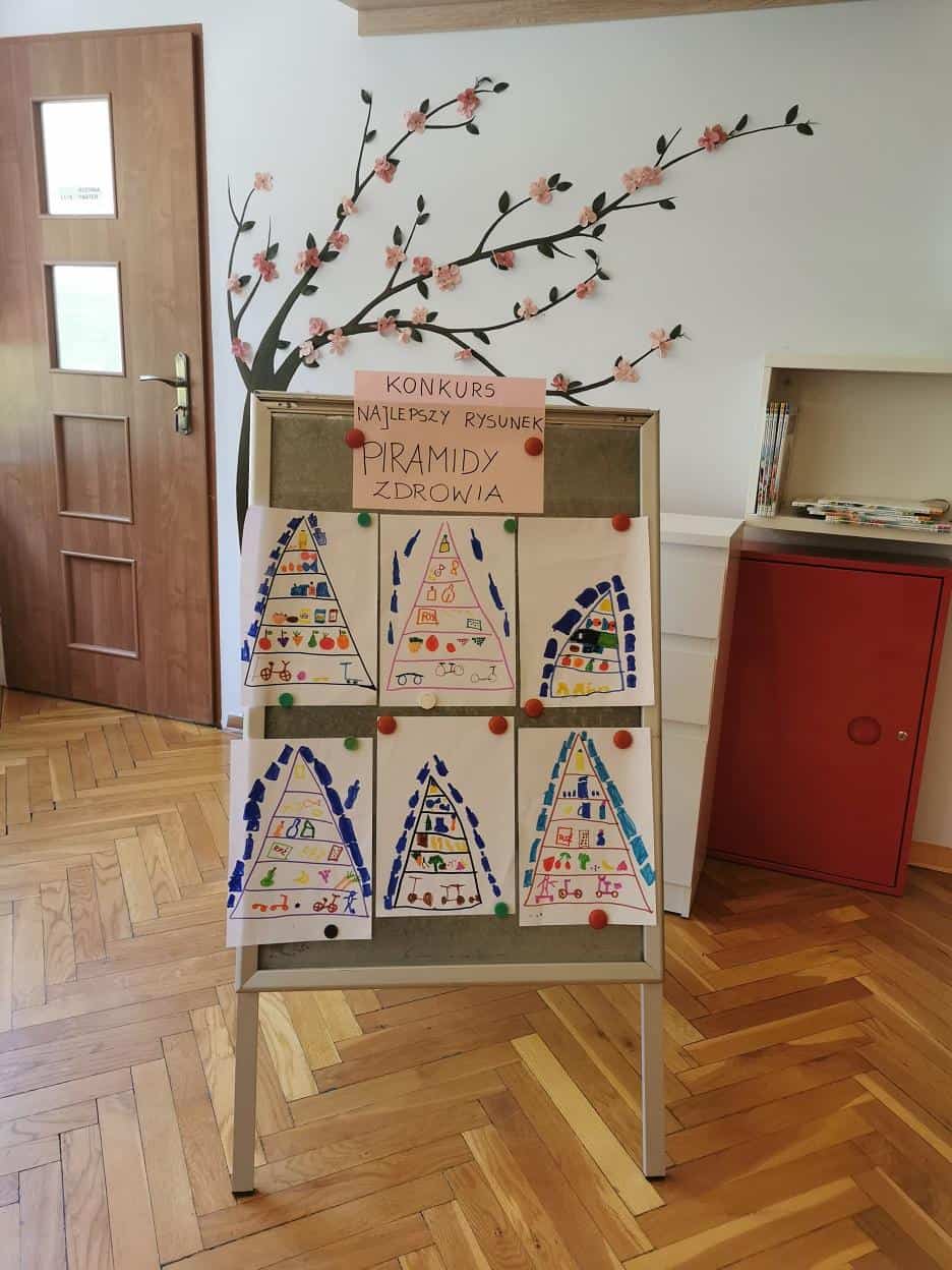 Ze względu na trwającą sytuację epidemiologiczną w kraju wszelkie działania edukacyjne odbywają się w obrębie swoich grup. Aby podzielić się zdobytą wiedzą z przedszkolakami z innych grup oraz pracownikami przedszkola wyeksponowaliśmy w głównym holu tablicę z pracami konkursowymi na temat „Piramida Zdrowia”, a także przygotowaliśmy gazetkę na temat: Woda i jej wpływ na rozwój przyrody i środowiska. Główny hol to zdecydowanie najlepsze miejsce, bowiem każdy, codziennie tamtędy przechodzi nawet kilka razy.