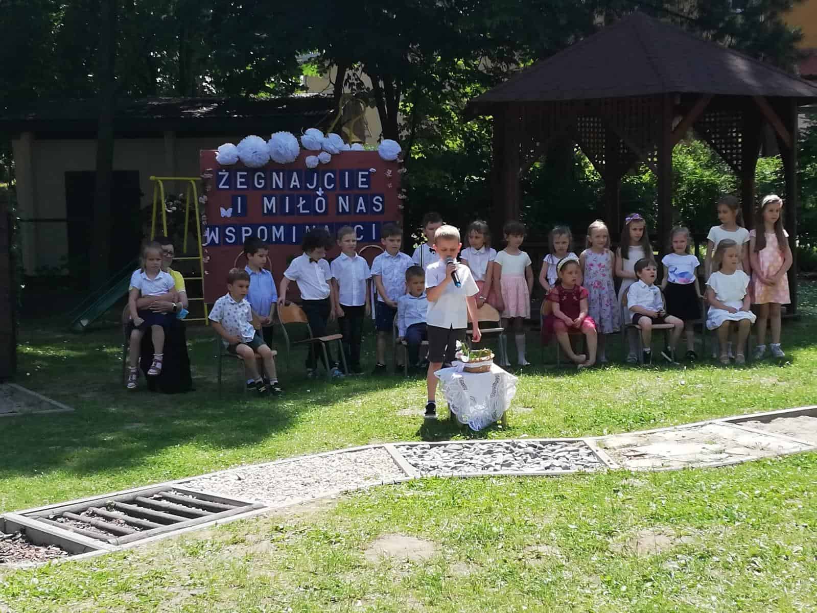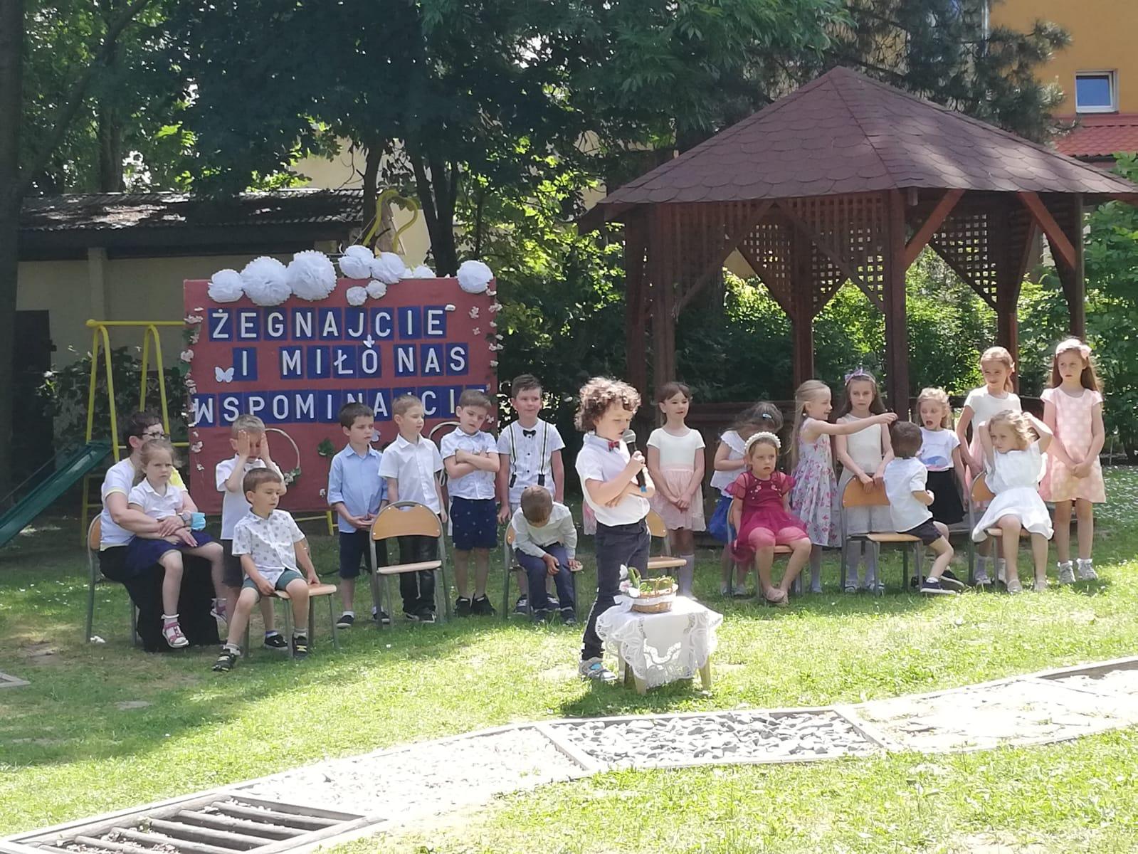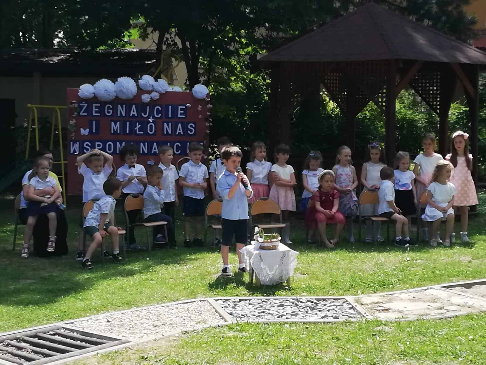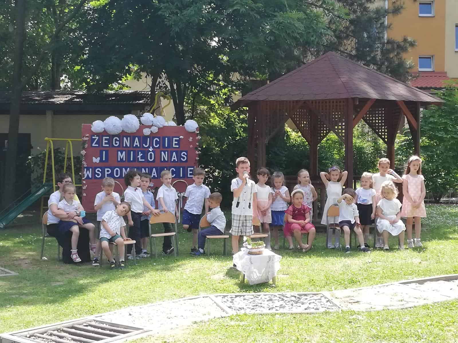 Milenka, Antoś, Michał, Mikołaj, Karolinka, Marysia, Hubercik i Marcelek – to ich właśnie żegnaliśmy słowami powyższej piosenki. Uroczystość pożegnania dzieci kończących przedszkole zawsze wzbudza wiele emocji. Jest to symboliczny moment, kiedy zamyka się pewien etap w życiu każdego przedszkolaka, ale coś musi się skończyć, aby coś innego mogło się zacząć, dlatego z całego serca wierzymy, że tam, na progu nowej szkoły, będą czekać na Was same piękne i niezapomniane chwile, mnóstwo przyjaciół i interesujących przygód.
