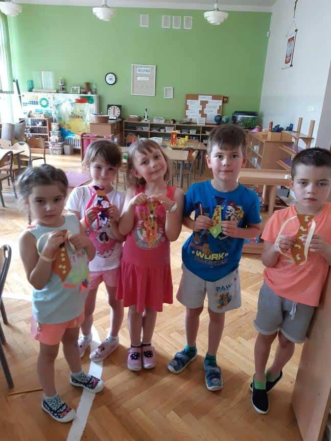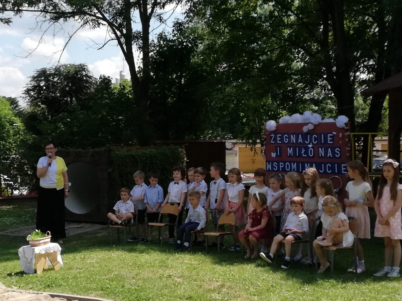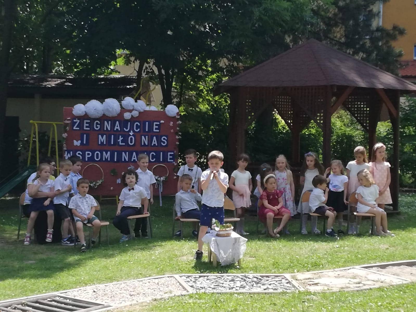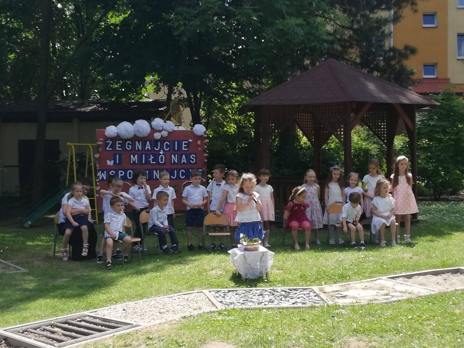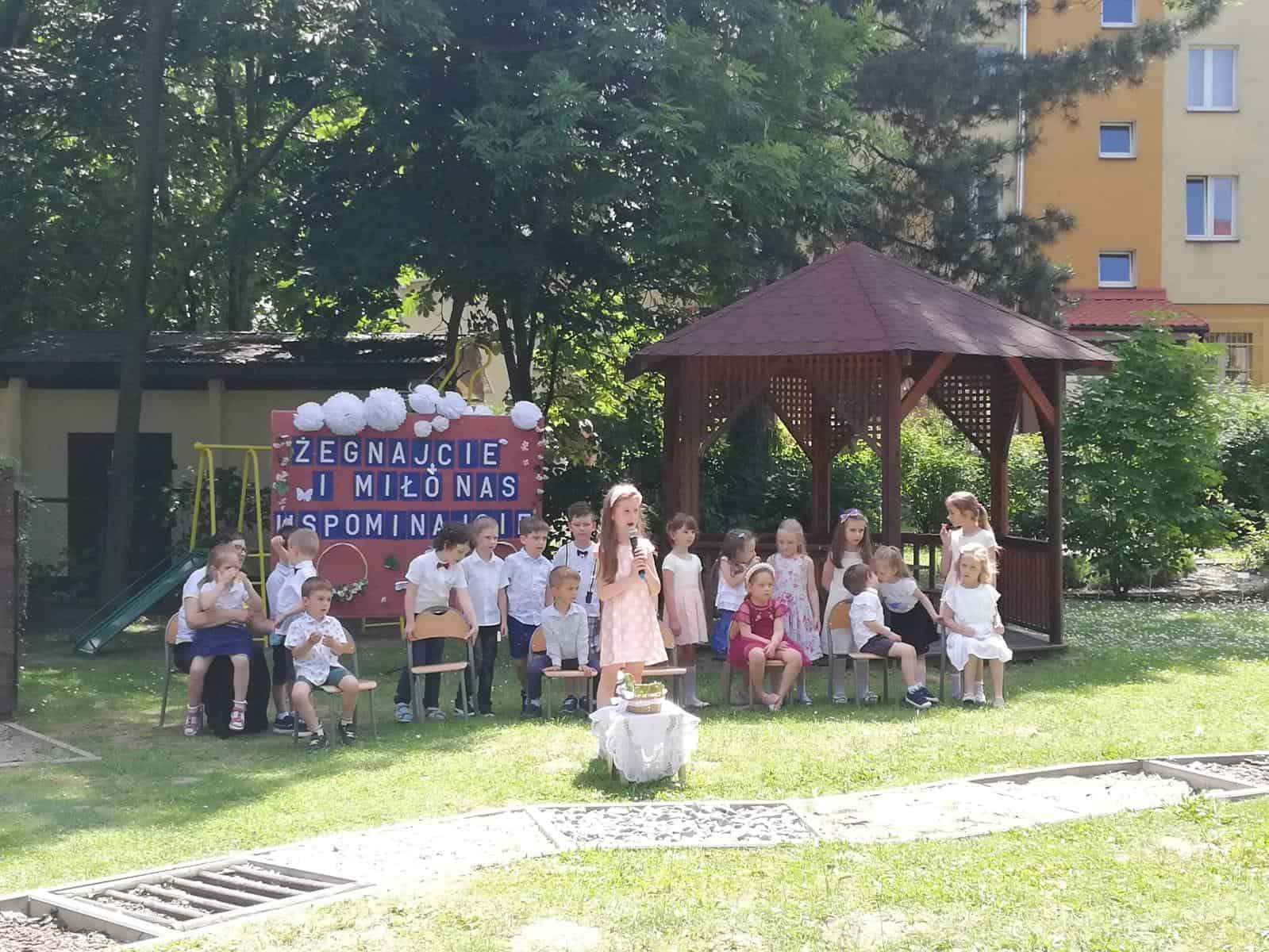 Milenka, Antoś, Michał, Mikołaj, Karolinka, Marysia, Hubercik i Marcelek – to ich właśnie żegnaliśmy słowami powyższej piosenki. Uroczystość pożegnania dzieci kończących przedszkole zawsze wzbudza wiele emocji. Jest to symboliczny moment, kiedy zamyka się pewien etap w życiu każdego przedszkolaka, ale coś musi się skończyć, aby coś innego mogło się zacząć, dlatego z całego serca wierzymy, że tam, na progu nowej szkoły, będą czekać na Was same piękne i niezapomniane chwile, mnóstwo przyjaciół i interesujących przygód.