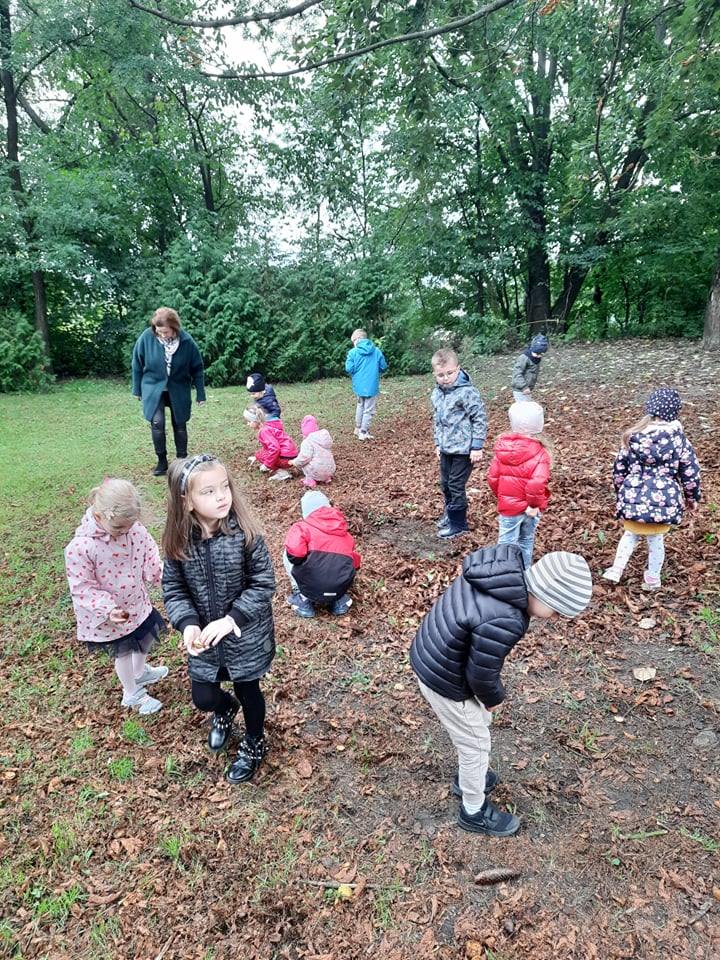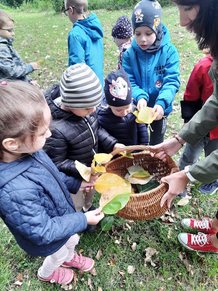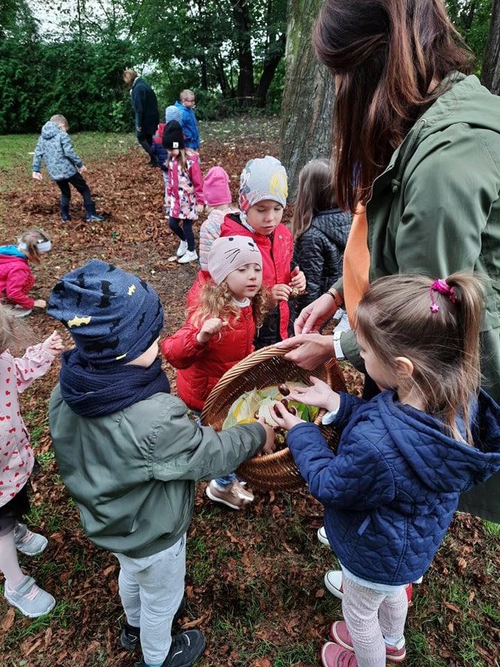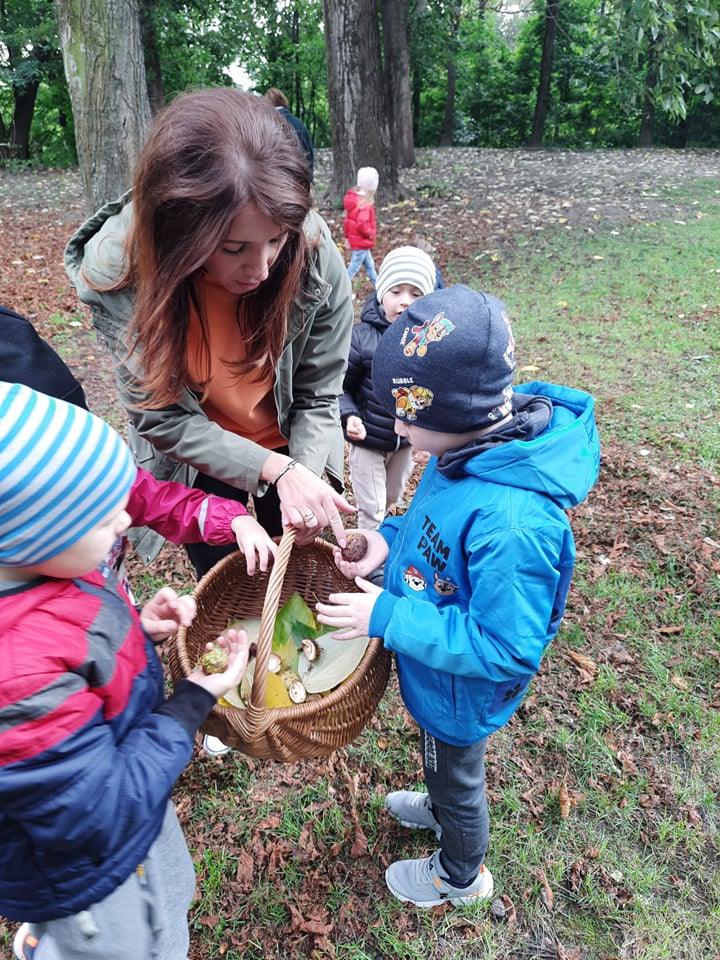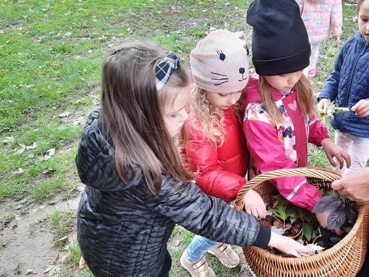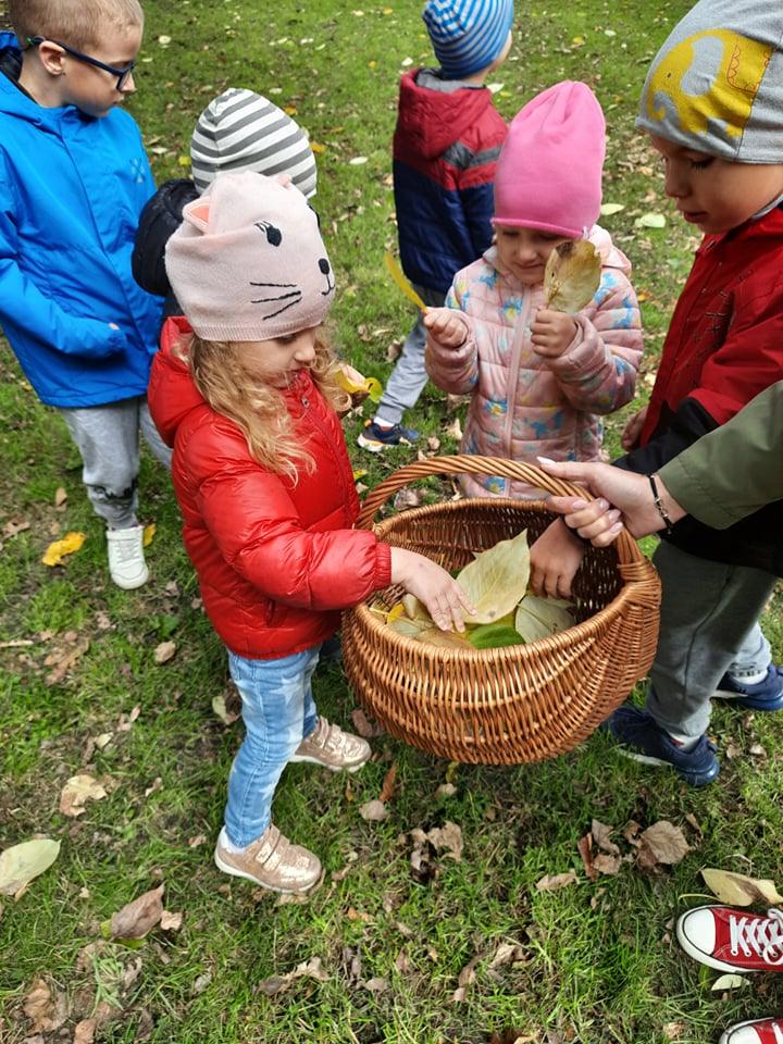 Rozmawialiśmy o zmianach zachodzących w przyrodzie jesienią oraz o warunkach atmosferycznych charakterystycznych dla tej pory roku. Po lekcji wzięliśmy duży, wiklinowy kosz i wyruszyliśmy na spacer w pobliżu przedszkola w poszukiwaniu darów jesieni. Przedszkolaki z ogromnym entuzjazmem i zapałem zbierały kasztany, żołędzie, szyszki oraz piękne, kolorowe liście. Do przedszkola wróciliśmy z pełnym koszem. Jesienne dary, które zebraliśmy wzbogaciły nasz kącik przyrodniczy.