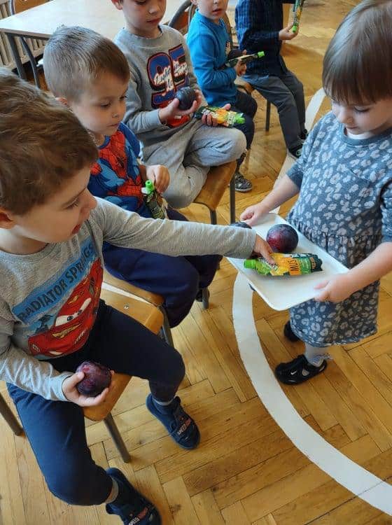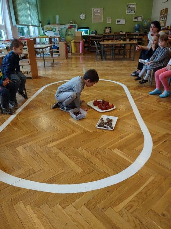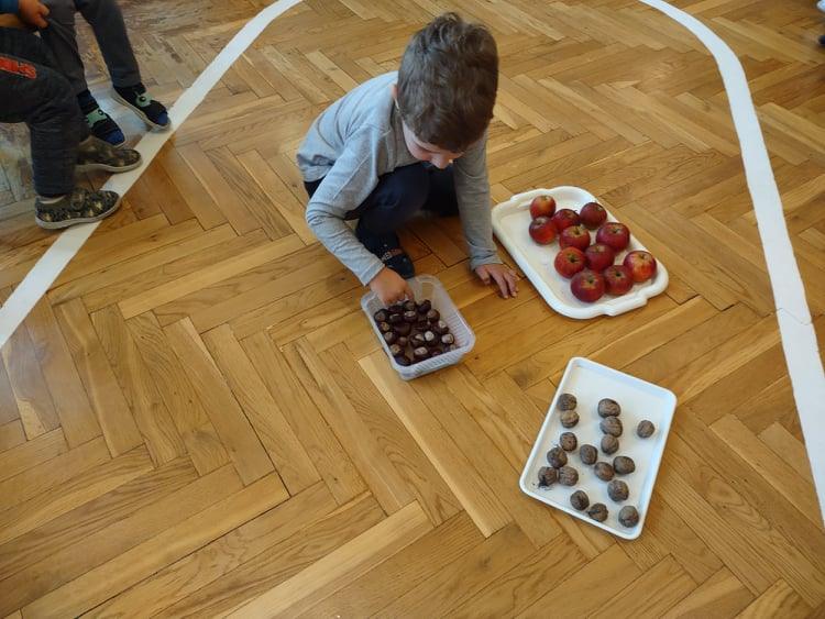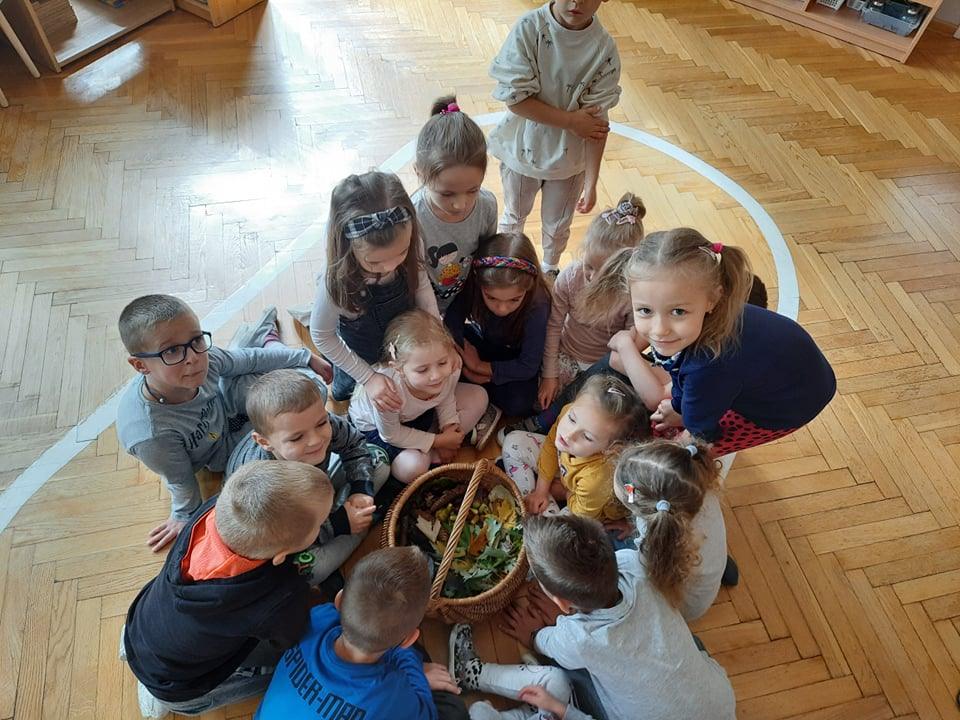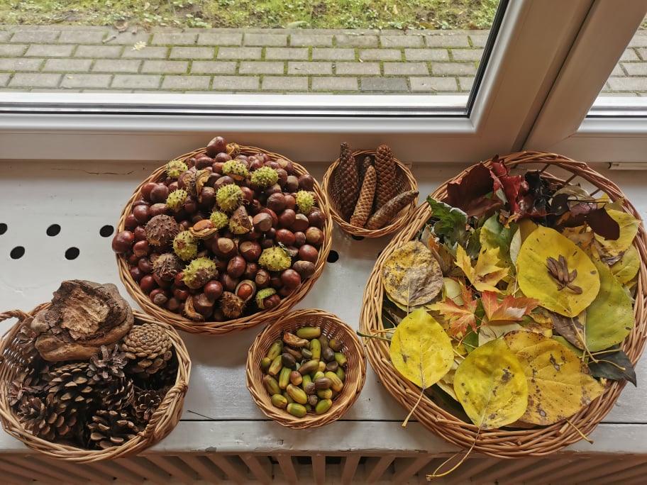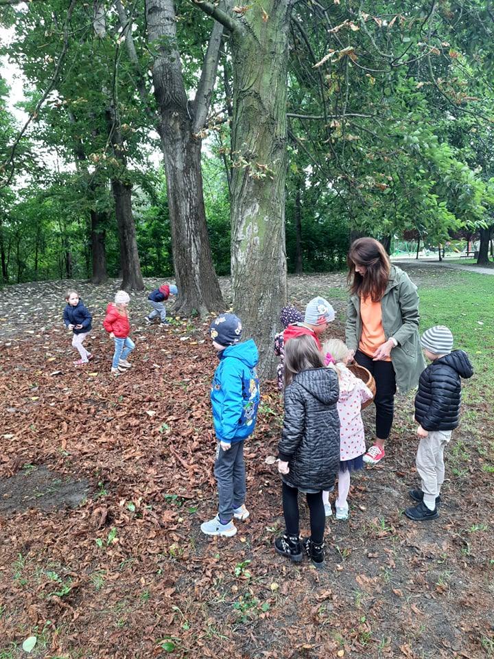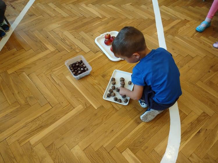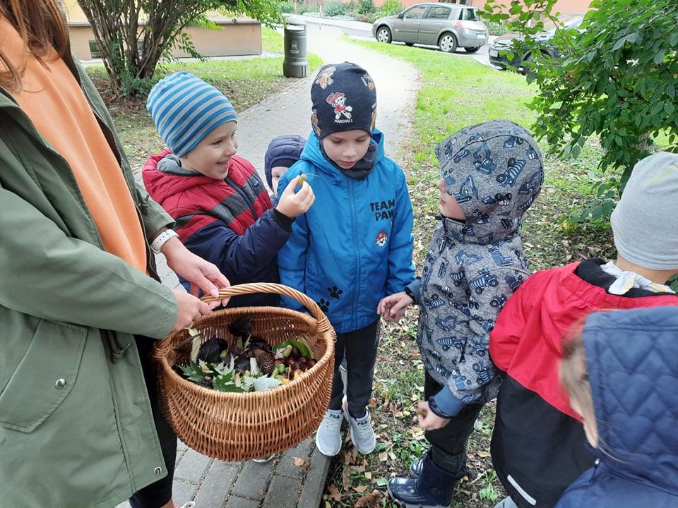 Rozmawialiśmy o zmianach zachodzących w przyrodzie jesienią oraz o warunkach atmosferycznych charakterystycznych dla tej pory roku. Po lekcji wzięliśmy duży, wiklinowy kosz i wyruszyliśmy na spacer w pobliżu przedszkola w poszukiwaniu darów jesieni. Przedszkolaki z ogromnym entuzjazmem i zapałem zbierały kasztany, żołędzie, szyszki oraz piękne, kolorowe liście. Do przedszkola wróciliśmy z pełnym koszem. Jesienne dary, które zebraliśmy wzbogaciły nasz kącik przyrodniczy.