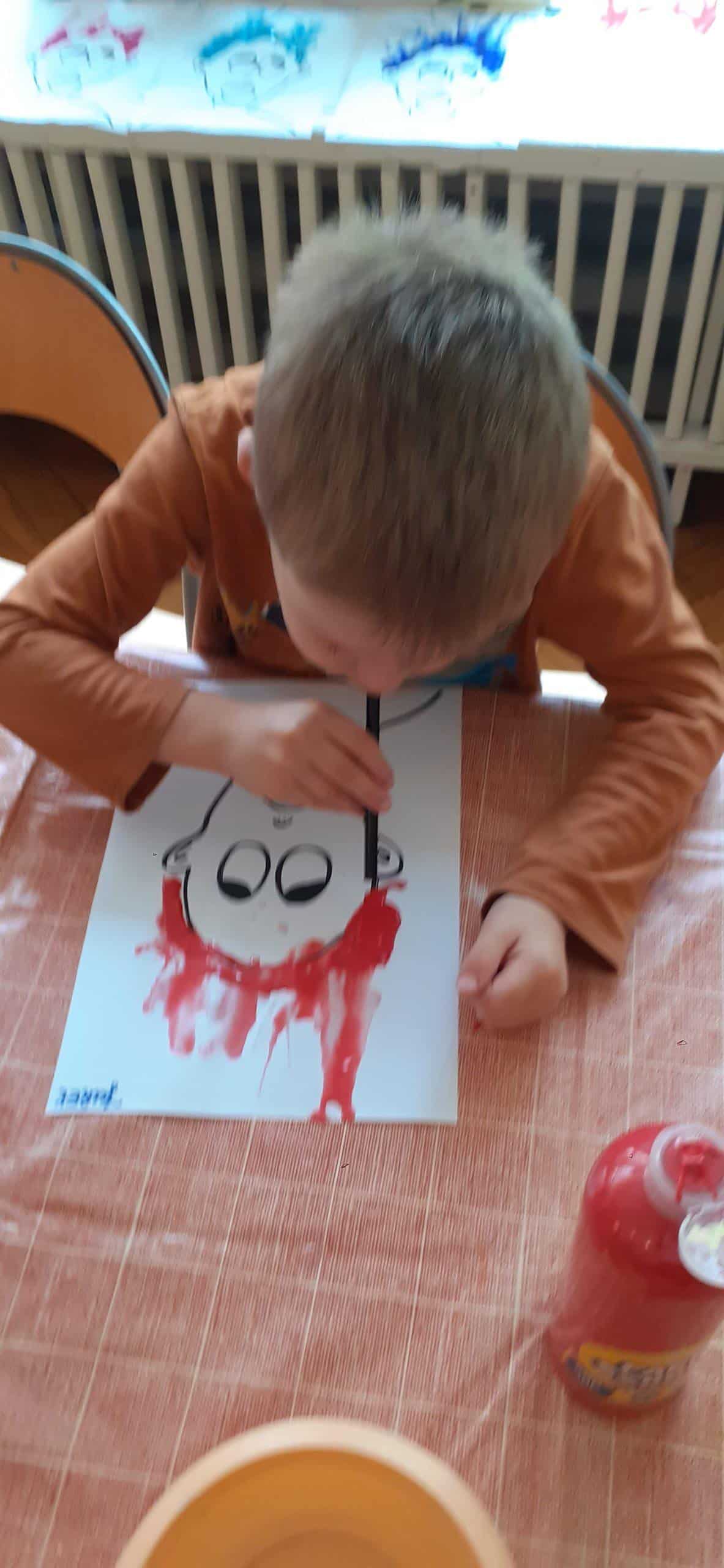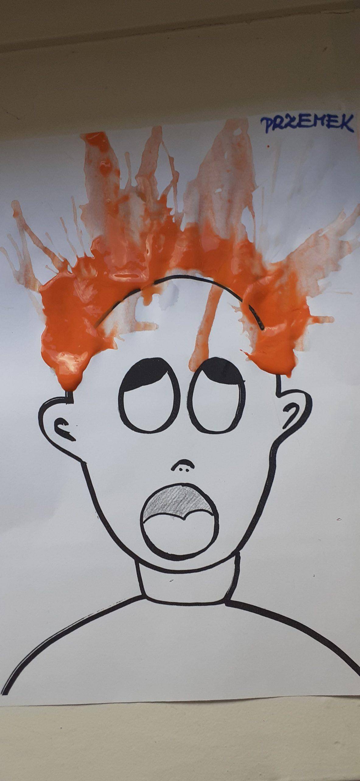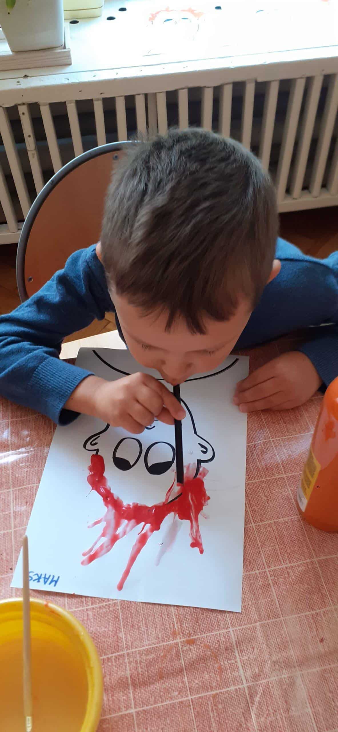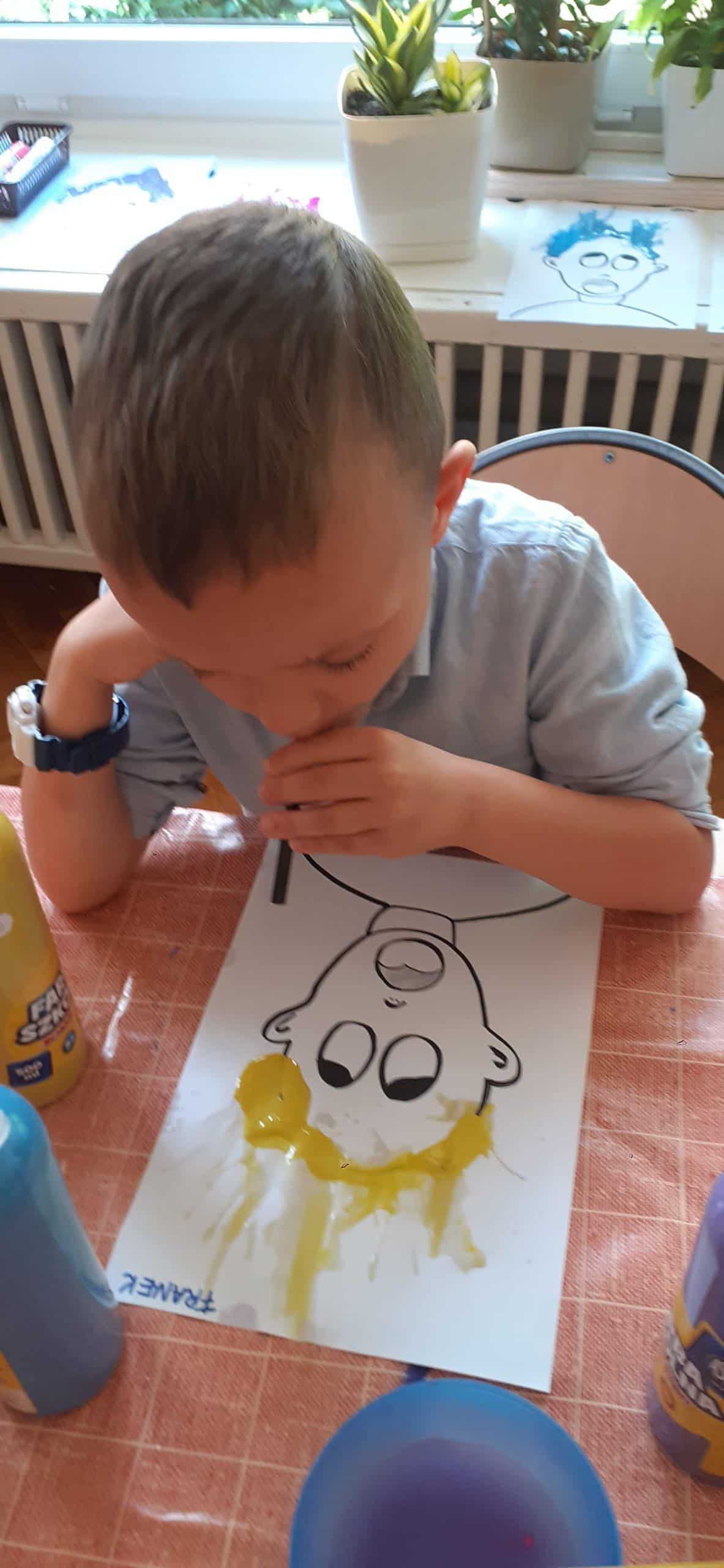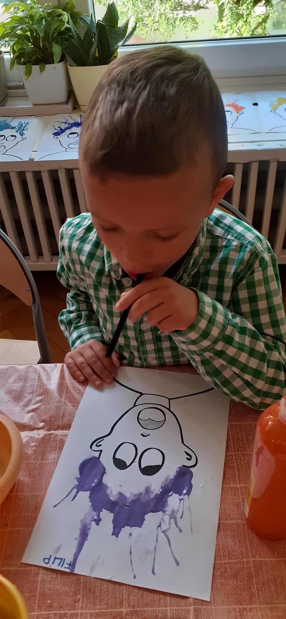 Dzieci bardzo lubią zabawy oddechowe , zwłaszcza te , podczas których można wprawić w ruch lub przemieścić kulki, piórka, małe piłeczki, kawałki papieru, czy też bibułkę. Dla rozwoju dziecka zabawy te maję ogromne znaczenie. Pomagają lepiej kontrolować emocje, poprawiają zdolność skupienia uwagi, a także wpływają na lepszą wymowę. Tym razem dzieci bardzo zaskoczył na kartce wizerunek postaci bez włosów. Dzieci otrzymały zadanie domalowania włosów przy pomocy farby i rurki do napojów. Ale jako to zrobić – nie zanurzając rurki w farbie ? I tu nastąpiła burza mózgów- czyli mnóstwo pomysłów dzieci. Odkrycie -że należy domalować włosy bardzo przestraszonej osobie za pomocą wydmuchiwanego przez rurkę powietrza było nieco trudne, ale za to jaka to była wspaniała zabawa. Zdjęcia mówią same za siebie. Efekt bardzo rozweselił dzieci.