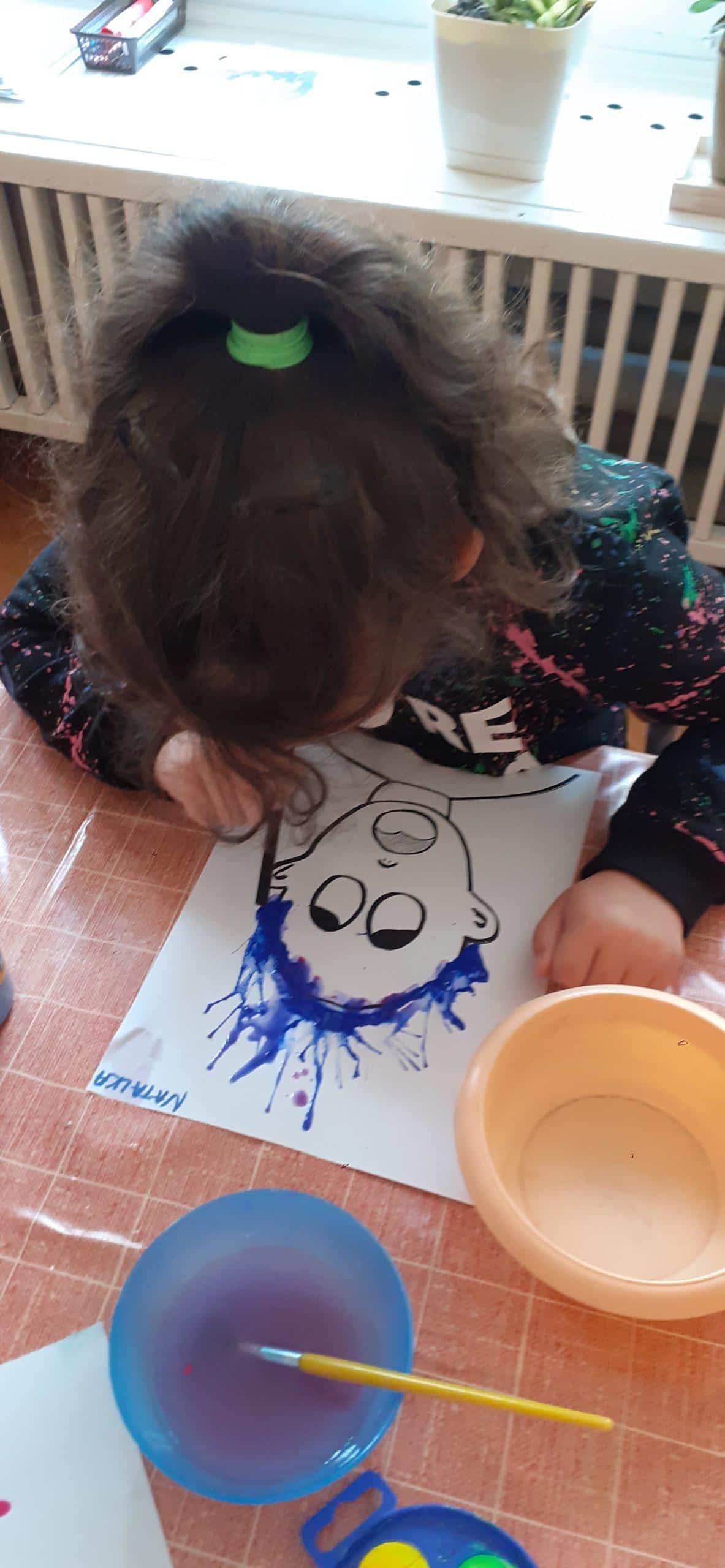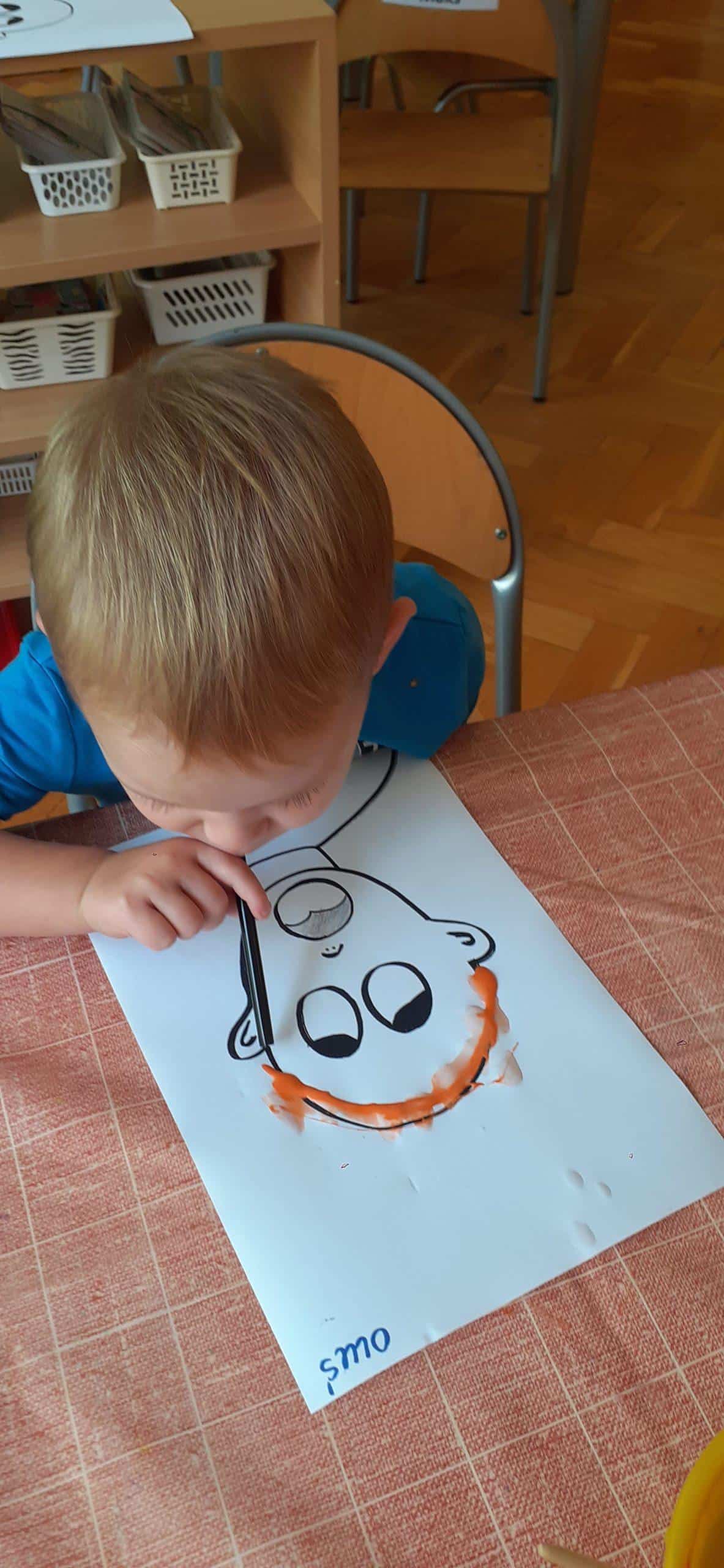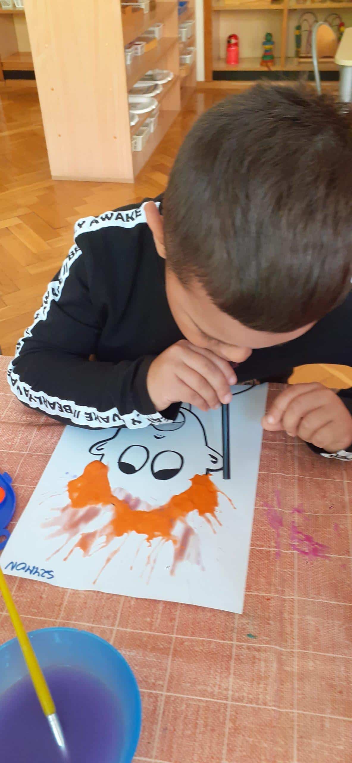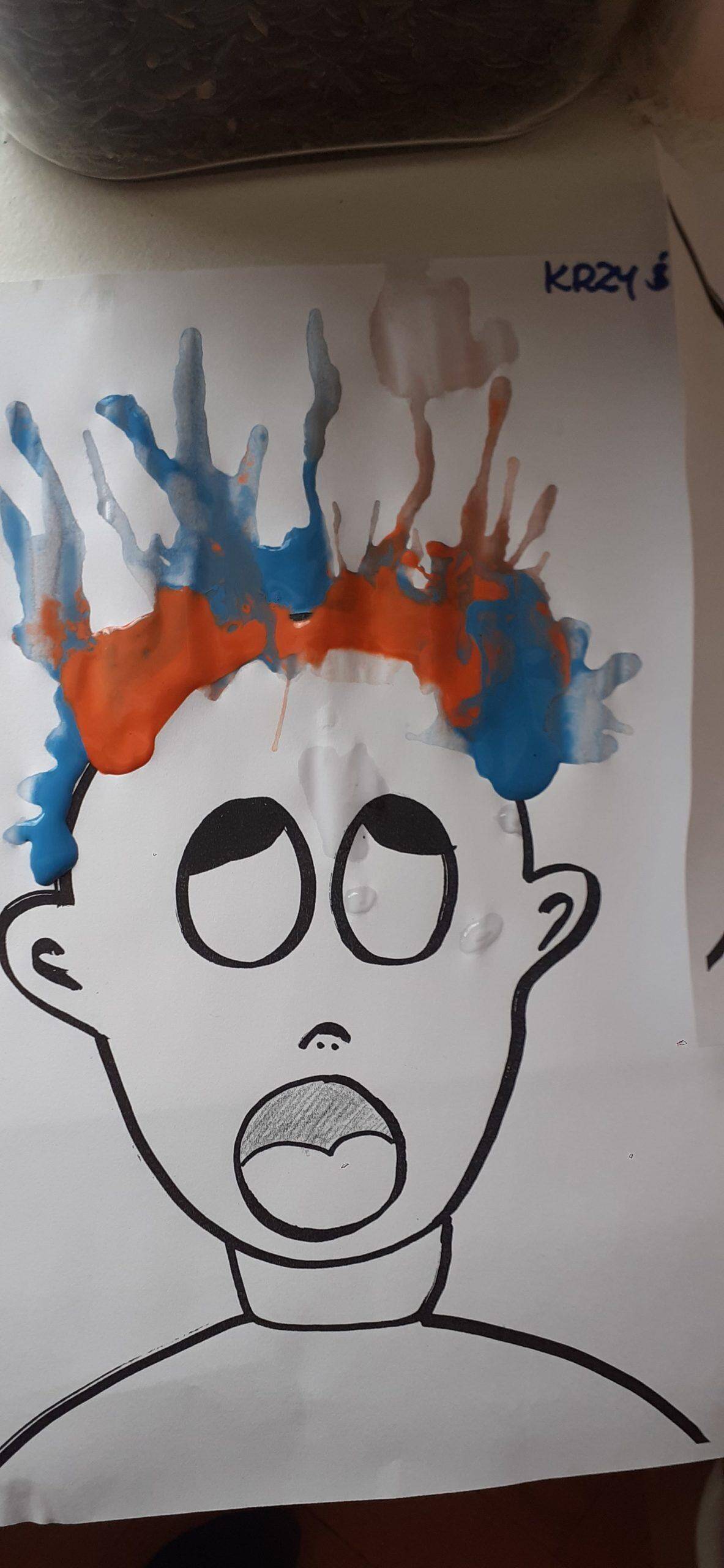 Dzieci bardzo lubią zabawy oddechowe , zwłaszcza te , podczas których można wprawić w ruch lub przemieścić kulki, piórka, małe piłeczki, kawałki papieru, czy też bibułkę. Dla rozwoju dziecka zabawy te maję ogromne znaczenie. Pomagają lepiej kontrolować emocje, poprawiają zdolność skupienia uwagi, a także wpływają na lepszą wymowę. Tym razem dzieci bardzo zaskoczył na kartce wizerunek postaci bez włosów. Dzieci otrzymały zadanie domalowania włosów przy pomocy farby i rurki do napojów. Ale jako to zrobić – nie zanurzając rurki w farbie ? I tu nastąpiła burza mózgów- czyli mnóstwo pomysłów dzieci. Odkrycie -że należy domalować włosy bardzo przestraszonej osobie za pomocą wydmuchiwanego przez rurkę powietrza było nieco trudne, ale za to jaka to była wspaniała zabawa. Zdjęcia mówią same za siebie. Efekt bardzo rozweselił dzieci.