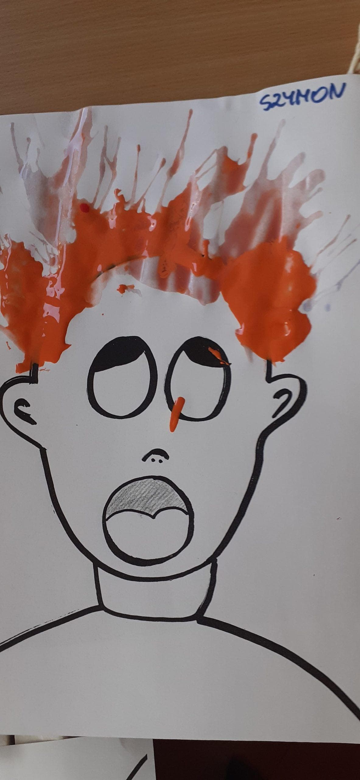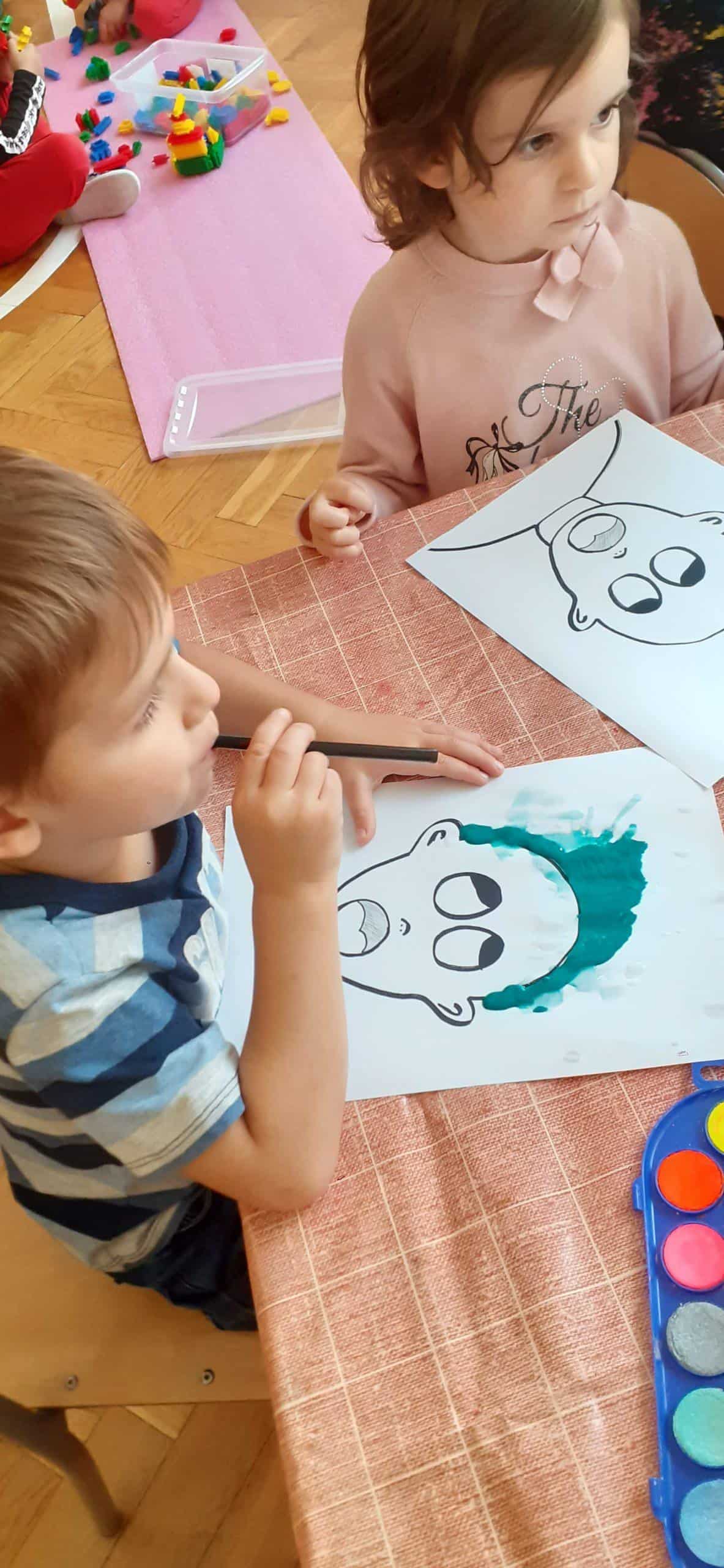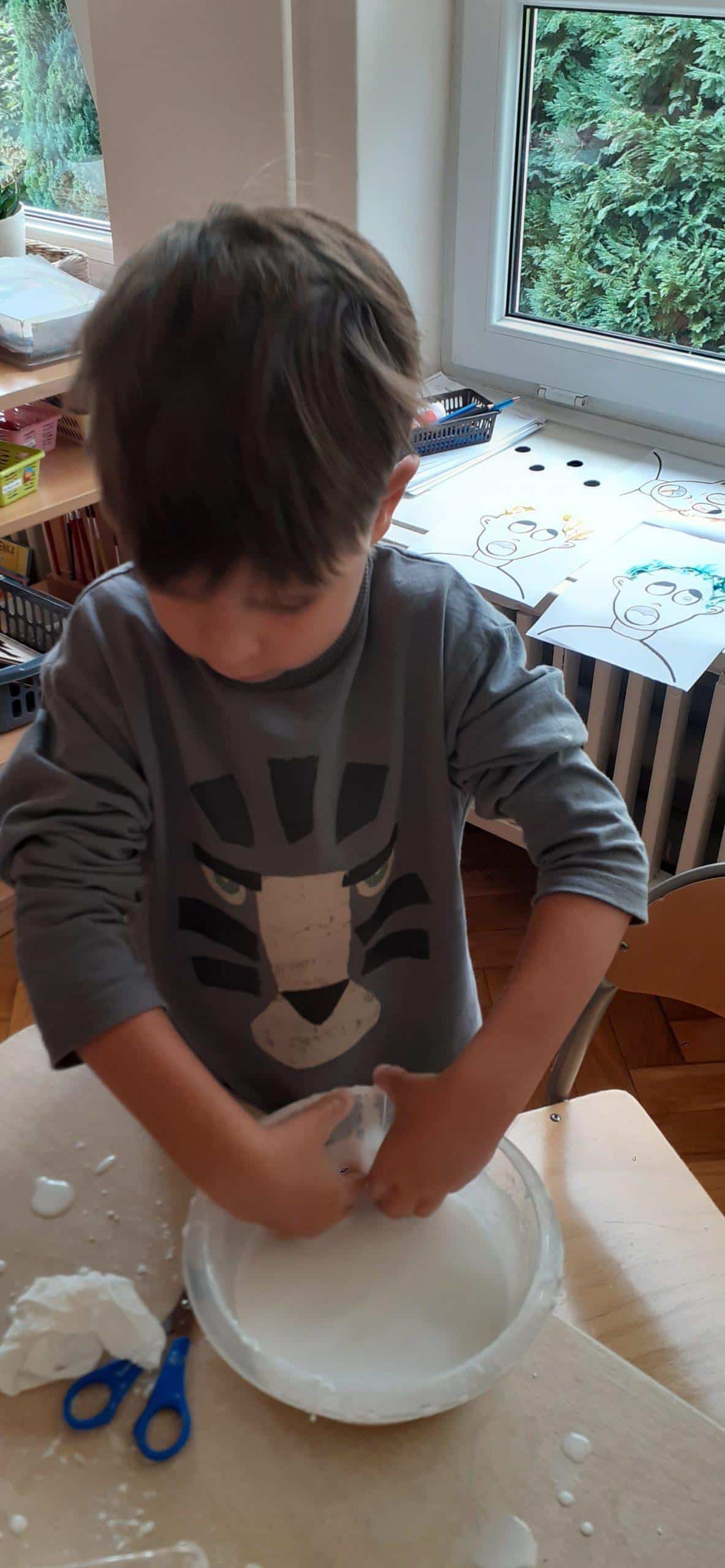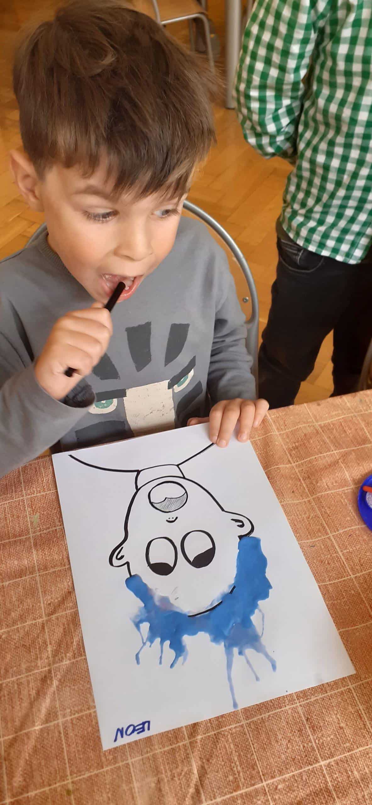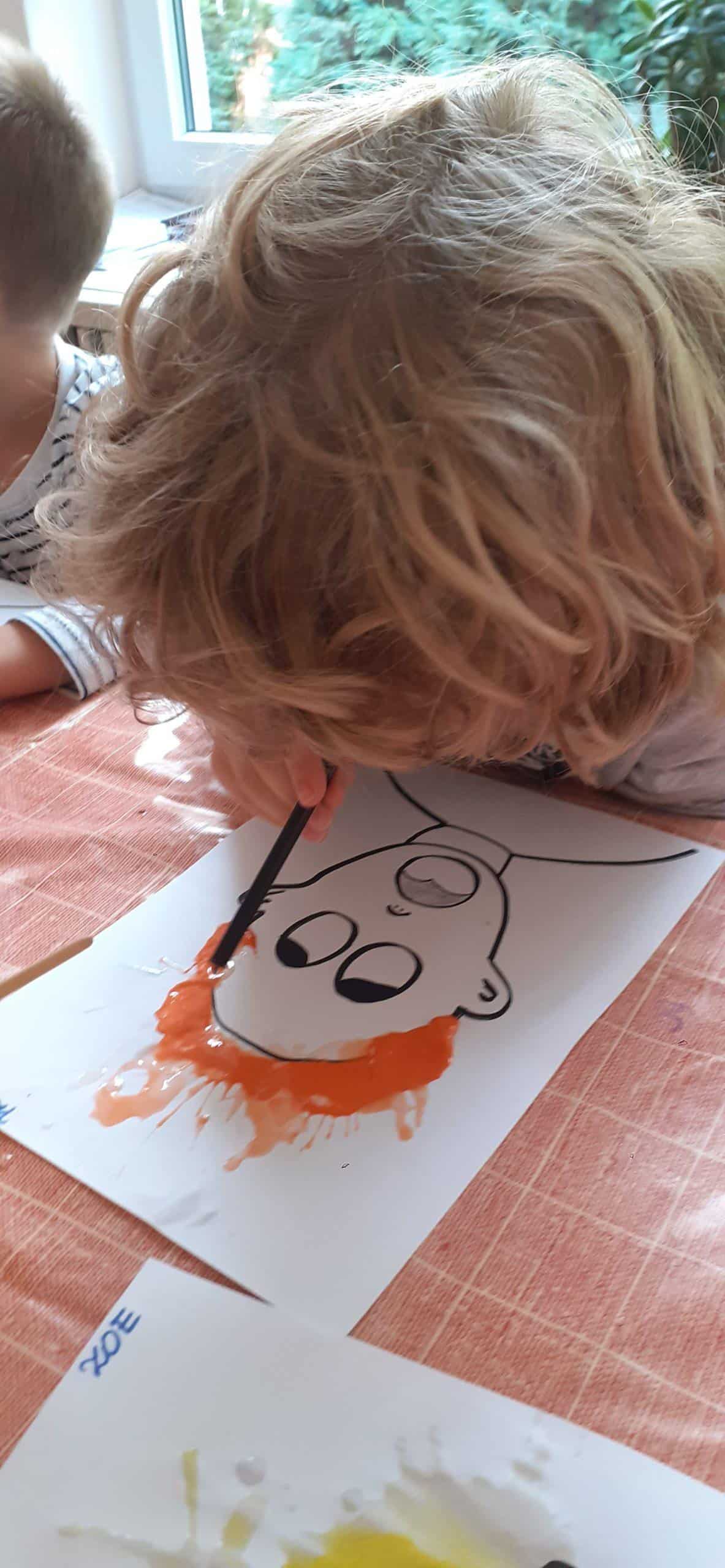 Dzieci bardzo lubią zabawy oddechowe , zwłaszcza te , podczas których można wprawić w ruch lub przemieścić kulki, piórka, małe piłeczki, kawałki papieru, czy też bibułkę. Dla rozwoju dziecka zabawy te maję ogromne znaczenie. Pomagają lepiej kontrolować emocje, poprawiają zdolność skupienia uwagi, a także wpływają na lepszą wymowę. Tym razem dzieci bardzo zaskoczył na kartce wizerunek postaci bez włosów. Dzieci otrzymały zadanie domalowania włosów przy pomocy farby i rurki do napojów. Ale jako to zrobić – nie zanurzając rurki w farbie ? I tu nastąpiła burza mózgów- czyli mnóstwo pomysłów dzieci. Odkrycie -że należy domalować włosy bardzo przestraszonej osobie za pomocą wydmuchiwanego przez rurkę powietrza było nieco trudne, ale za to jaka to była wspaniała zabawa. Zdjęcia mówią same za siebie. Efekt bardzo rozweselił dzieci.
