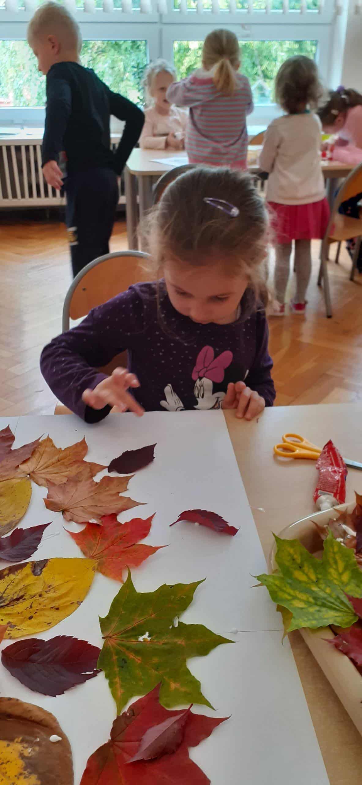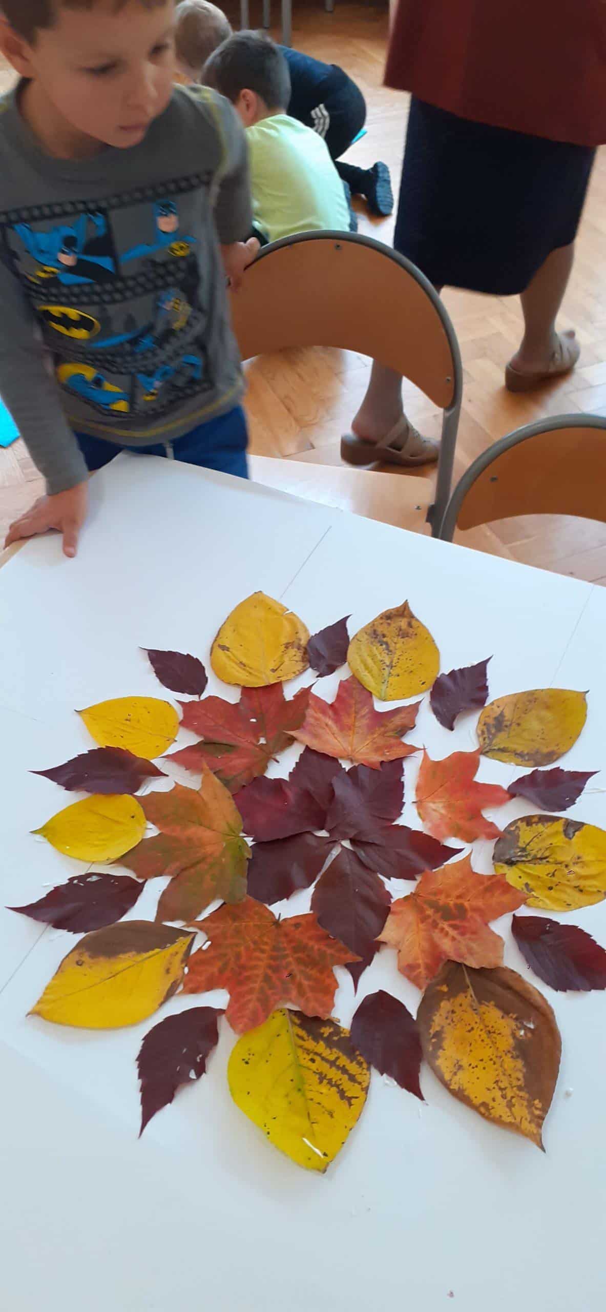 Dzieci bardzo lubią różne aktywności plastyczne. Ostatni spacer po liście był bardzo udany, zgromadziliśmy piękne liście, które w ciągu kilku dni zasuszyły się, więc postanowiliśmy je wykorzystać tworząc przepiękną jesienną mandale . To doskonała aktywność wyzwalająca wśród dzieci wyobraźnię i kreatywność. Mandala to technika plastyczna wykonana na bazie koła. Pomaga w skupieniu uwagi, w koncentracji, rozwija sprawność manualną. Dodatkowo dzieci musiały wykazać się tworzeniem na bazie koła ciągów rytmicznych z liści rożnego gatunku. I udało się – powstała przepiękna mandala.