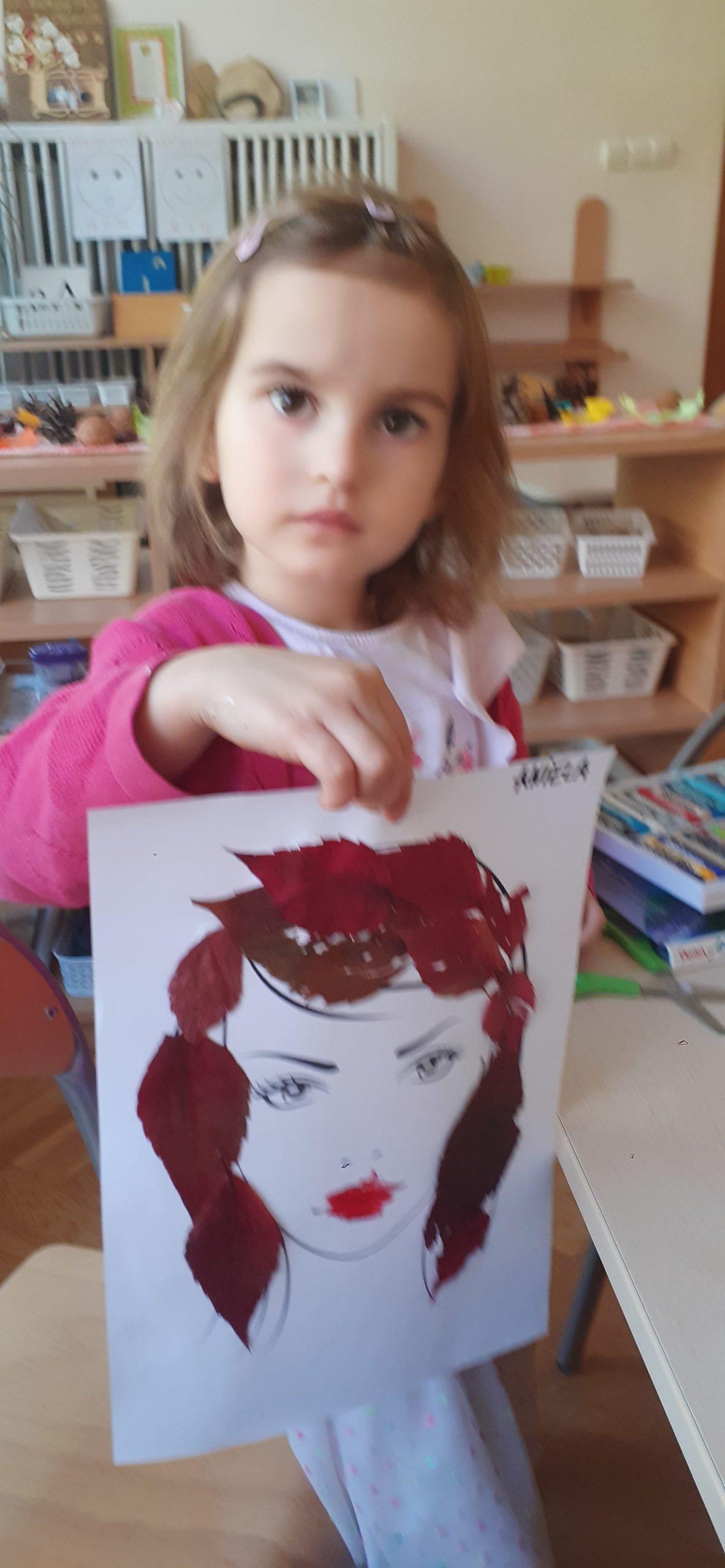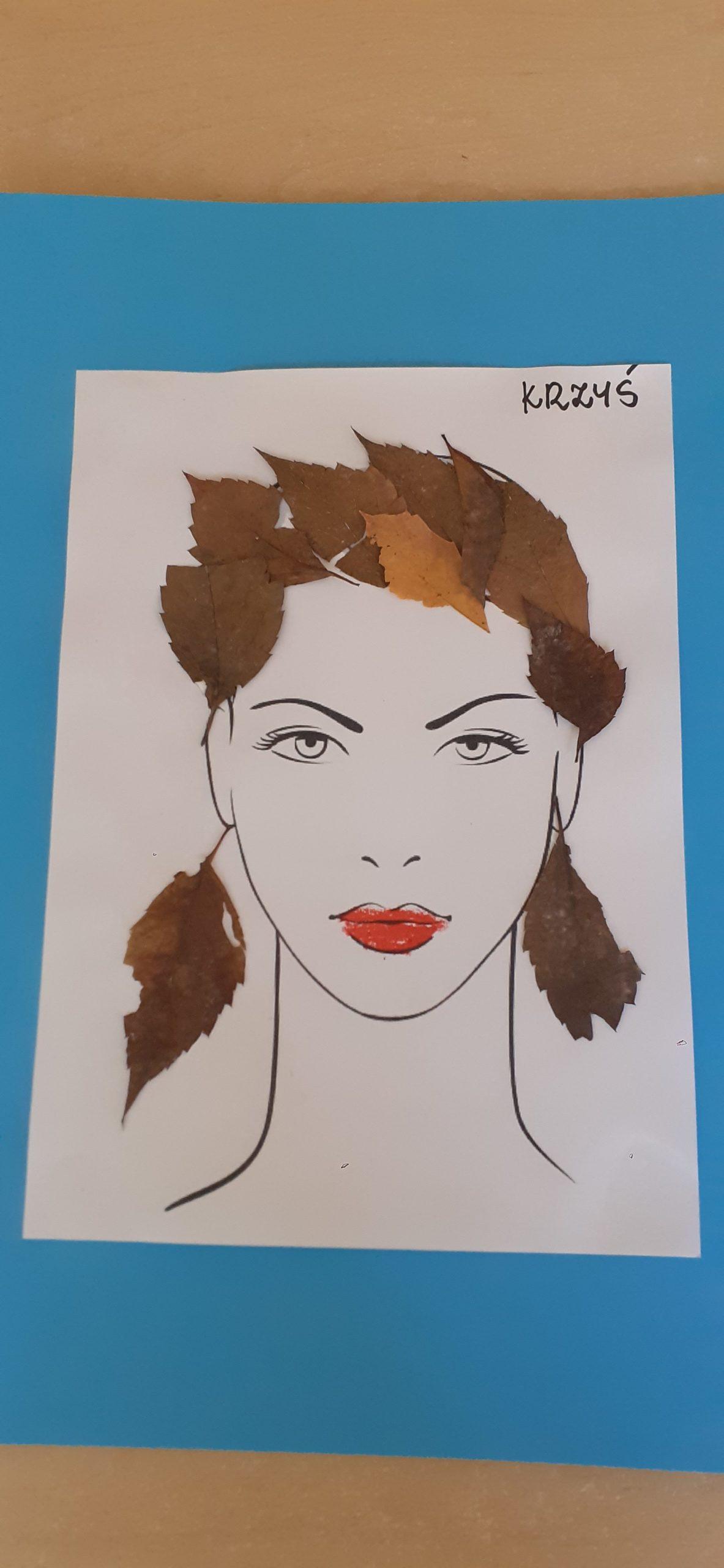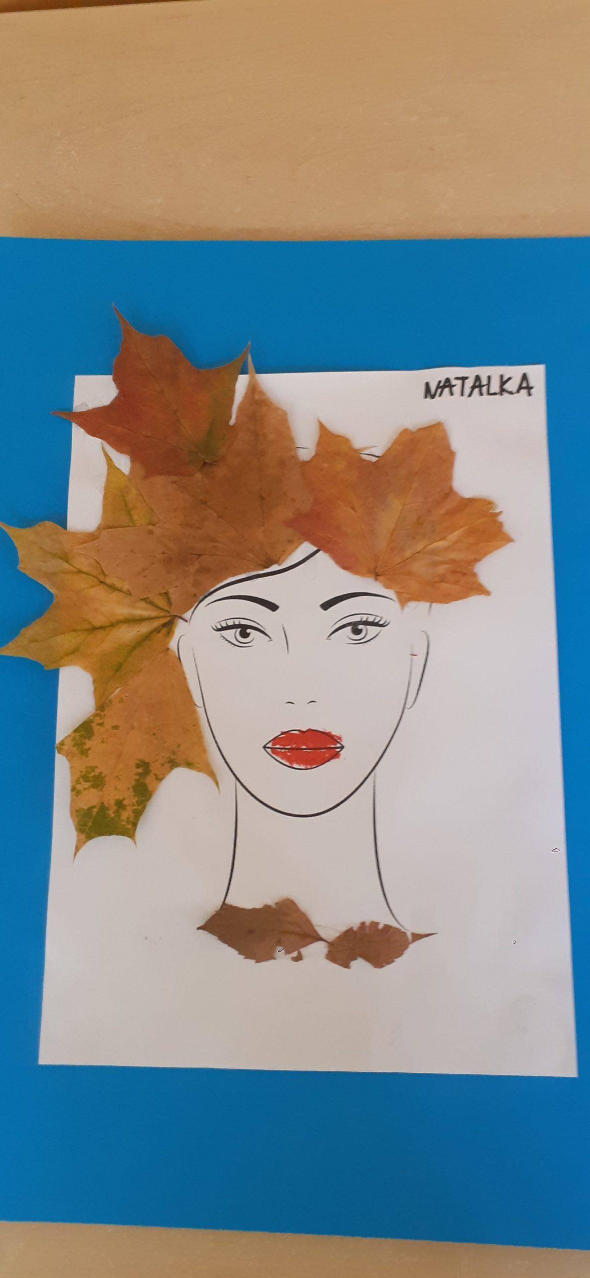 Kreatywne działania przedszkolaków – zaprojektowanie fryzury z wykorzystaniem zasuszonych, kolorowych liści. Tak na wesoło i z przymrużeniem oka -Drogie Mamy – to są najmodniejsze fryzury tej jesieni, fryzury czesane wiatrem, może ktoś potrzebuje inspiracji na ten sezon – warto wykorzystać -dzieci naprawdę się postarały 🙂