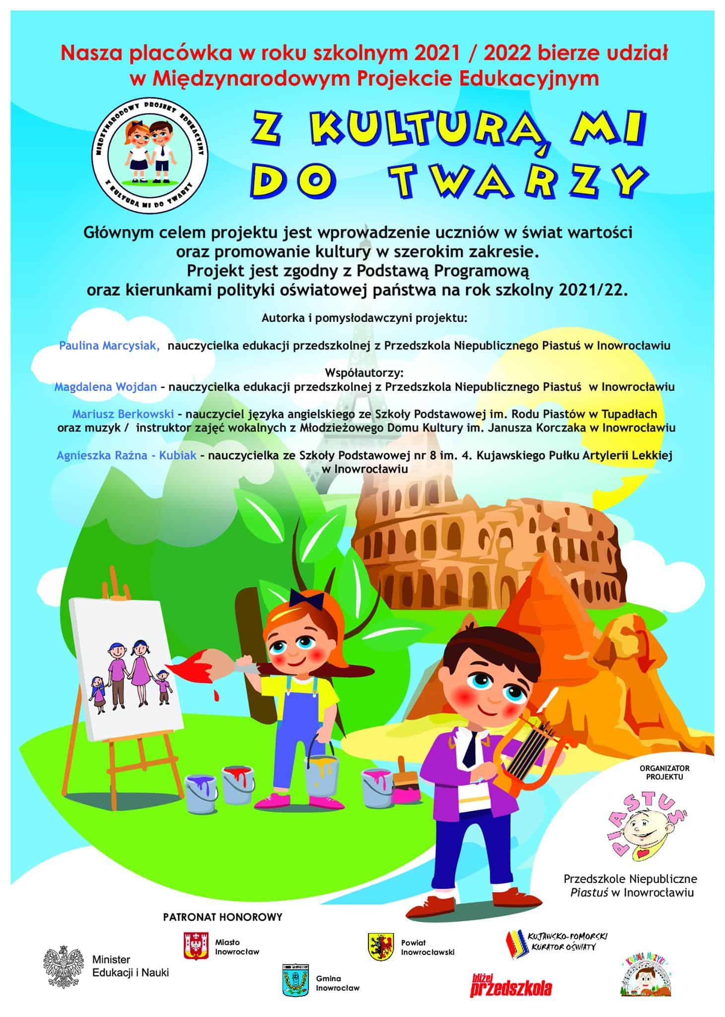 4 października rozpoczynamy realizację Międzynarodowego Projektu Edukacyjnego „Z kulturą mi do twarzy”. Celem projektu jest promowanie kultury wysokiej, rozwijanie wśród dzieci wrażliwości na piękno, rozwijanie poczucia estetyki poprzez kontakt ze sztuką, wychowanie w duchu wartości takich jak: dobro, piękno, patriotyzm, altruizm. Projekt zakłada również kształtowanie poczucia przynależności do kraju, regionu, zapoznanie z tradycjami i historią kraju w sposób dostępny dziecku. Nasza grupa będzie realizować zadania zawarte w 4 modułach: 1moduł- „W krainie muz”, 2 moduł -” Tu jest moje miejsce”, 3 moduł -” Kocham , lubię , szanuję”, 4 moduł- „Kultury świata”. Z każdego modułu będziemy realizować 5 zadań. W trakcie realizacji projektu będą tworzone sytuacje edukacyjne budujące wrażliwość dziecka, w tym wrażliwość w odniesieniu do wielu sfer aktywności : mowy, zachowania, ruchu, środowiska, ubioru, muzyki , tańca, teatru i plastyki. Zakończenie projektu planowane jest na 31 maja 2022 roku . Za realizację projektu otrzymamy certyfikat.
