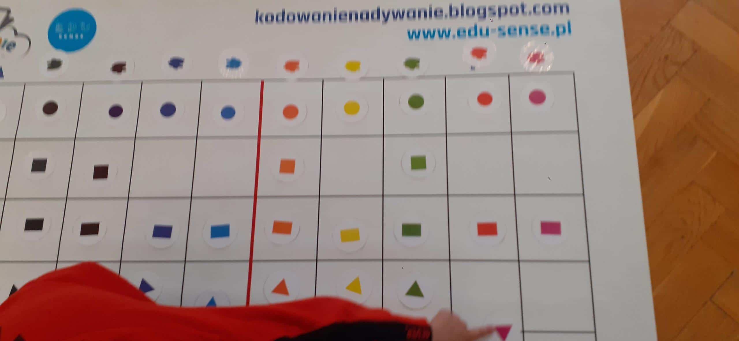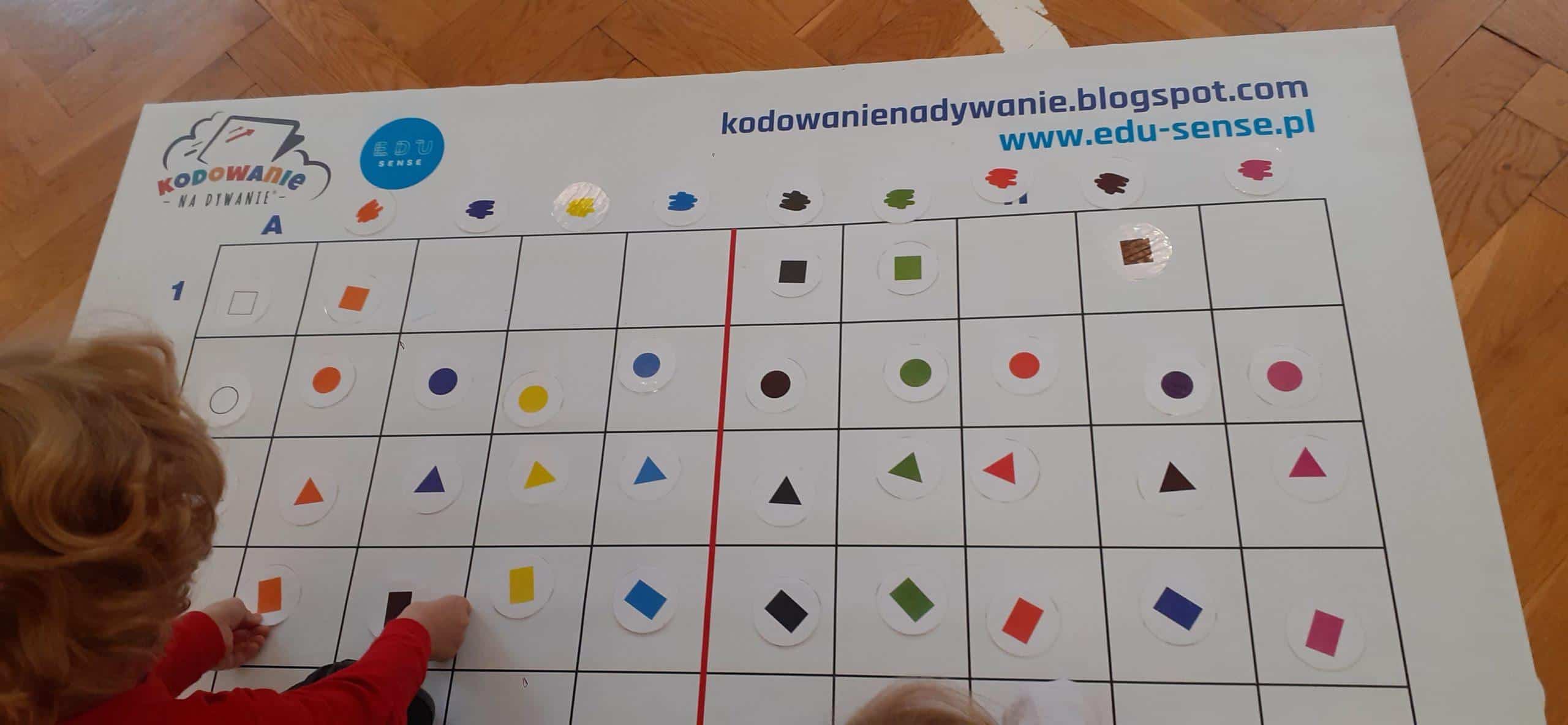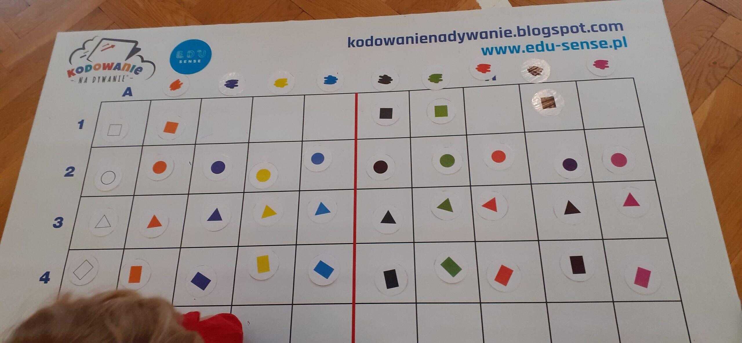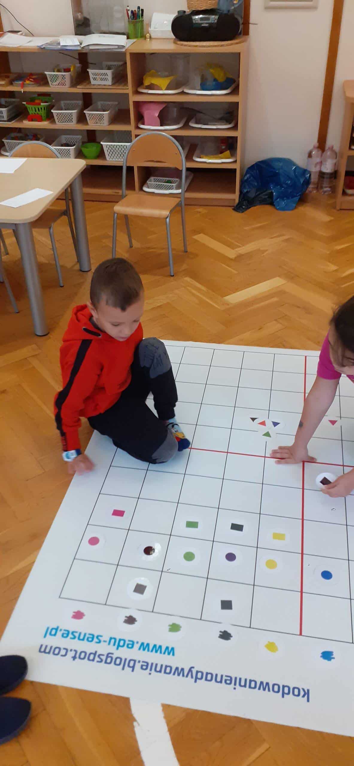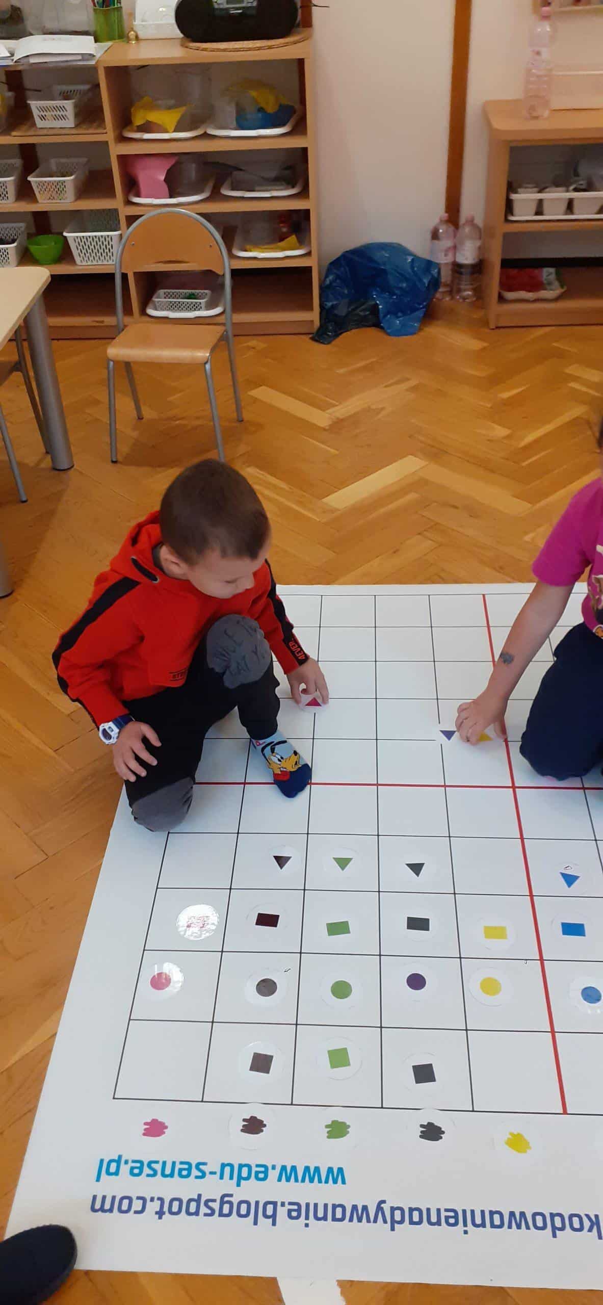 Sudoku to japońska gra, do której wykorzystuje się diagram kratkowy 9×9. Celem gry jest wypełnienie każdego pola cyframi od 1 do 9 , przy czym cyfry nie mogą się powtarzać na całej długości 9 kratek na poziomie i w pionie. My zastosowałyśmy w pracy z dziećmi modyfikację tej gry, stosując matę do kodowania – czyli pokratkowany kwadrat 10×10, a zamiast cyfr zastosowano kolorowe figury geometryczne. Zadaniem dzieci było wypełnienie figurami geometrycznymi pól maty, czyli odkodowanie, w którym miejscu powinna położona być konkretna figura geometryczna. Zabawa ta dobroczynnie wpływa na rozwój uwagi dzieci, koncentrację, spostrzeganie wzrokowe,logiczne myślenie, a także rozwija umiejętność współpracy.