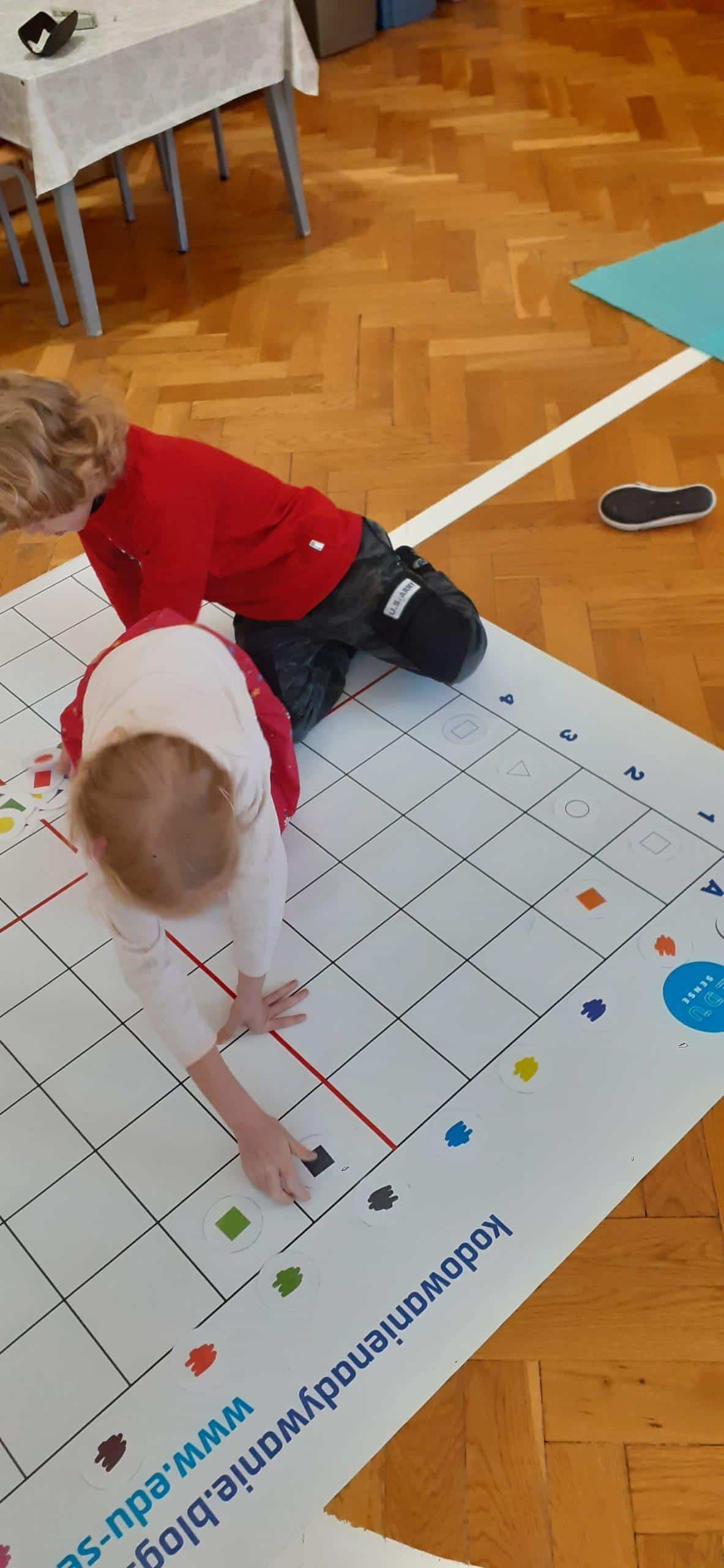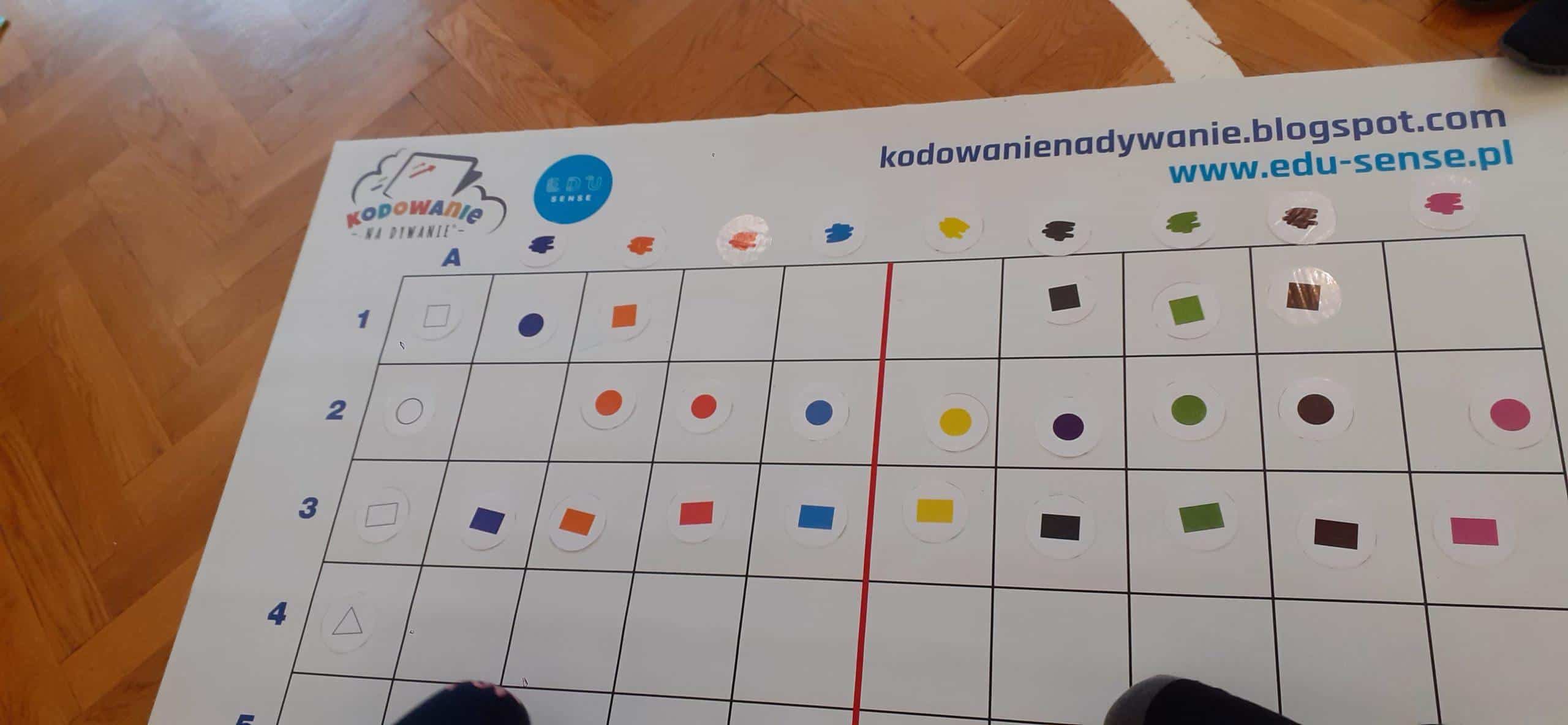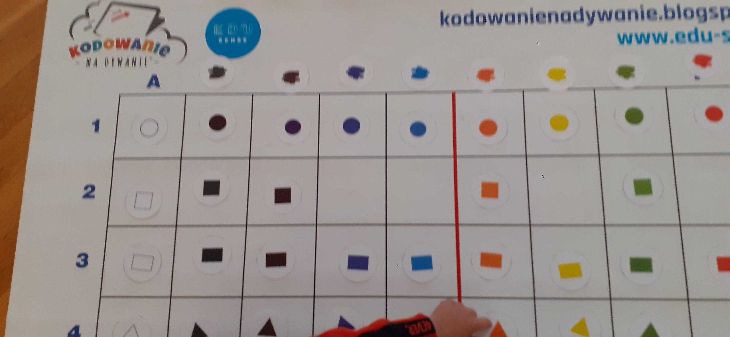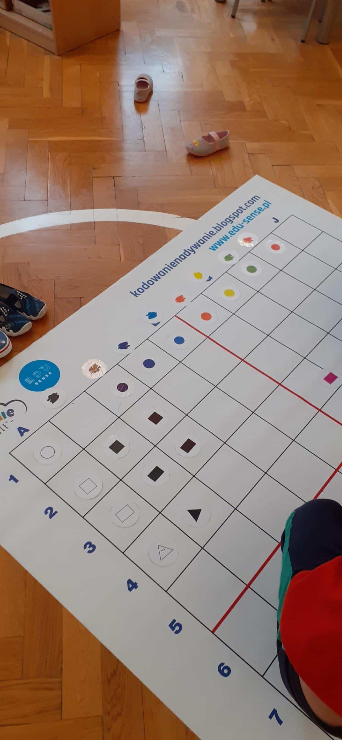 Sudoku to japońska gra, do której wykorzystuje się diagram kratkowy 9×9. Celem gry jest wypełnienie każdego pola cyframi od 1 do 9 , przy czym cyfry nie mogą się powtarzać na całej długości 9 kratek na poziomie i w pionie. My zastosowałyśmy w pracy z dziećmi modyfikację tej gry, stosując matę do kodowania – czyli pokratkowany kwadrat 10×10, a zamiast cyfr zastosowano kolorowe figury geometryczne. Zadaniem dzieci było wypełnienie figurami geometrycznymi pól maty, czyli odkodowanie, w którym miejscu powinna położona być konkretna figura geometryczna. Zabawa ta dobroczynnie wpływa na rozwój uwagi dzieci, koncentrację, spostrzeganie wzrokowe,logiczne myślenie, a także rozwija umiejętność współpracy.