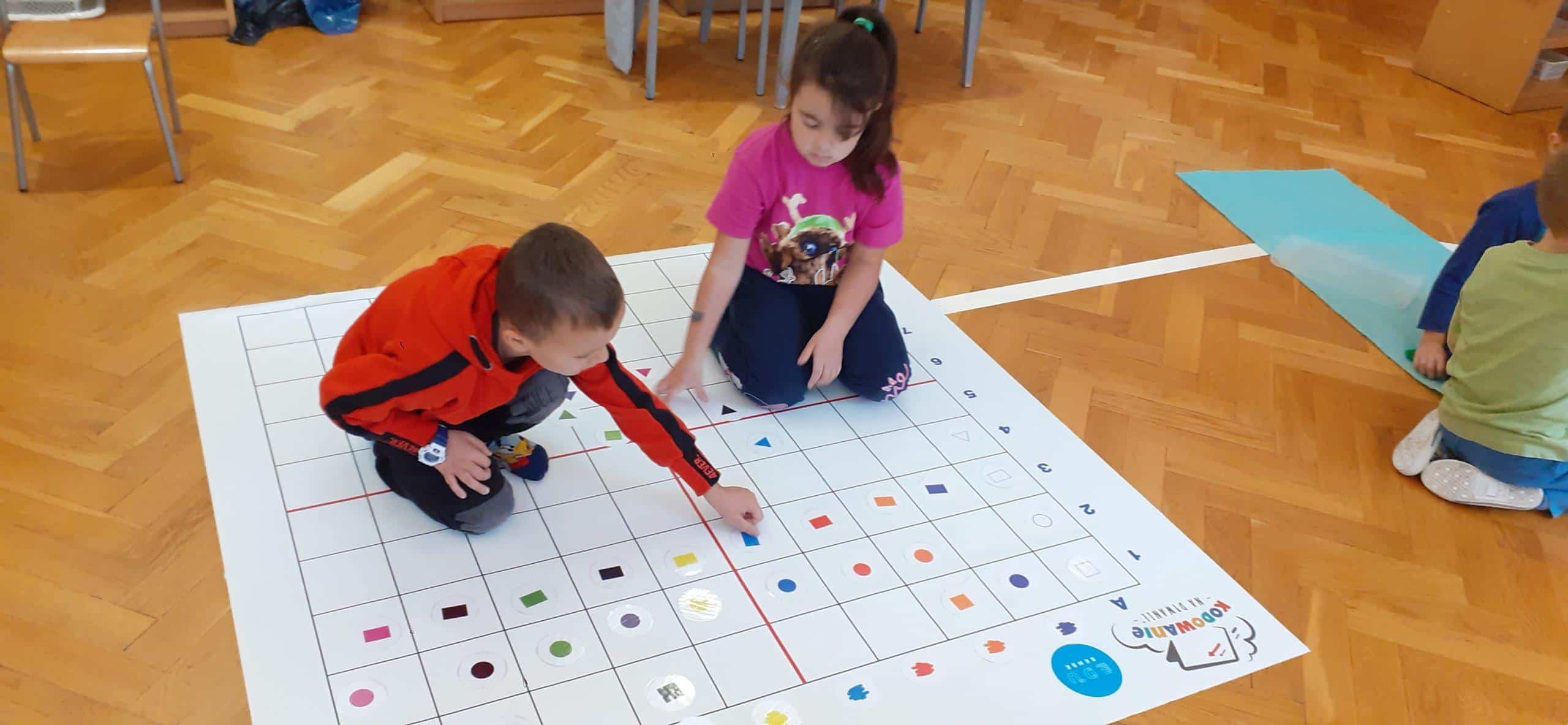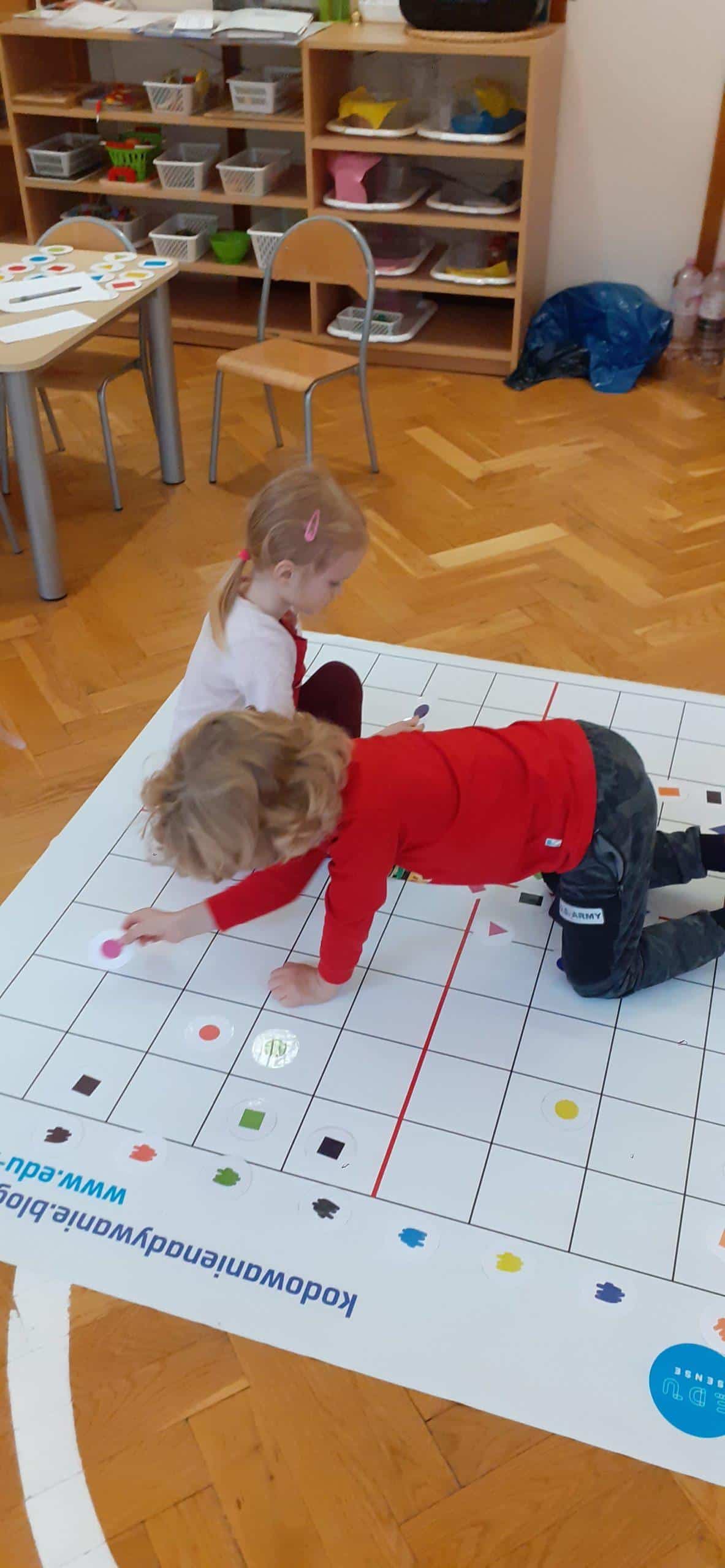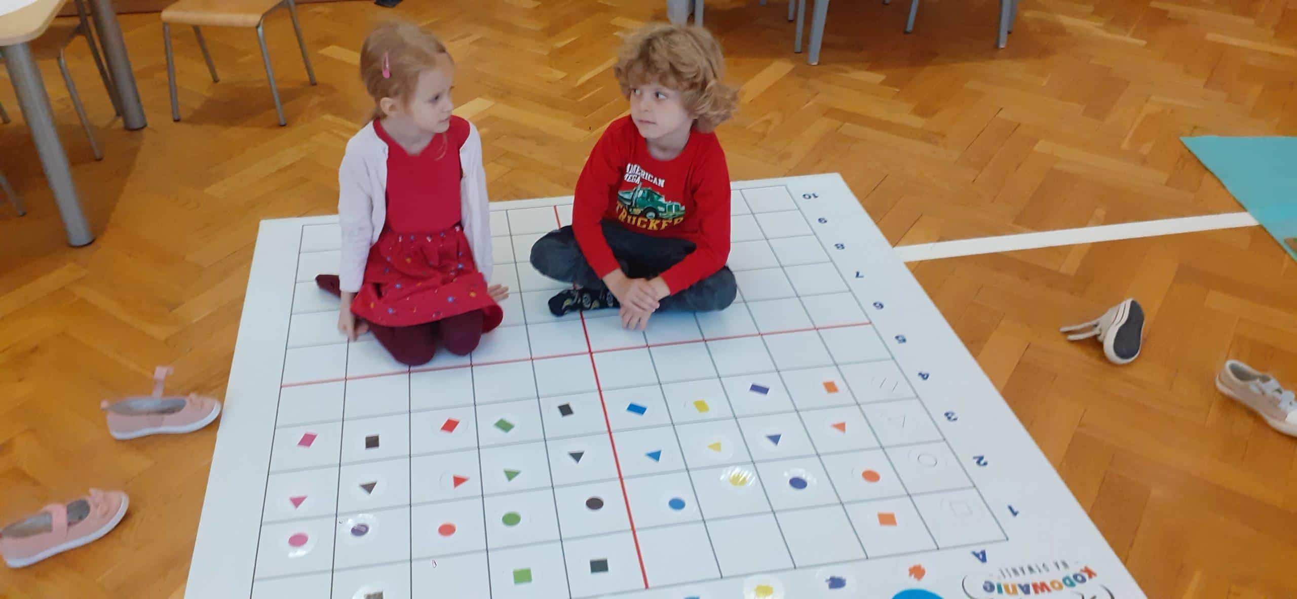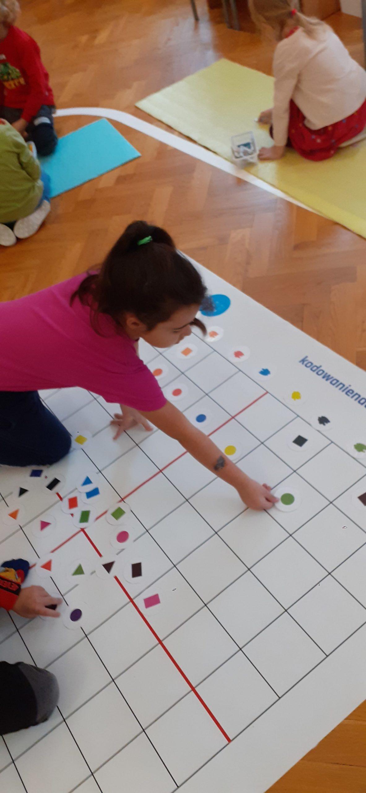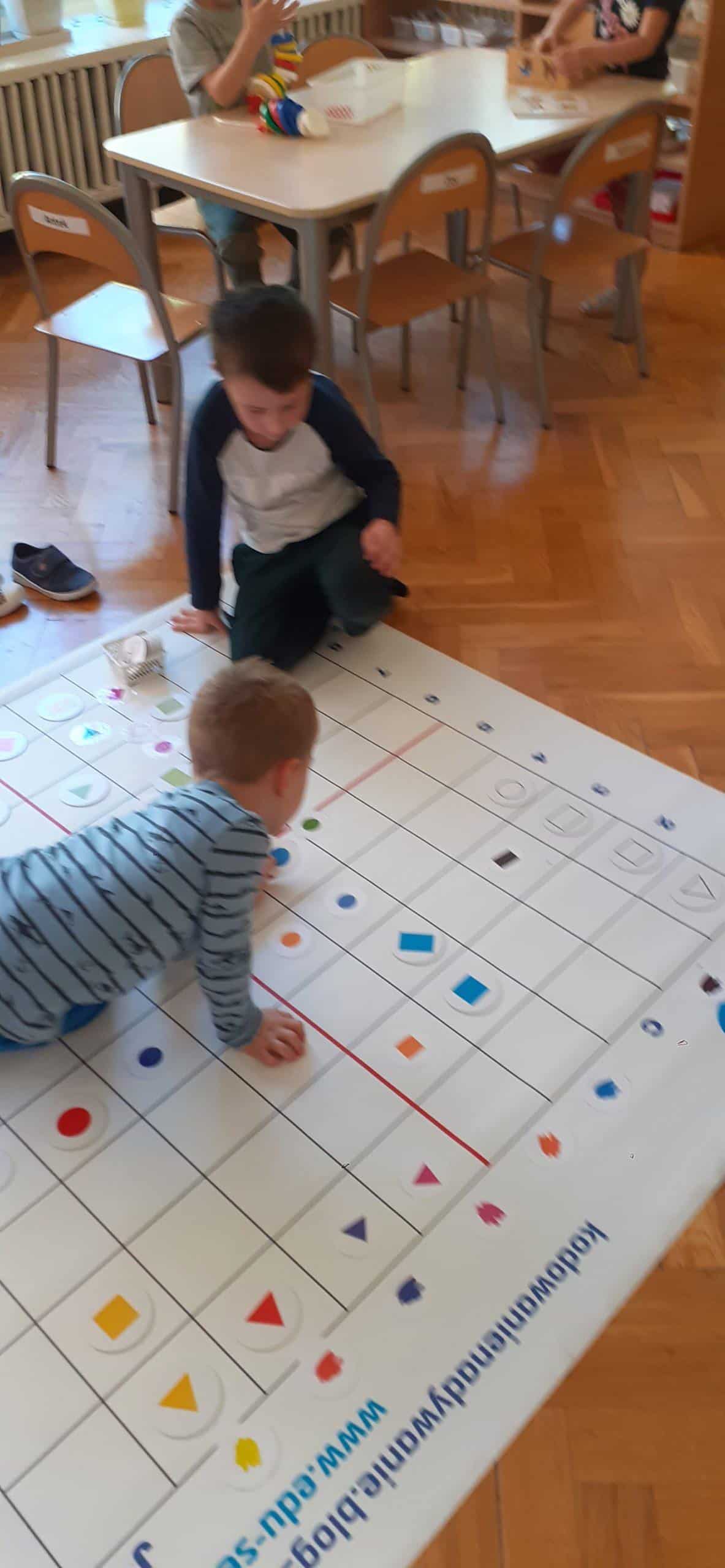 Sudoku to japońska gra, do której wykorzystuje się diagram kratkowy 9×9. Celem gry jest wypełnienie każdego pola cyframi od 1 do 9 , przy czym cyfry nie mogą się powtarzać na całej długości 9 kratek na poziomie i w pionie. My zastosowałyśmy w pracy z dziećmi modyfikację tej gry, stosując matę do kodowania – czyli pokratkowany kwadrat 10×10, a zamiast cyfr zastosowano kolorowe figury geometryczne. Zadaniem dzieci było wypełnienie figurami geometrycznymi pól maty, czyli odkodowanie, w którym miejscu powinna położona być konkretna figura geometryczna. Zabawa ta dobroczynnie wpływa na rozwój uwagi dzieci, koncentrację, spostrzeganie wzrokowe,logiczne myślenie, a także rozwija umiejętność współpracy.