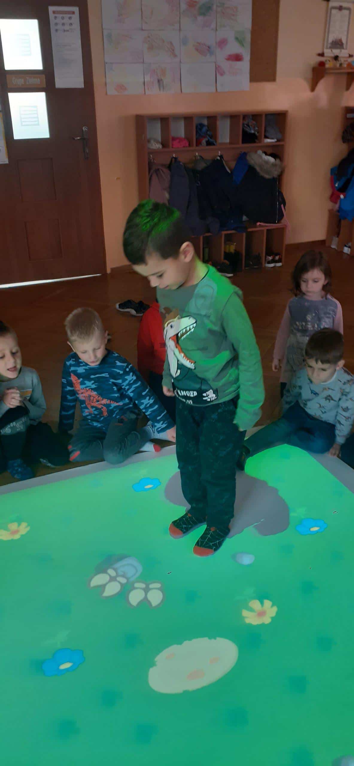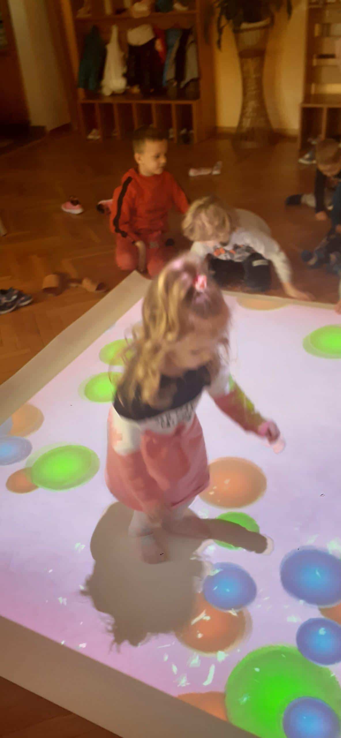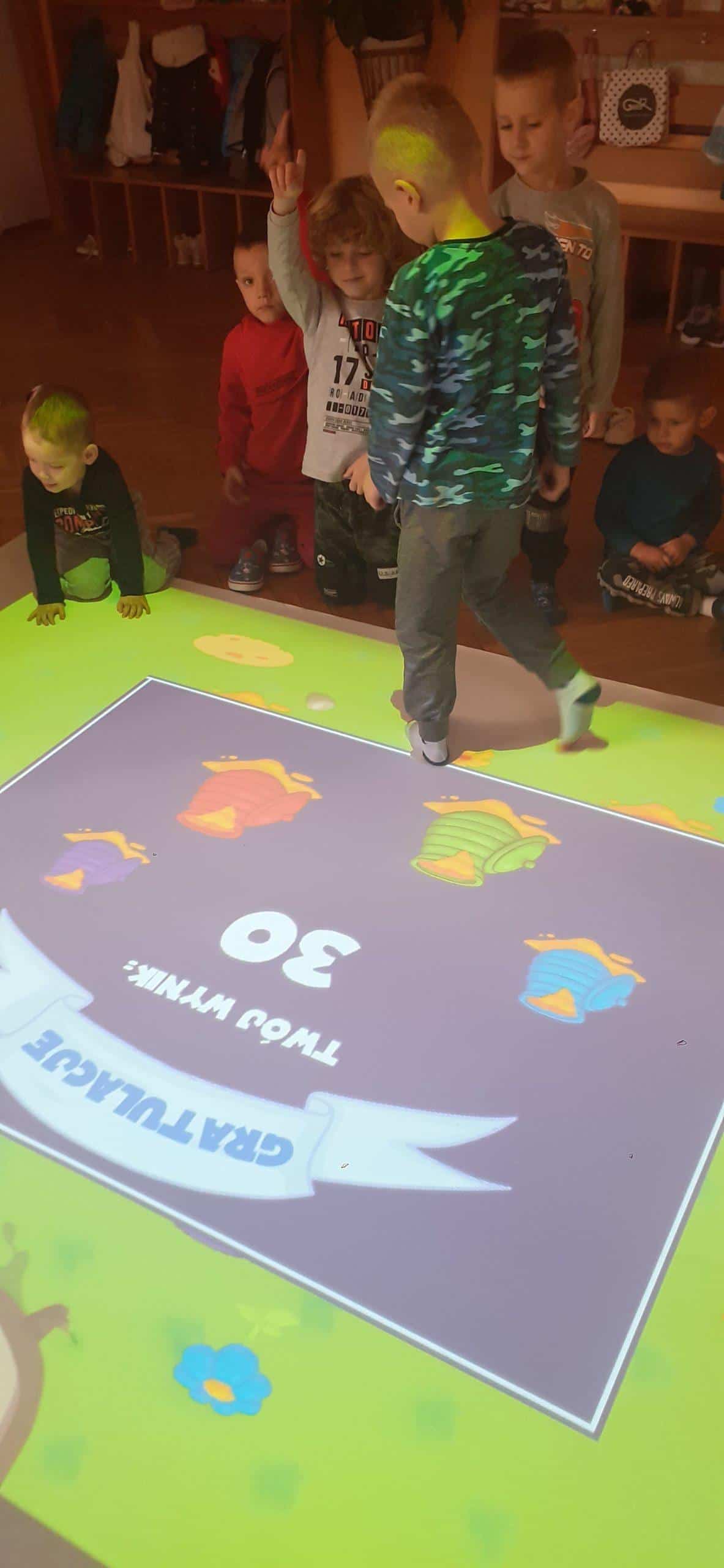 Dywan interaktywny to ulubiona forma zajęć dzieci. Umieszczony pod sufitem projektor interaktywny tworzy wirtualną interaktywną podłogę, na której dzieci przeżywają ciekawe doświadczenia. To też nauka połączona z zabawą, ale także z edukacją poznawczą z różnych obszarów rozwojowych. Podczas zabaw i ćwiczeń na interaktywnym dywanie dzieci rozwijają lub doskonalą kompetencje językowe, matematyczne, przyrodnicze, a także pamięć, uwagę , spostrzegawczość, koncentrację uwagi.