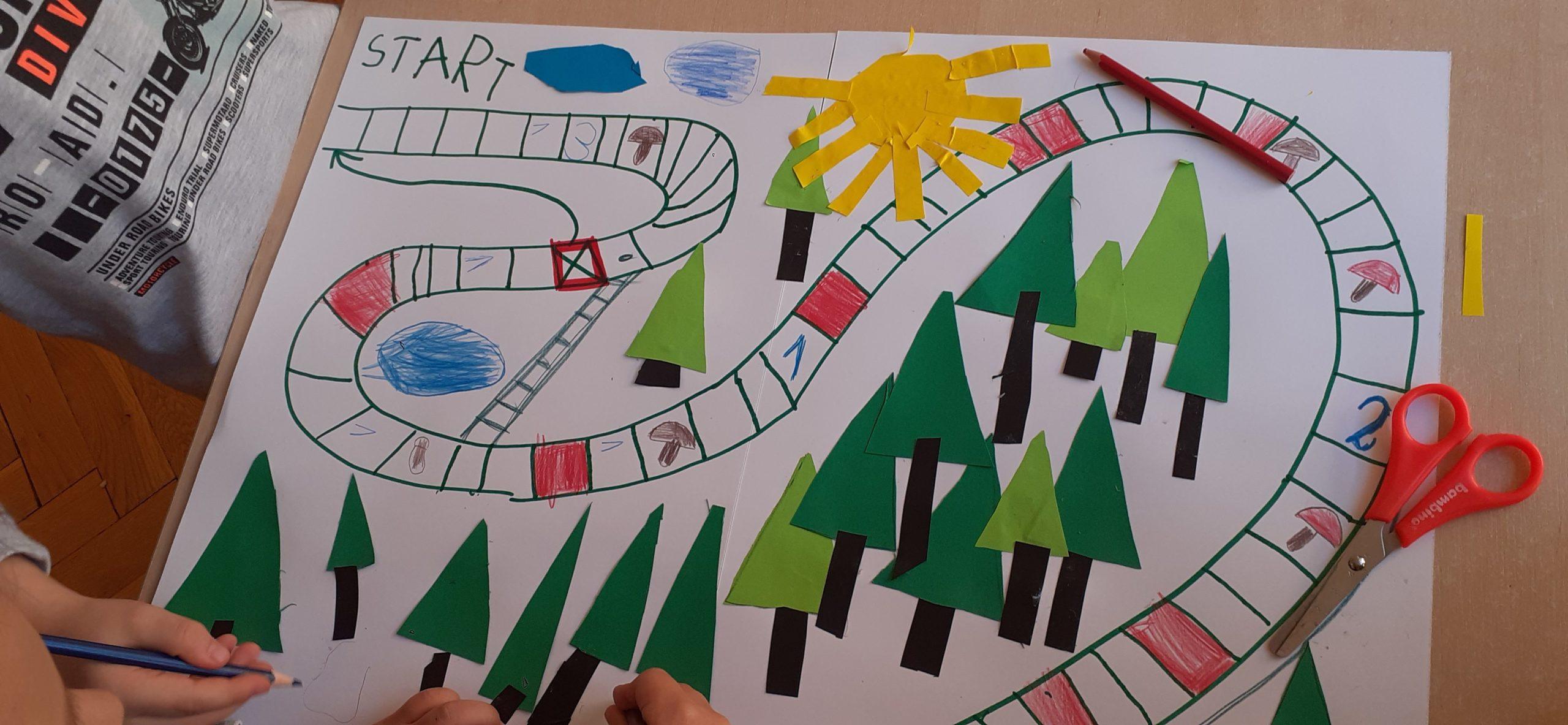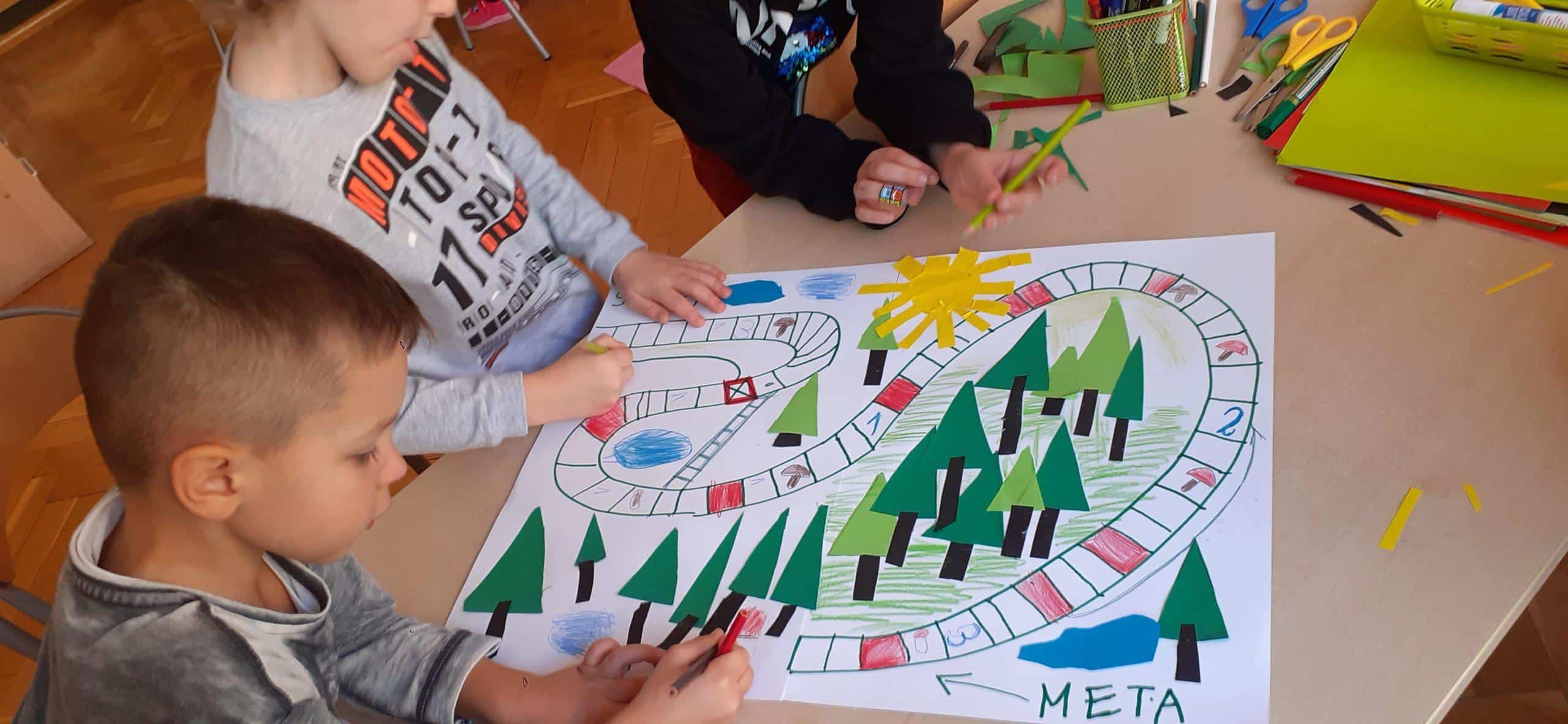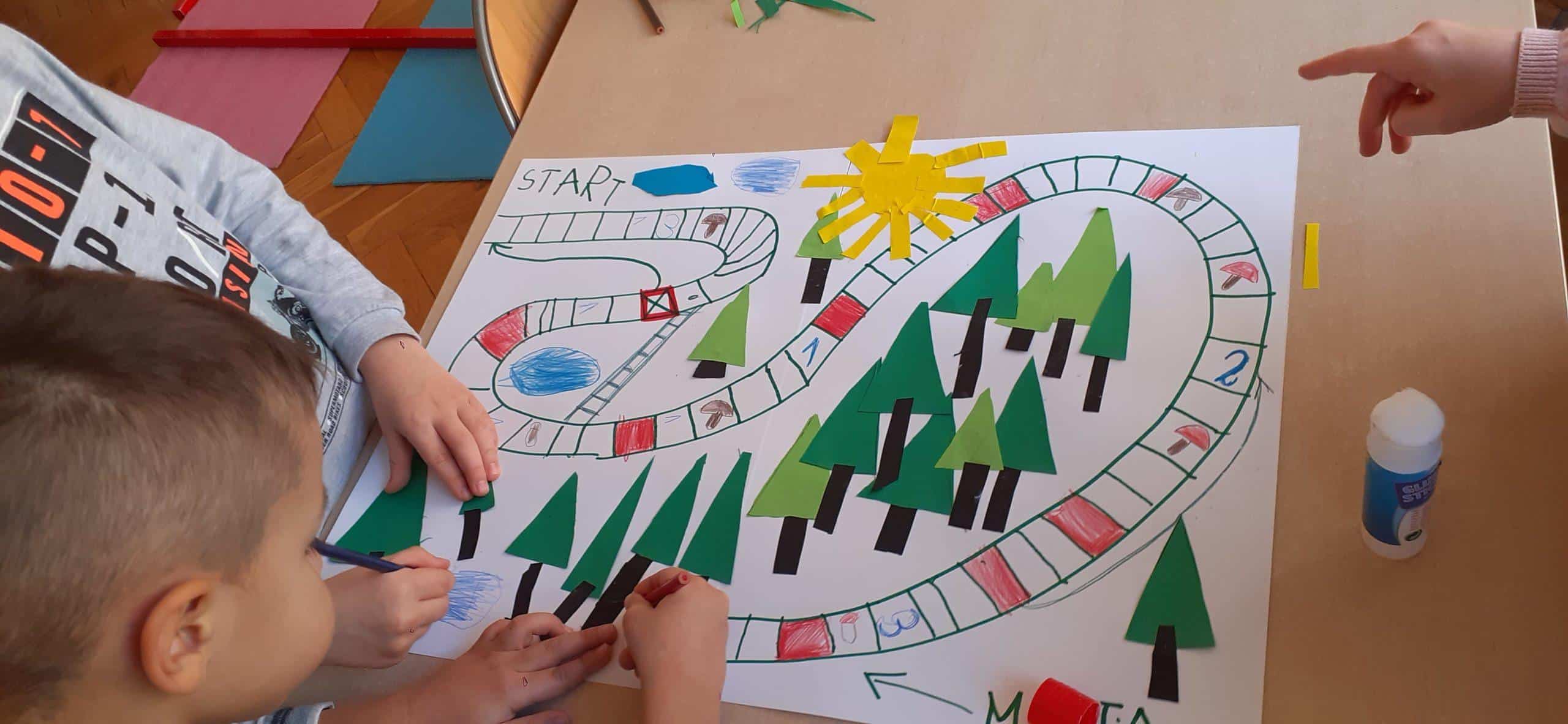 W tym roku szkolnym w grupie Pomarańczowej realizowany jest program , którego głównym celem jest nauczenie dzieci sztuki konstruowania gier matematycznych. Program ten proponuje zastosowanie różnorodnych gier matematycznych o różnym stopniu trudności , o bardziej lub mniej rozbudowanym wątku matematycznym . Będą to tzw.: gry – ściganki i gry opowiadania , ale zaprojektowane przez dzieci (plansza i zasady gry). Realizowane treści zawarte w tym programie dostarczą dziecku konkretnych doświadczeń , niezbędnych do zrozumienia pojęć matematycznych , rozwinął umiejętność logicznego myślenia , zaspokoją ciekawość , rozwijać będą zainteresowania i pobudzą dzieci do samodzielnej aktywności. W miarę jak będą powiększać się kompetencje matematyczne dzieci , sytuacje w grach będą coraz bardziej matematyzowane i na coraz wyższym poziomie trudności. Dlatego też zapoznanie dzieci z grami matematycznymi i wprowadzenie ich w tajniki ich konstruowania w ogromnym stopniu wpłynie na przygotowanie do sprostania zadaniom stawianym przez szkołę. Nauczenie dzieci konstruowania gier, oraz ich rozgrywania przyczyni się nie tylko do rozwijania kluczowych kompetencji matematycznych, ale także będzie kształtowało odporność emocjonalną, co jest niezmiernie istotnym czynnikiem wpływającym na tak ważną dojrzałość szkolną. W ostatnim czasie na okoliczność konkursu, w ramach którego było zaprojektowanie gry planszowej powstała gra pt.” Na grzyby”. Było to dla dzieci bardzo emocjonujące zadanie , zwłaszcza w kontekście ustalania zasad gry , ustalania tzw. premii i pułapek. I udało się poswatała fantastyczna gra planszowa z wątkiem matematycznym.