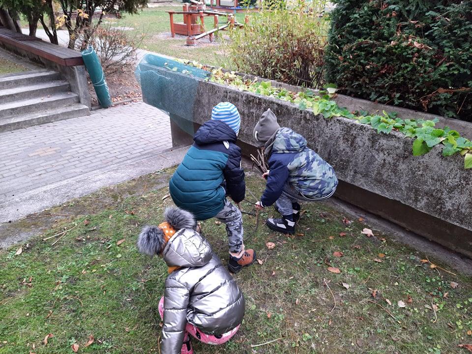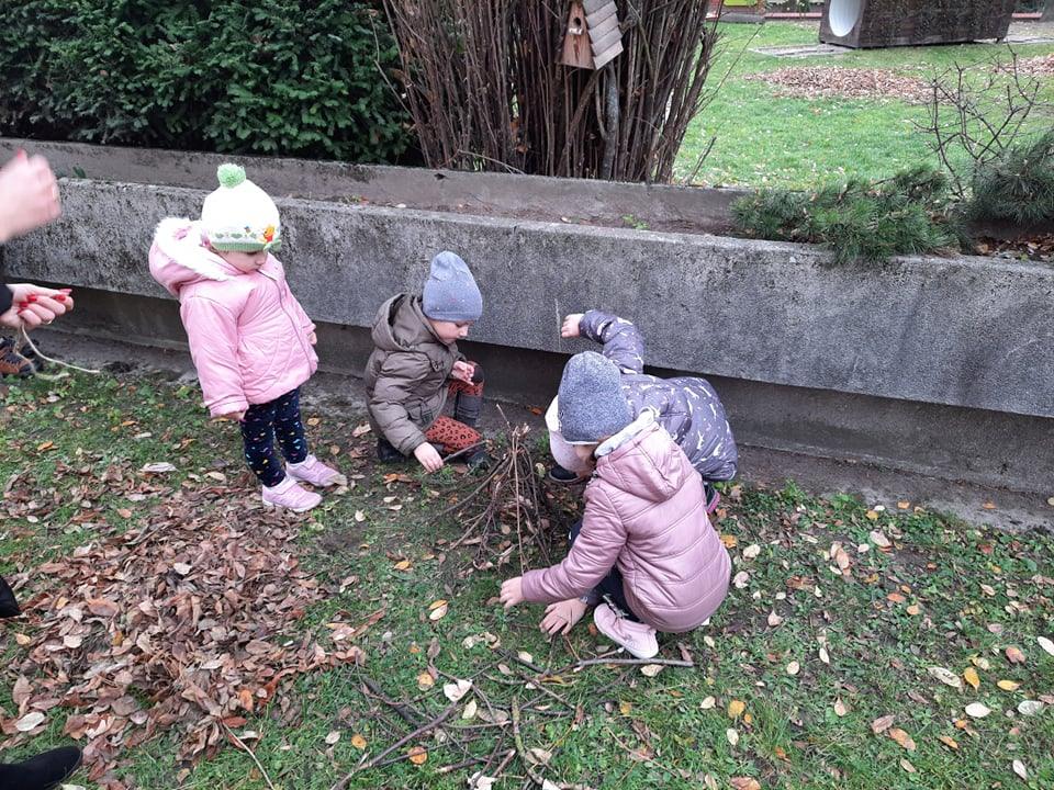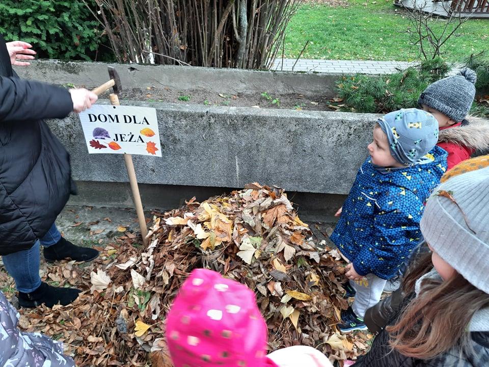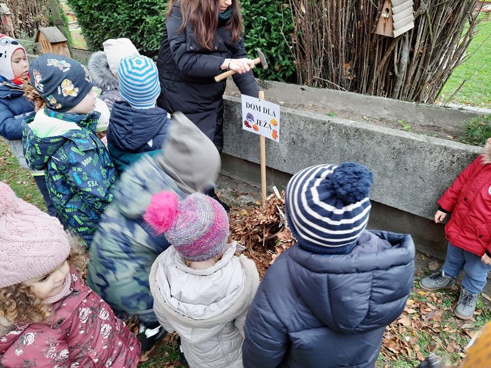Postanowiliśmy zatem, że zbudujemy dom dla jeża w naszym ogrodzie 🙂 Pozbieraliśmy patyki i liście. Z patyków stworzyliśmy konstrukcję, wszystko przykryliśmy liśćmi i legowisko dla jeża było gotowe. Obok niego wbiliśmy tabliczkę DOM DLA JEŻA. Może akurat jakiś jeż znajdzie tam schronienie 🙂