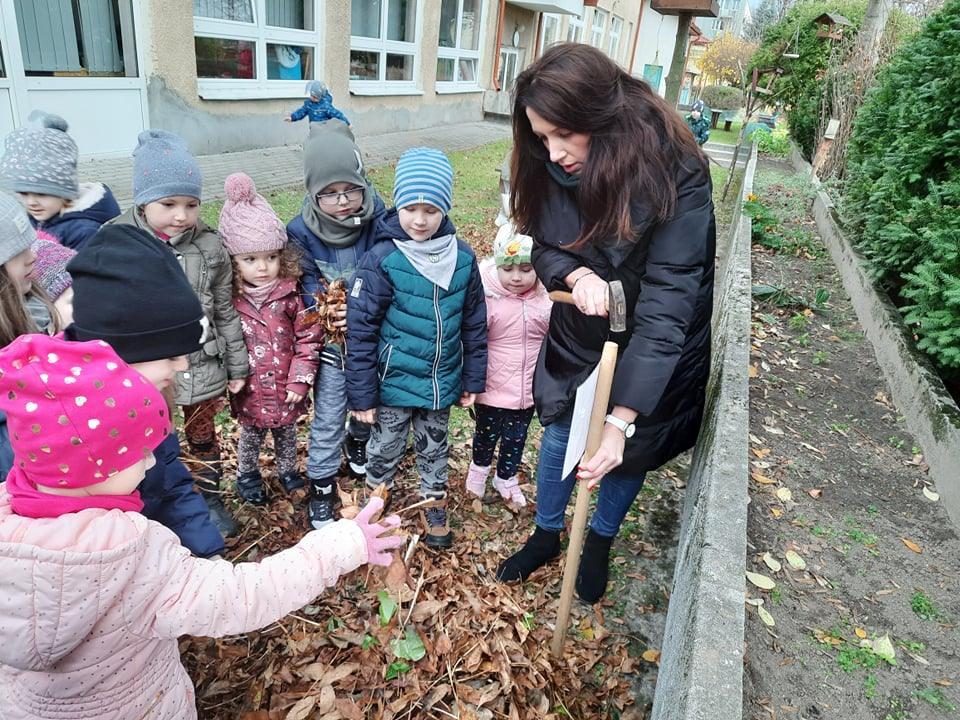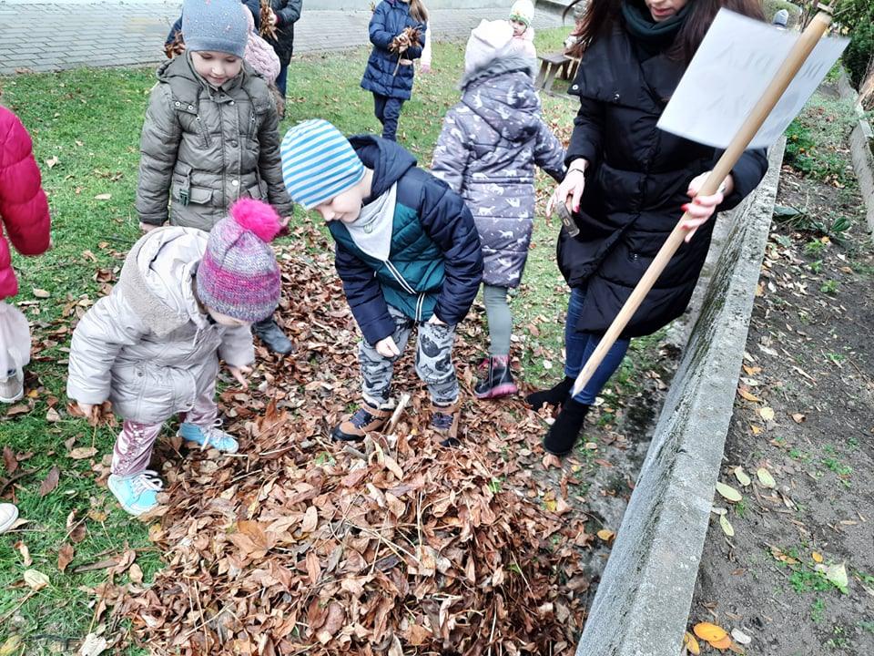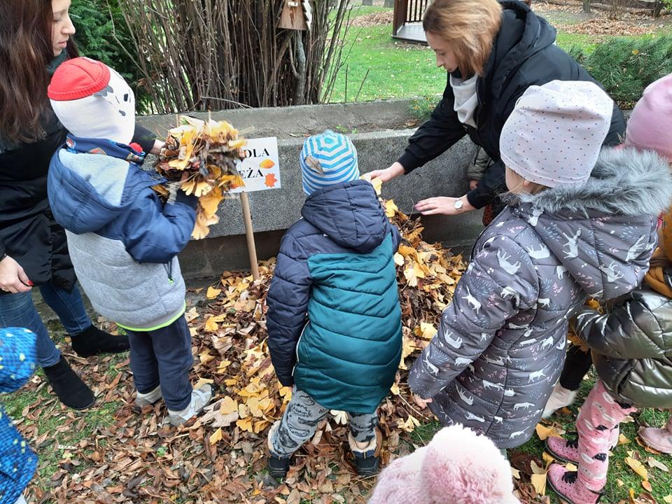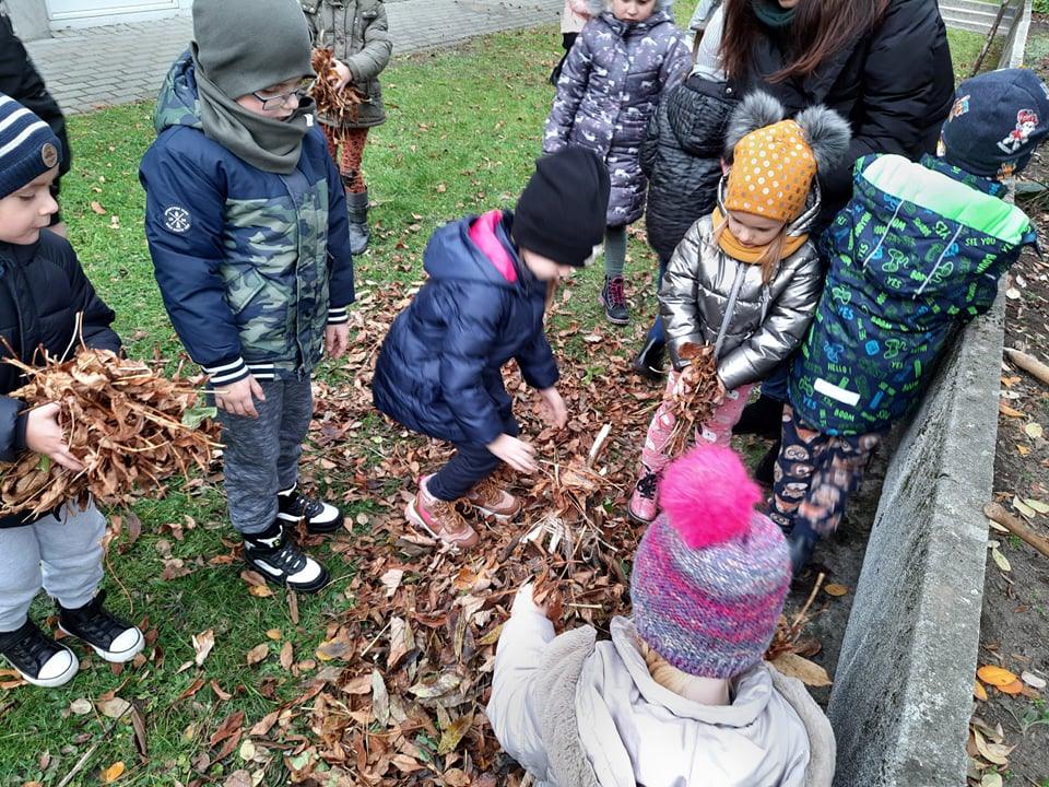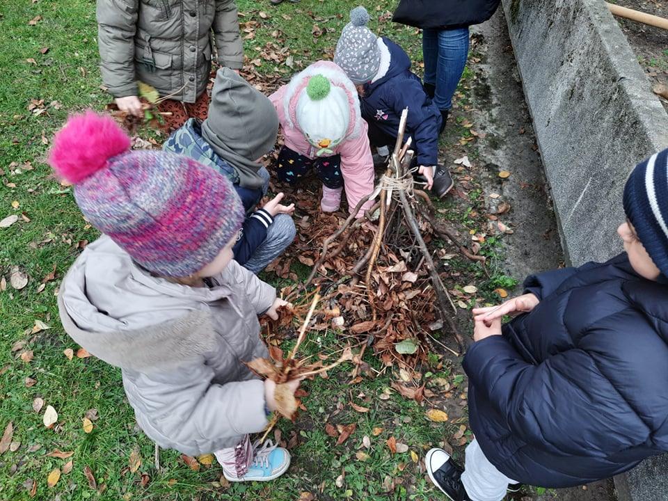 Postanowiliśmy zatem, że zbudujemy dom dla jeża w naszym ogrodzie 🙂 Pozbieraliśmy patyki i liście. Z patyków stworzyliśmy konstrukcję, wszystko przykryliśmy liśćmi i legowisko dla jeża było gotowe. Obok niego wbiliśmy tabliczkę DOM DLA JEŻA. Może akurat jakiś jeż znajdzie tam schronienie 🙂