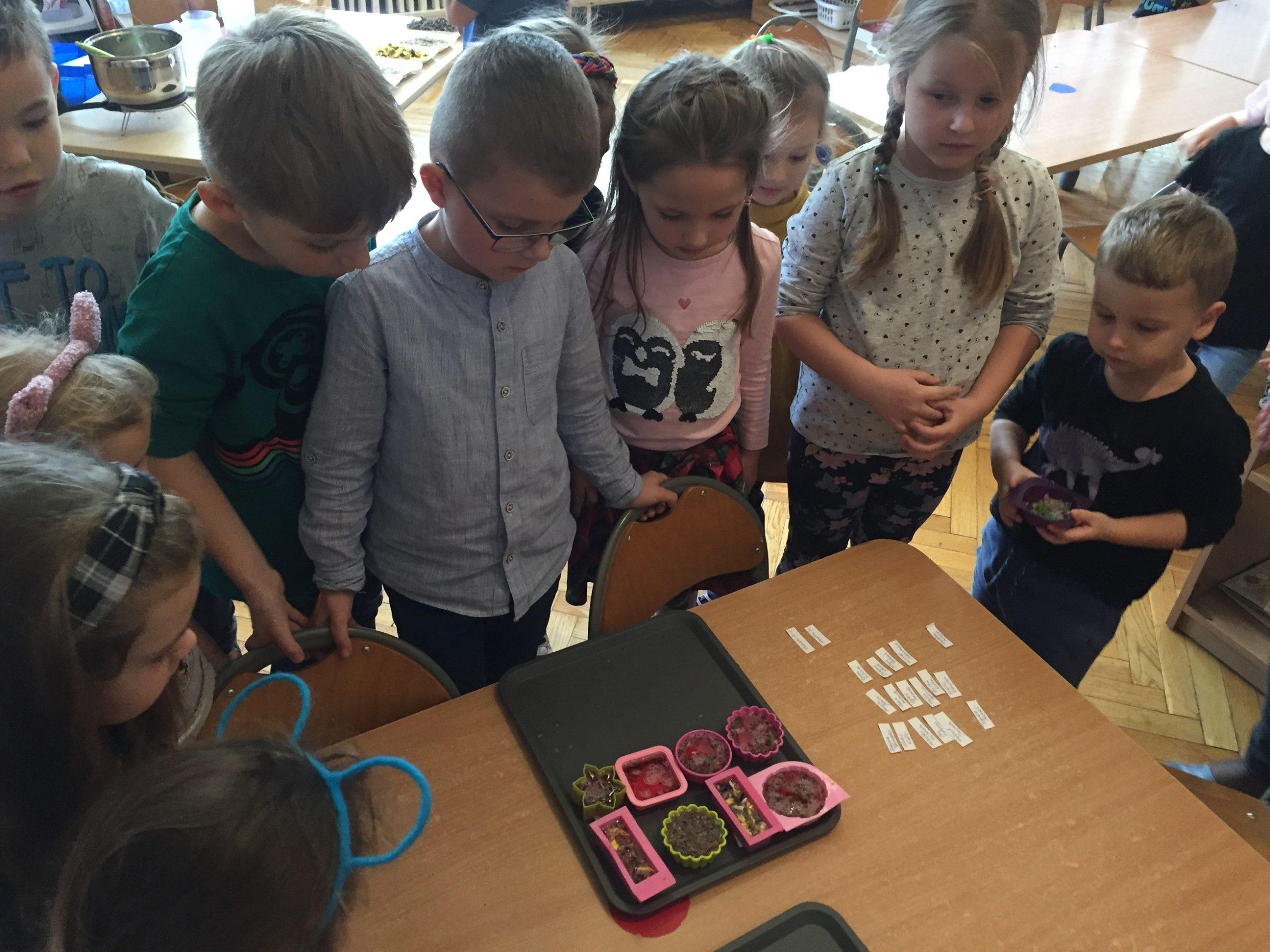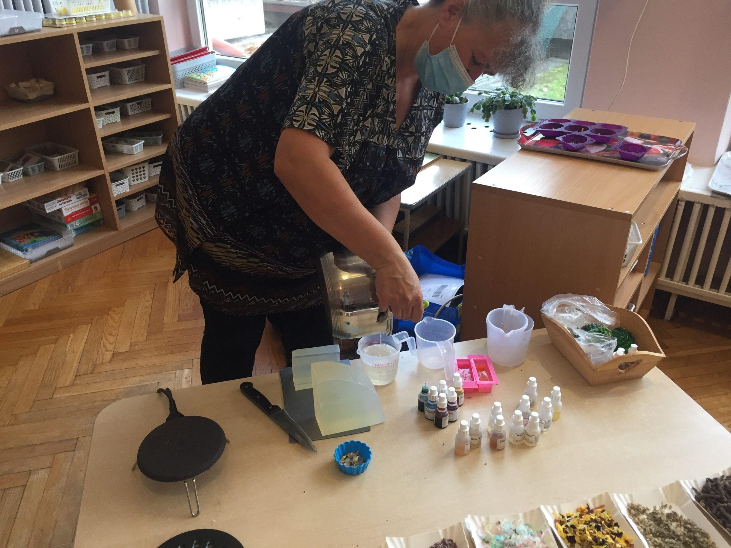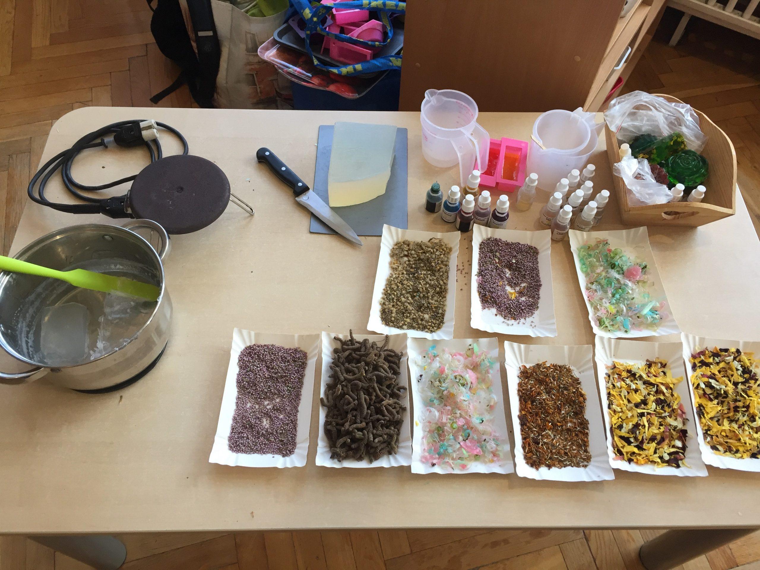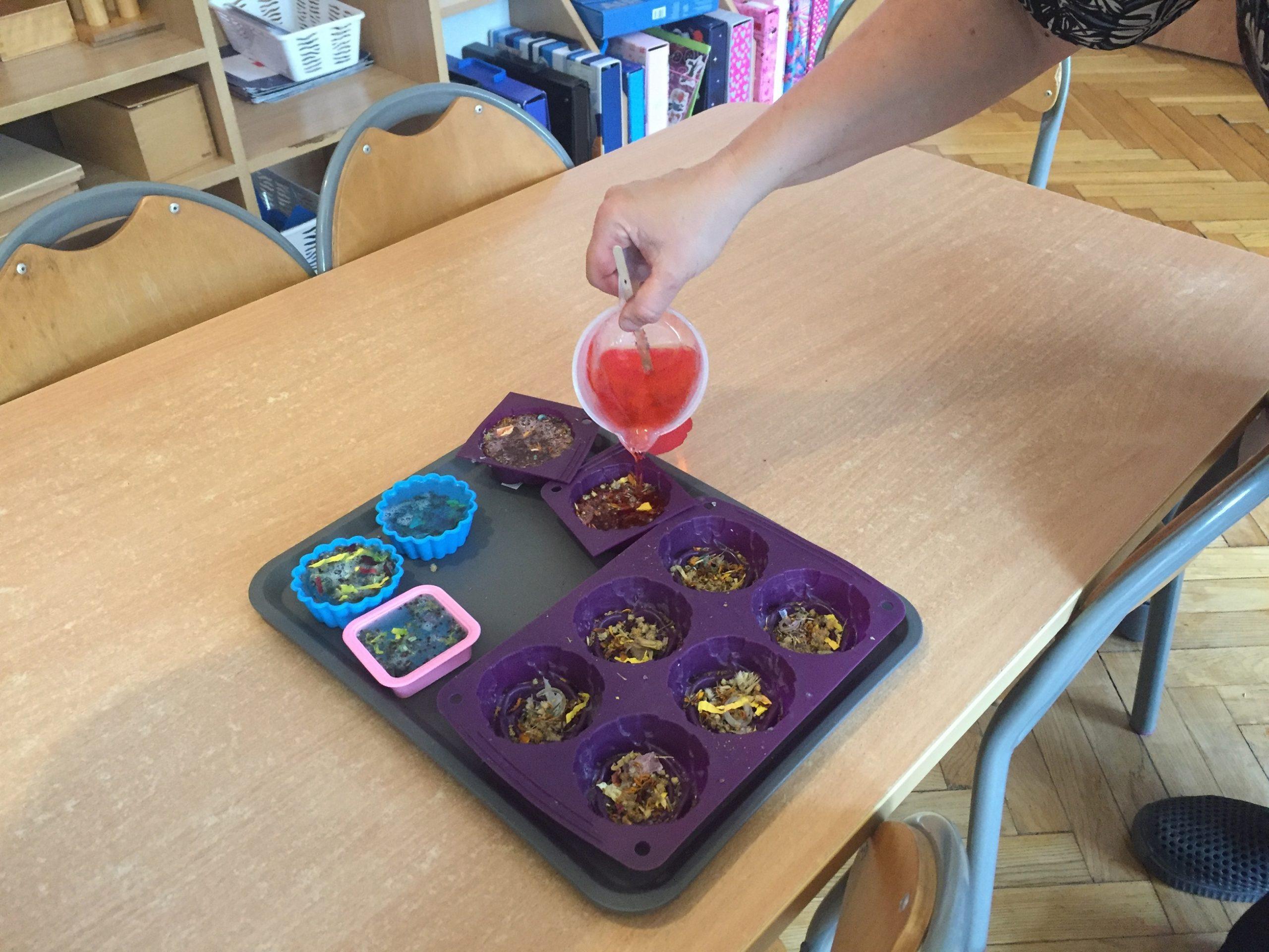 Dzieci otrzymały kompozycje zapachowe: malina, bez, cola, zielone jabłuszko, zielona herbata, cytryna, mleko i miód, a także susz kwiatowy, kolorowe dodatki mydlarskie, i barwniki. Dzieci w foremkach, które samodzielnie wybierały komponowały nuty zapachowe oraz wybierały kolorystykę.