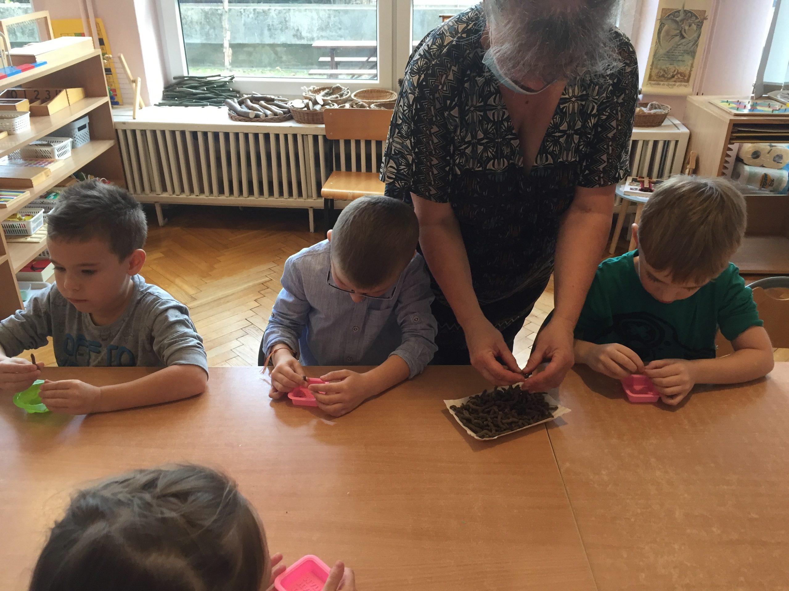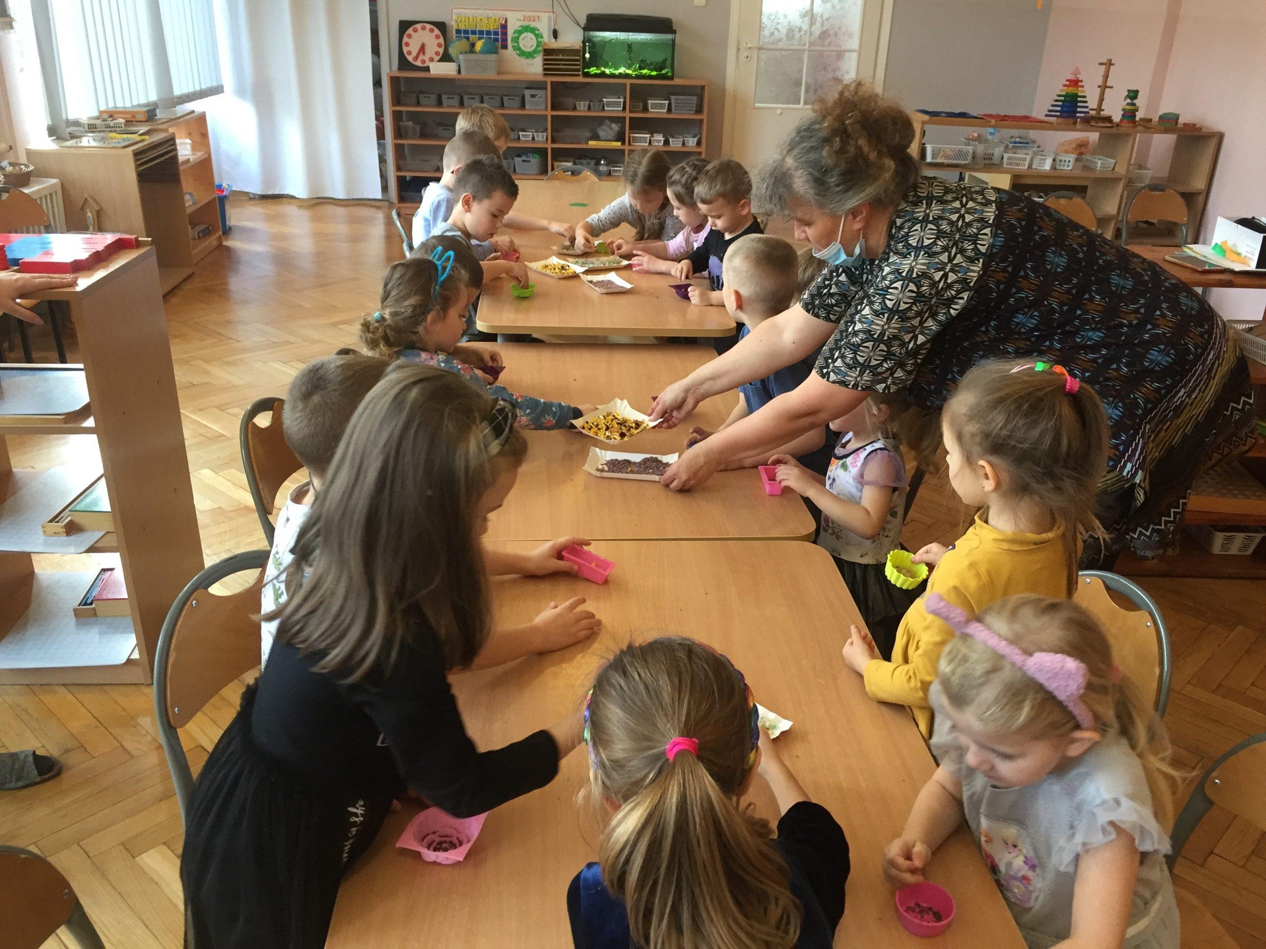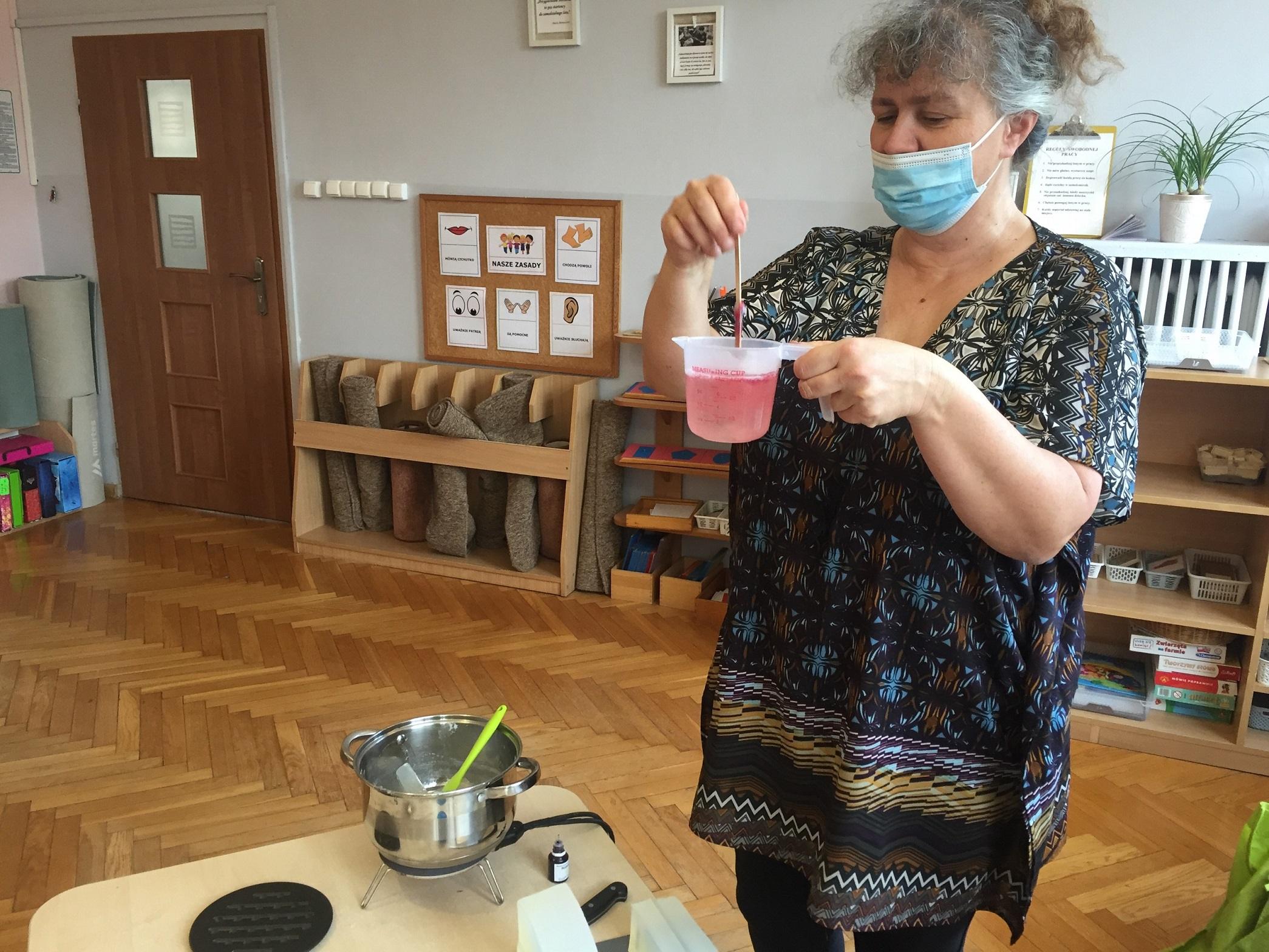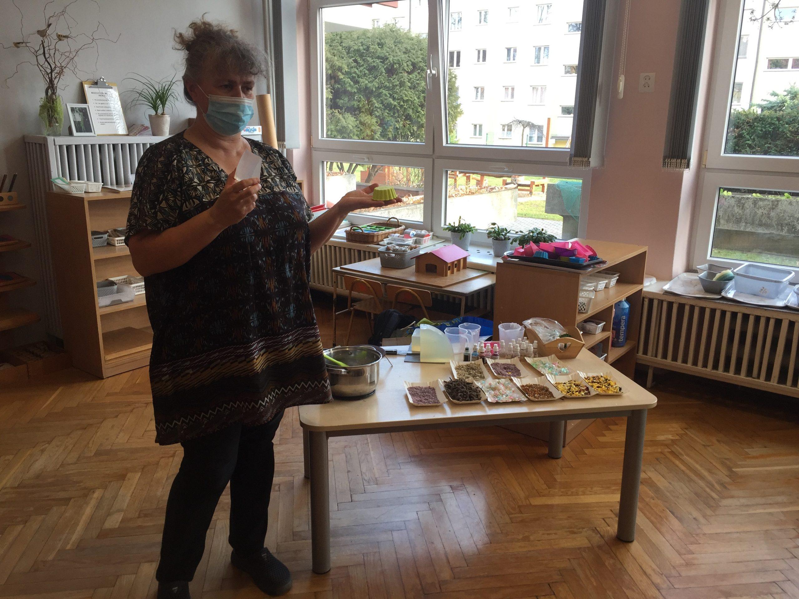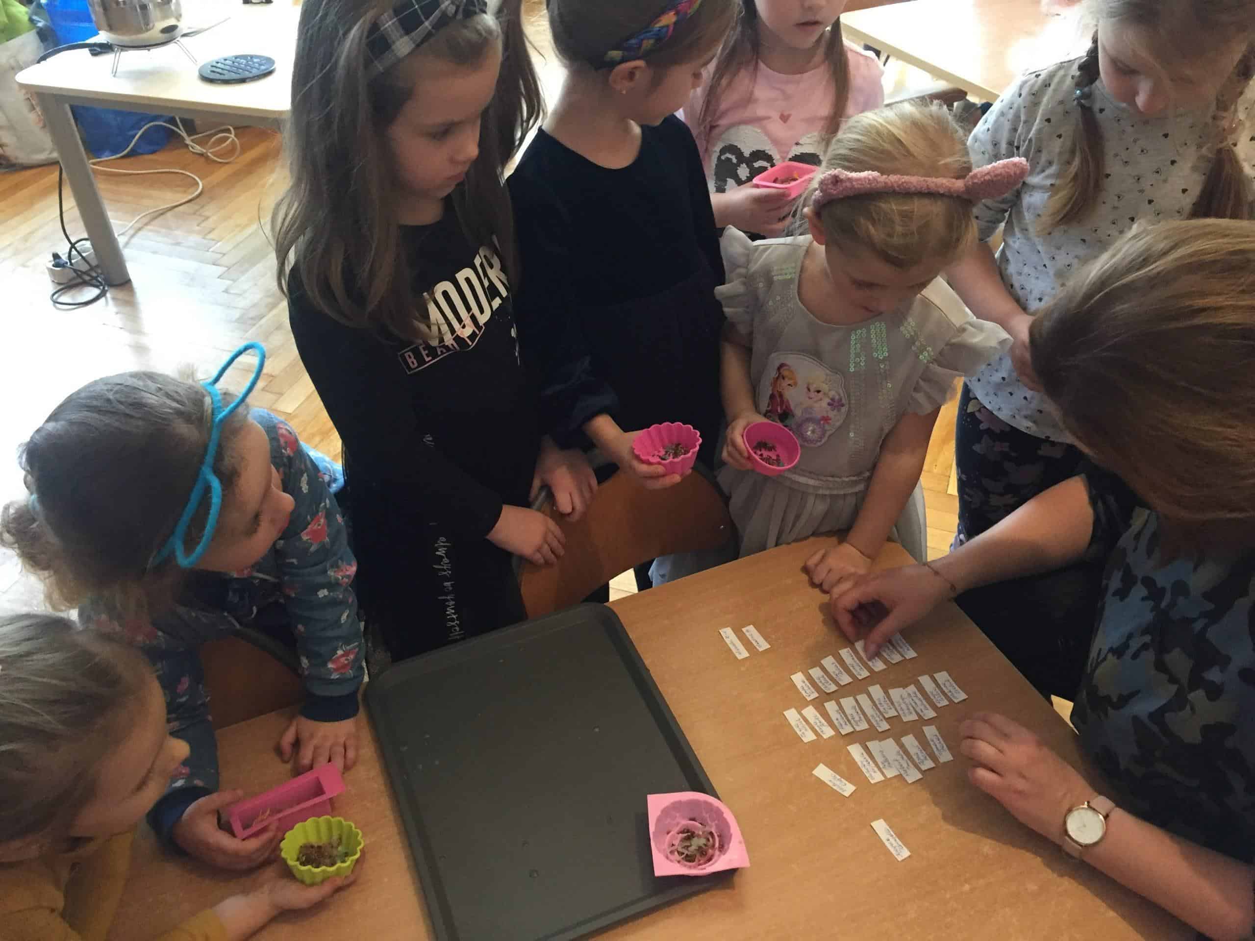 Dzieci otrzymały kompozycje zapachowe: malina, bez, cola, zielone jabłuszko, zielona herbata, cytryna, mleko i miód, a także susz kwiatowy, kolorowe dodatki mydlarskie, i barwniki. Dzieci w foremkach, które samodzielnie wybierały komponowały nuty zapachowe oraz wybierały kolorystykę.