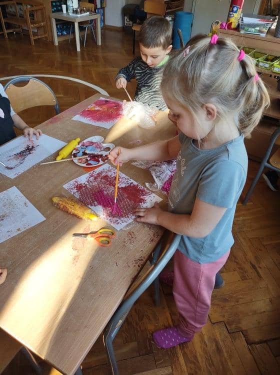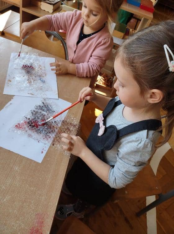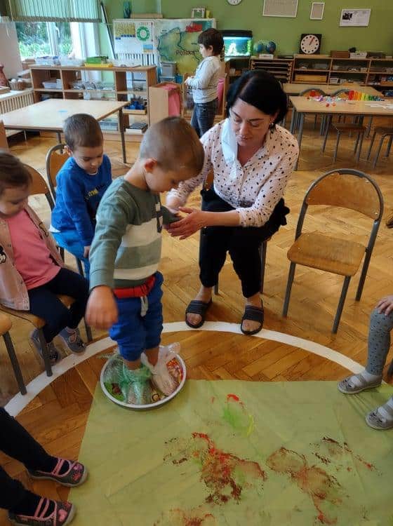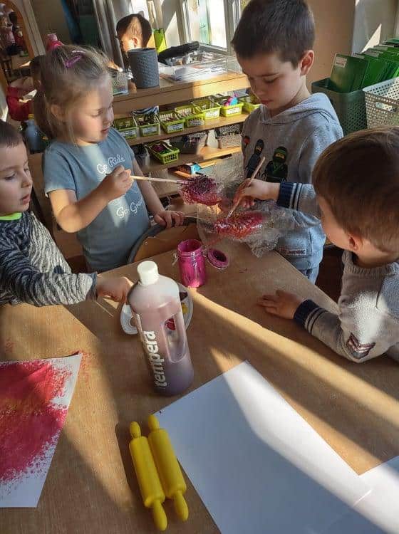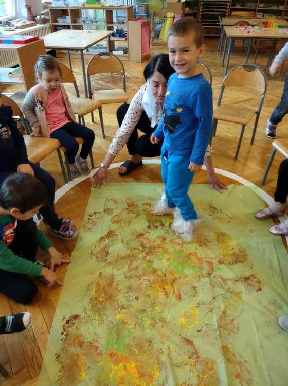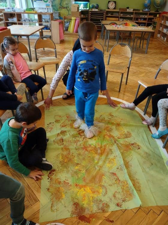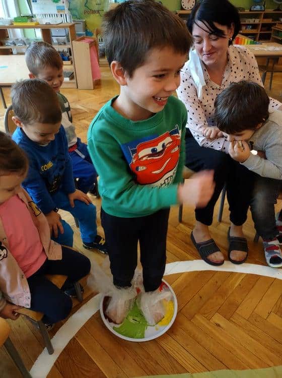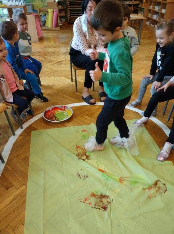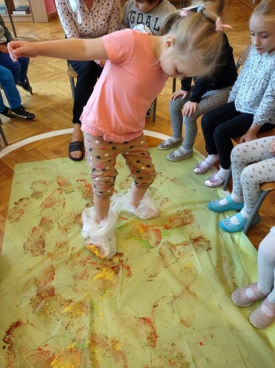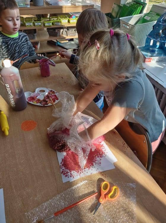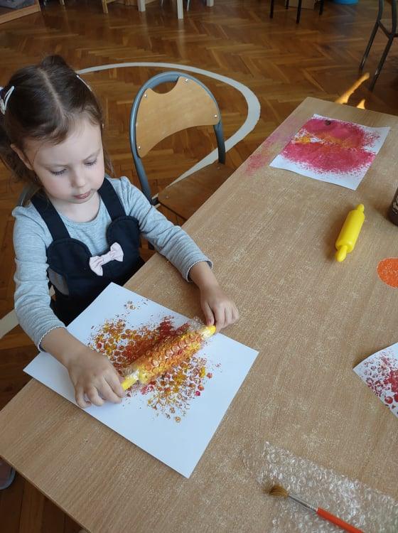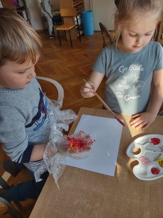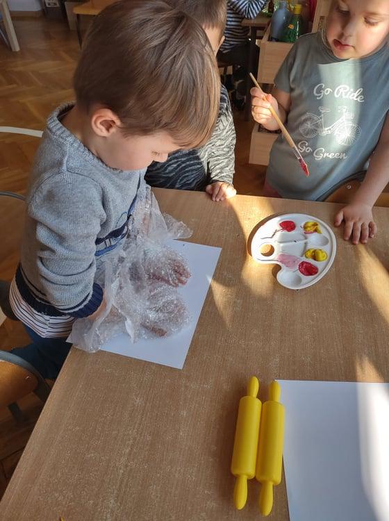Wszyscy wiemy jak ważne i potrzebne dla prawidłowego rozwoju dziecka są zabawy sensoryczne. Do takich właśnie zabaw należy zabawa folią bąbelkową, która stała się niedawną naszą bohaterką kilku dni. Nasze aktywności z folią bąbelkową to był prawdziwy festiwal kolorów. Malowaliśmy na folii, pod folią, malowaliśmy, a może raczej odciskaliśmy folię założoną na dłoniach a nawet na stopach 🙂 Radości było co niemiara 🙂 Działania plastyczne z wykorzystaniem folii to nie tylko ciekawa i odmienna forma artystyczna, ale jest to przede wszystkim doskonałe ćwiczenie na stymulację zmysłu dotyku oraz wzroku. Zabawy z folią usprawniają motorykę małą, koordynację wzrokowo-ruchową oraz rozbudzają kreatywność. Takie działania pozwalają w pełni rozwijać potencjał twórczy małego artysty.
