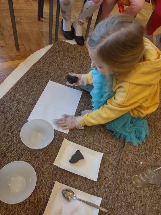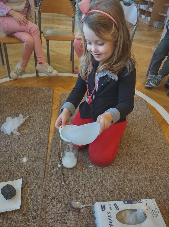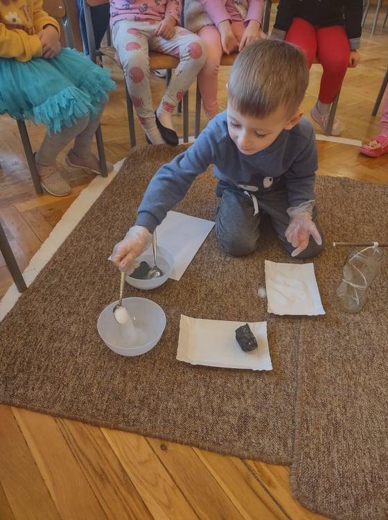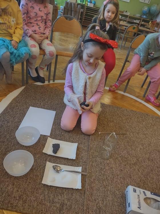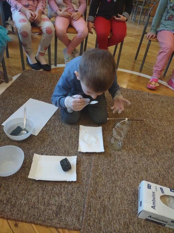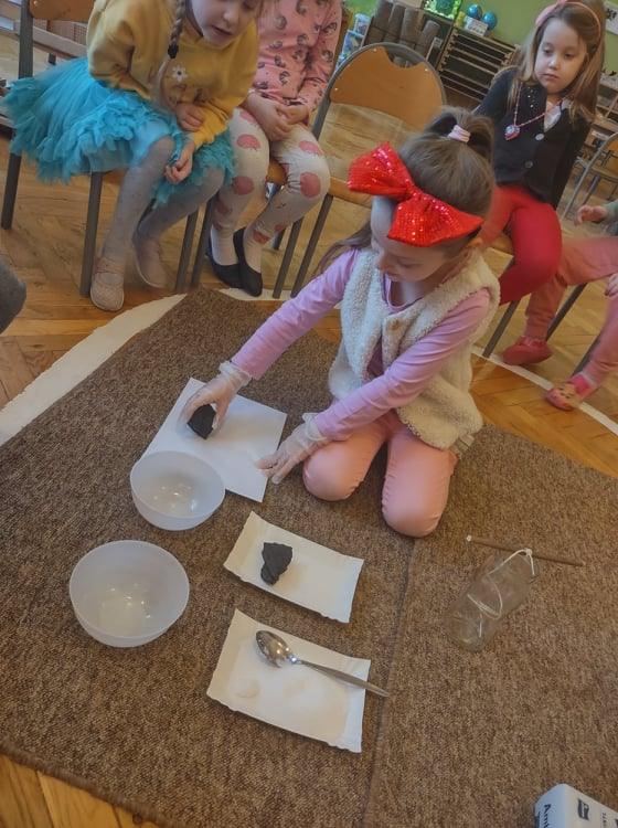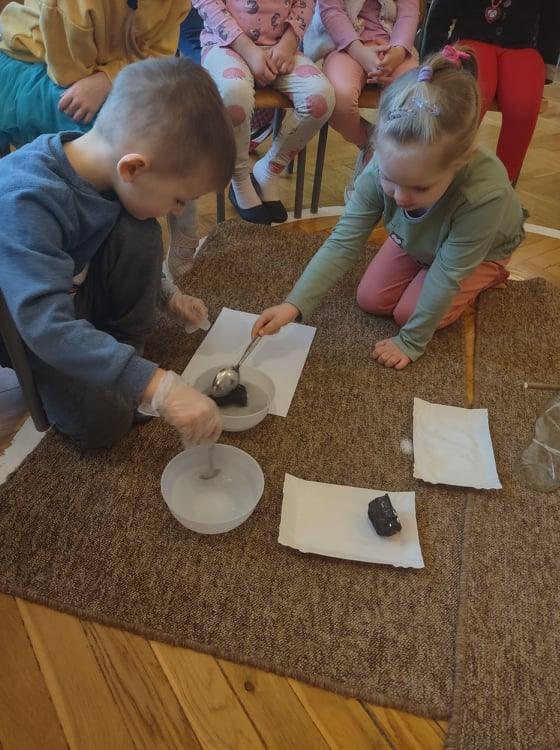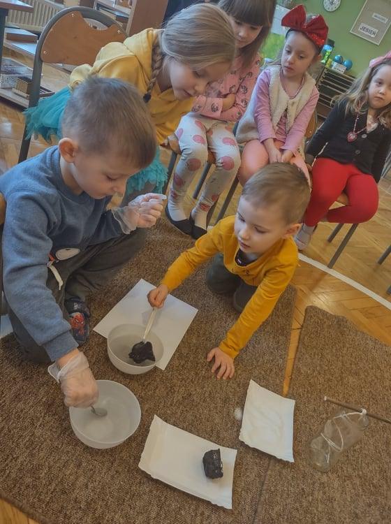 4 grudnia, czyli w imieniny Barbary, każdego roku obchodzony jest Dzień Górnika, zwany przez wszystkich Barbórką. Dzień ten stał się dla nas doskonałą okazją do poszerzenia wiedzy na temat górników, ich pracy oraz tak gorliwie czczonej przez nich patronki – świętej Barbary. Dzieci na podstawie wysłuchanej legendy o Św. Barbarze oraz prezentacji multimedialnej dowiedziały się jak ciężka i niebezpieczna jest praca w kopalni. Nasze zajęcia były doskonałą okazją do wzbogacenia wiedzy na temat zawodu górnika. Przedszkolaki poznały nowe pojęcia: barbórka, sztygar, kilof, czako, szyb itp. Dowiedziały się również co oznacza symbolika górniczego godła. Przeprowadziliśmy także zabawy badawcze z wykorzystaniem węgla – kształt, zapach, zastosowanie. Badaliśmy nawet jego rozpuszczalność w wodzie. Węgiel zestawiliśmy razem z naszym drugim „białym skarbem Ziemi”, czyli z solą – szukaliśmy różnic i cech wspólnych, a na zakończenie stworzyliśmy w naszym kąciku badawczym swoją własną, mini kopalnię soli, gdzie będziemy obserwować, jak na zawieszonym sznurku, rozpuszczona w wodzie sól krystalizuje się.