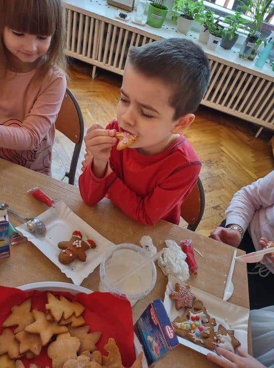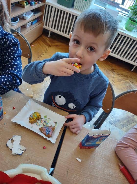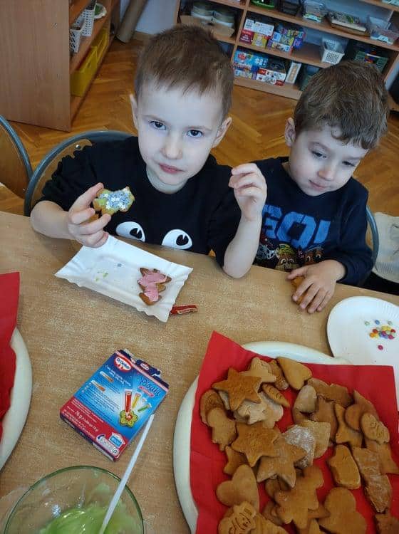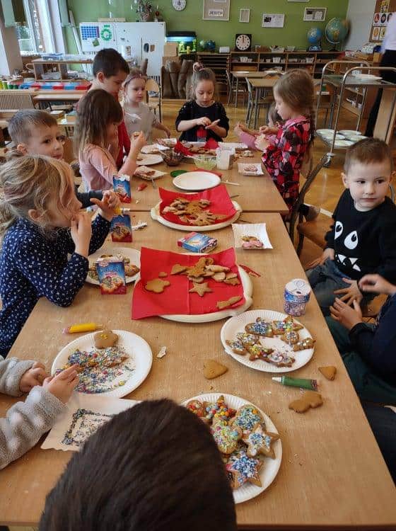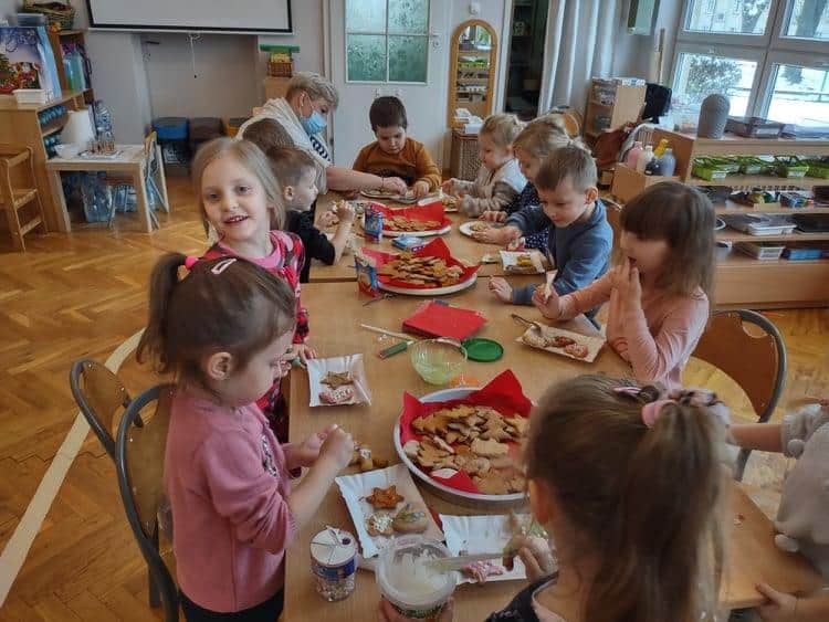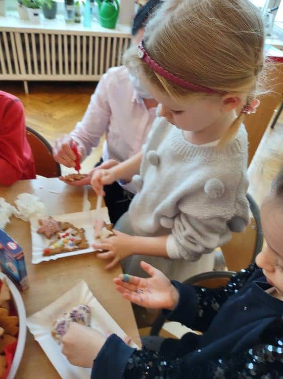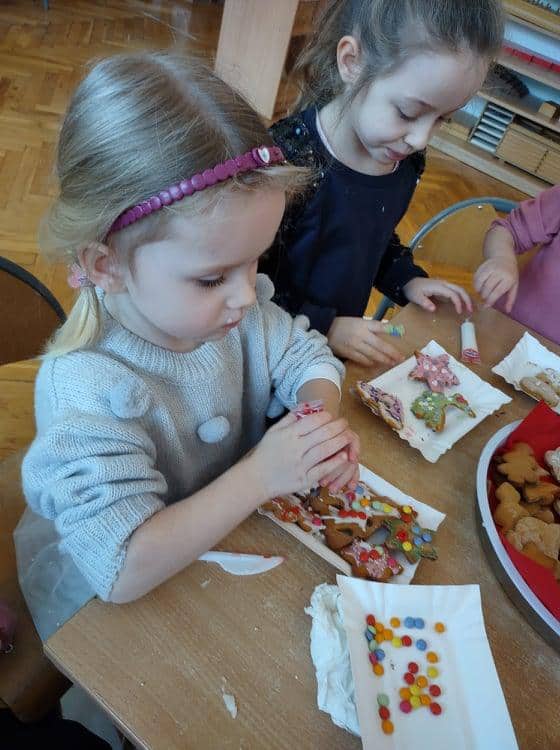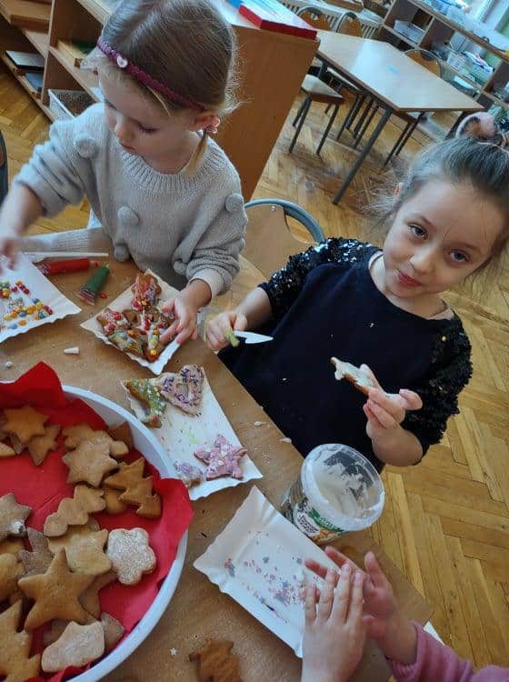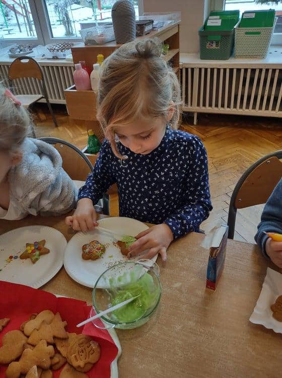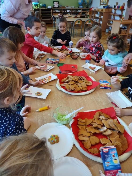 Święta Bożego Narodzenia to jeden z najpiękniejszych okresów w roku. Jest to moment, kiedy możemy zatrzymać się na chwilę i skupić na tym, co w życiu najważniejsze – na byciu razem. Od początku adwentu czynimy przygotowania i staramy się tworzyć ten niepowtarzalny, świąteczny klimat. Poznajemy symbolikę świąt Bożego Narodzenia. Na gazetce obok naszej sali pojawił się wieniec adwentowy, nie zabrakło też kalendarza adwentowego, dzięki któremu odliczamy czas do świąt. Gdzieniegdzie pojawiły się piękne dekoracje, a dzisiaj dopełnieniem naszych przygotowań stały się warsztaty cukierniczo – dekoracyjne z pierniczkami w roli głównej 🙂 Za sprawą Pani Małgosi, mamusi naszej Elizy, która przygotowała dla nas te wszystkie pachnące i aromatyczne pyszności, mogliśmy osobiście doświadczać świątecznych przygotowań. Dzieci z wielkim zaangażowaniem i w ogromnym skupieniu ozdabiały swoje pierniki. W tle naszej sali unosiły się melodie kolęd i pastorałek, co nadało jeszcze większego uroku i świątecznego klimatu naszej wspólnej pracy.