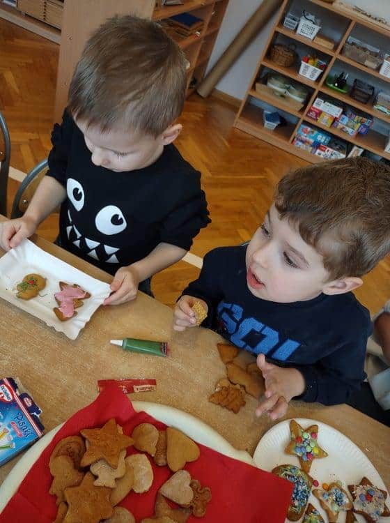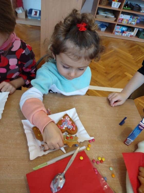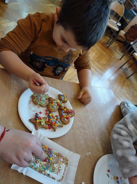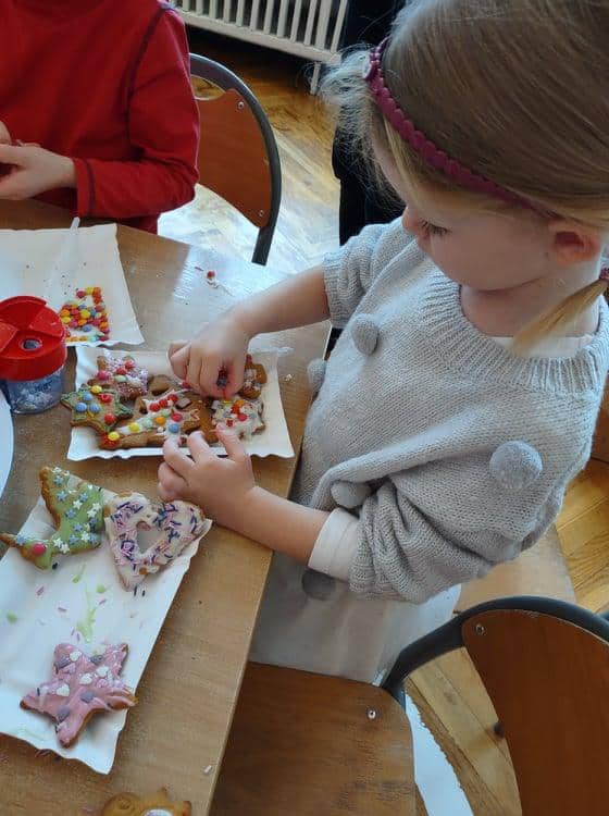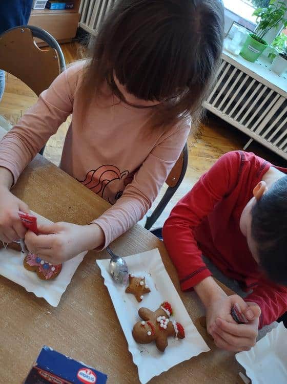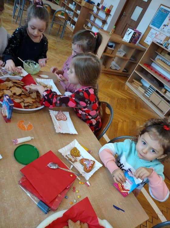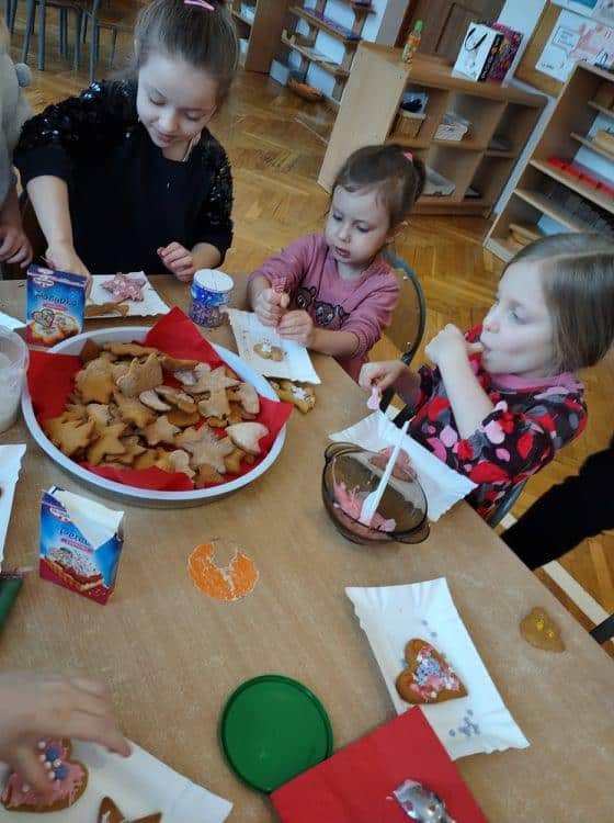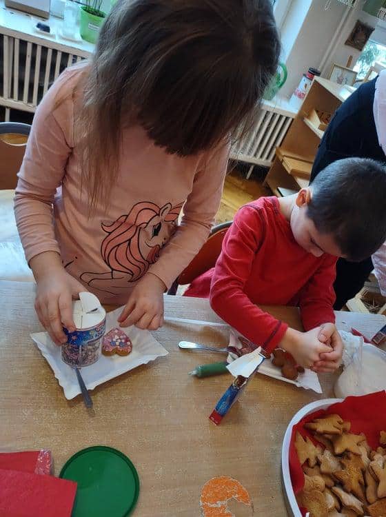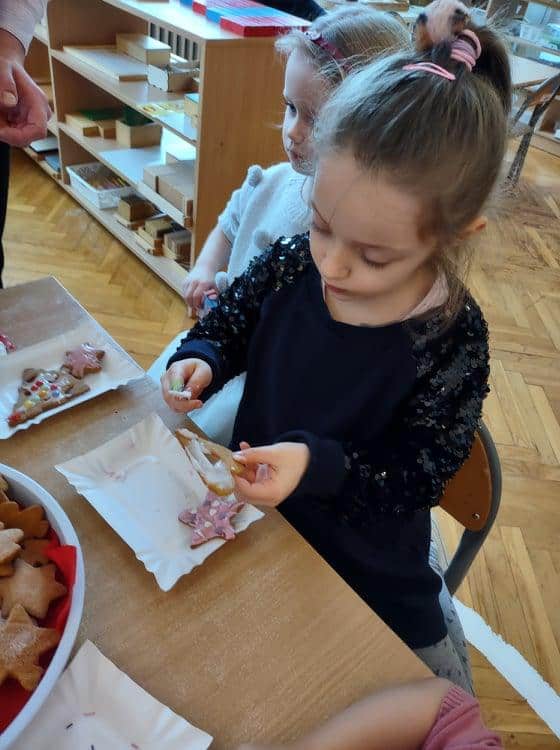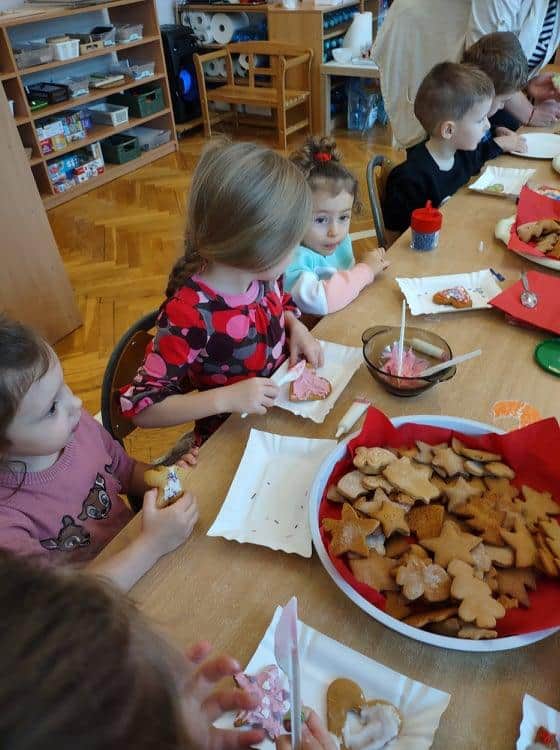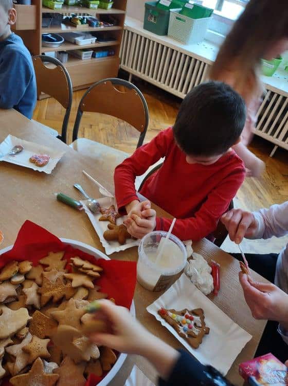 Święta Bożego Narodzenia to jeden z najpiękniejszych okresów w roku. Jest to moment, kiedy możemy zatrzymać się na chwilę i skupić na tym, co w życiu najważniejsze – na byciu razem. Od początku adwentu czynimy przygotowania i staramy się tworzyć ten niepowtarzalny, świąteczny klimat. Poznajemy symbolikę świąt Bożego Narodzenia. Na gazetce obok naszej sali pojawił się wieniec adwentowy, nie zabrakło też kalendarza adwentowego, dzięki któremu odliczamy czas do świąt. Gdzieniegdzie pojawiły się piękne dekoracje, a dzisiaj dopełnieniem naszych przygotowań stały się warsztaty cukierniczo – dekoracyjne z pierniczkami w roli głównej 🙂 Za sprawą Pani Małgosi, mamusi naszej Elizy, która przygotowała dla nas te wszystkie pachnące i aromatyczne pyszności, mogliśmy osobiście doświadczać świątecznych przygotowań. Dzieci z wielkim zaangażowaniem i w ogromnym skupieniu ozdabiały swoje pierniki. W tle naszej sali unosiły się melodie kolęd i pastorałek, co nadało jeszcze większego uroku i świątecznego klimatu naszej wspólnej pracy.