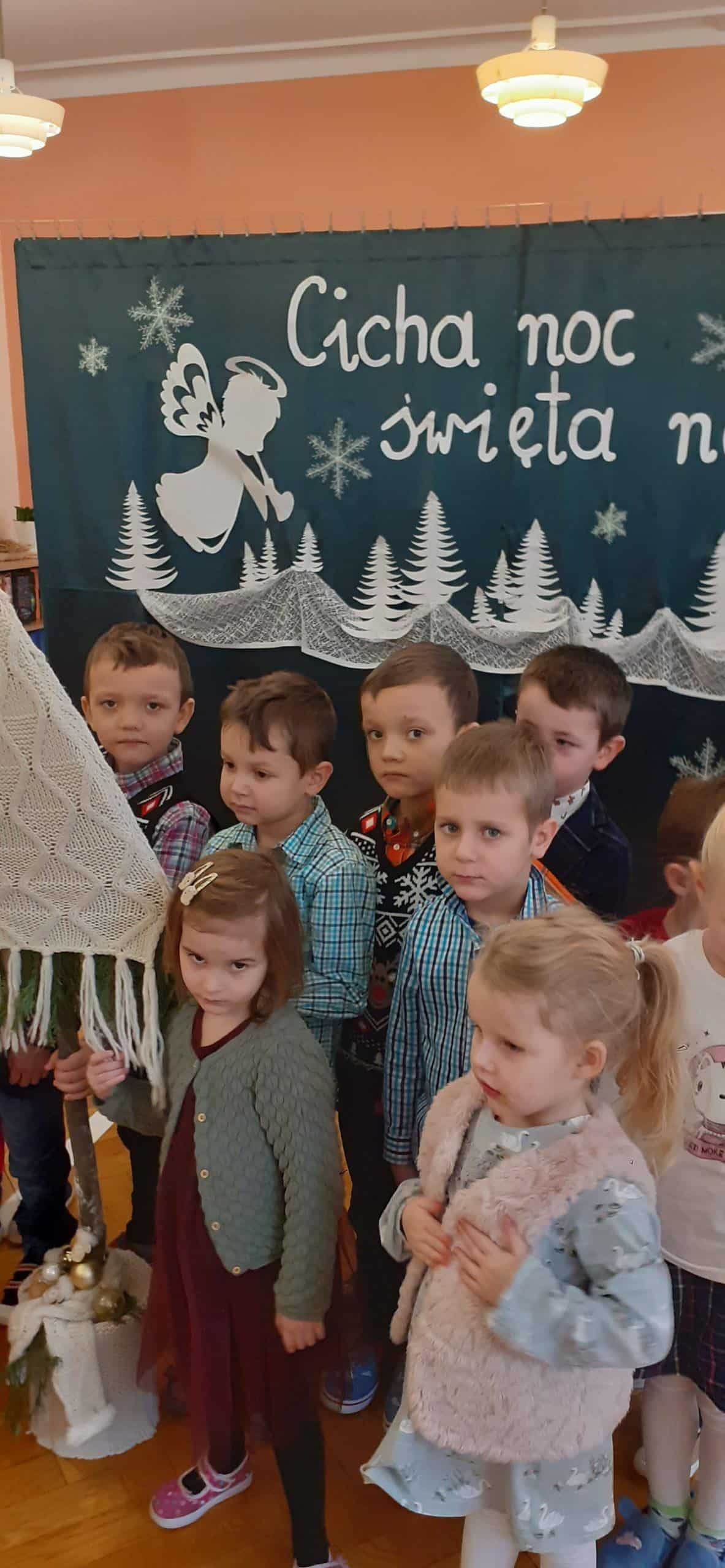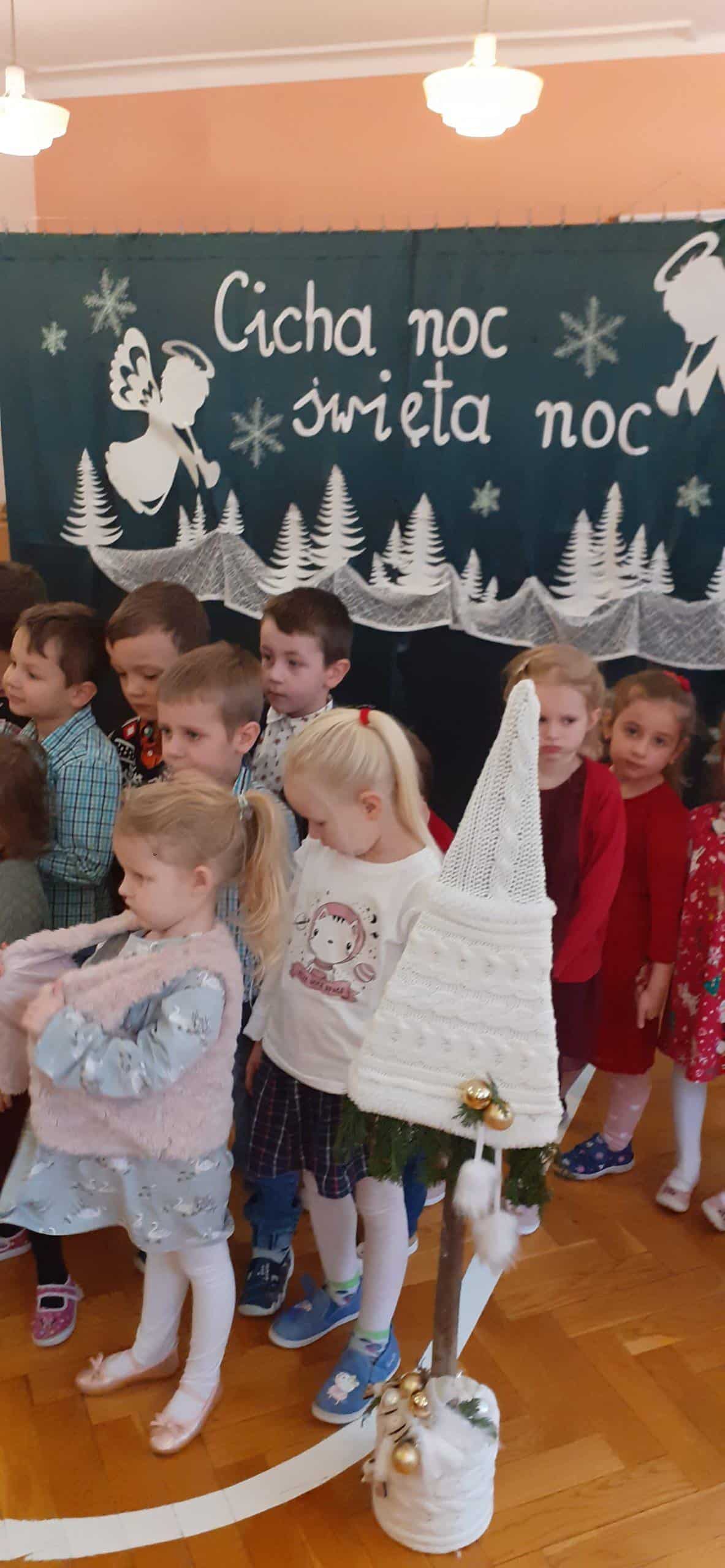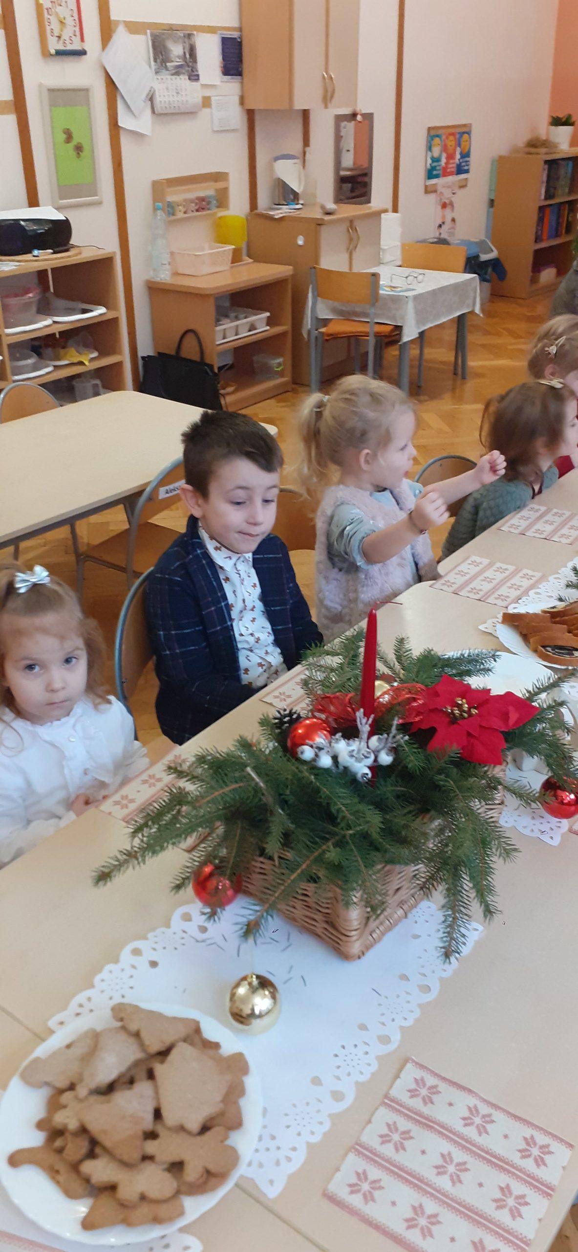 Czas oczekiwania na Święta Bożego Narodzenia zakończono w grupie Pomarańczowej wspólną Wigilią. Wigilia została poprzedzona rozmową popartą serią obrazków związanych z kultywowaniem tradycji bożonarodzeniowej . Od rana panowała świąteczna atmosfera, każde dziecko przyszło w odświętnym ubraniu. Sala zajęć w tym dniu też wyglądała wyjątkowo -piękna choinka, migoczące na choince kolorowe światełka, stroik zrobiony ze świeżych gałązek świerkowych, w tle piękna, zimowa sceneria. Po nakryciu stołu zgodnie z bożonarodzeniową tradycją, przystąpiono do odczytania Ewangelii wg Św. Łukasza o narodzinach Jezusa. A potem podzielono się opłatkiem, śpiewano kolędy i pastorałki. To był wyjątkowy czas, wypełniony miłą i serdeczna atmosferą. Na stole pojawił się świąteczny obiad, a potem tradycyjne świąteczne przysmaki – makowiec i lukrowane pierniki. Dzieci poczuły magię zbliżających się świąt Bożego Narodzenia.