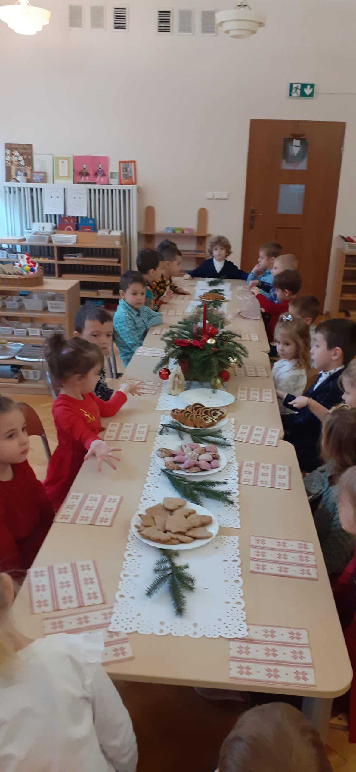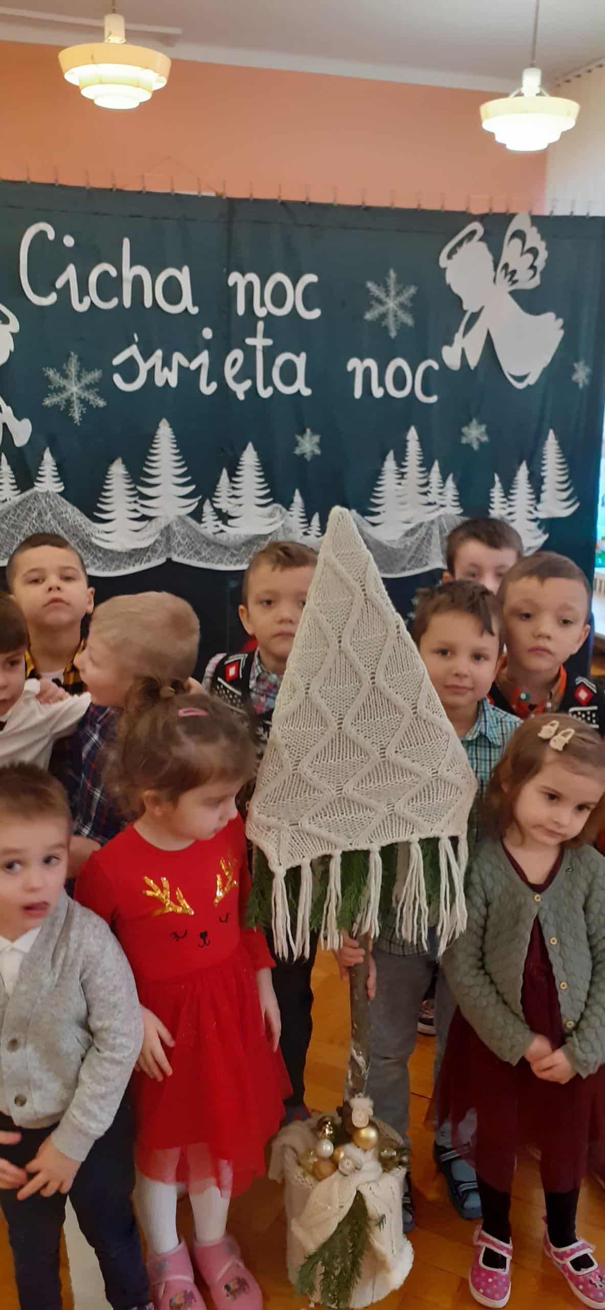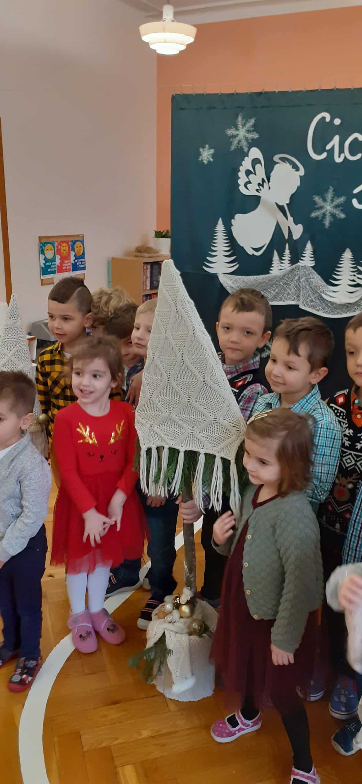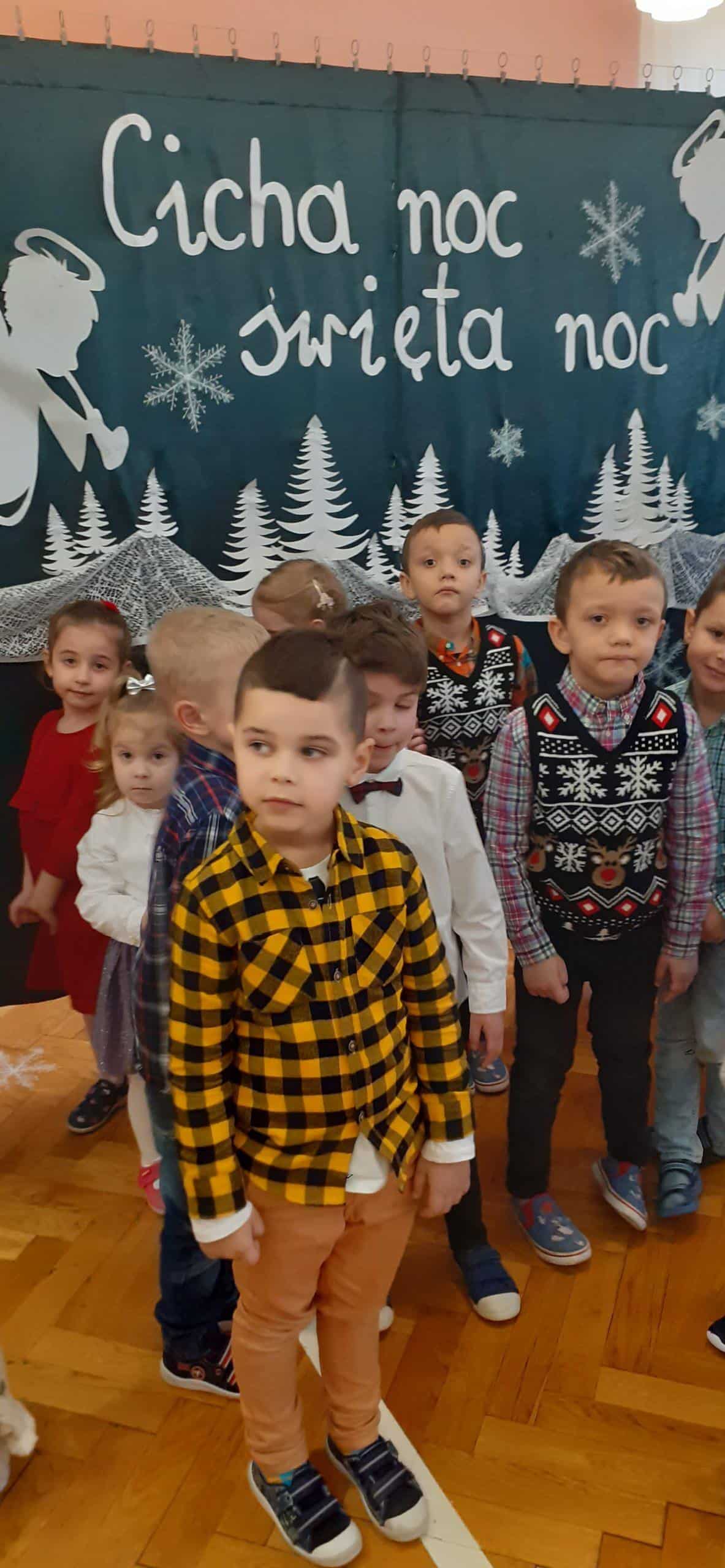 Czas oczekiwania na Święta Bożego Narodzenia zakończono w grupie Pomarańczowej wspólną Wigilią. Wigilia została poprzedzona rozmową popartą serią obrazków związanych z kultywowaniem tradycji bożonarodzeniowej . Od rana panowała świąteczna atmosfera, każde dziecko przyszło w odświętnym ubraniu. Sala zajęć w tym dniu też wyglądała wyjątkowo -piękna choinka, migoczące na choince kolorowe światełka, stroik zrobiony ze świeżych gałązek świerkowych, w tle piękna, zimowa sceneria. Po nakryciu stołu zgodnie z bożonarodzeniową tradycją, przystąpiono do odczytania Ewangelii wg Św. Łukasza o narodzinach Jezusa. A potem podzielono się opłatkiem, śpiewano kolędy i pastorałki. To był wyjątkowy czas, wypełniony miłą i serdeczna atmosferą. Na stole pojawił się świąteczny obiad, a potem tradycyjne świąteczne przysmaki – makowiec i lukrowane pierniki. Dzieci poczuły magię zbliżających się świąt Bożego Narodzenia.