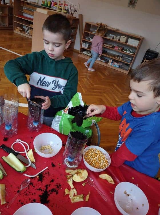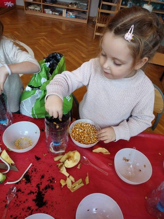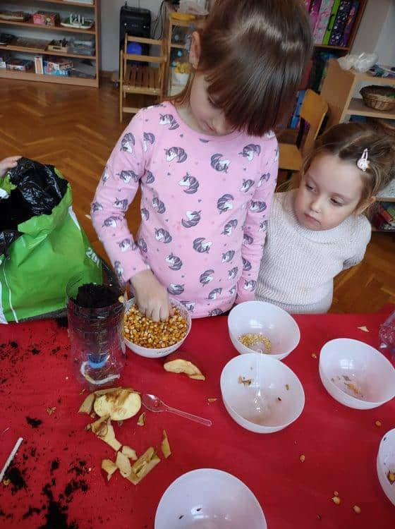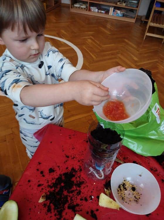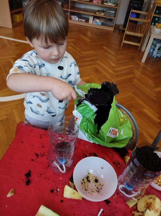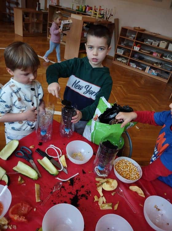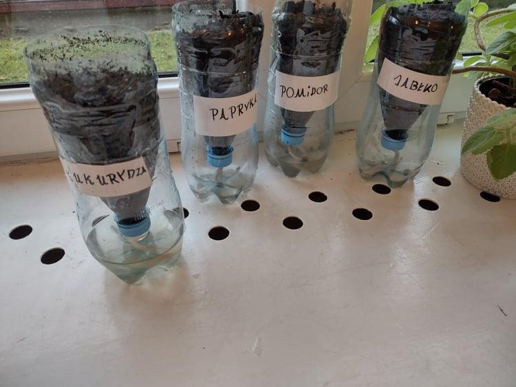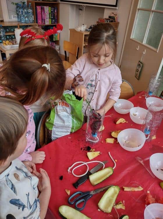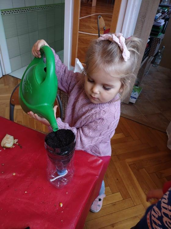 Kilka tygodni temu założyliśmy w naszej grupie przyrodnicze laboratorium eksperymentalne. Eksperyment polega na tym, że do specjalnie skonstruowanych, plastikowych butelek (doniczek) posadziliśmy nasionka i pestki owoców i warzyw, aby sprawdzić czy nasze cieplarniane, przedszkolne warunki sprzyjają takim roślinkom jak cukinia, pomarańcza, papryka, jabłko, kukurydza czy pomidory. Musimy pamiętać o podlewaniu i zapewnieniu im odpowiednich warunków wzrostu. Teraz codziennie sprawdzamy czy uda im się wykiełkować. Mamy już pewne sukcesy w tej dziedzinie, gdyż w naszym kąciku botanicznym pielęgnujemy miętę, ziemniaka, oraz cytrynę i awokado – te dwie ostanie rośliny wyrosły właśnie od pestki. Ogrodnictwo bardzo nam się podoba!