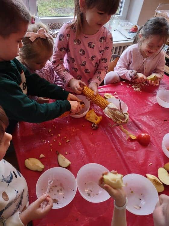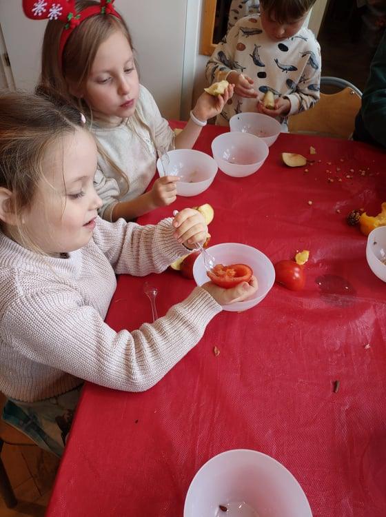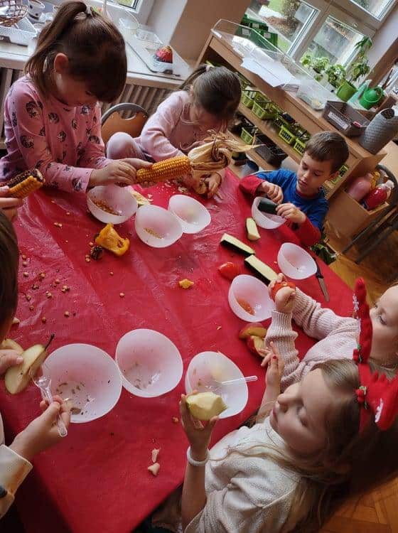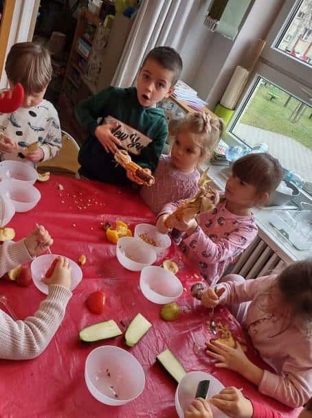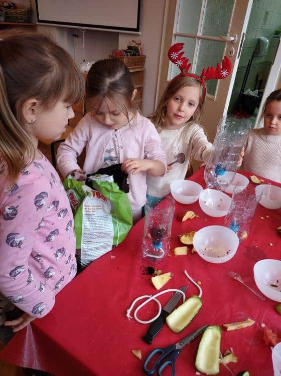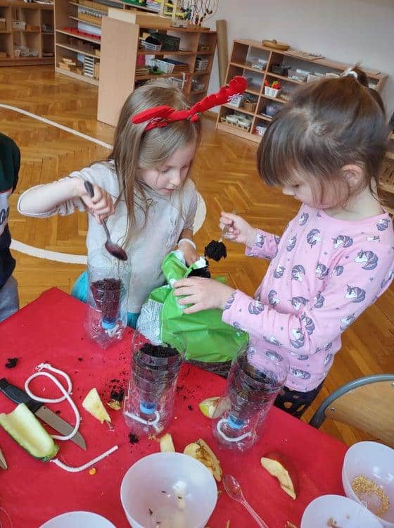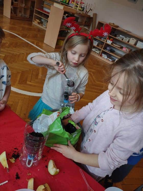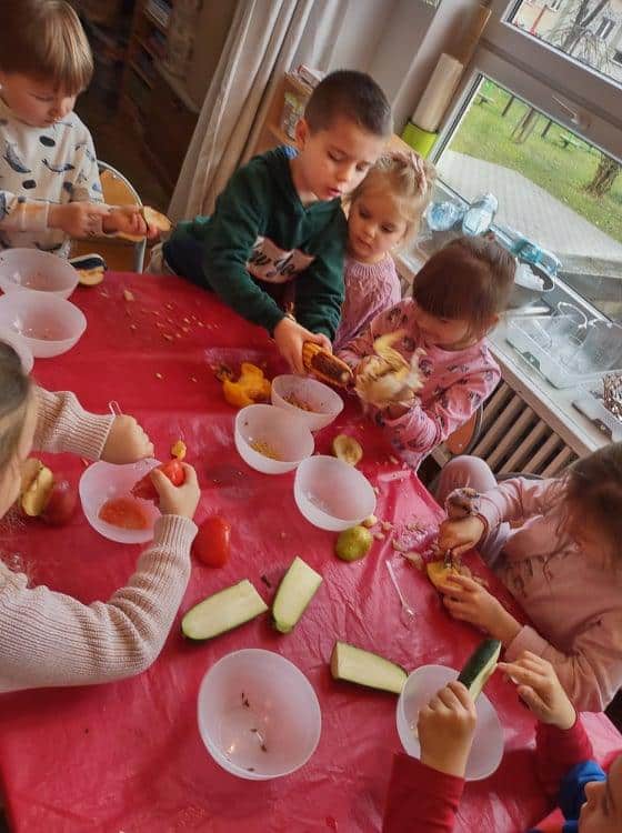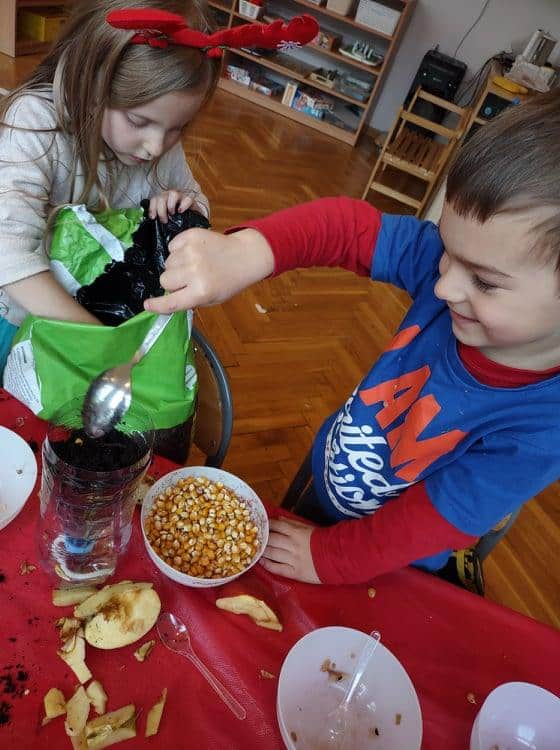 Kilka tygodni temu założyliśmy w naszej grupie przyrodnicze laboratorium eksperymentalne. Eksperyment polega na tym, że do specjalnie skonstruowanych, plastikowych butelek (doniczek) posadziliśmy nasionka i pestki owoców i warzyw, aby sprawdzić czy nasze cieplarniane, przedszkolne warunki sprzyjają takim roślinkom jak cukinia, pomarańcza, papryka, jabłko, kukurydza czy pomidory. Musimy pamiętać o podlewaniu i zapewnieniu im odpowiednich warunków wzrostu. Teraz codziennie sprawdzamy czy uda im się wykiełkować. Mamy już pewne sukcesy w tej dziedzinie, gdyż w naszym kąciku botanicznym pielęgnujemy miętę, ziemniaka, oraz cytrynę i awokado – te dwie ostanie rośliny wyrosły właśnie od pestki. Ogrodnictwo bardzo nam się podoba!