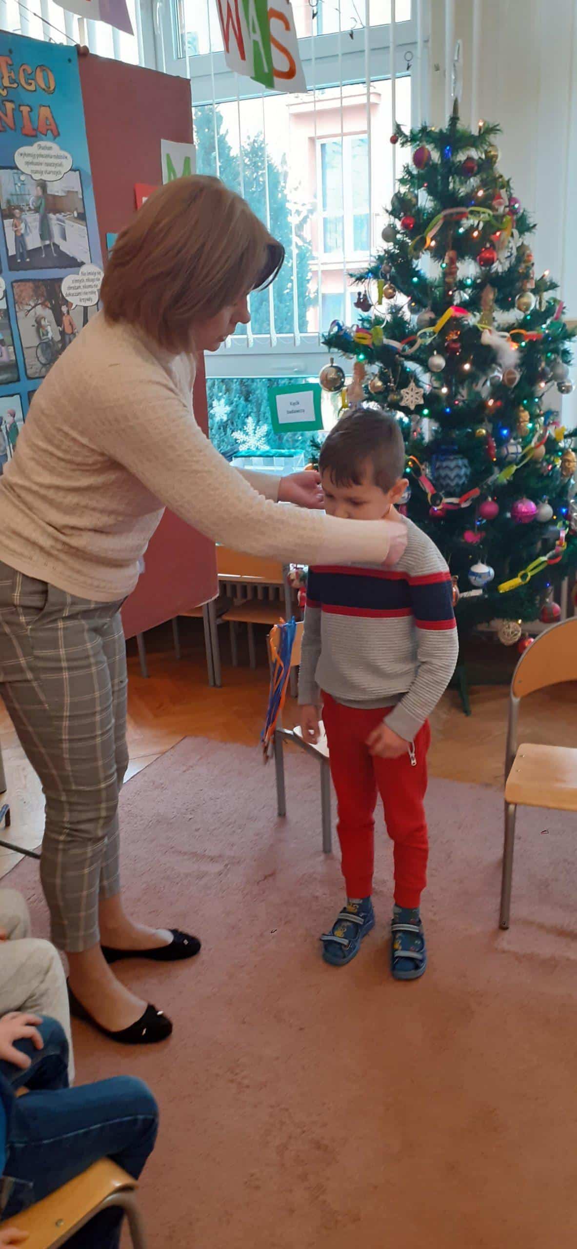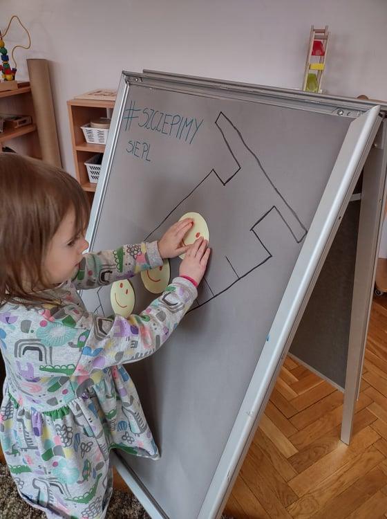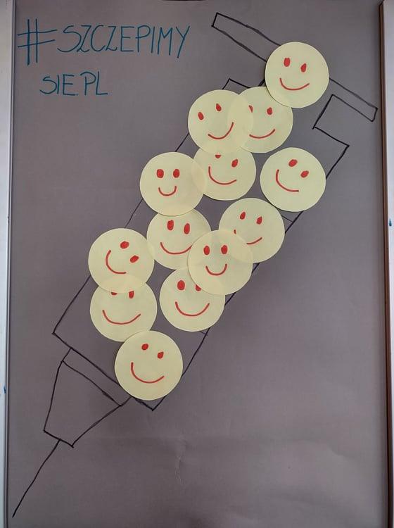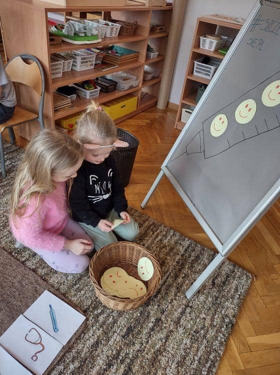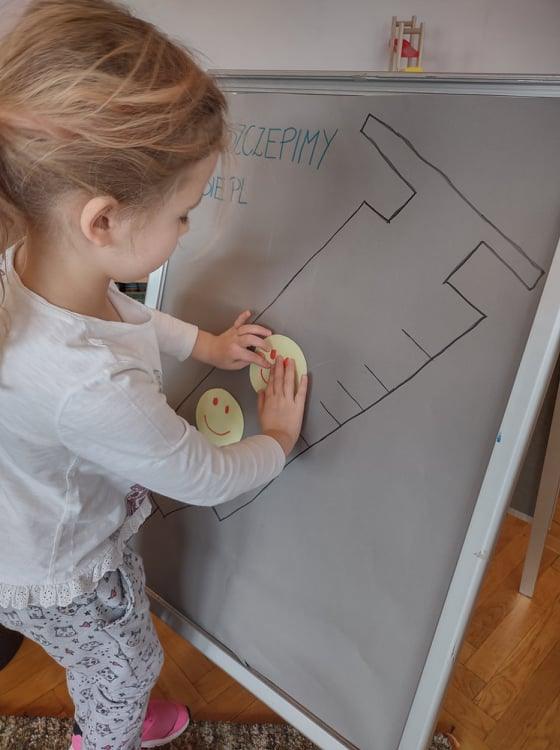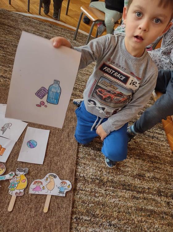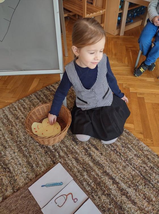 Na sam koniec utrwaliliśmy wiedzę na temat pracy lekarza. Dzieci odwoływały się do własnych doświadczeń i opowiadały jak wspominają własne wizyty w gabinecie lekarskim. Bez trudu potrafiły wymienić atrybuty lekarza oraz inne rzeczy związane z leczeniem. Opowiadały o lekach, które należy zażywać tylko w obecności i za pozwoleniem dorosłych. Poprzez burzę mózgów próbowaliśmy ustalić co to są szczepionki? Czy dzieci w ogóle mają świadomość takiej metody zapobiegania różnorodnym chorobom zakaźnym? Jak się okazało, dzieci doskonale orientowały się w temacie, mówiły, że to takie tabletki, tylko w płynie, że to zastrzyki, które trochę bolą, ale dzięki nim jest się zdrowym 🙂