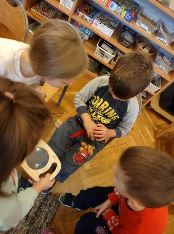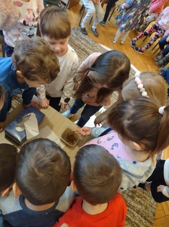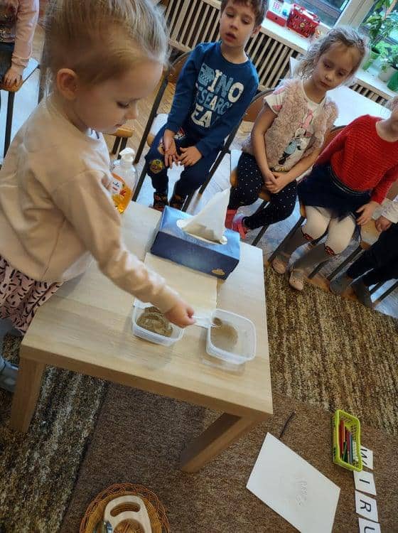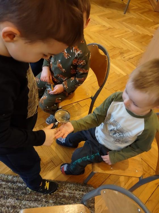 Wspólnie próbowaliśmy ustalić co to są wirusy? Czy można je zobaczyć przez szkło powiększające? Dlaczego i w jaki sposób musimy dbać o higienę? Dlaczego tak ważne w naszym codziennym życiu jest dokładne mycie rąk? Eksperyment z drobinkami czarnego pieprzu (odpowiednik wirusów) oraz mydłem na palcu, uzmysłowił dzieciom, że tak jak te drobinki pieprzu „uciekają” przed mydłem, tak samo z naszych dłoni „uciekają” wszystkie wirusy i bakterie, gdy tylko dokładnie je myjemy.