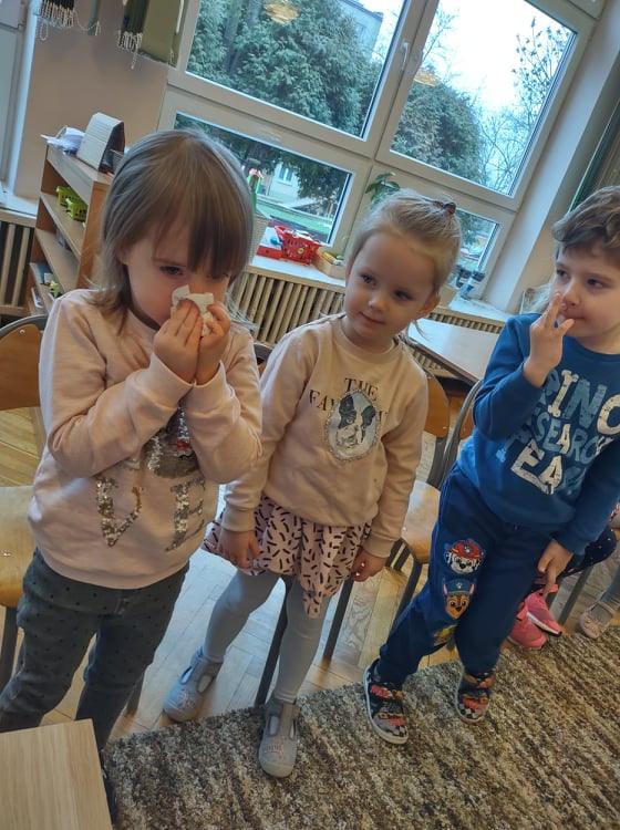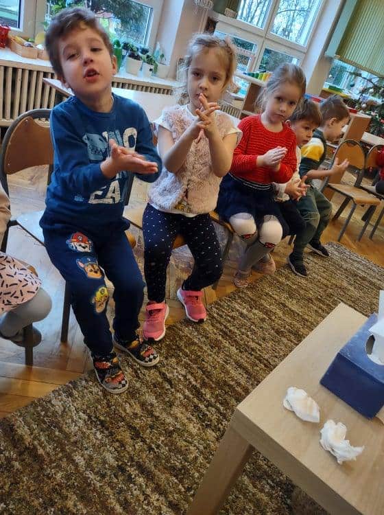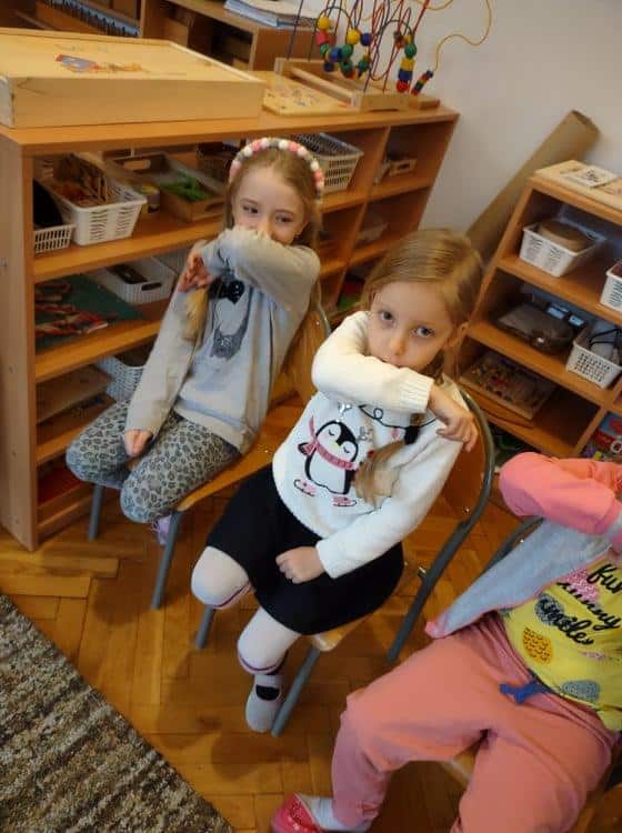 Ponadto prezentowaliśmy właściwe zachowania podczas kichania, kaszlania, witania się i mycia rąk. Chociaż informacje te są powtarzane w naszej grupie bardzo często, to jednak takiej mądrości nigdy za wiele…
