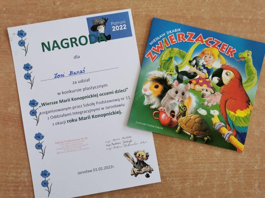 Miło nam poinformować , że Lenka otrzymała Nagrodę w konkursie plastycznym a Wiktoria Dyplom za udział w konkursie recytatorskim organizowanym przez Szkołę Podstawową nr 1 z Oddziałami Integracyjnymi w Jarosławiu z okazji roku M. Konopnickiej. Gratulujemy dziewczynkom i życzymy dalszych sukcesów.