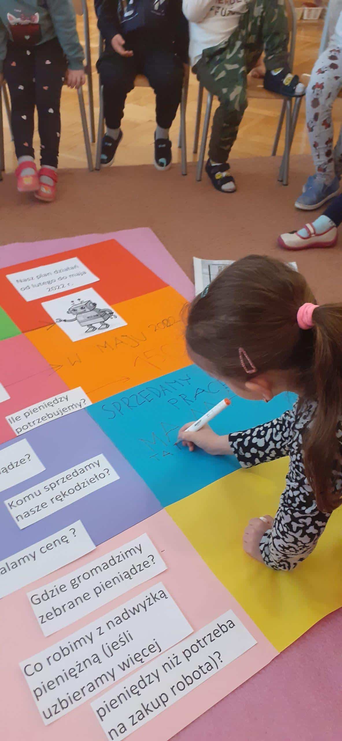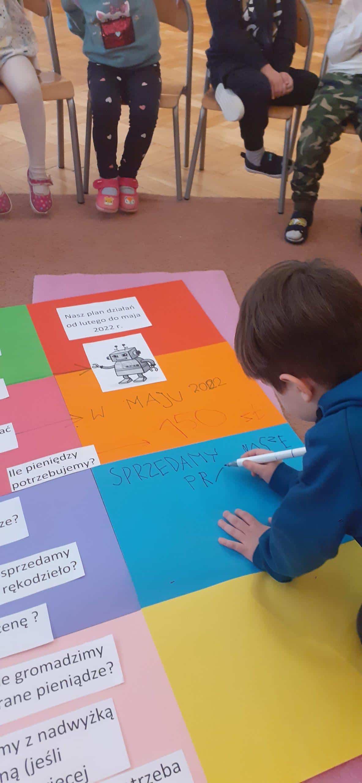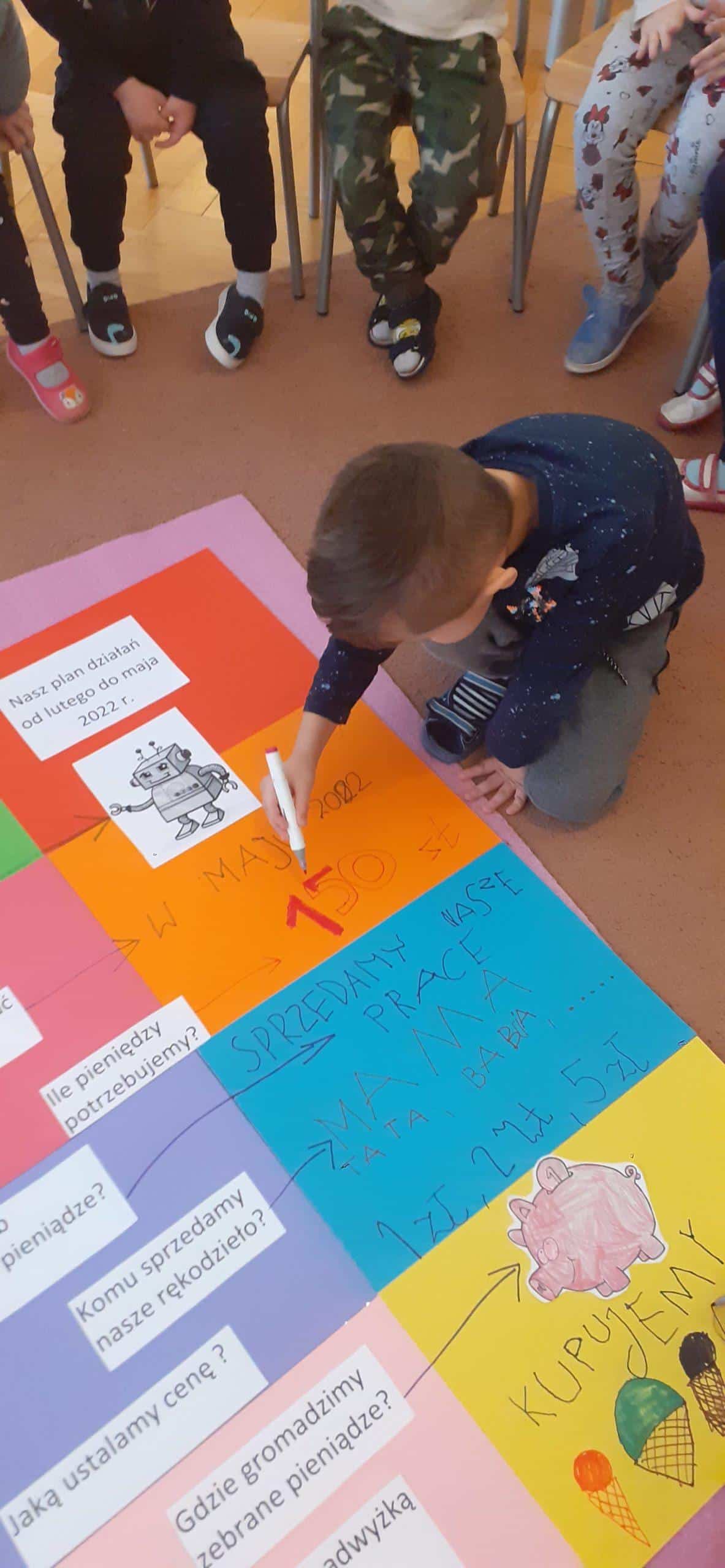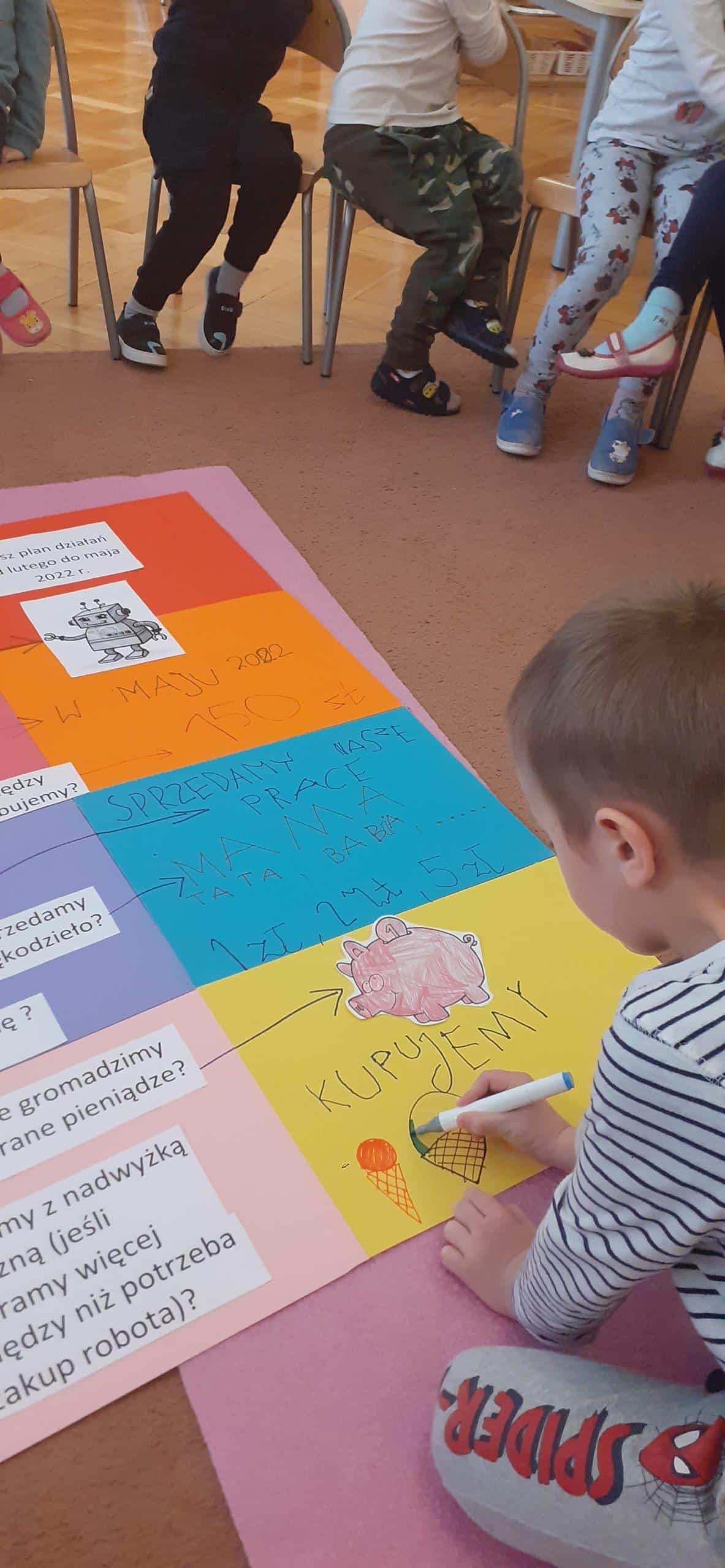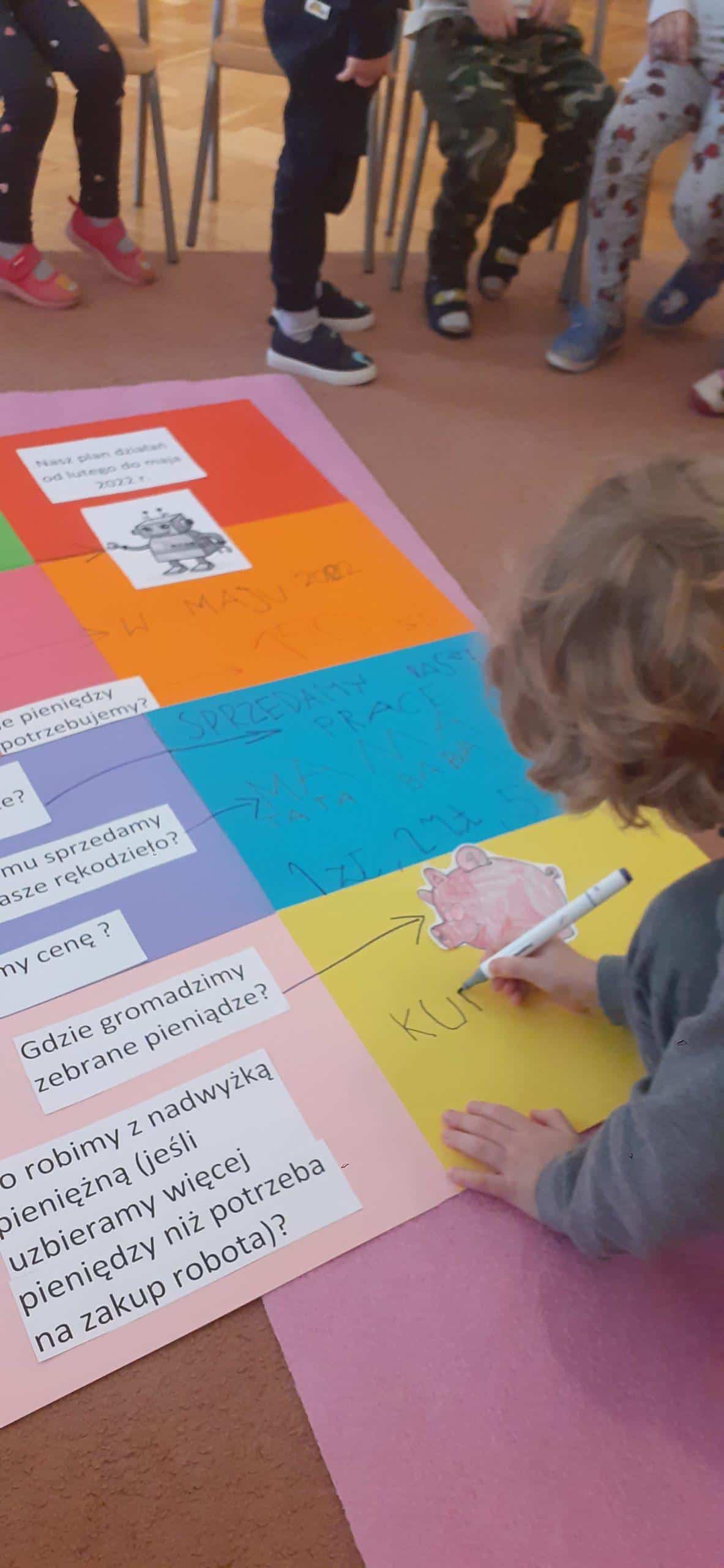 W tym roku realizujmy projekt „Przedsiębiorcze dzieciaki”, którego celem jest odkrycie tajemnic pieniądza, zarabiania, a także nauczenie dzieci planowania wydatków, a przede wszystkim oszczędzania. Stąd pomysł aktywności dzieci , dzięki którym dzieci zgromadzą środki pieniężne na zakup robota do nauki programowania . Dzieci w toku różnych działań zrozumiały, że aby zgromadzić odpowiednie zasoby finansowe muszą wykonać określoną pracę, zareklamować ją, a potem sprzedać. Na dużym arkuszu papieru sformułowano problem dotyczący tego w jaki sposób pozyskać pieniądze na zakup wspomnianego robota. Powstał w ten sposób plan działania , który realizowany będzie w lutym, marcu, kwietniu i maju, a zakończony będzie mamy nadzieję odpowiednim budżetem na zakup robota .Pierwszy etap pracy mamy za sobą, wykonaliśmy drewniane podkładki pod kubek i sprzedaliśmy je Rodzicom. Pozyskaliśmy w ten sposób 104 zł. Przed nami kolejne aktywności w następnym miesiącach i kolejne sprzedaże, do których planujemy także oprócz Rodziców włączyć pracowników przedszkola.