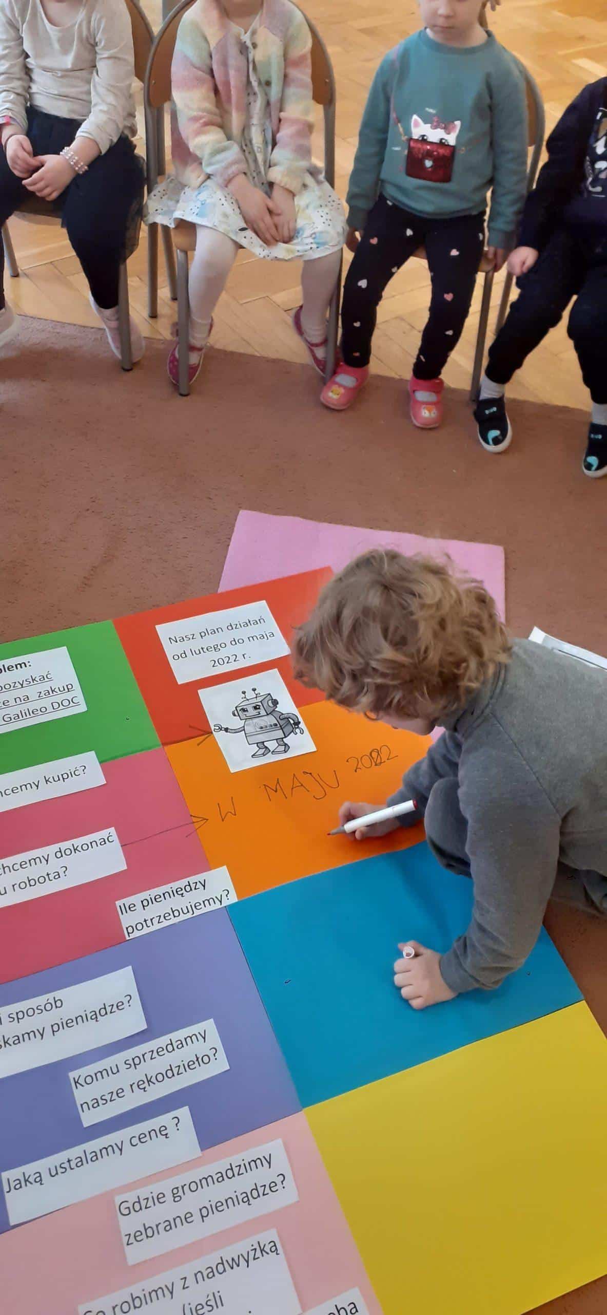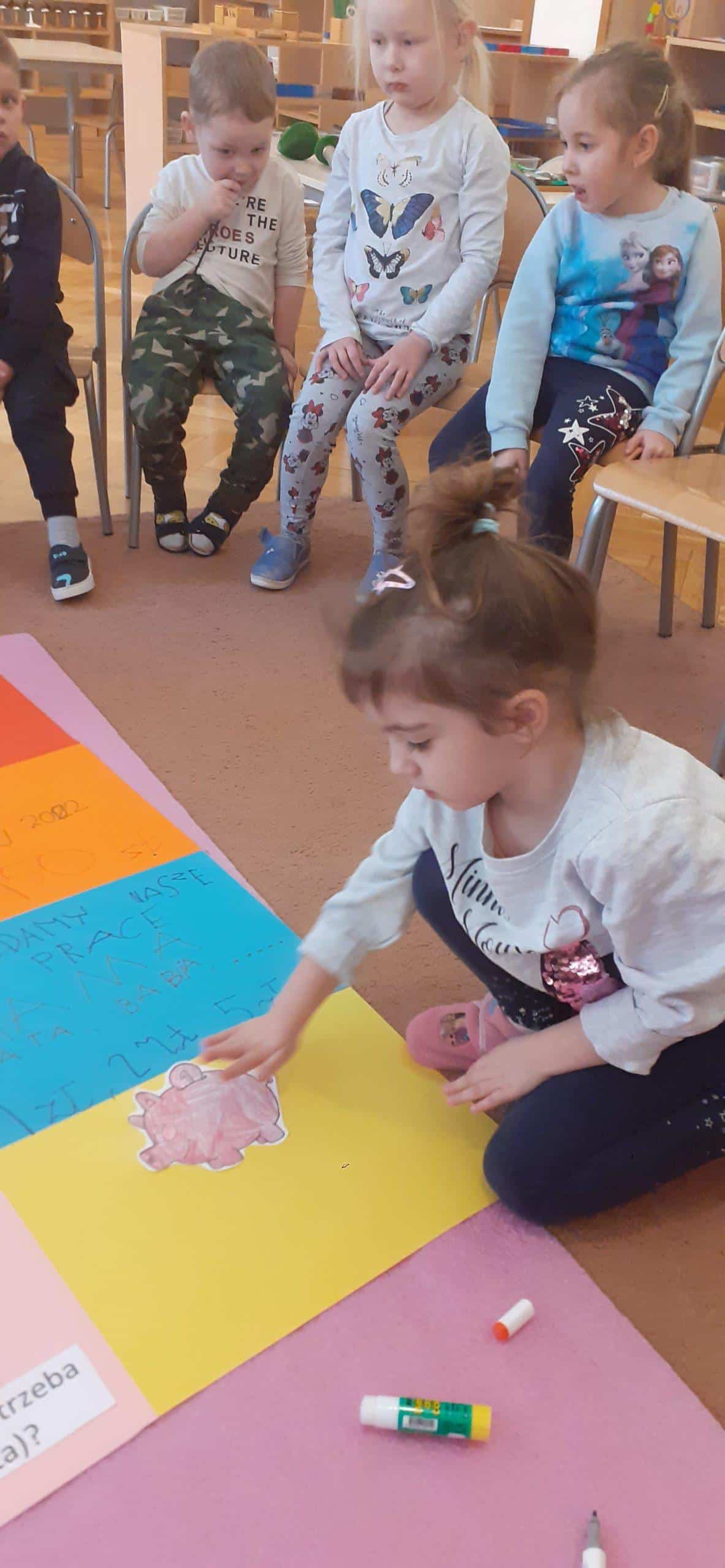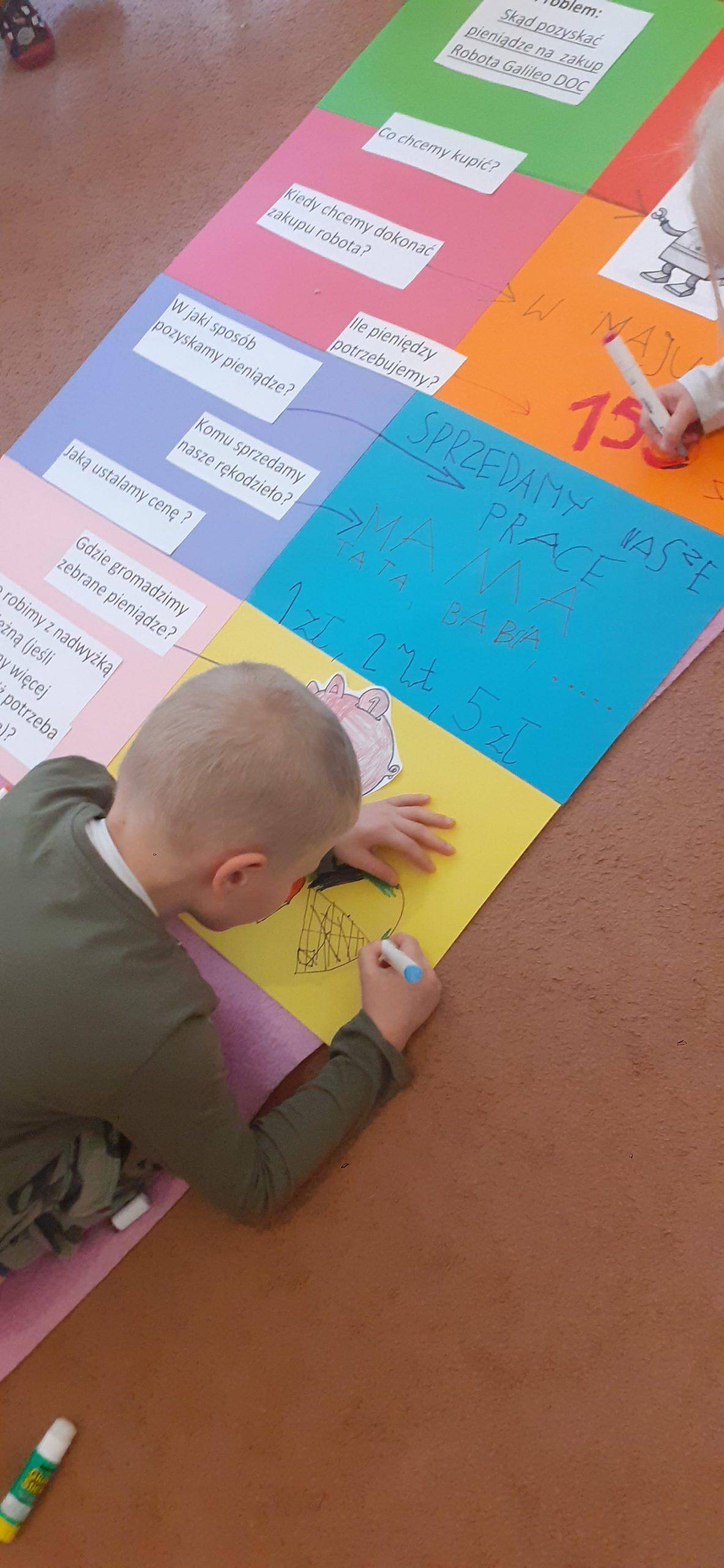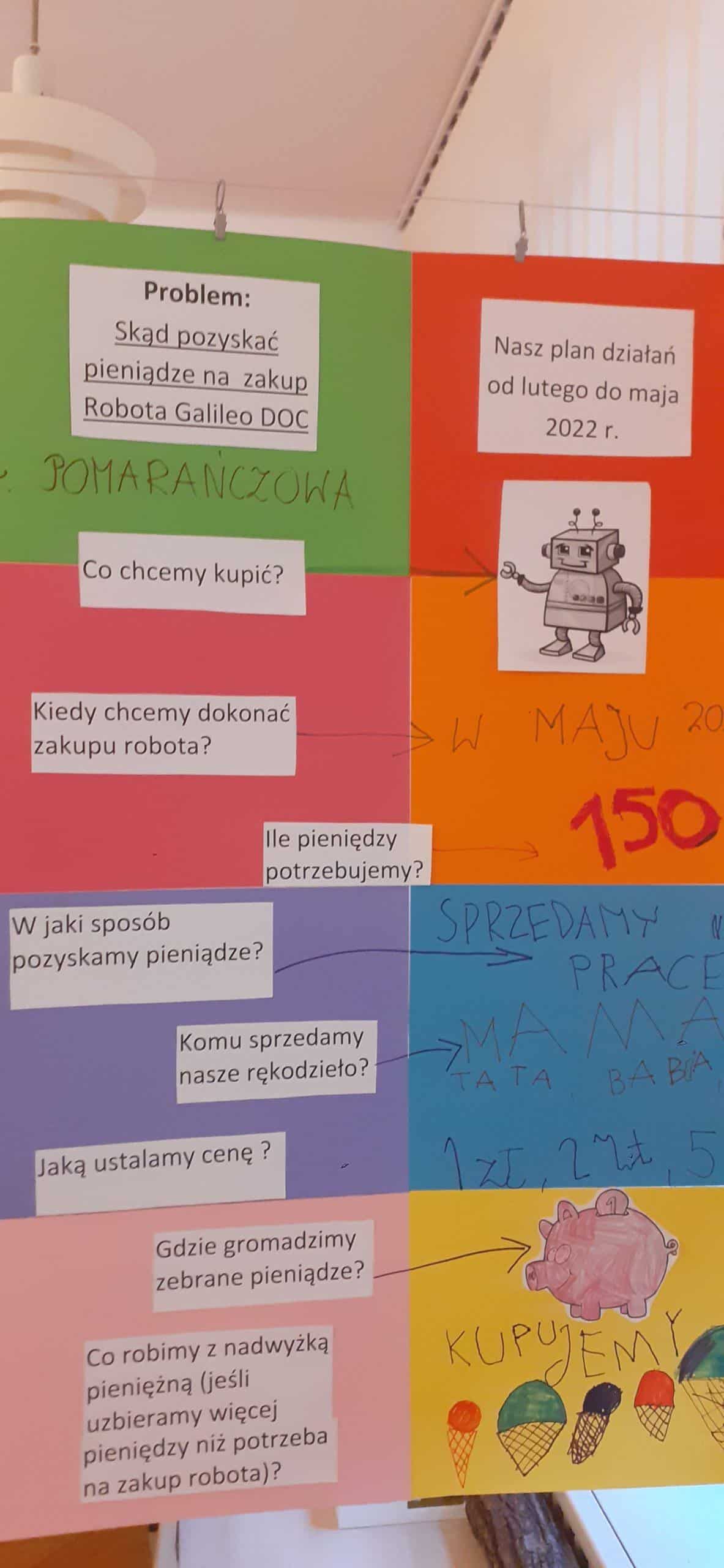 W tym roku realizujmy projekt „Przedsiębiorcze dzieciaki”, którego celem jest odkrycie tajemnic pieniądza, zarabiania, a także nauczenie dzieci planowania wydatków, a przede wszystkim oszczędzania. Stąd pomysł aktywności dzieci , dzięki którym dzieci zgromadzą środki pieniężne na zakup robota do nauki programowania . Dzieci w toku różnych działań zrozumiały, że aby zgromadzić odpowiednie zasoby finansowe muszą wykonać określoną pracę, zareklamować ją, a potem sprzedać. Na dużym arkuszu papieru sformułowano problem dotyczący tego w jaki sposób pozyskać pieniądze na zakup wspomnianego robota. Powstał w ten sposób plan działania , który realizowany będzie w lutym, marcu, kwietniu i maju, a zakończony będzie mamy nadzieję odpowiednim budżetem na zakup robota .Pierwszy etap pracy mamy za sobą, wykonaliśmy drewniane podkładki pod kubek i sprzedaliśmy je Rodzicom. Pozyskaliśmy w ten sposób 104 zł. Przed nami kolejne aktywności w następnym miesiącach i kolejne sprzedaże, do których planujemy także oprócz Rodziców włączyć pracowników przedszkola.